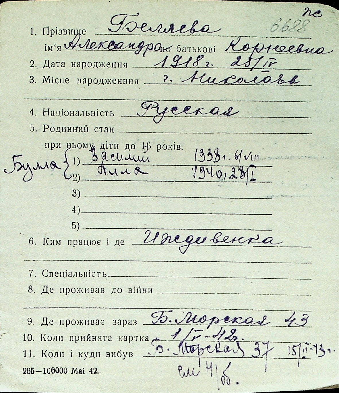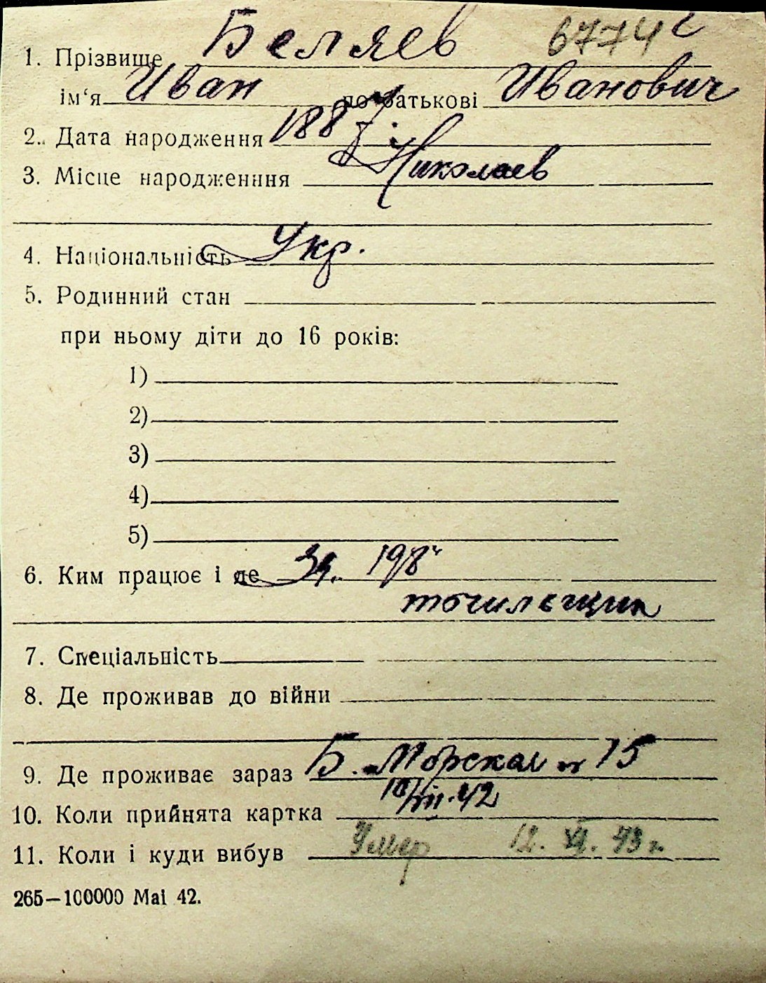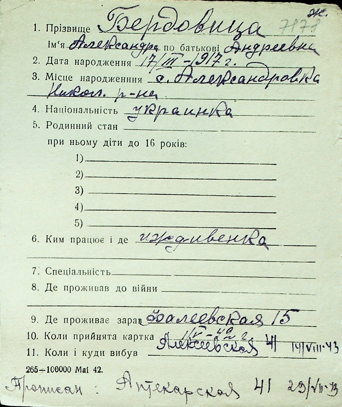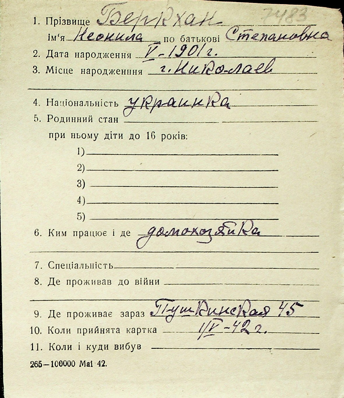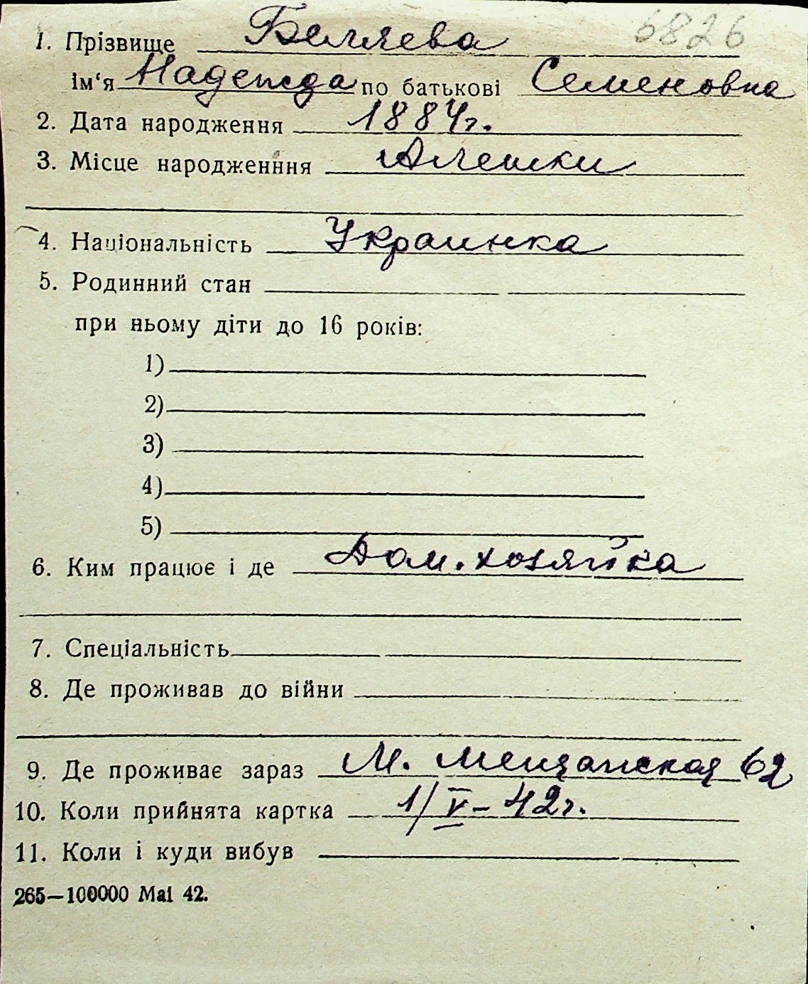 ◦ ◦ Перелік карток на осіб, які мешкали у м. Миколаїв у період окупації 1941–1944 років