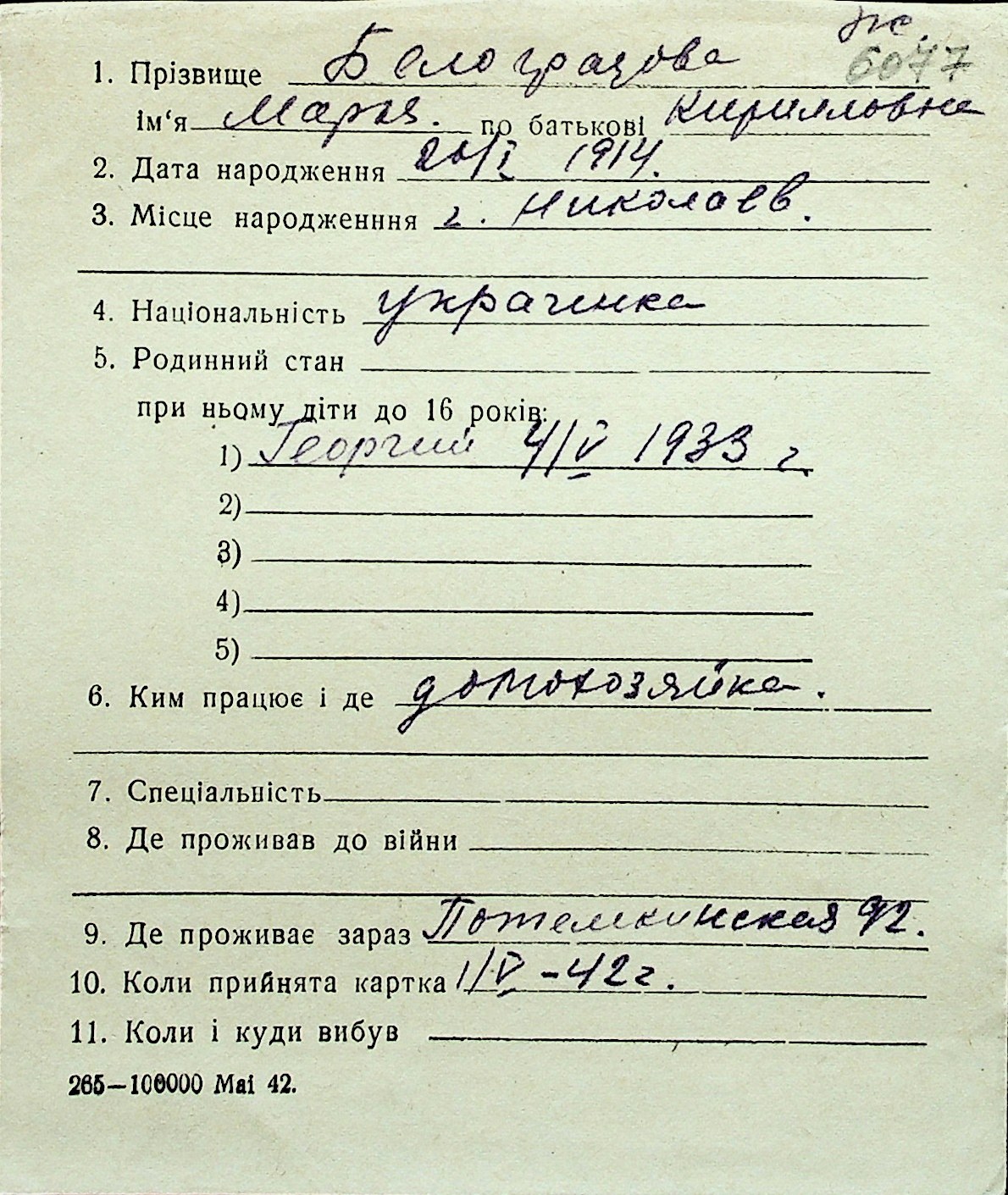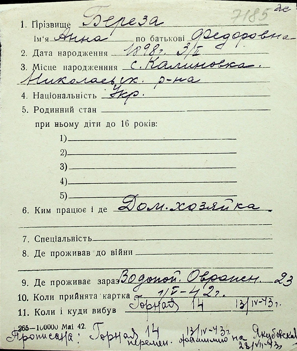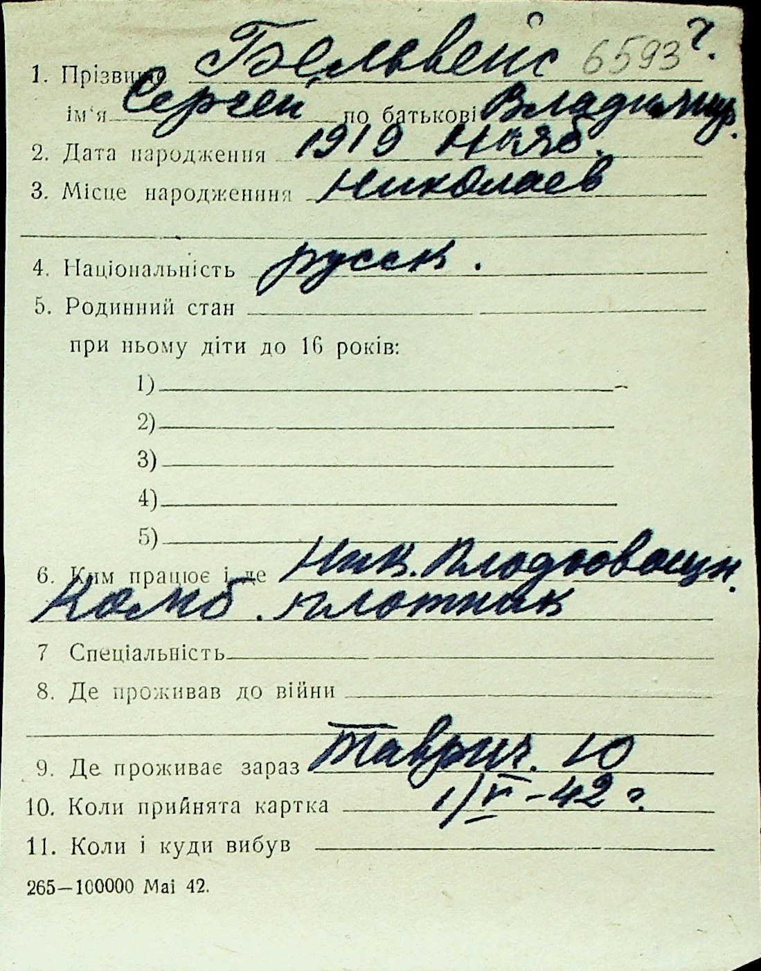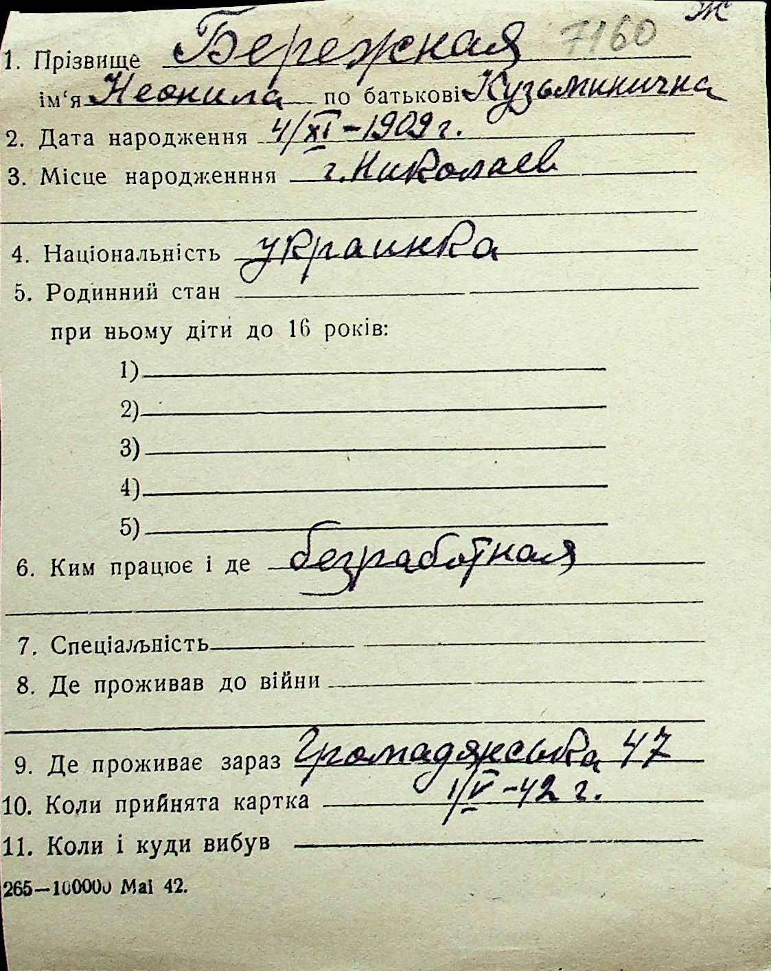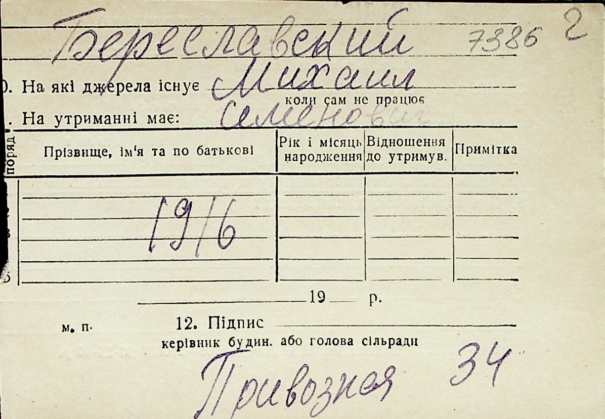 ◦ ◦ Перелік карток на осіб, які мешкали у м. Миколаїв у період окупації 1941–1944 років