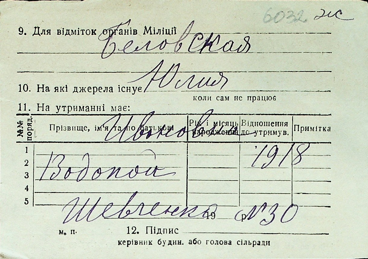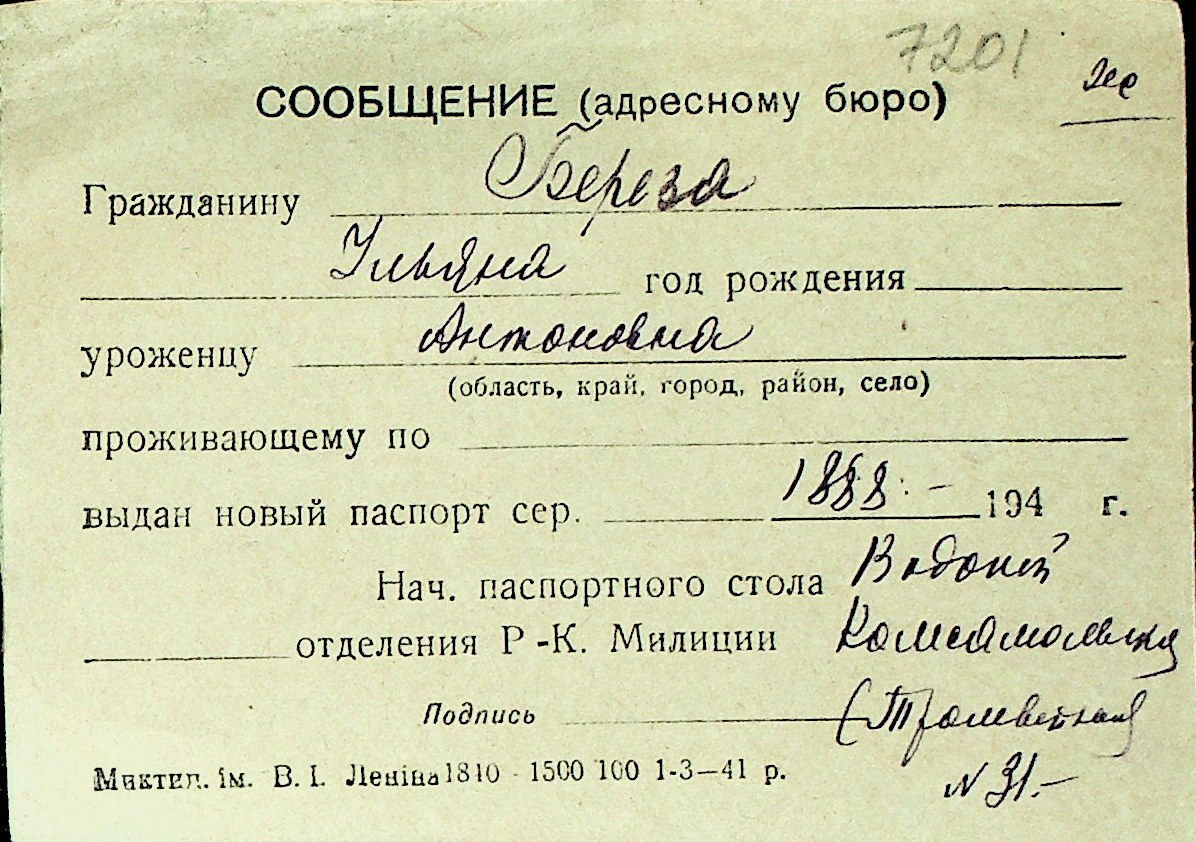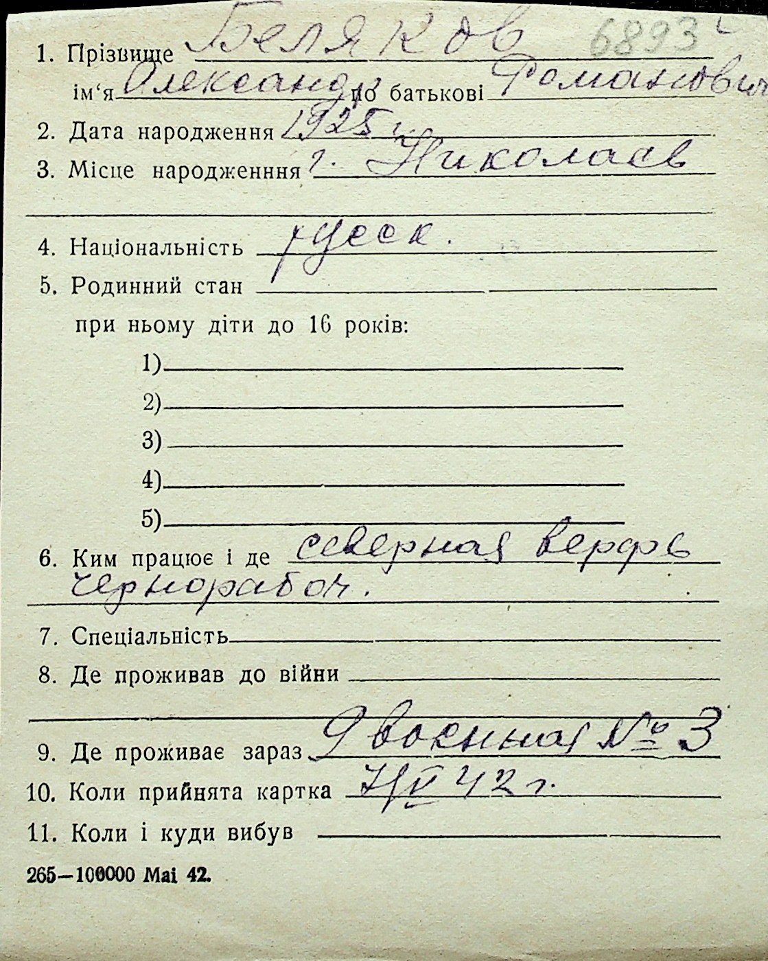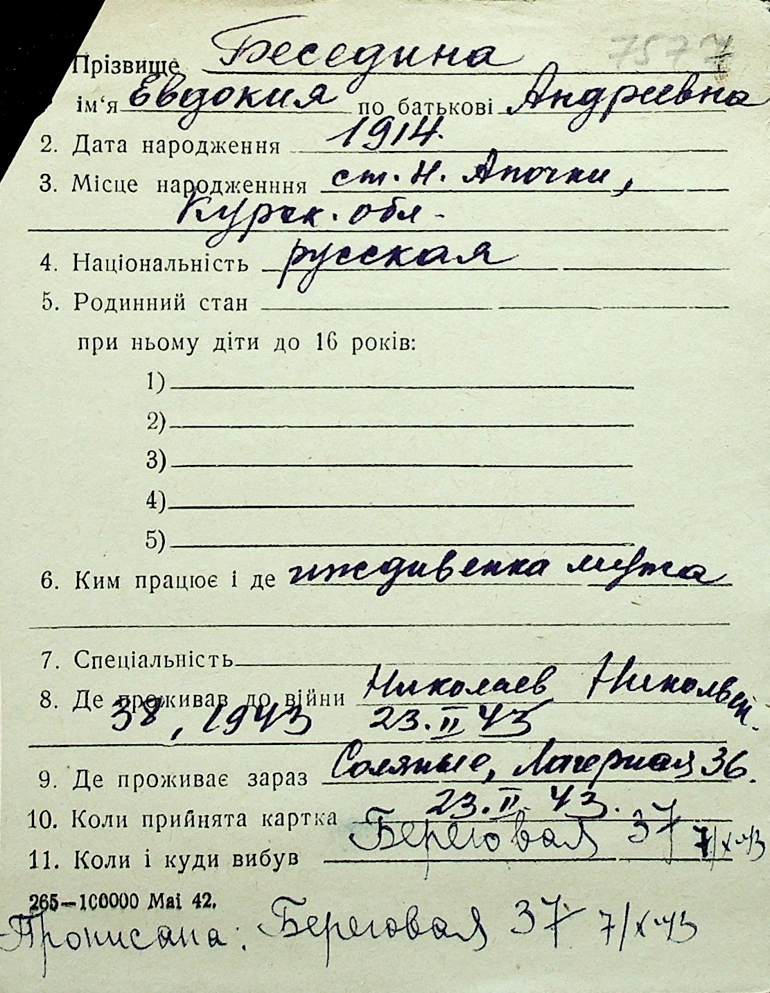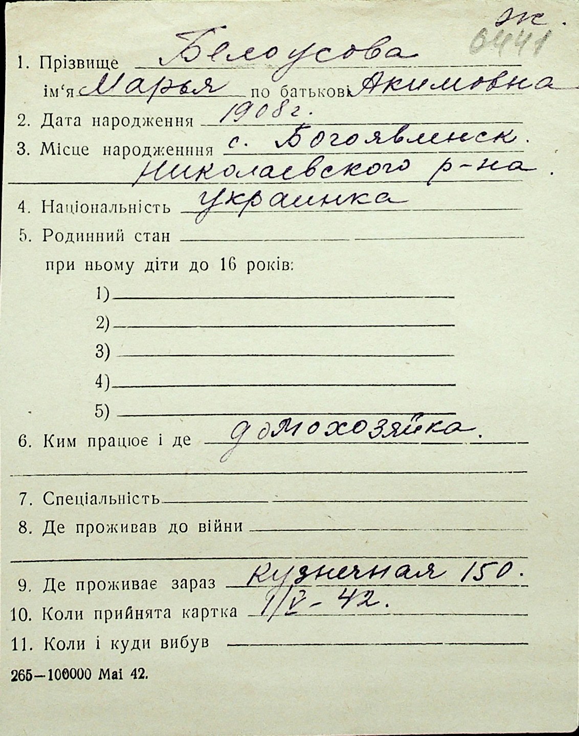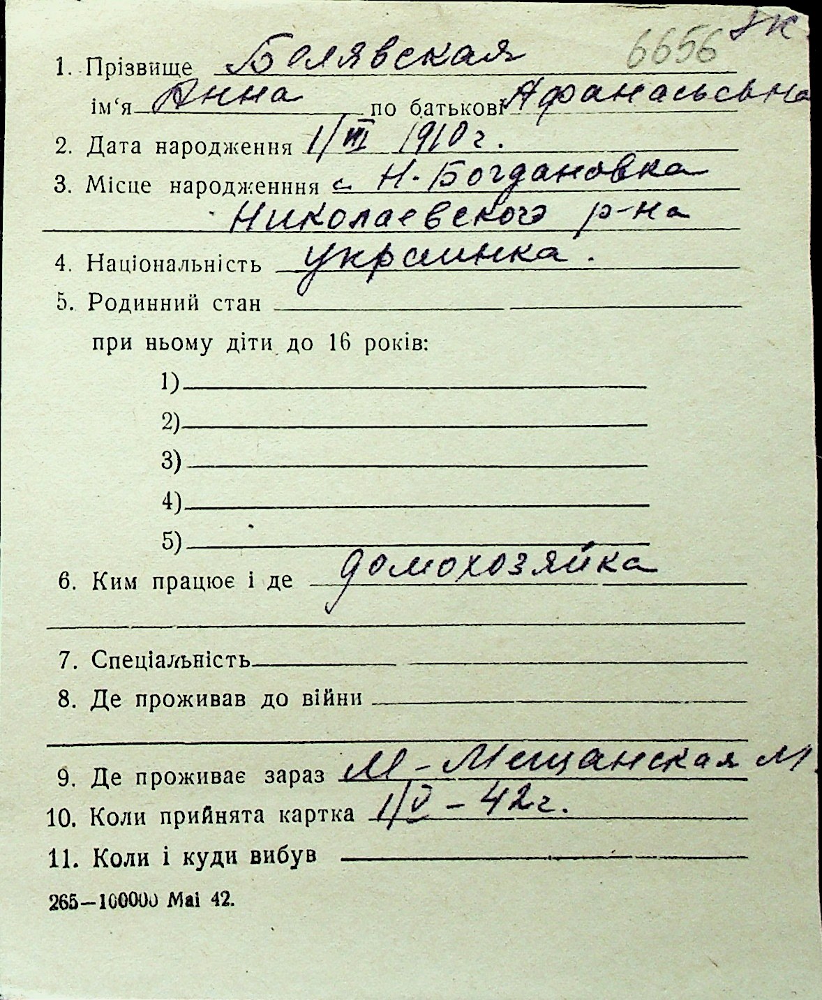 ◦ ◦ Перелік карток на осіб, які мешкали у м. Миколаїв у період окупації 1941–1944 років