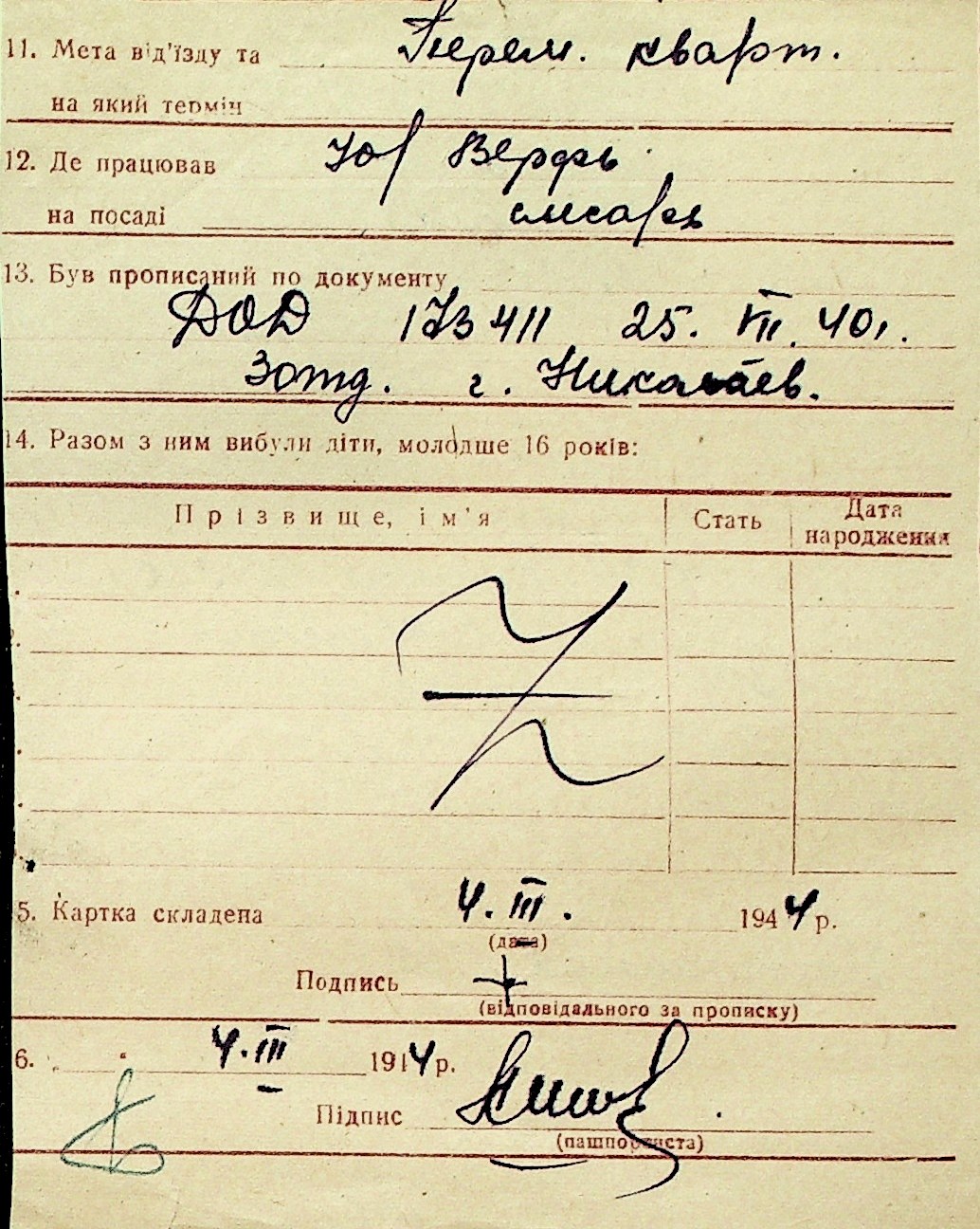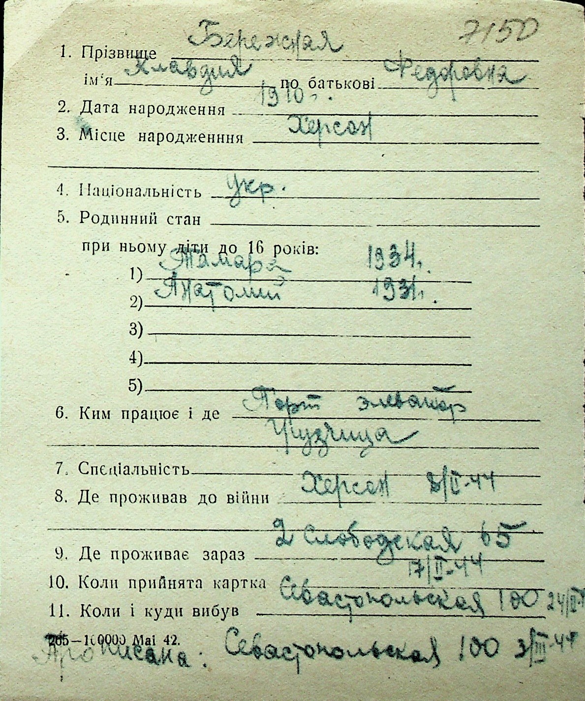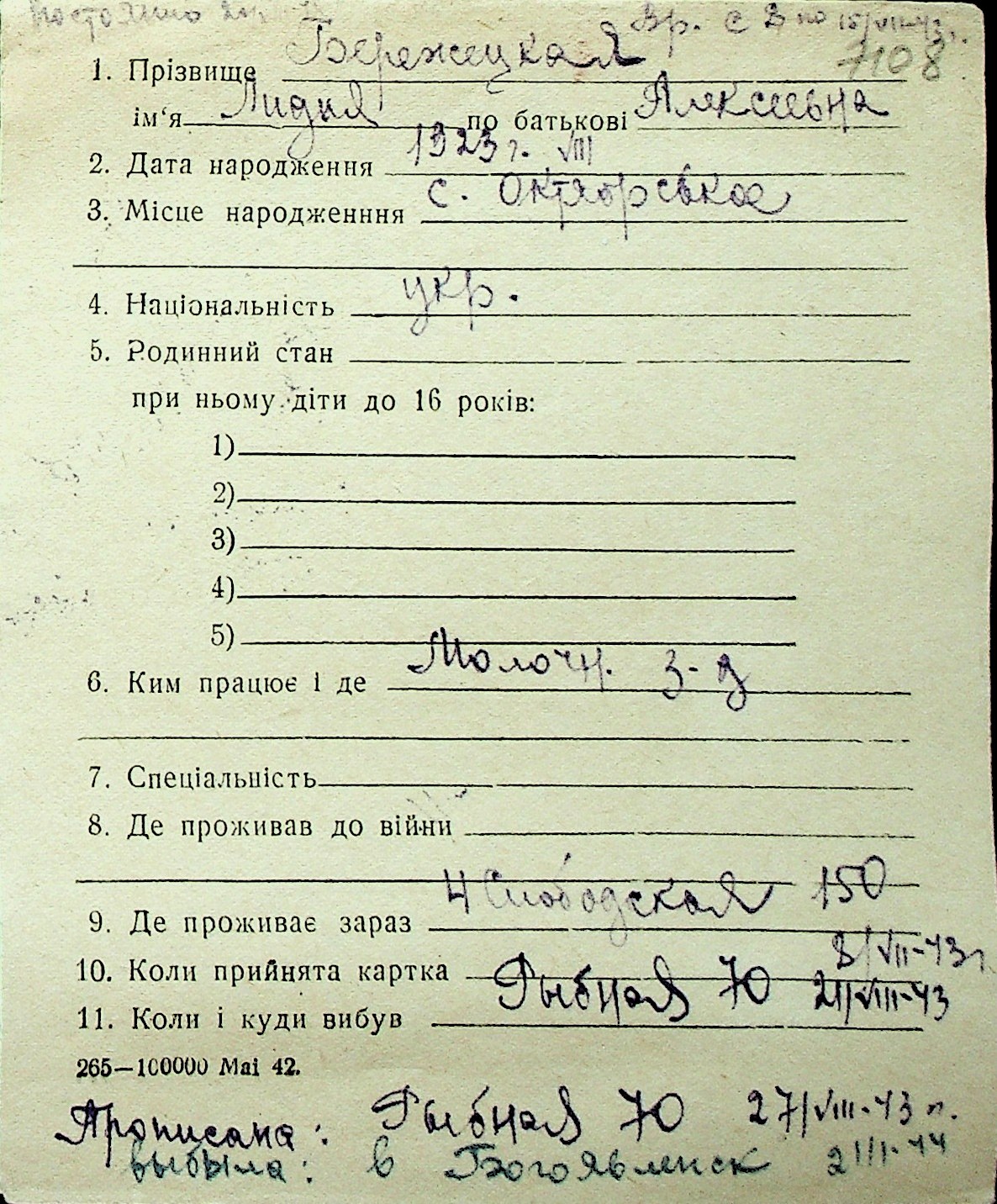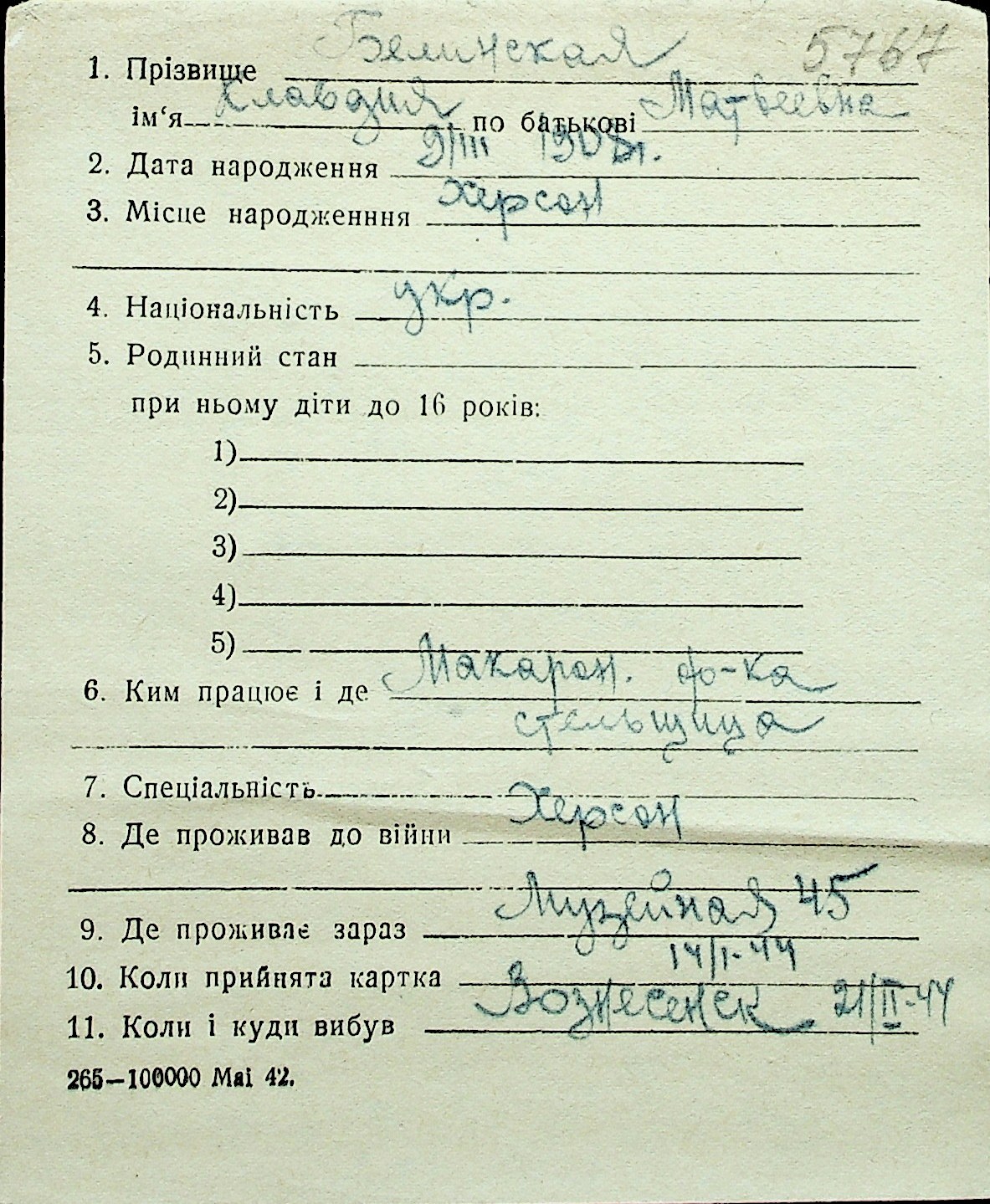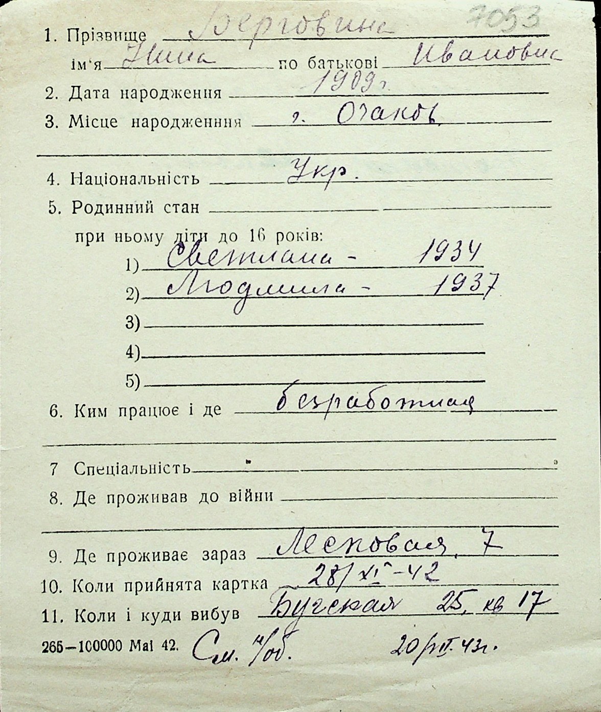 ◦ ◦ Перелік карток на осіб, які мешкали у м. Миколаїв у період окупації 1941–1944 років