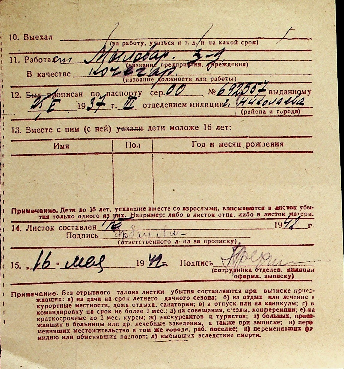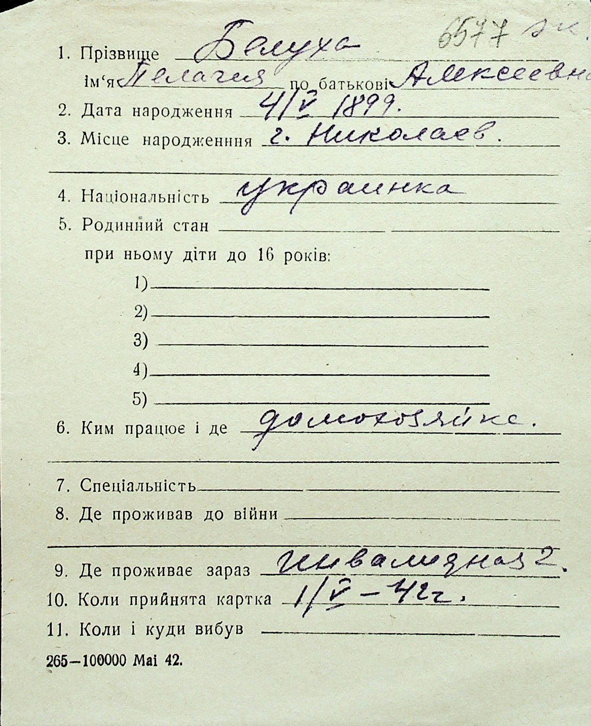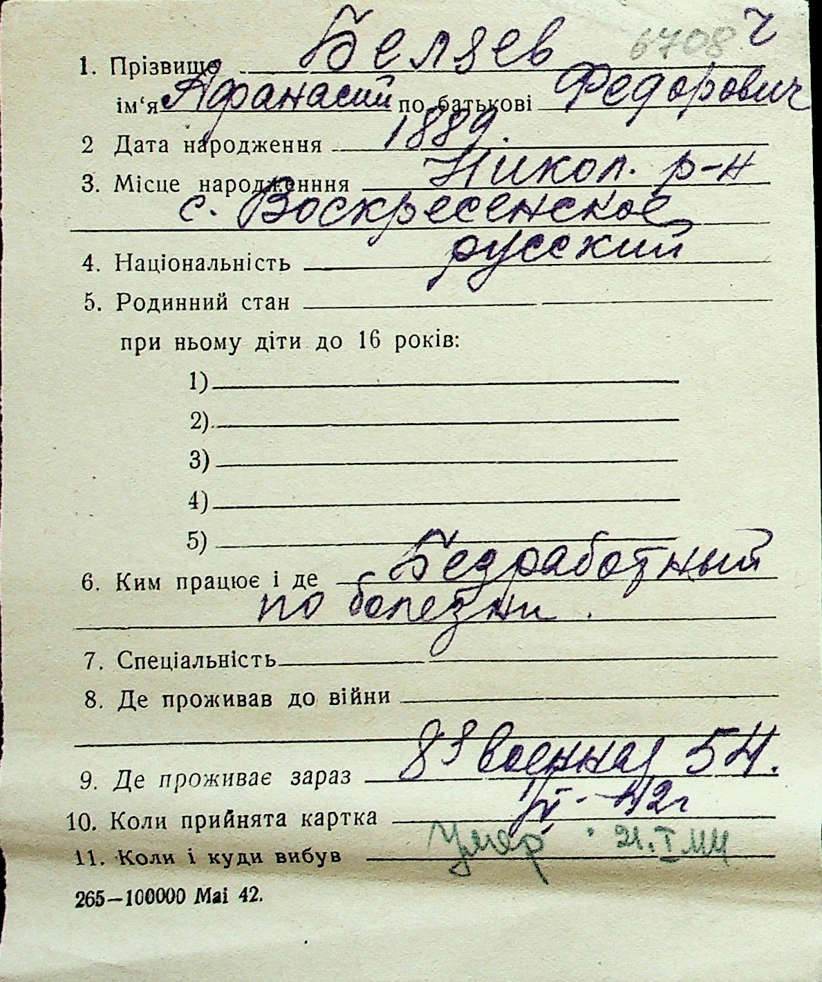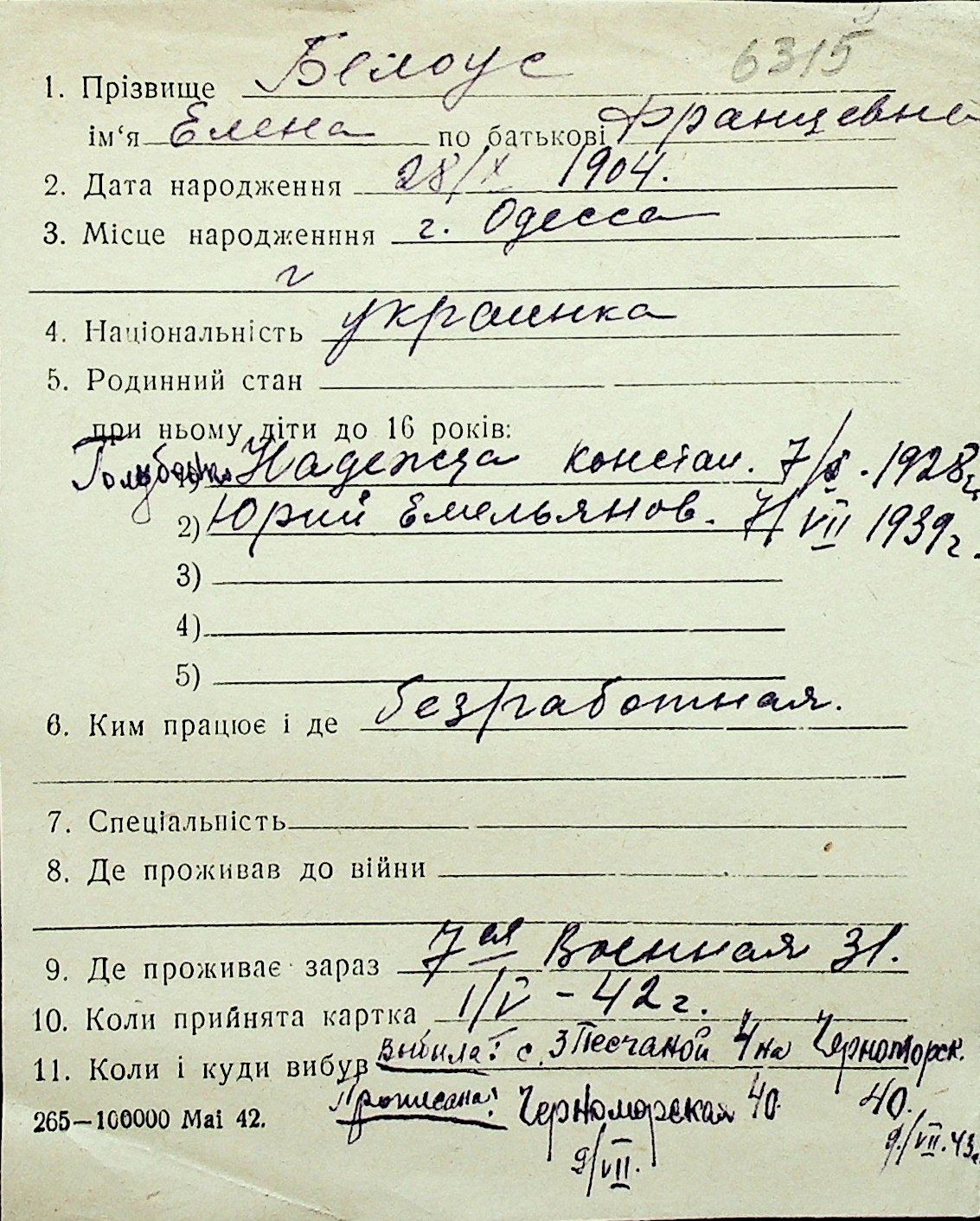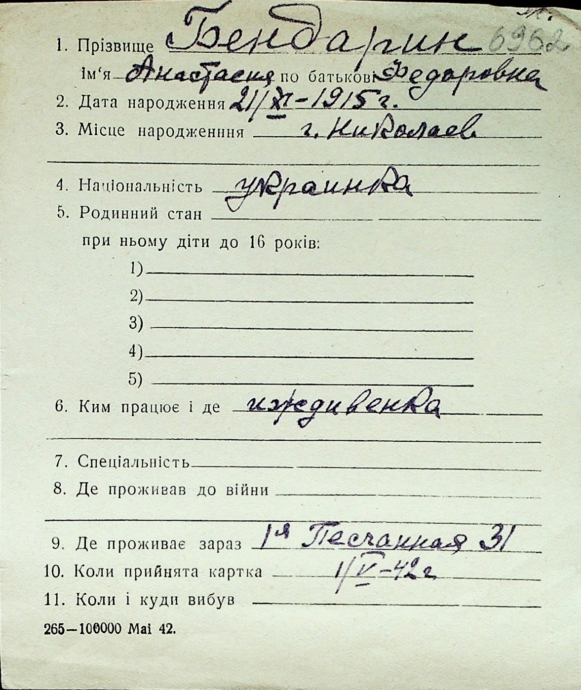 ◦ ◦ Перелік карток на осіб, які мешкали у м. Миколаїв у період окупації 1941–1944 років