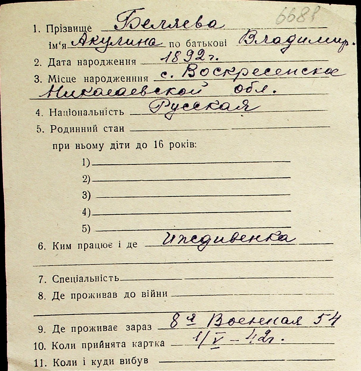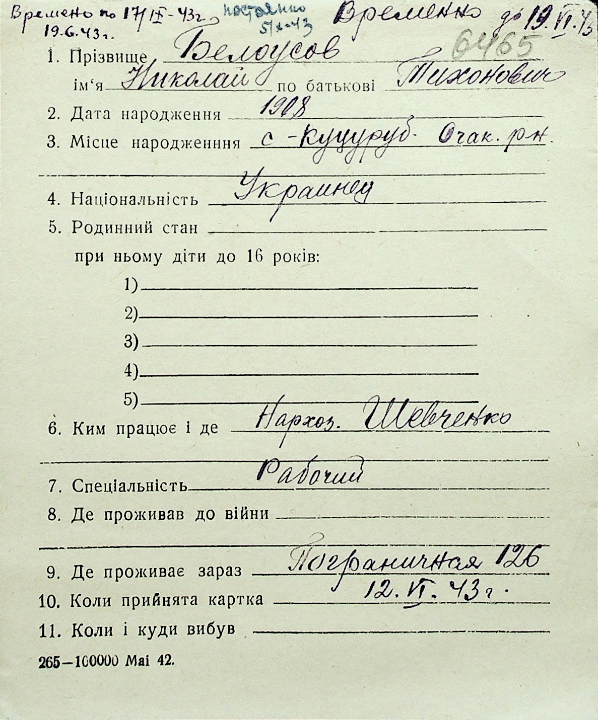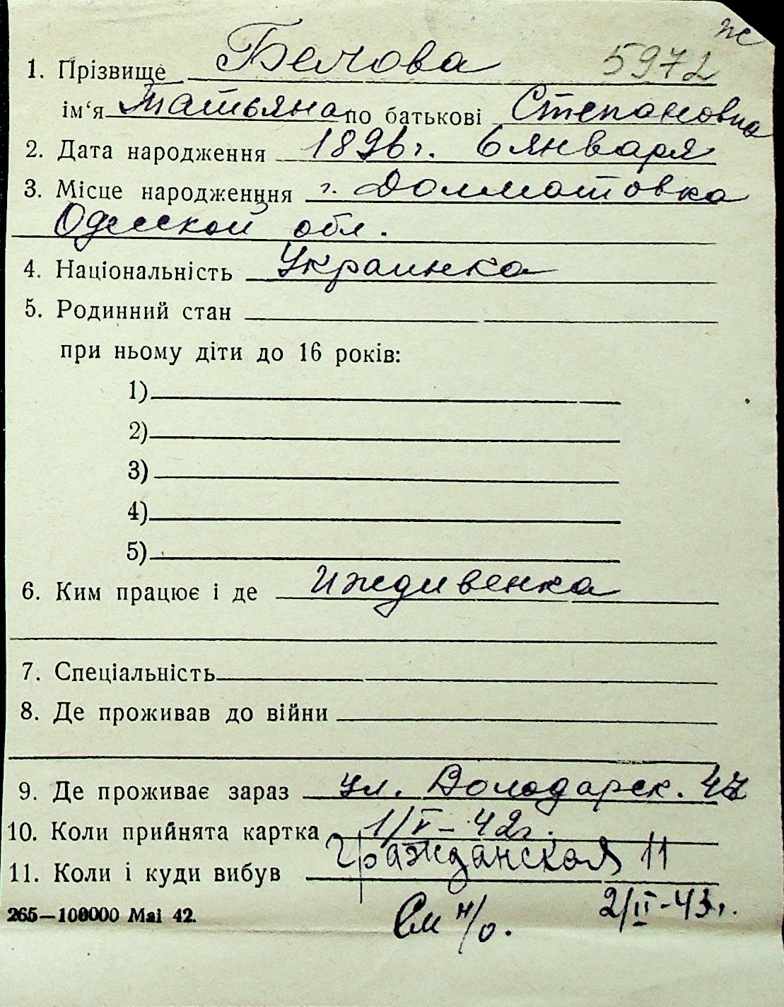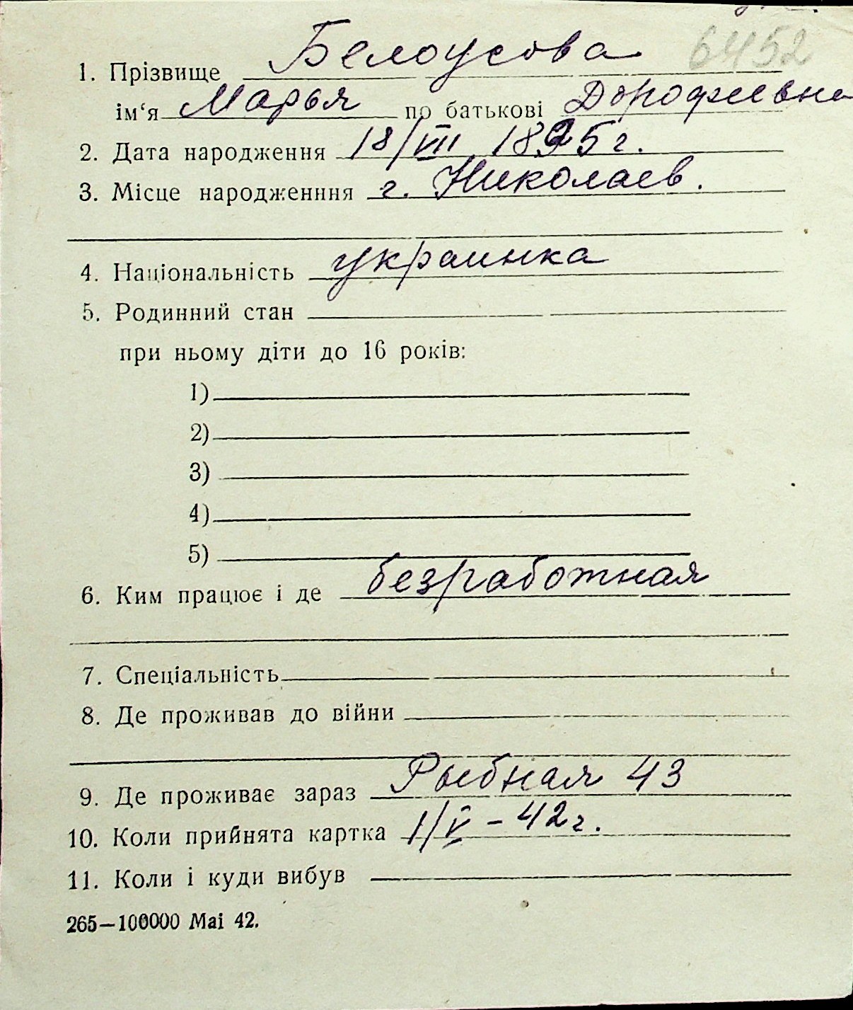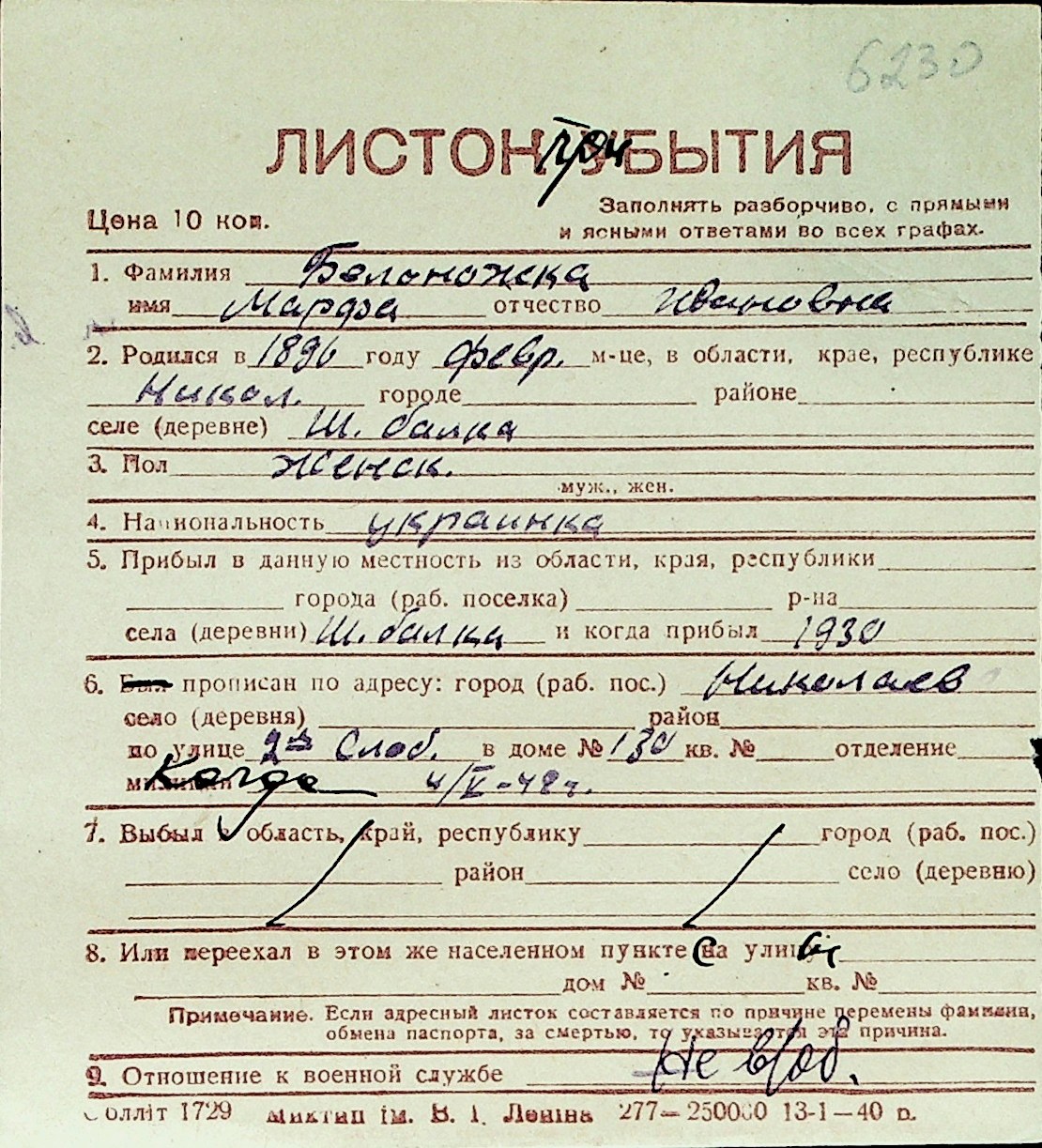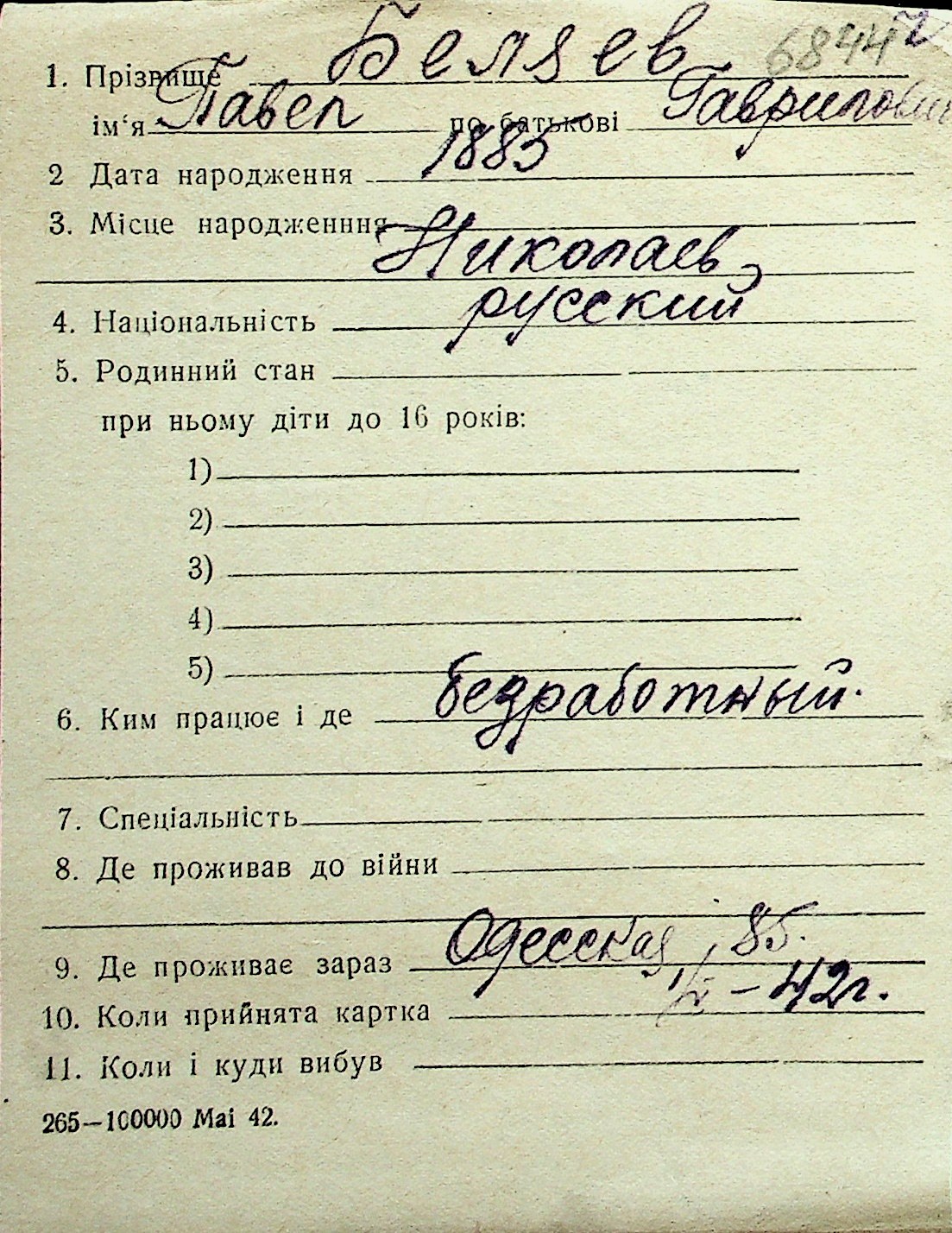 ◦ ◦ Перелік карток на осіб, які мешкали у м. Миколаїв у період окупації 1941–1944 років