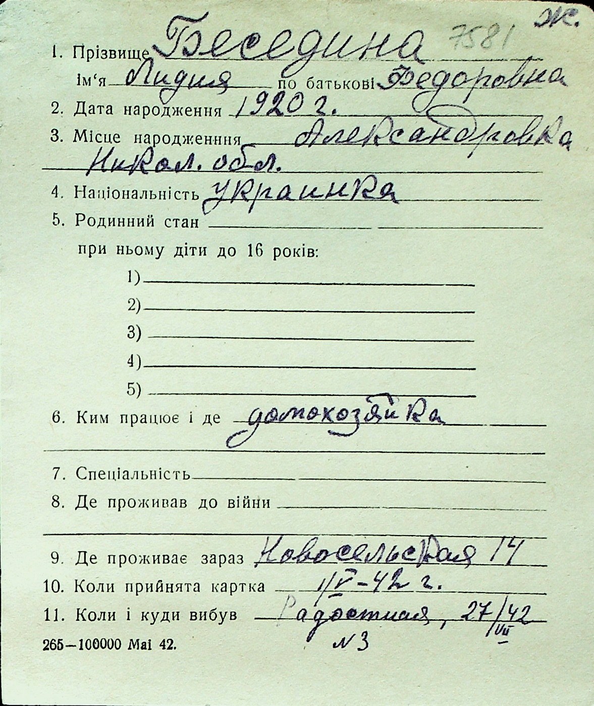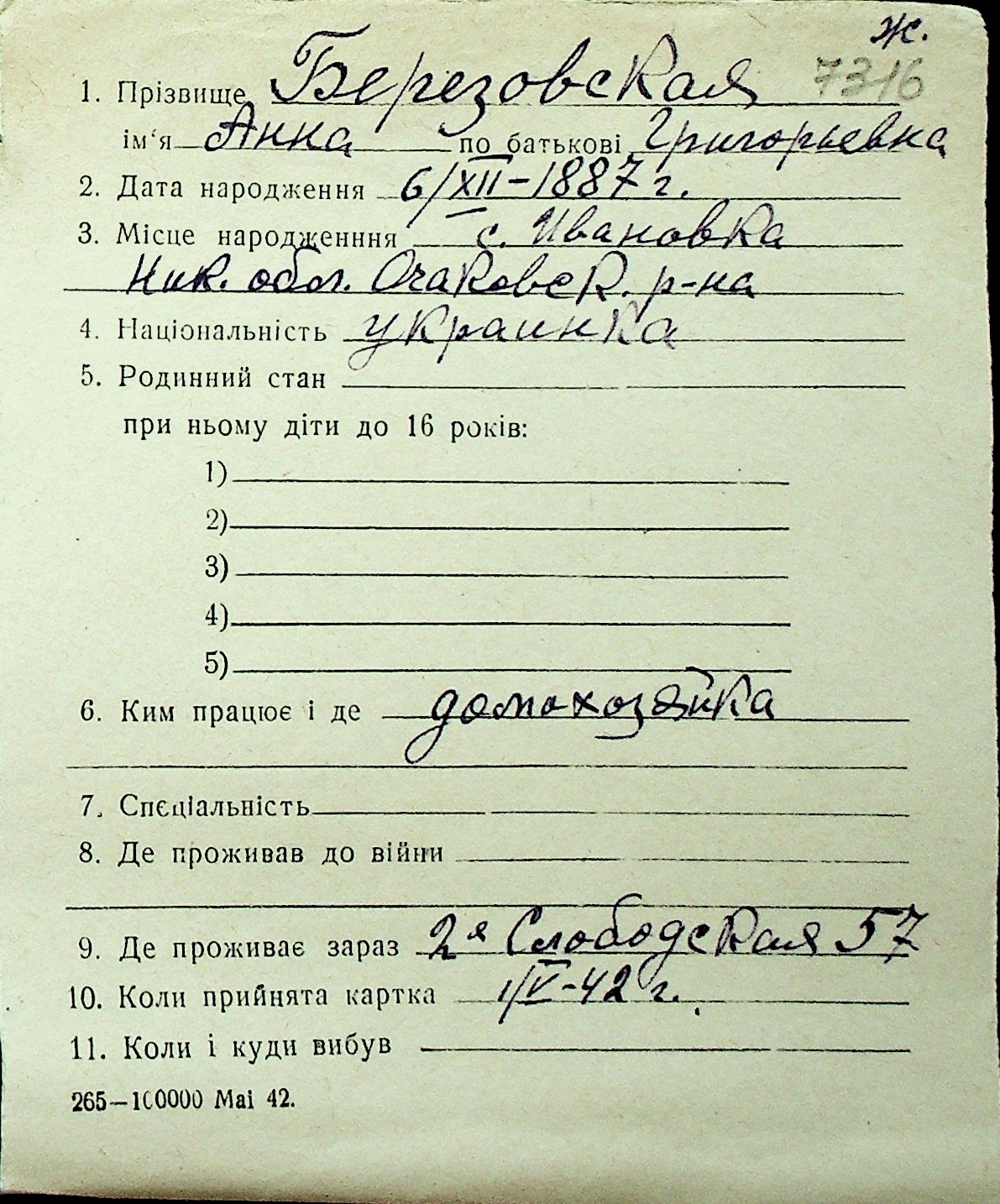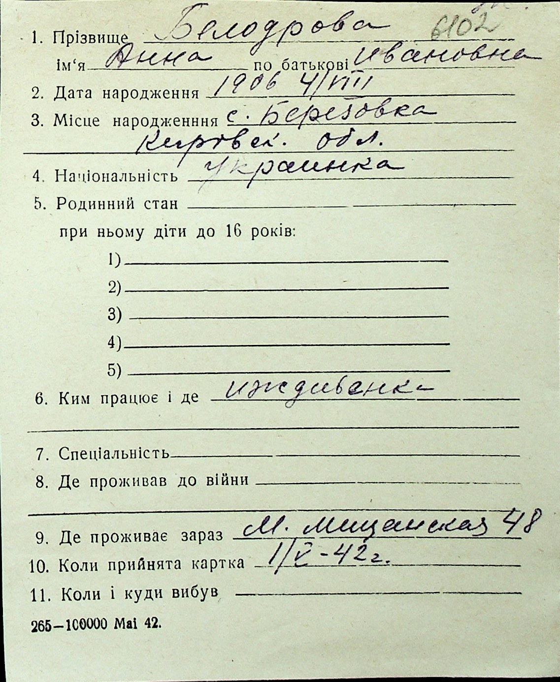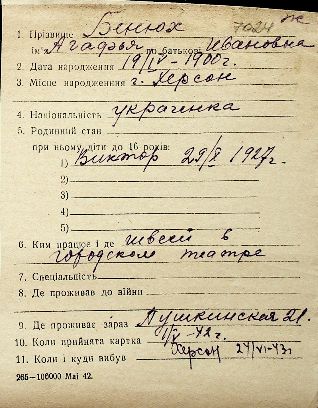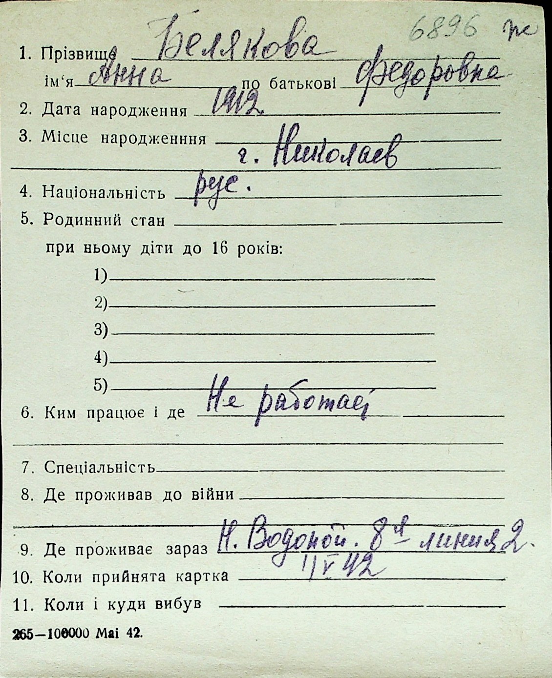 ◦ ◦ Перелік карток на осіб, які мешкали у м. Миколаїв у період окупації 1941–1944 років