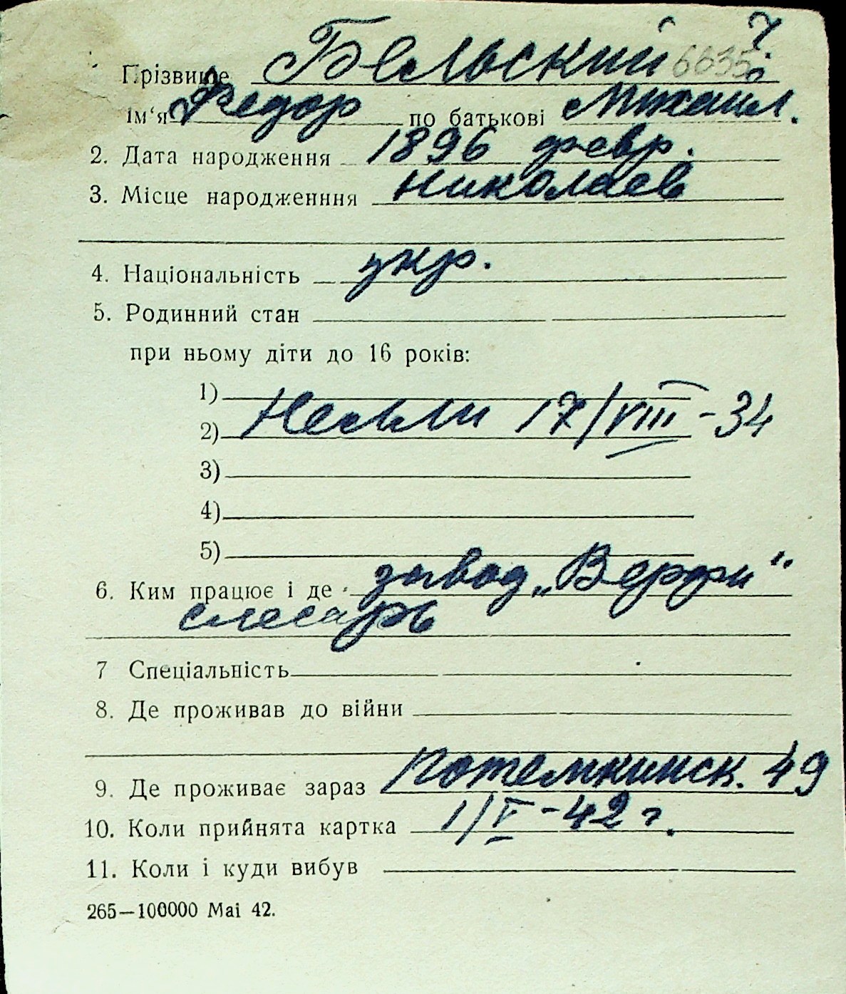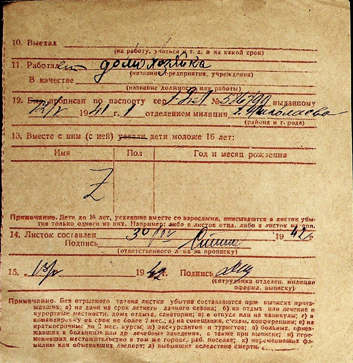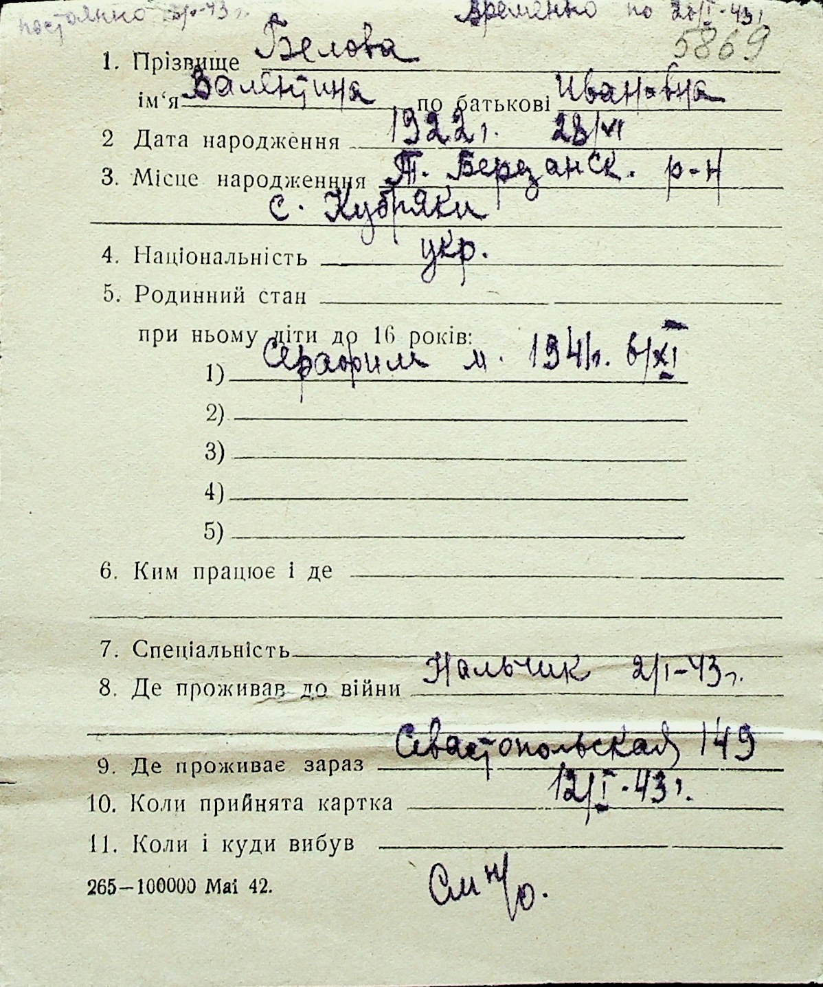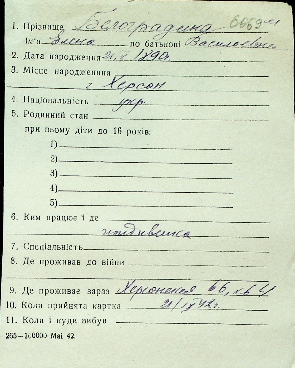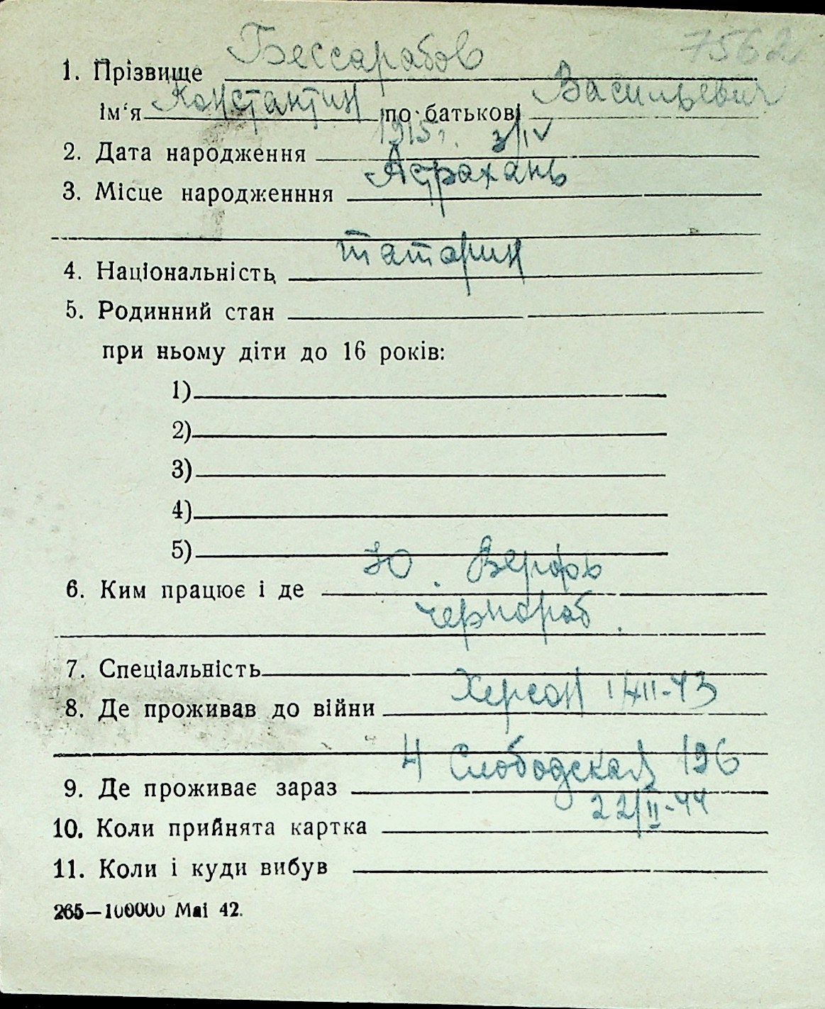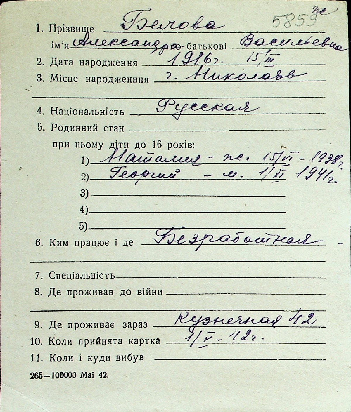 ◦ ◦ Перелік карток на осіб, які мешкали у м. Миколаїв у період окупації 1941–1944 років