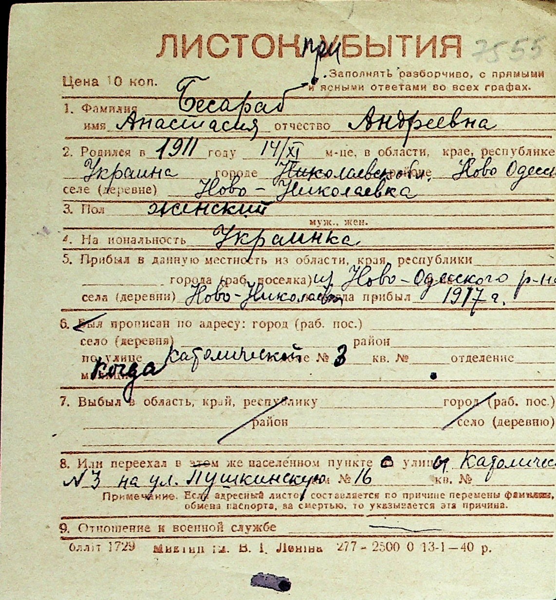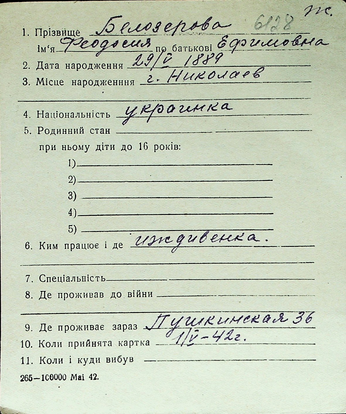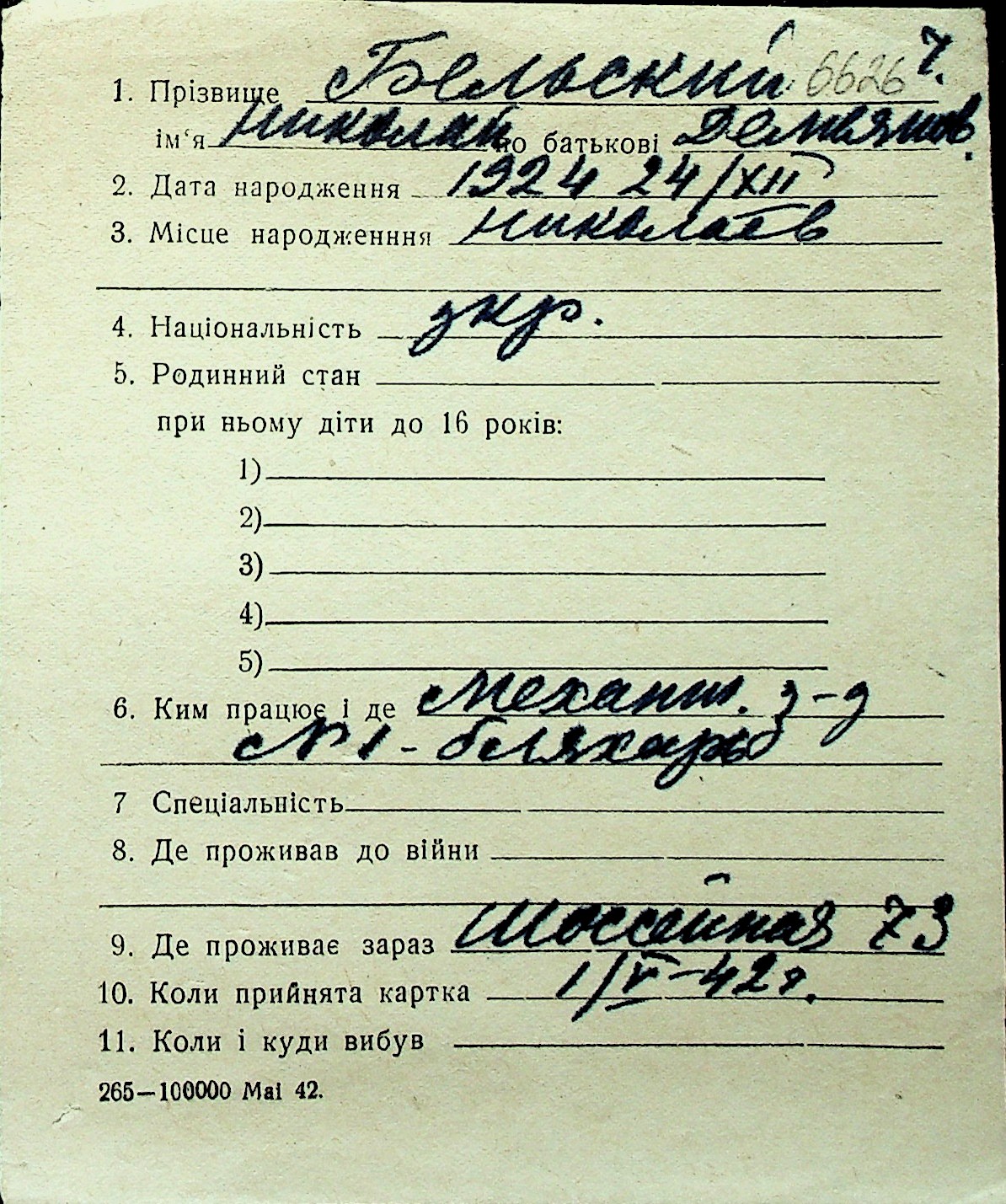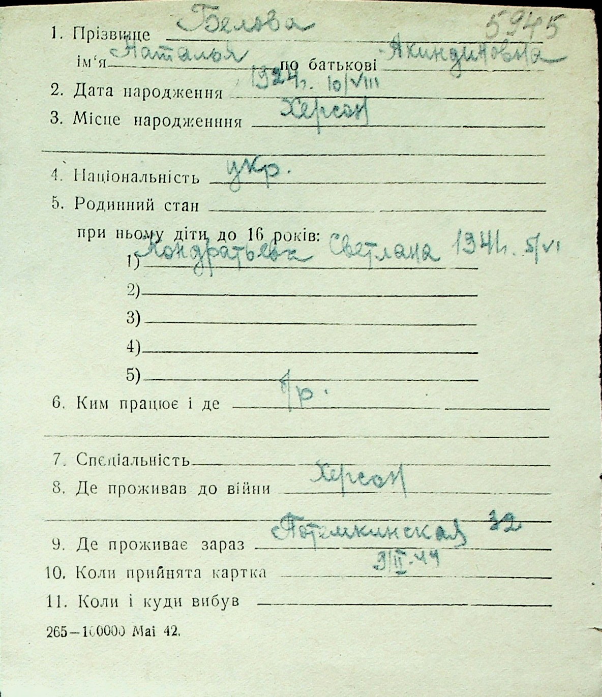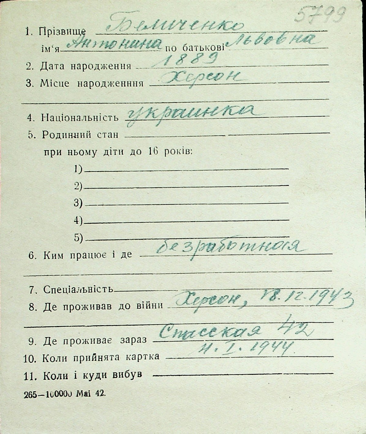 ◦ ◦ Перелік карток на осіб, які мешкали у м. Миколаїв у період окупації 1941–1944 років