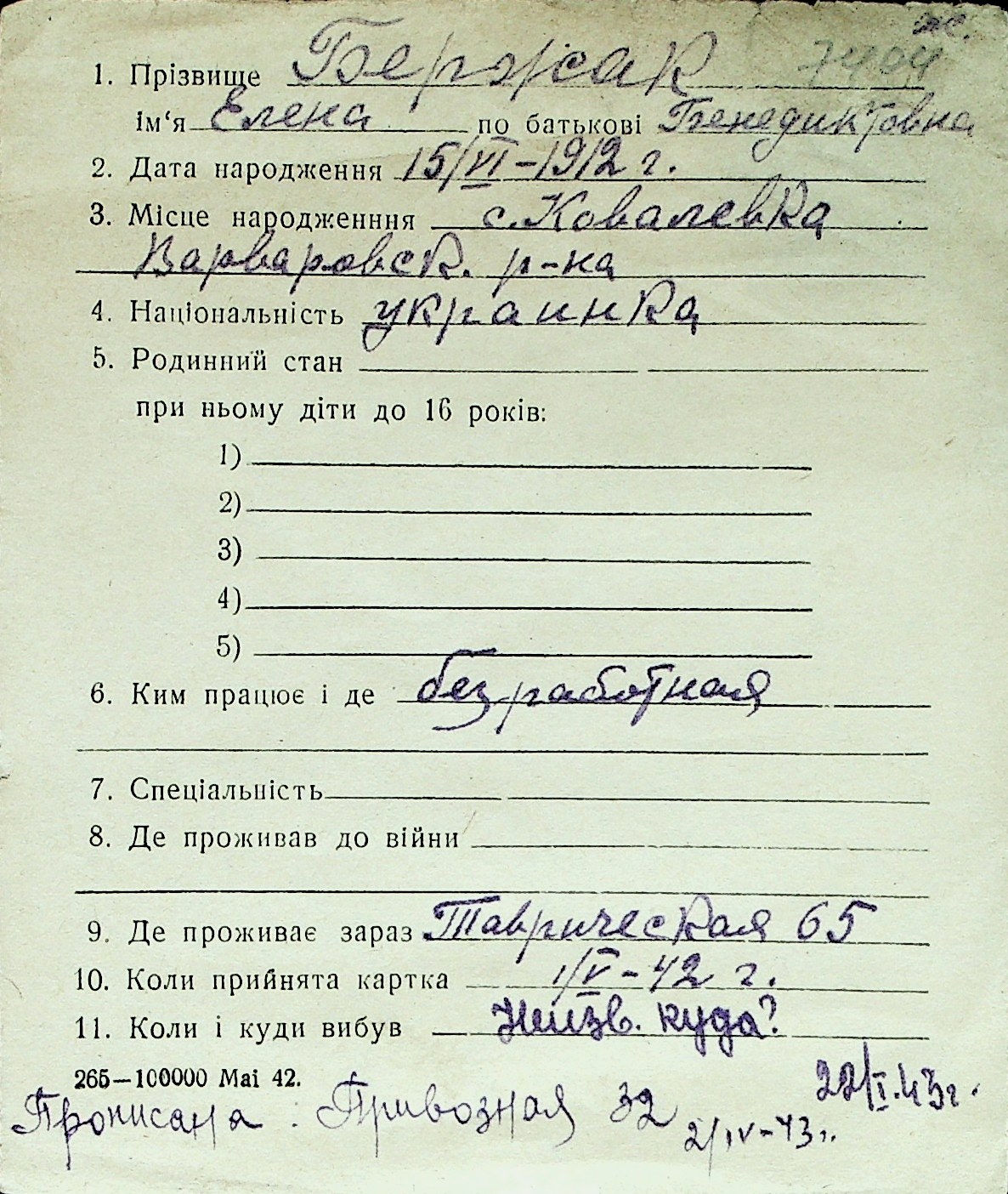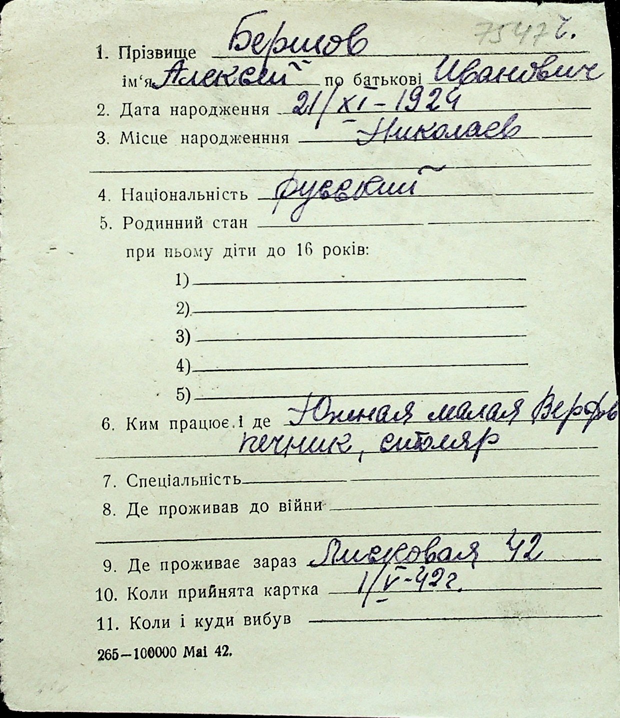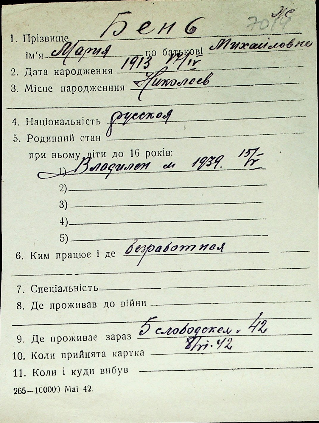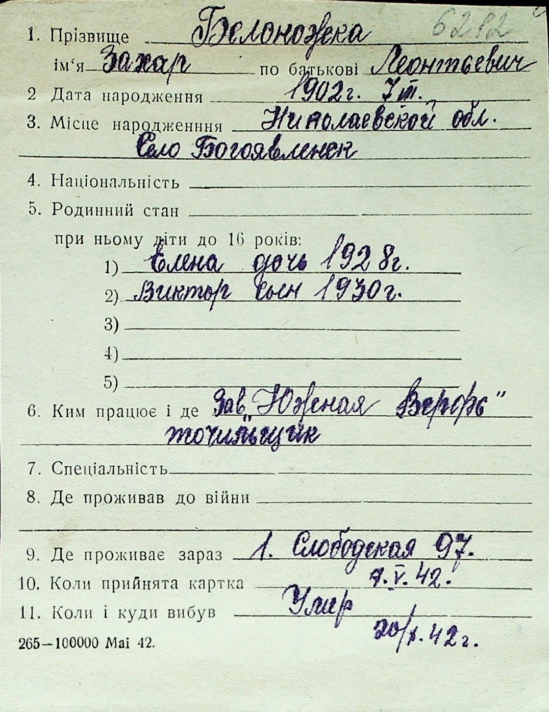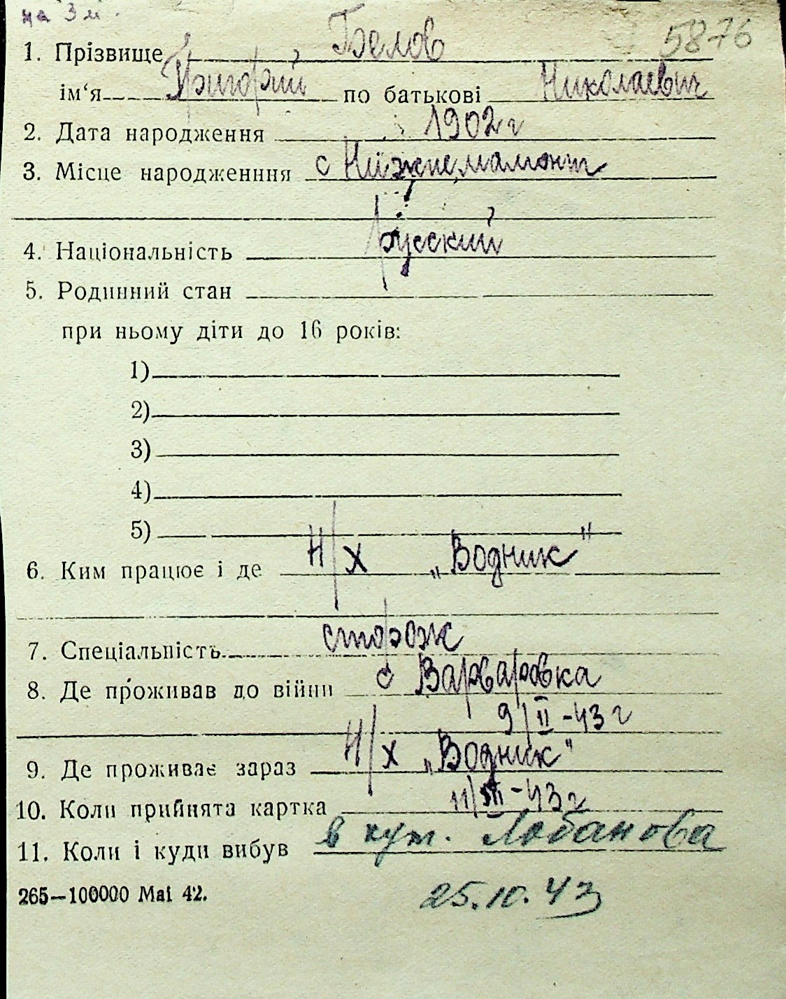 ◦ ◦ Перелік карток на осіб, які мешкали у м. Миколаїв у період окупації 1941–1944 років