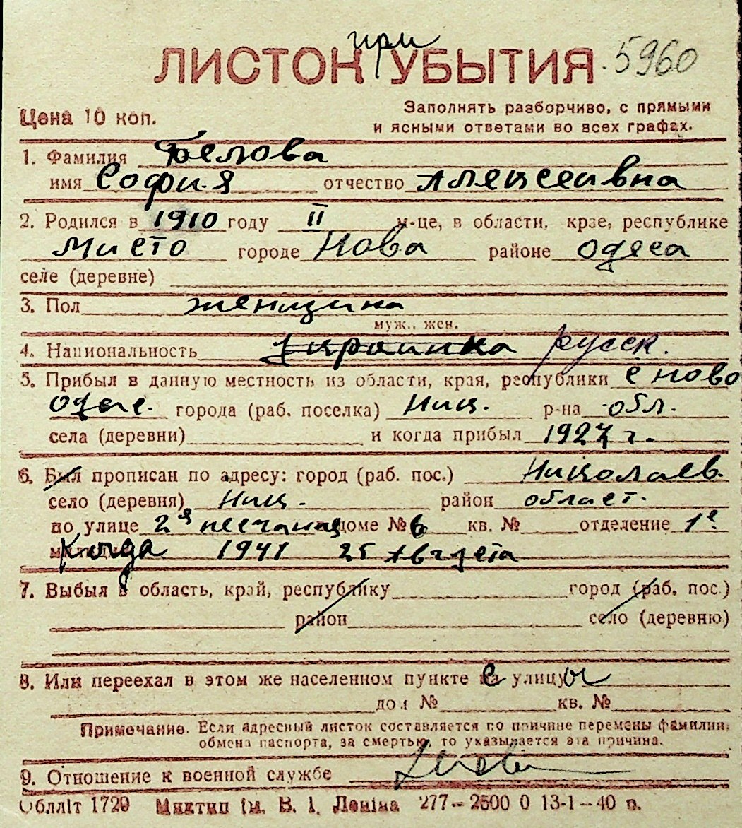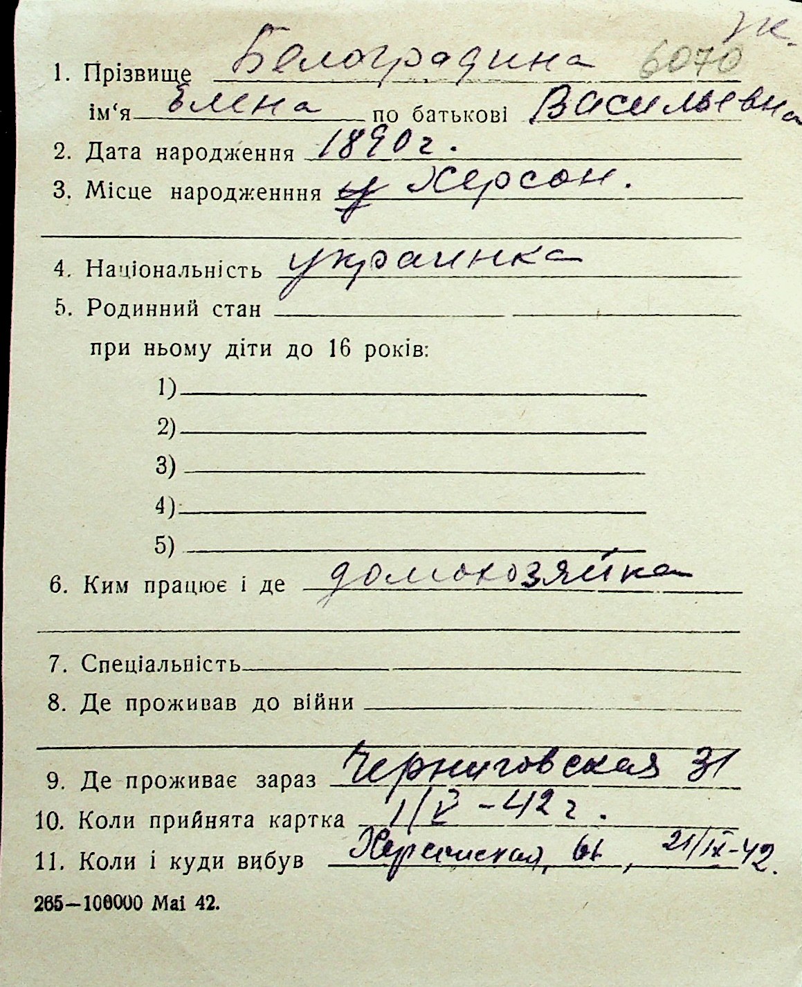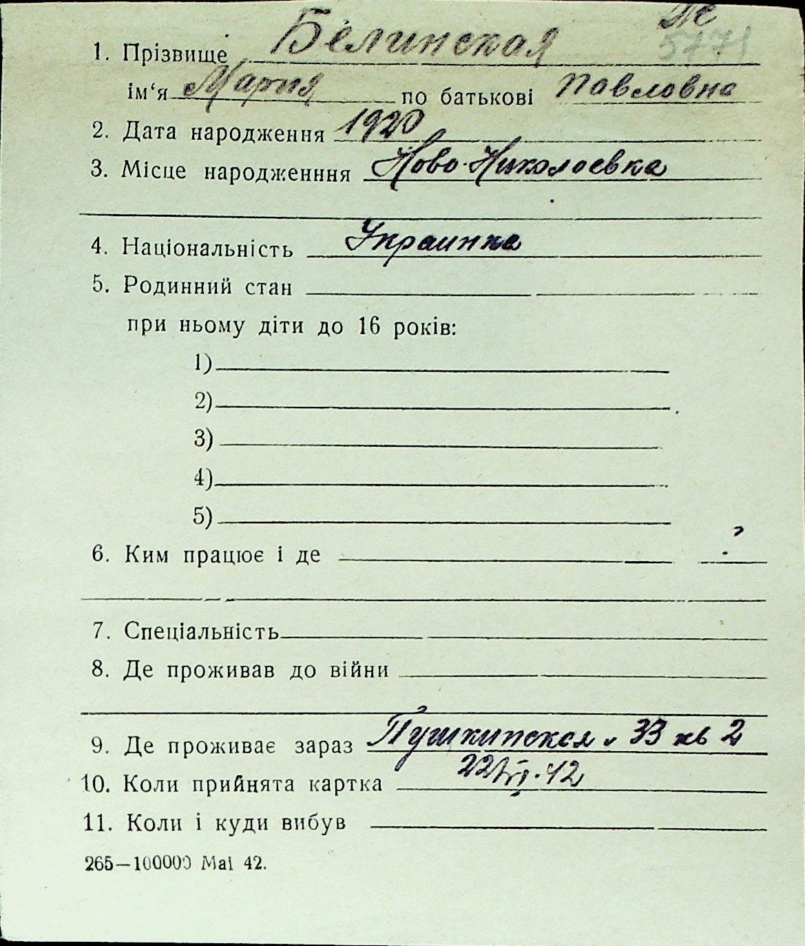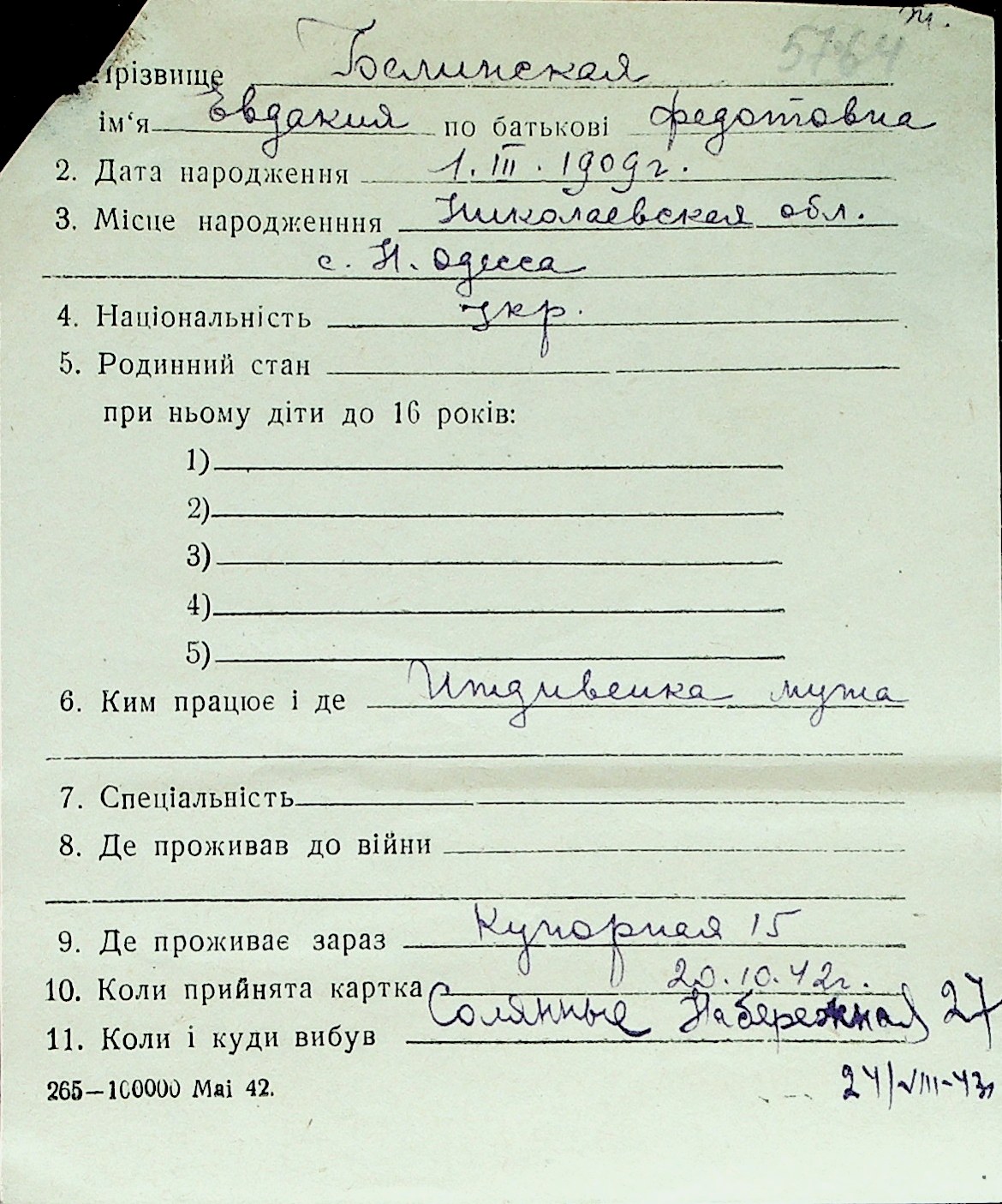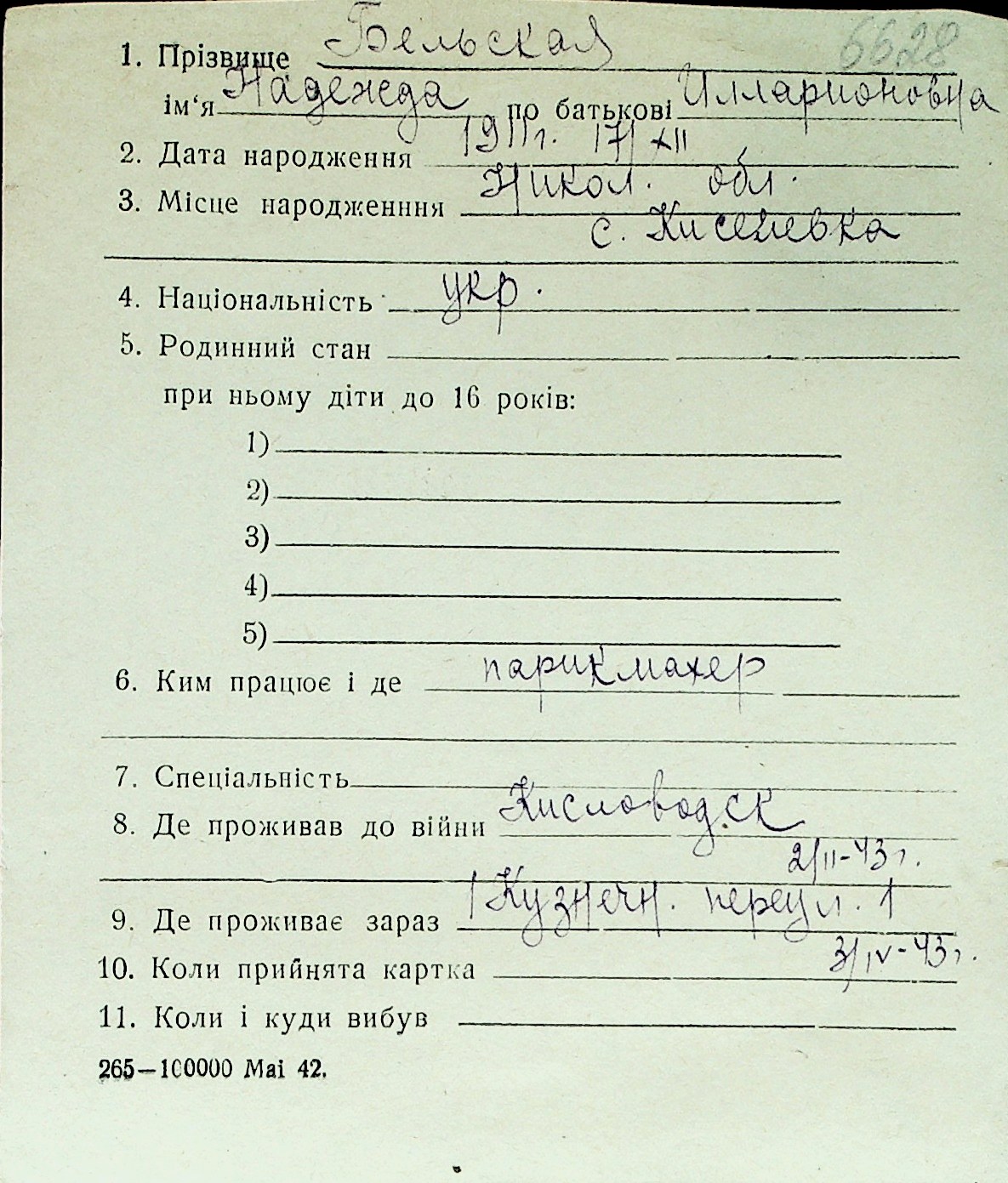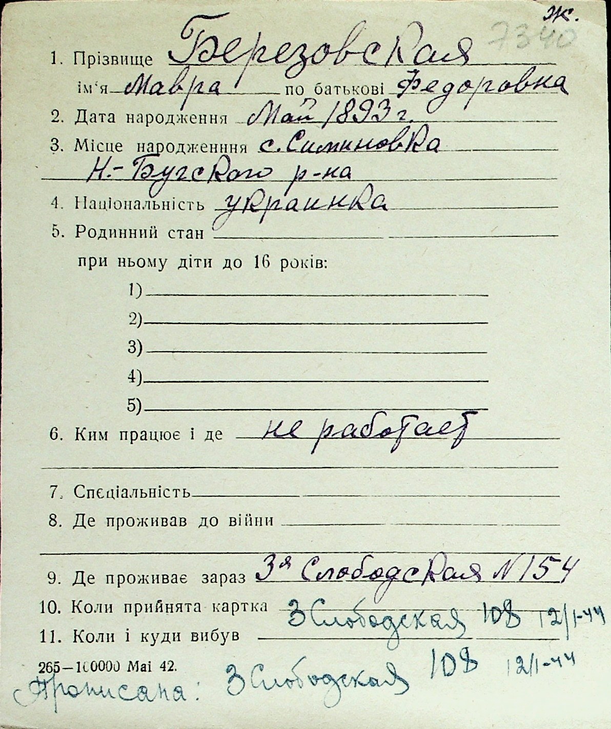 ◦ ◦ Перелік карток на осіб, які мешкали у м. Миколаїв у період окупації 1941–1944 років