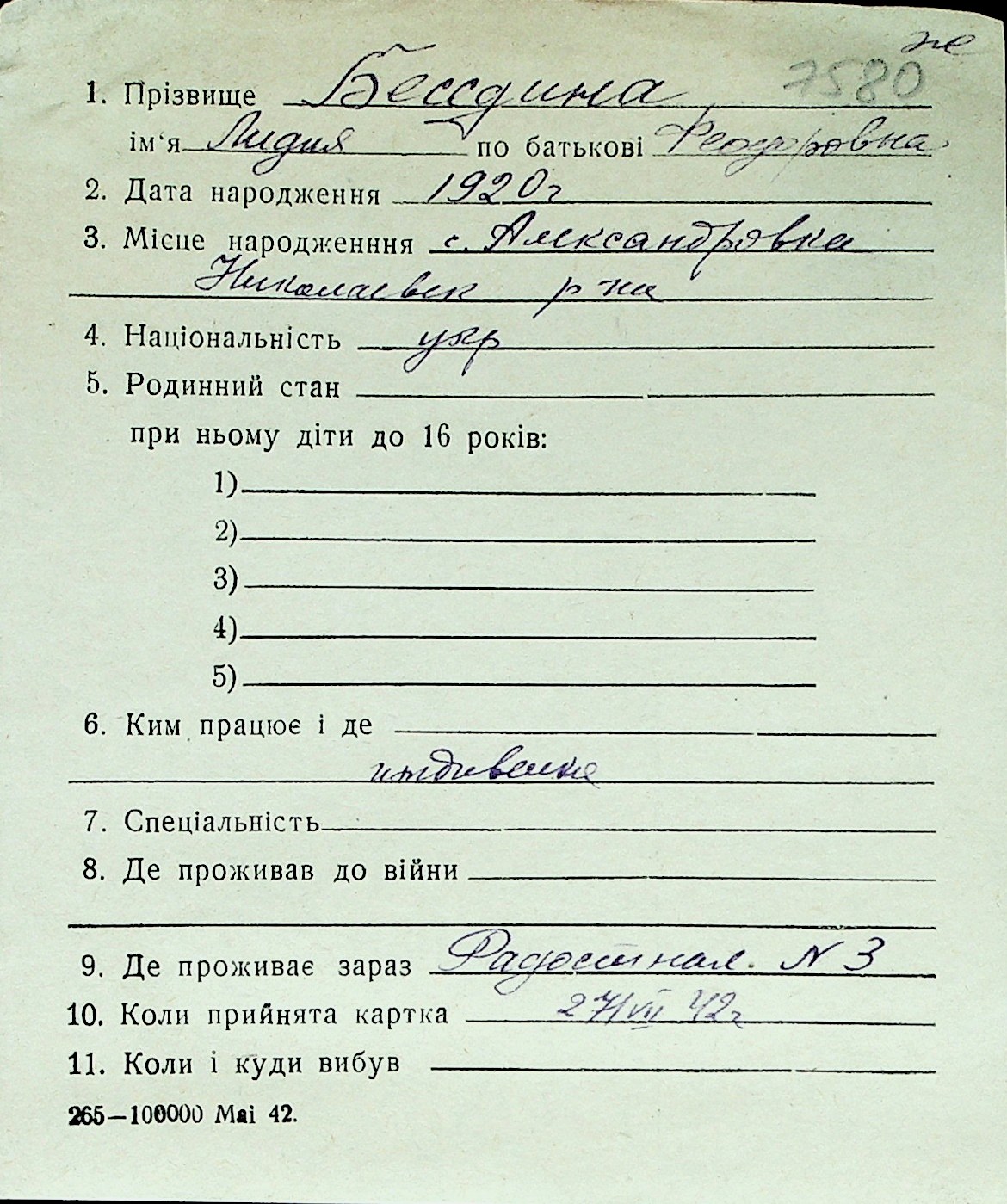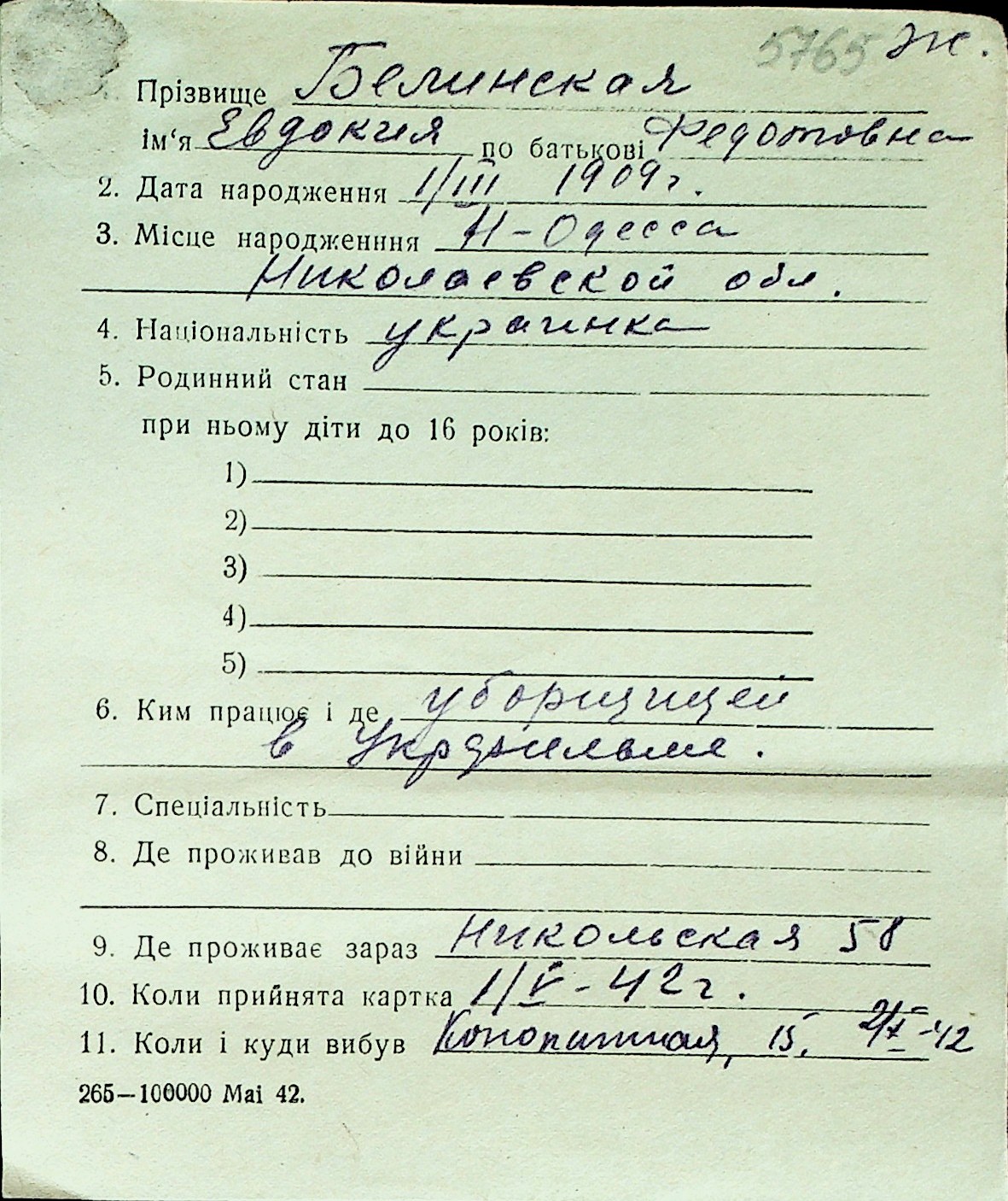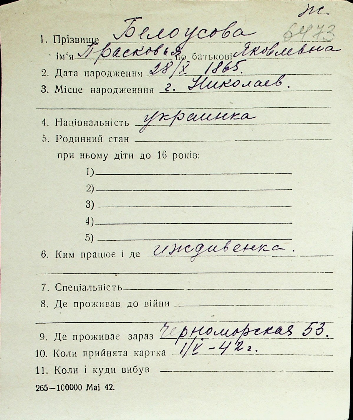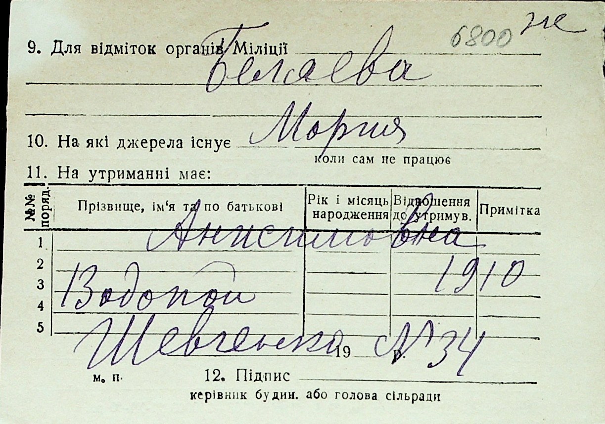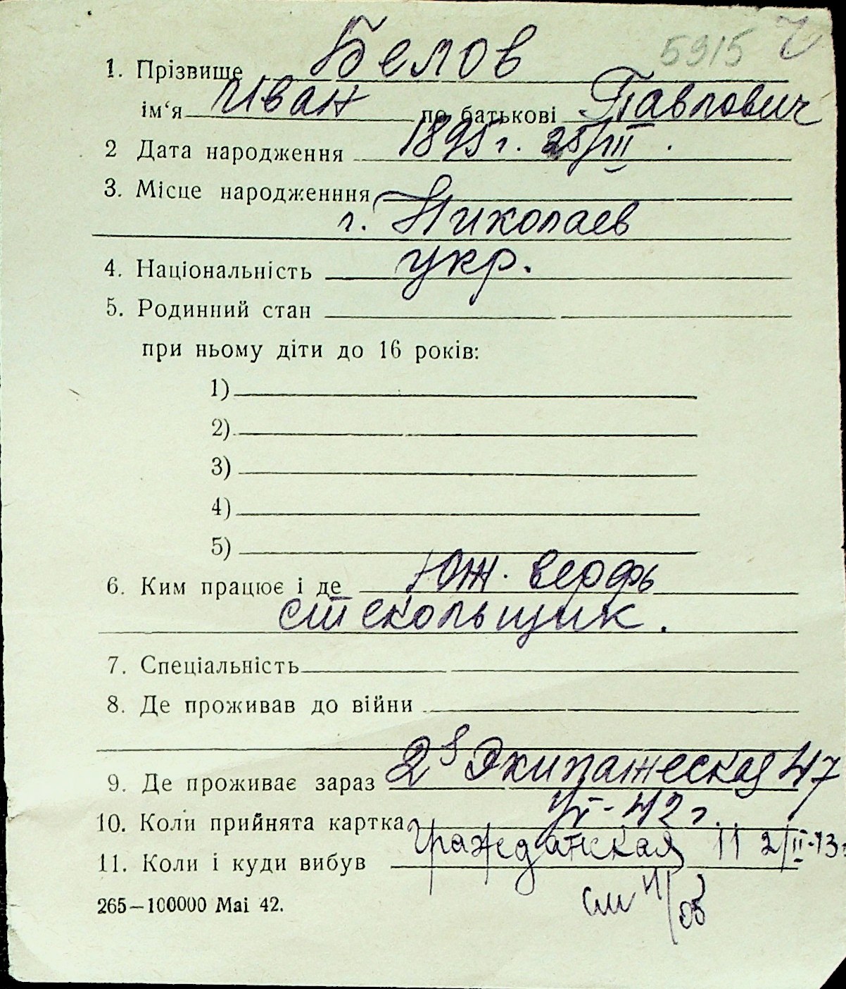 ◦ ◦ Перелік карток на осіб, які мешкали у м. Миколаїв у період окупації 1941–1944 років