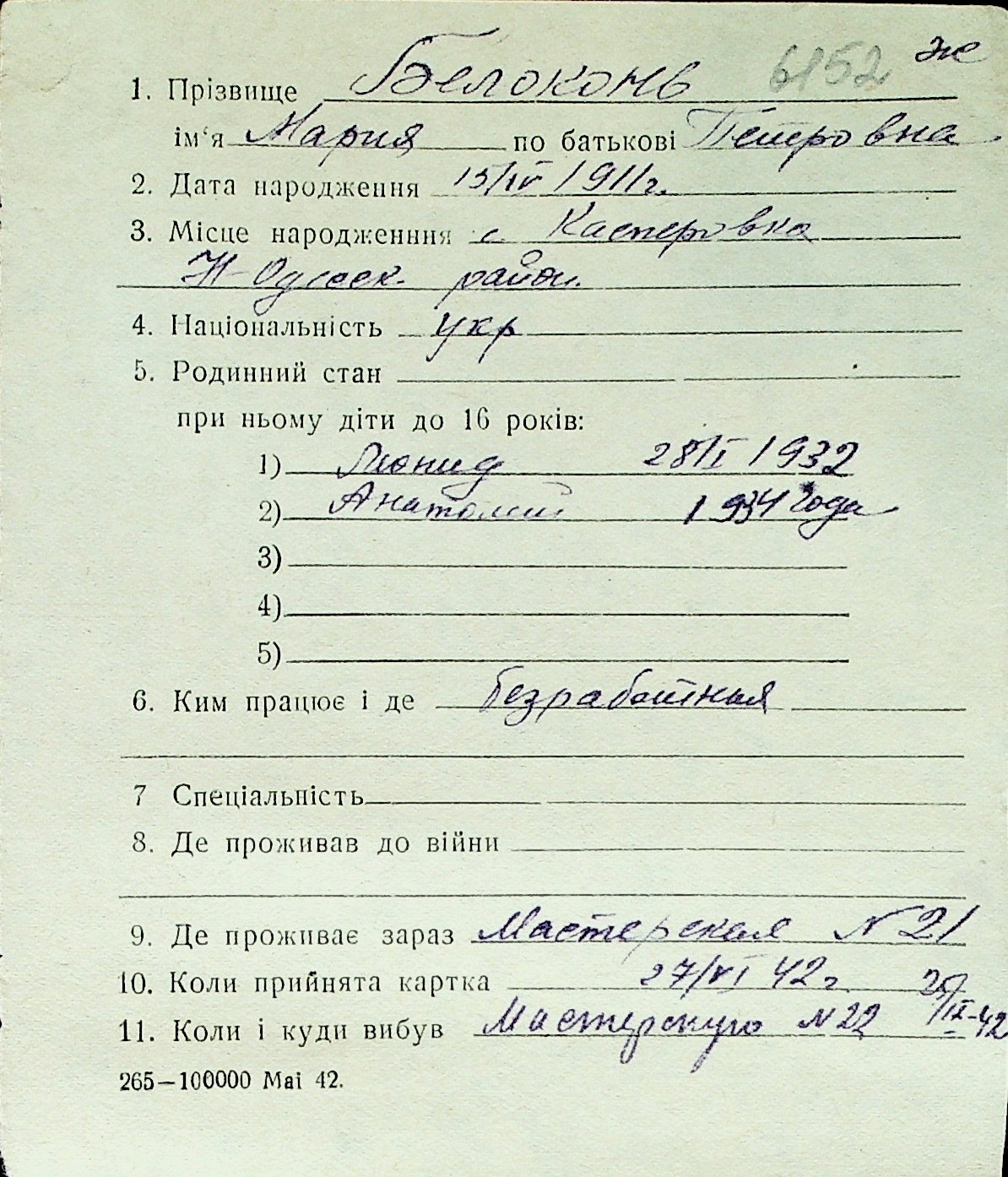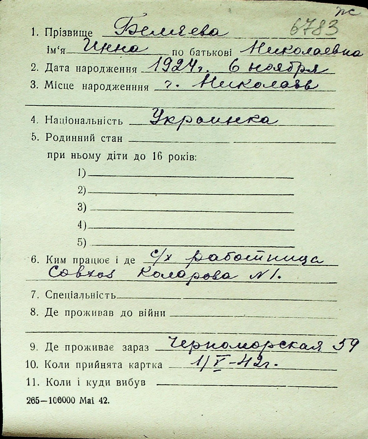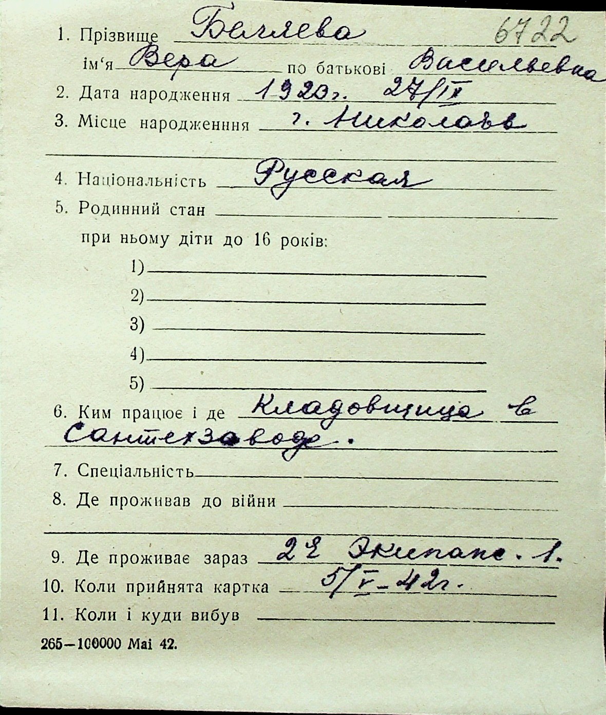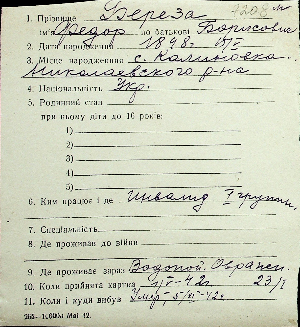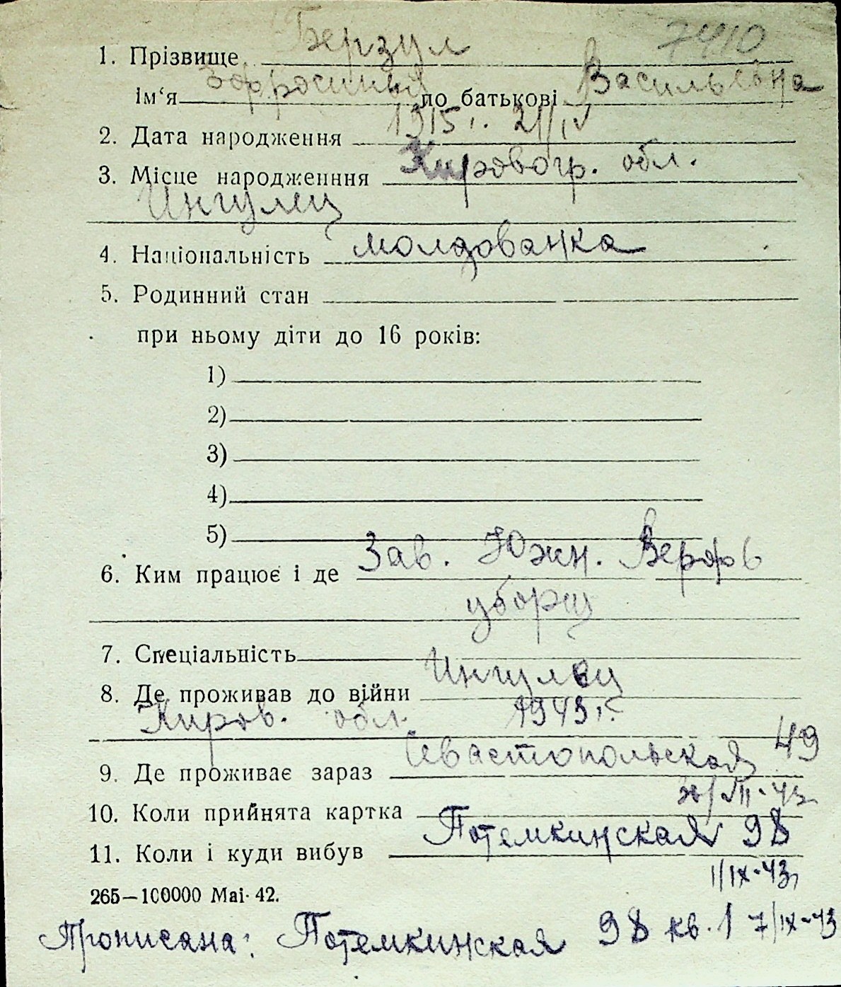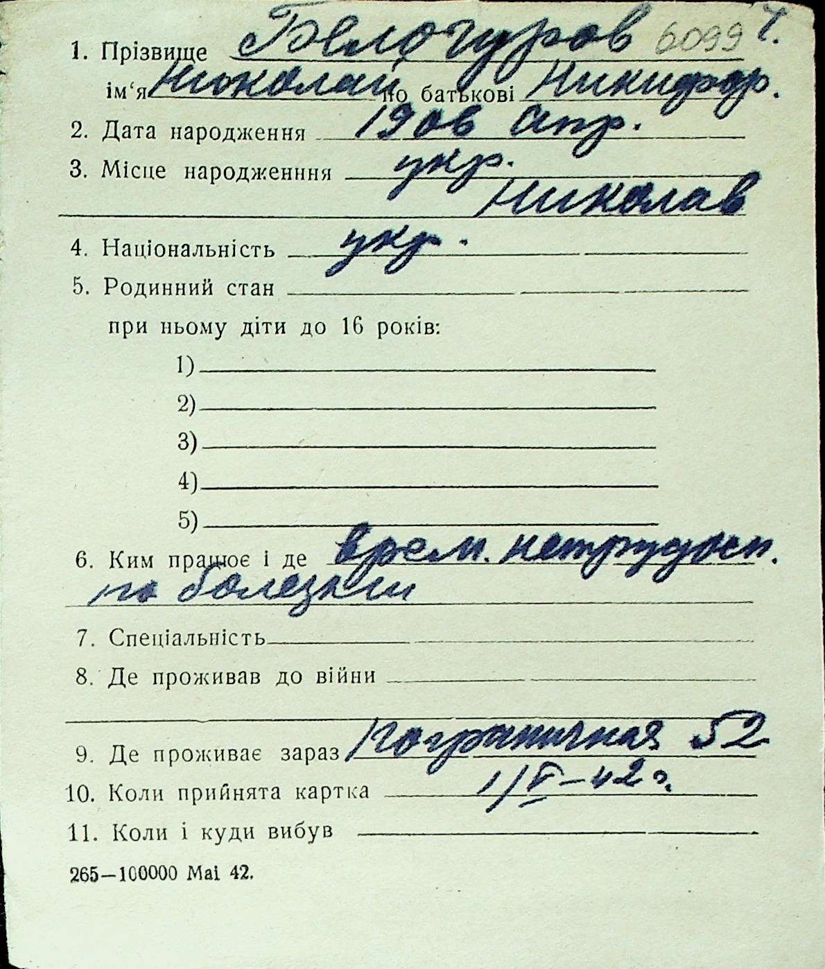 ◦ ◦ Перелік карток на осіб, які мешкали у м. Миколаїв у період окупації 1941–1944 років