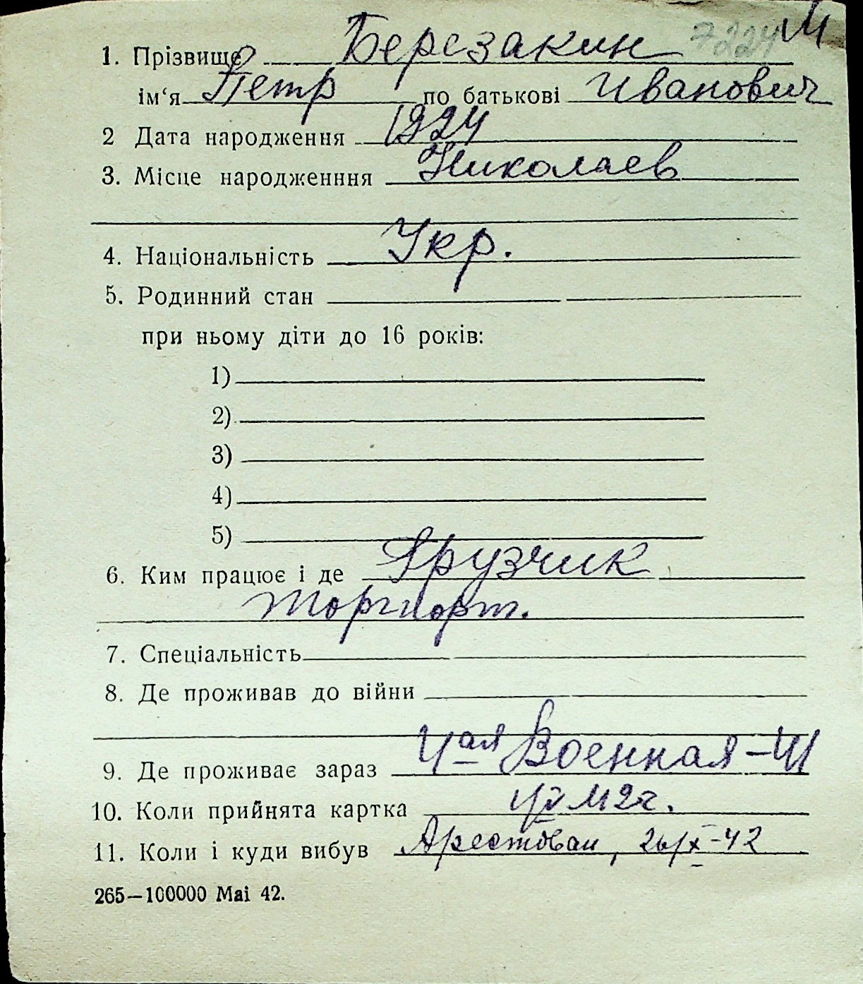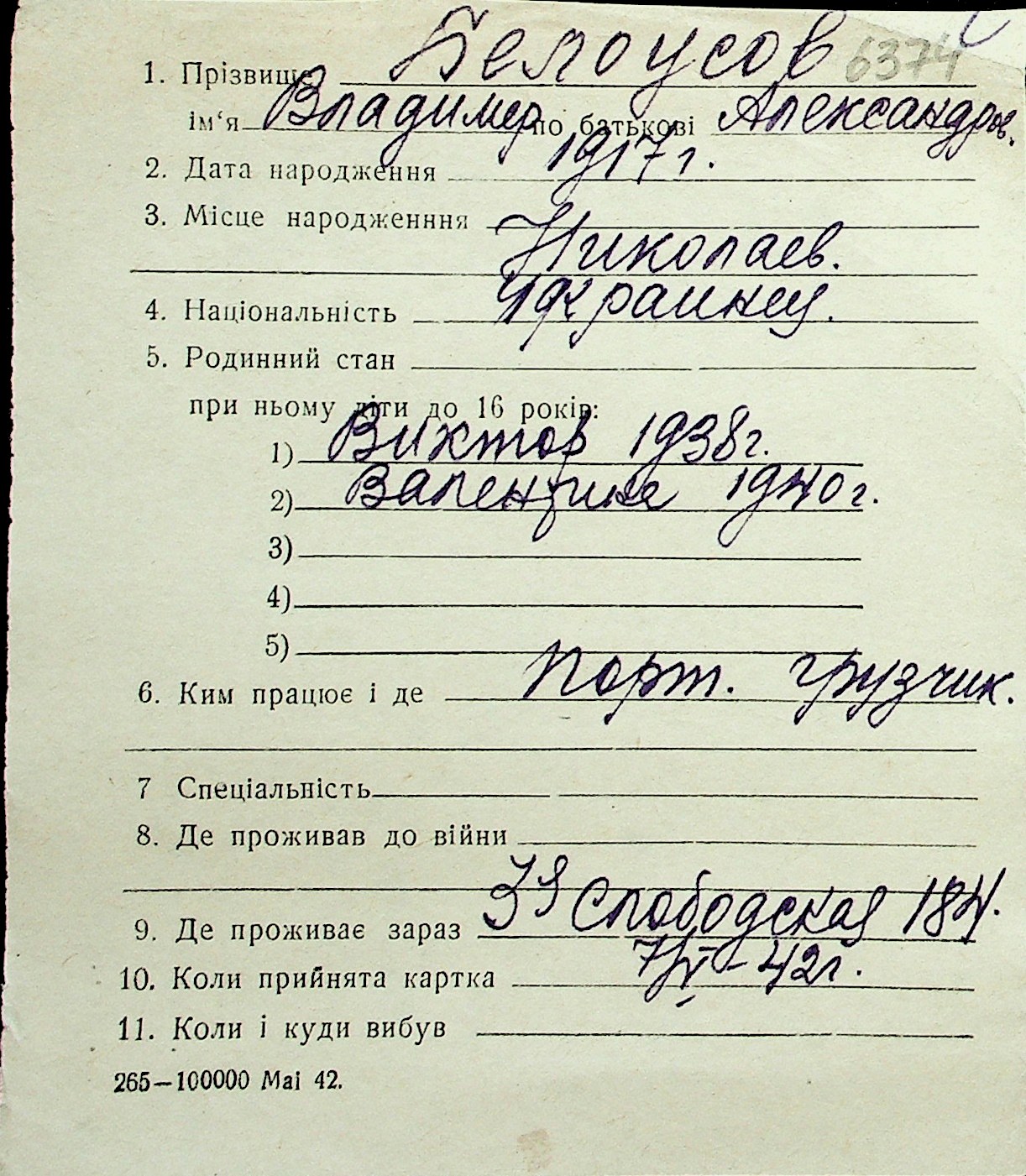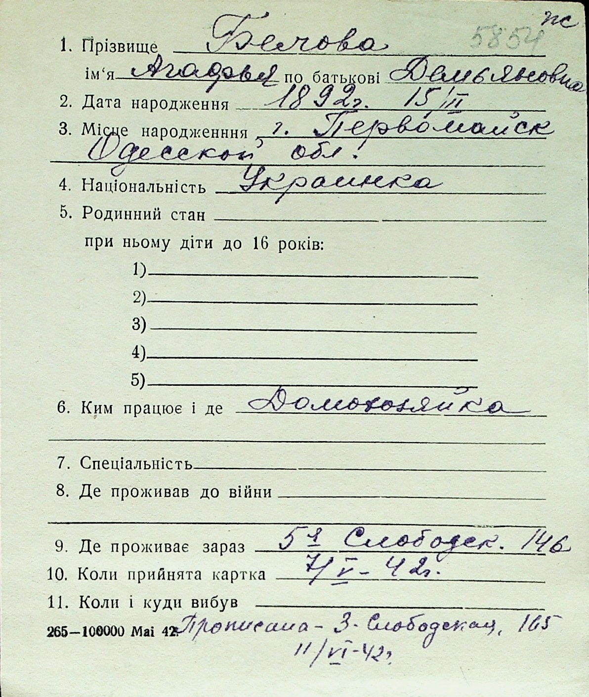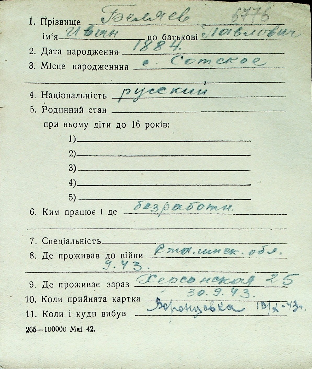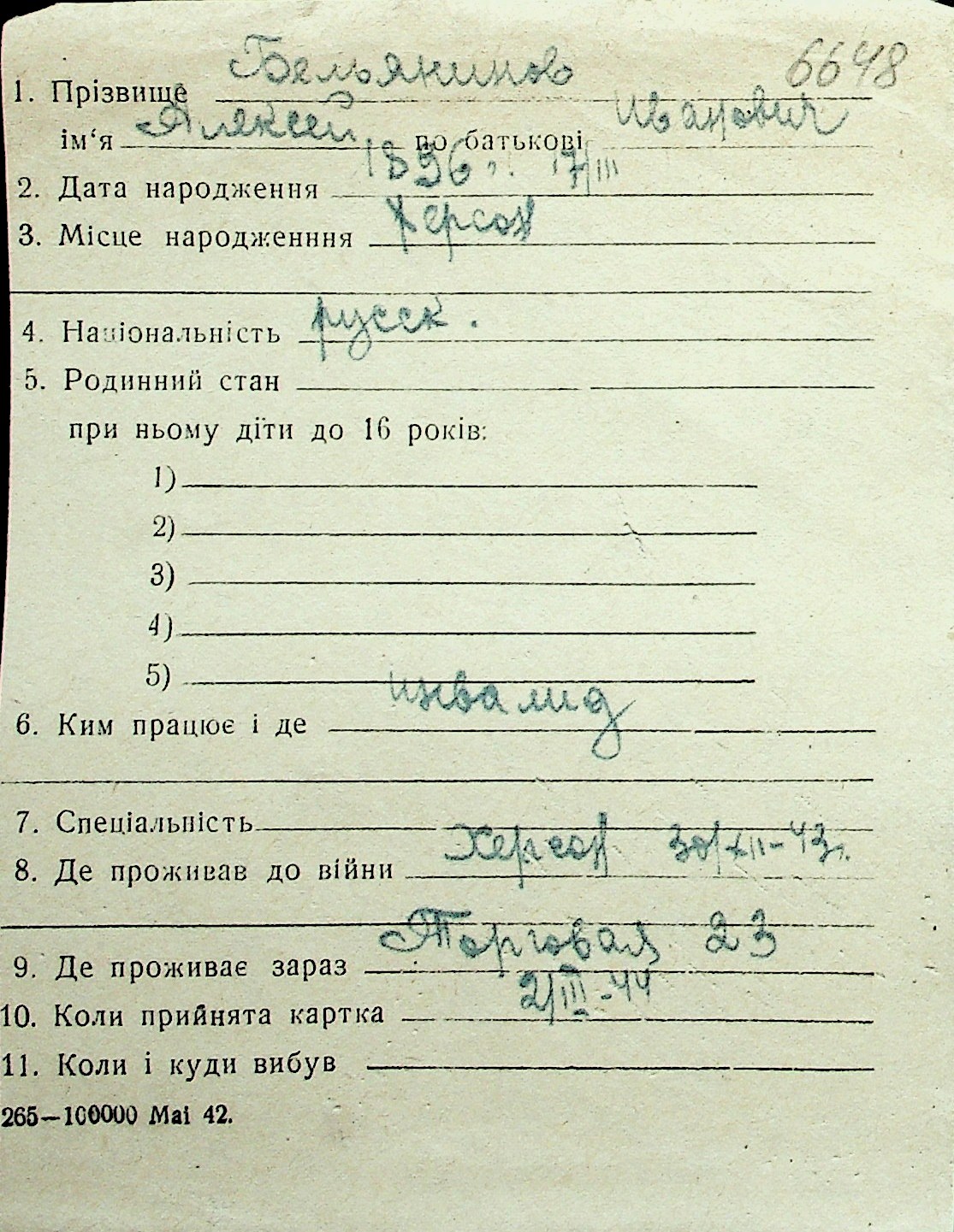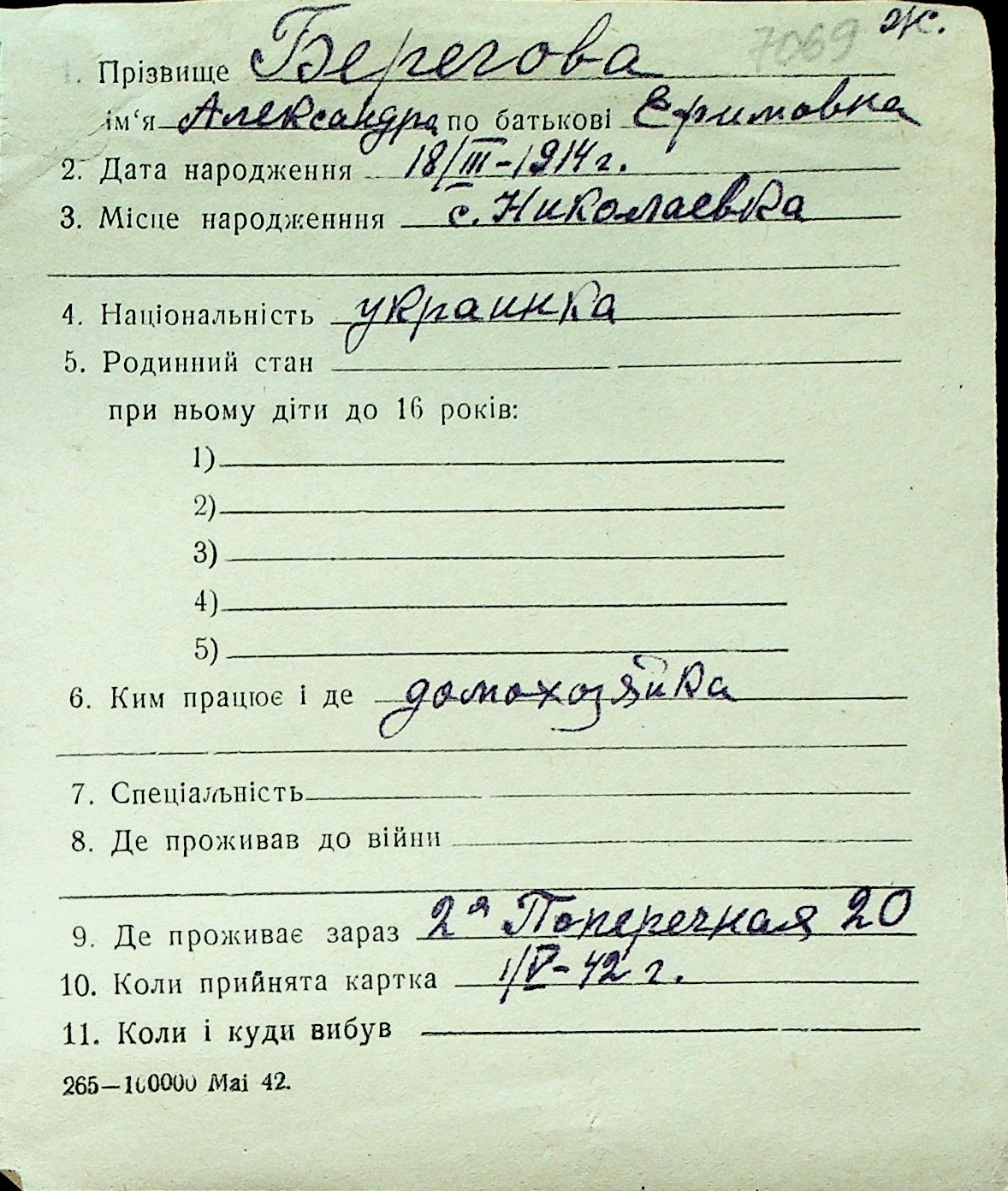 ◦ ◦ Перелік карток на осіб, які мешкали у м. Миколаїв у період окупації 1941–1944 років