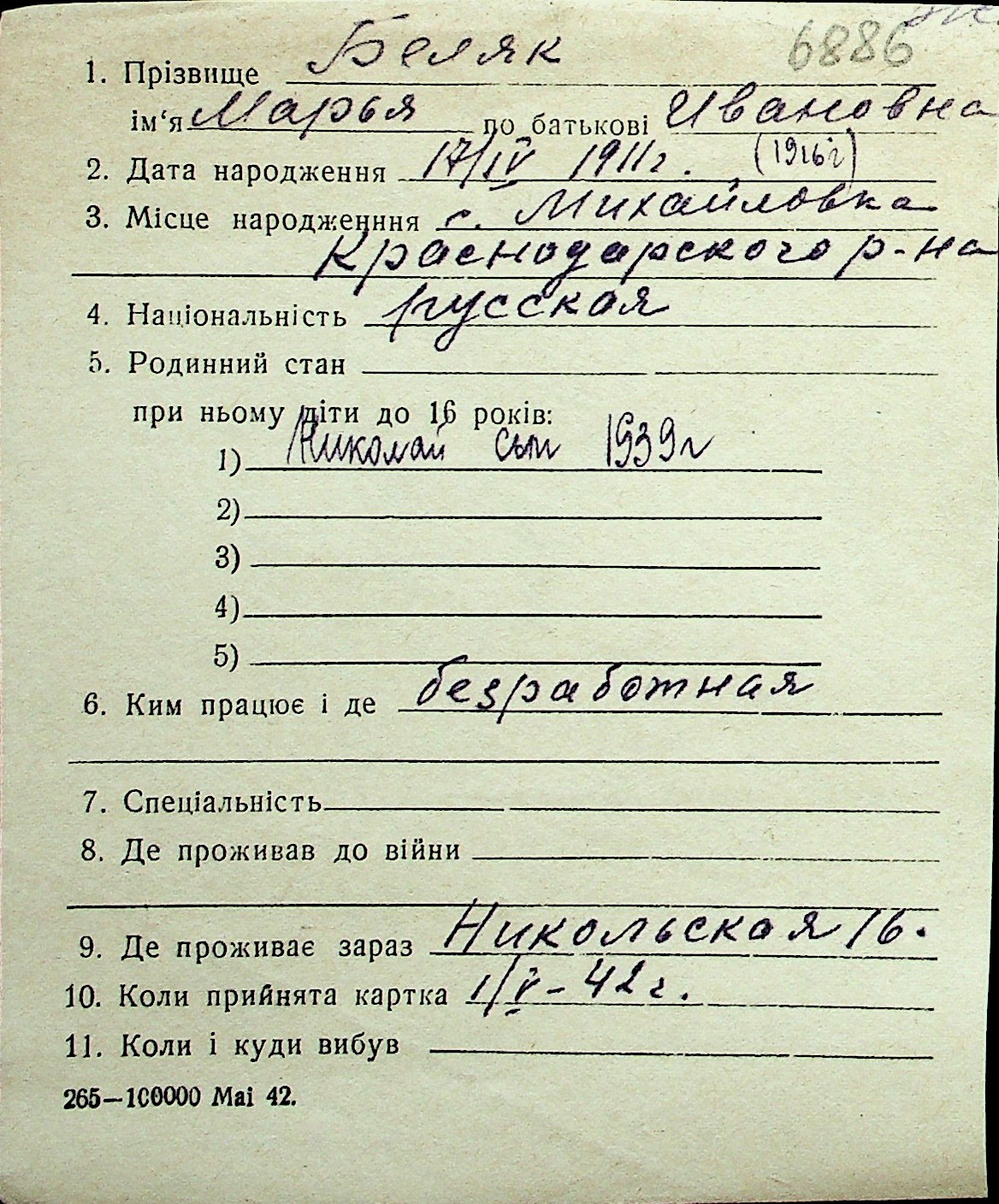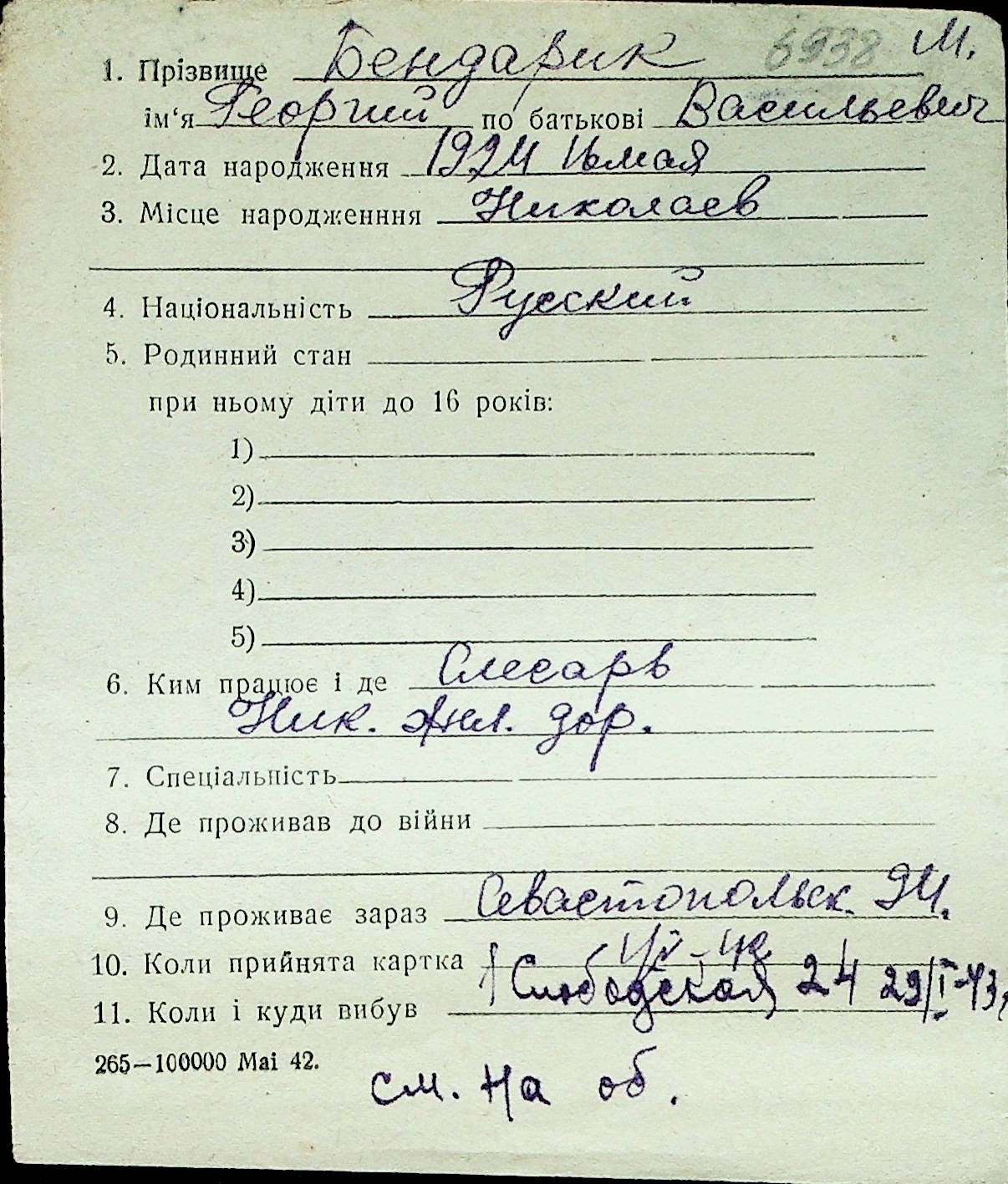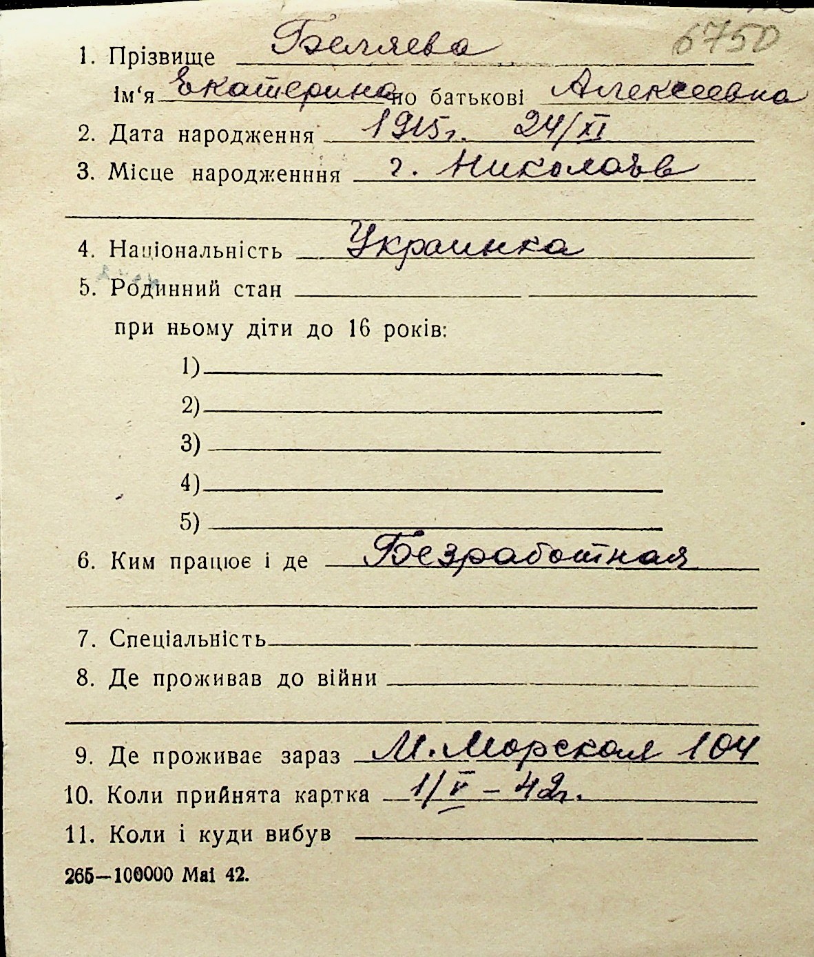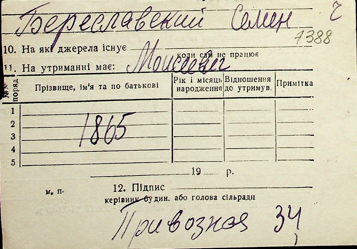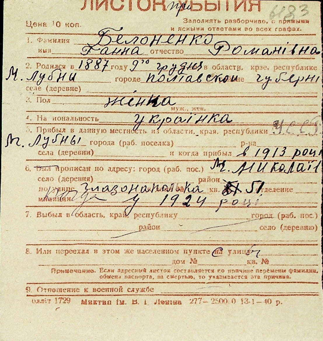 ◦ ◦ Перелік карток на осіб, які мешкали у м. Миколаїв у період окупації 1941–1944 років