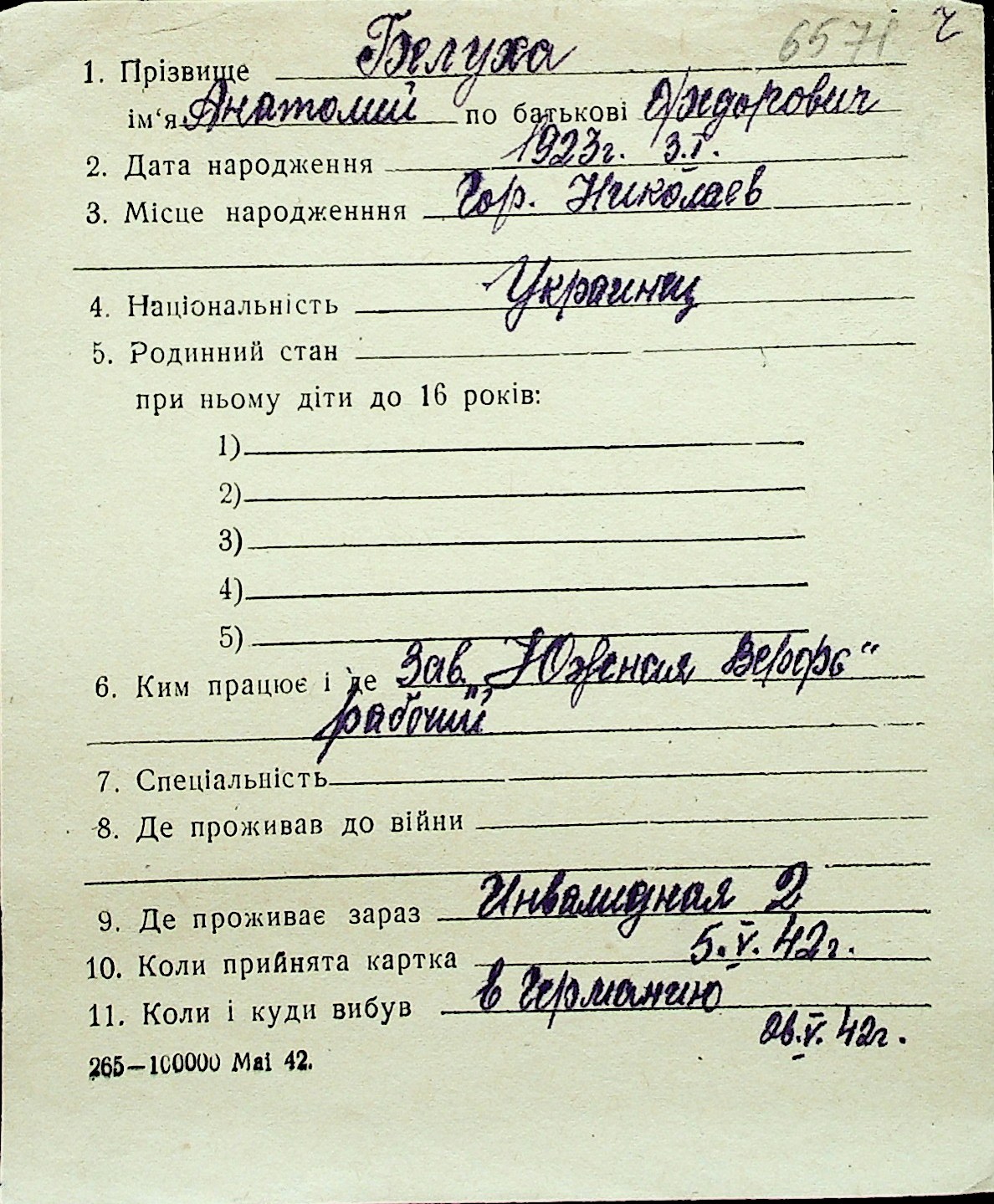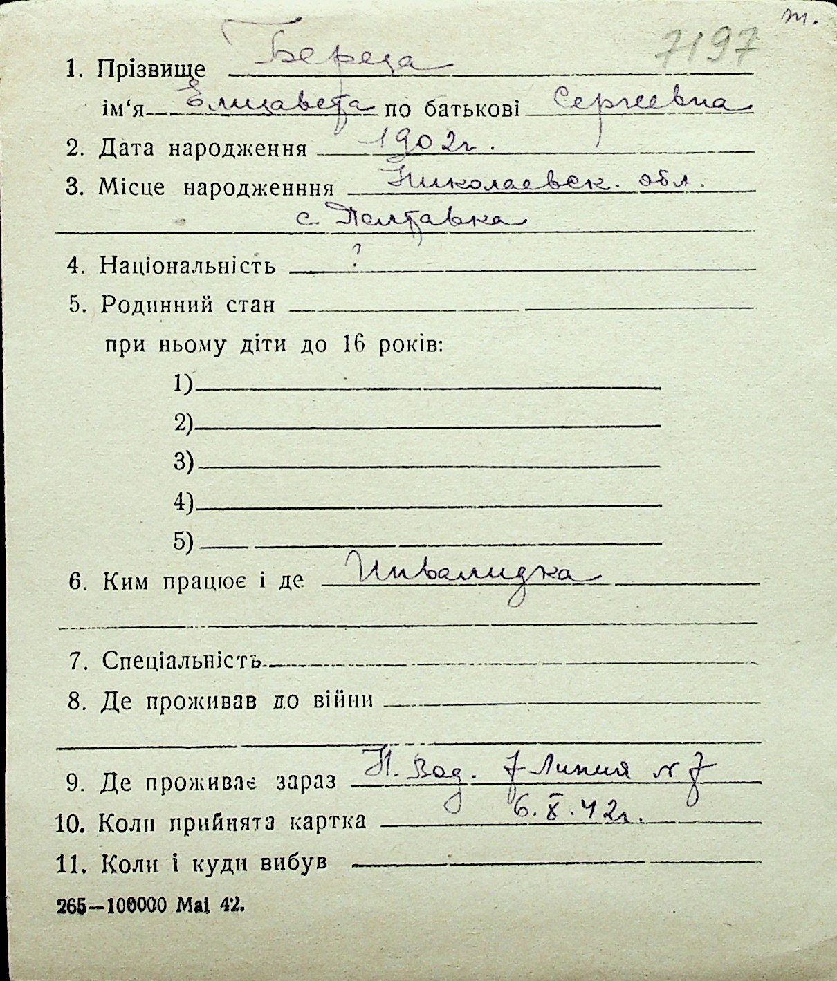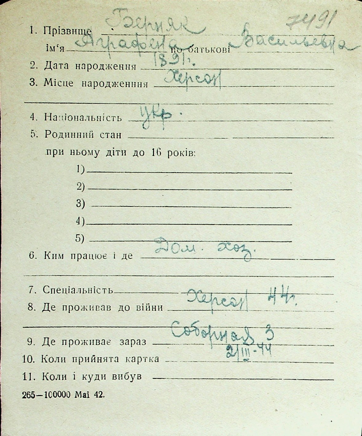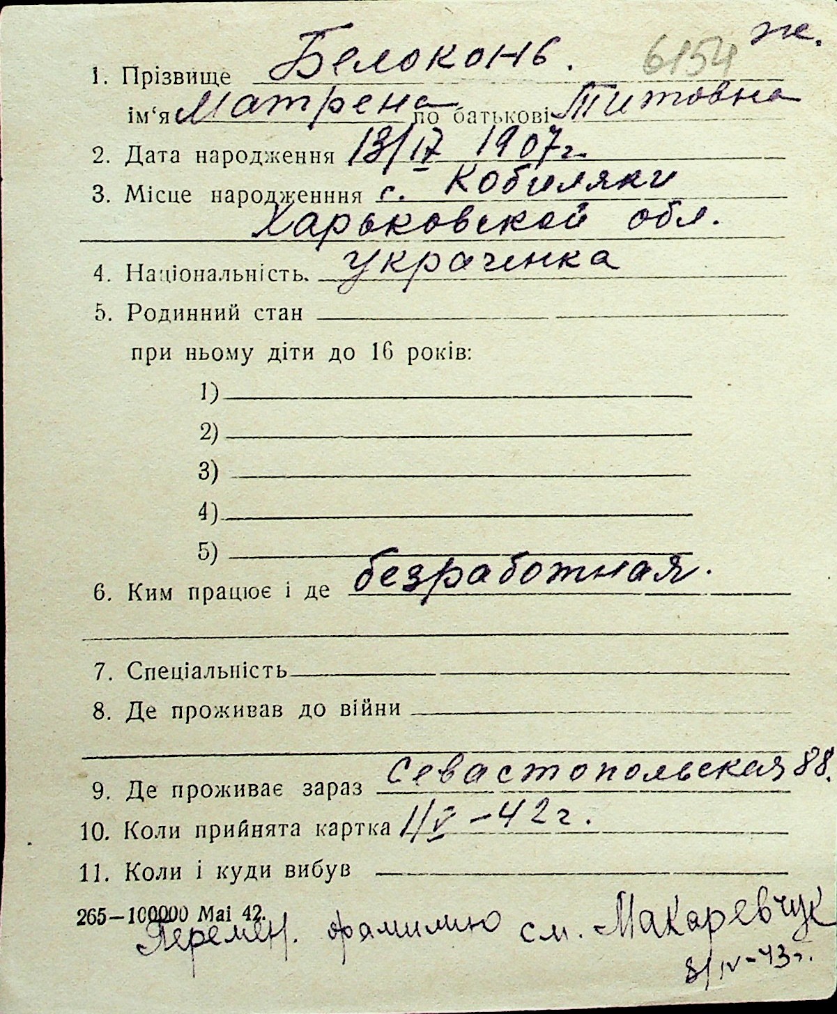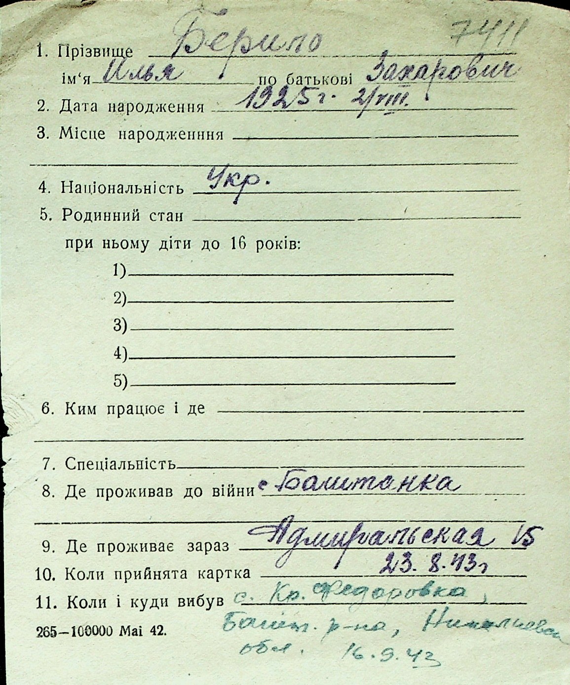 ◦ ◦ Перелік карток на осіб, які мешкали у м. Миколаїв у період окупації 1941–1944 років