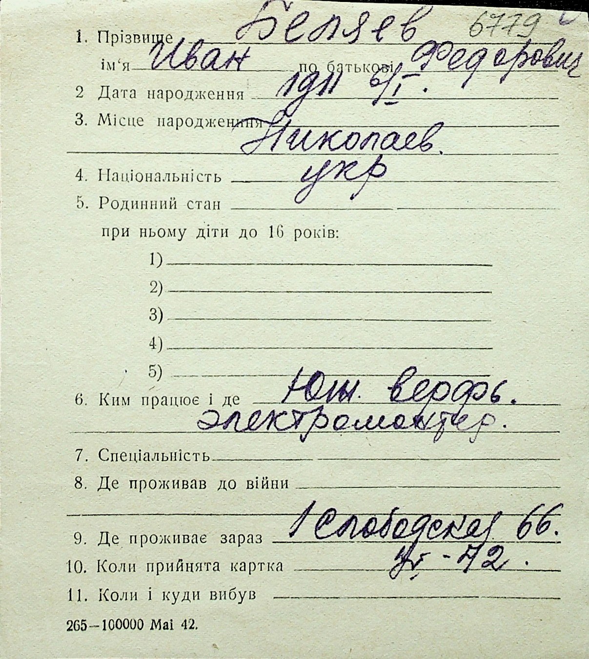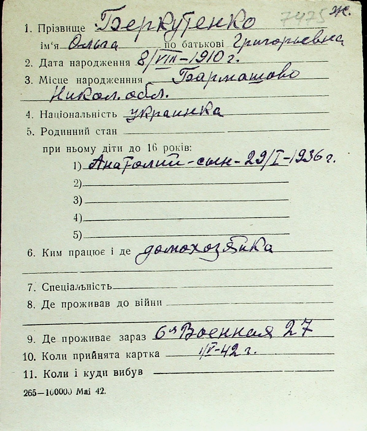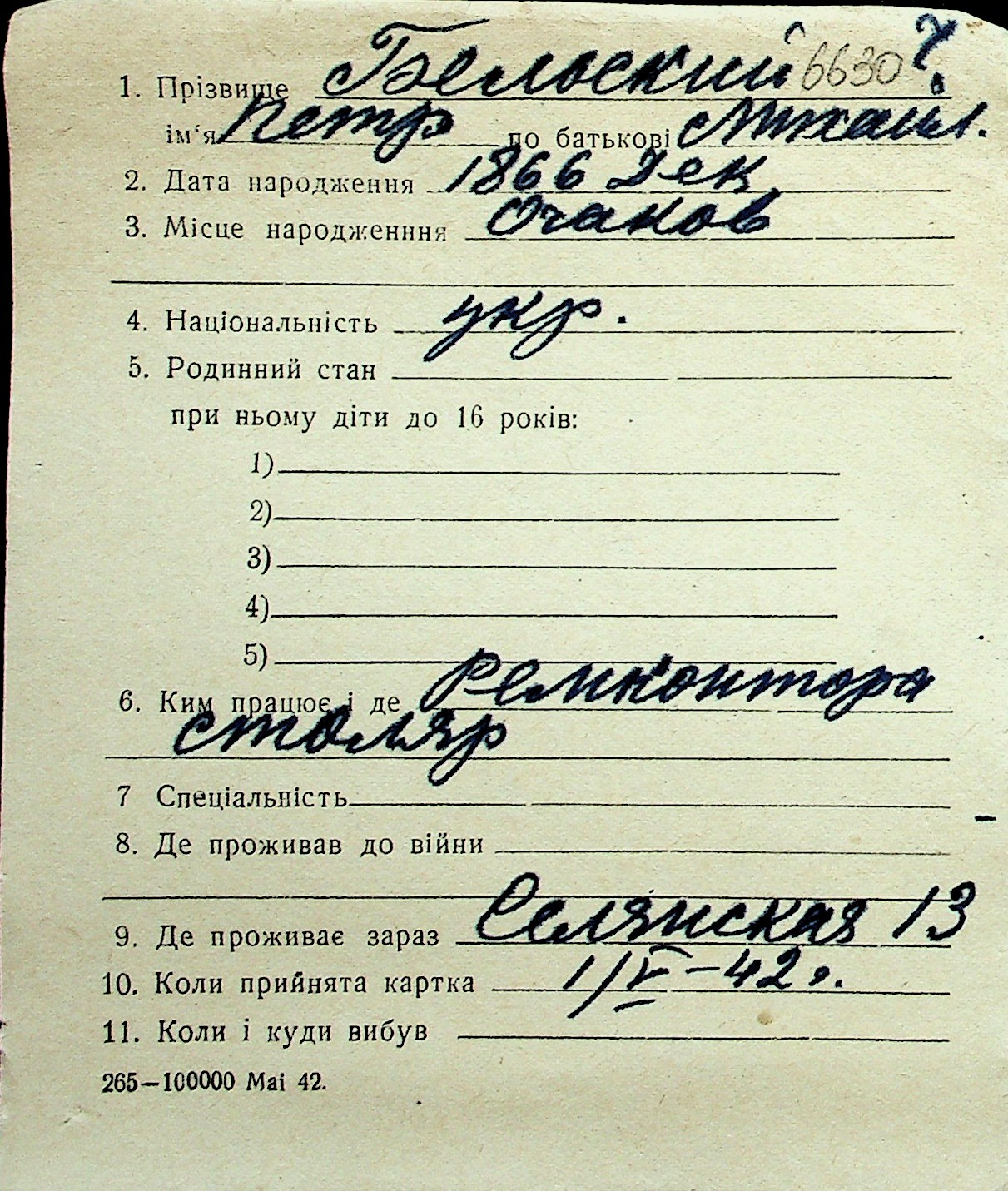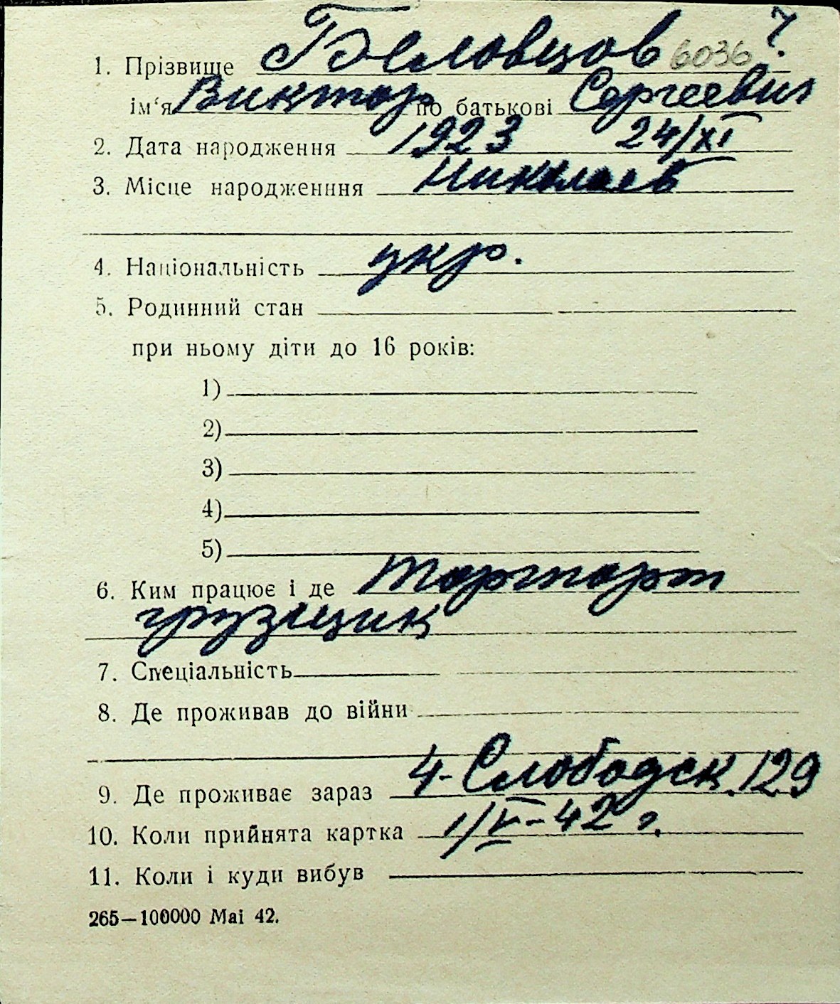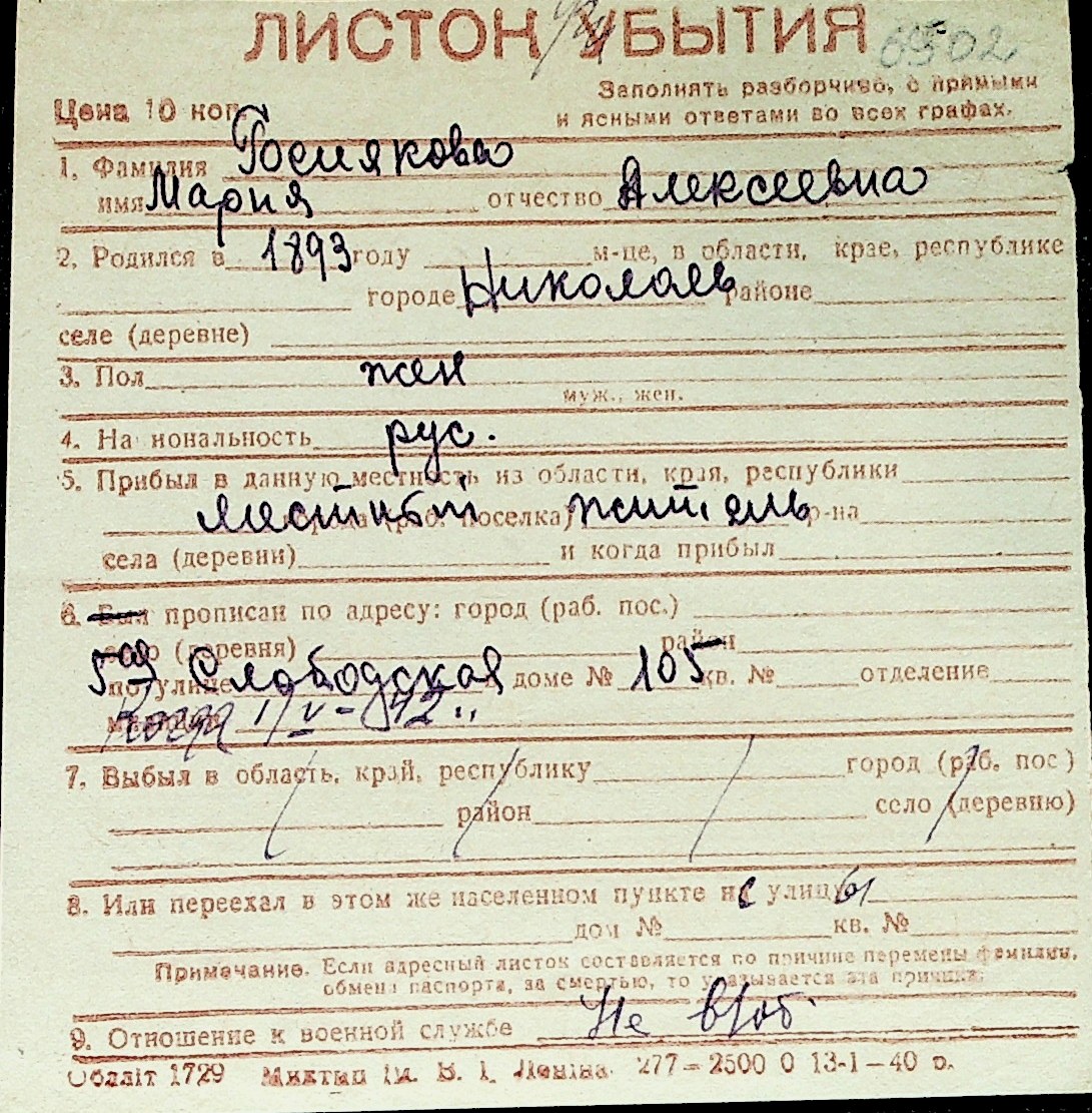 ◦ ◦ Перелік карток на осіб, які мешкали у м. Миколаїв у період окупації 1941–1944 років