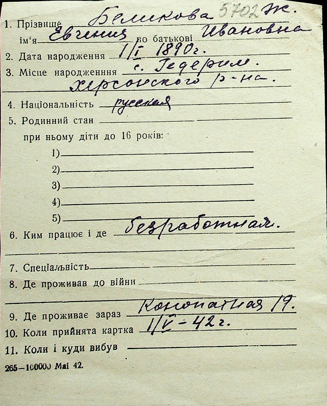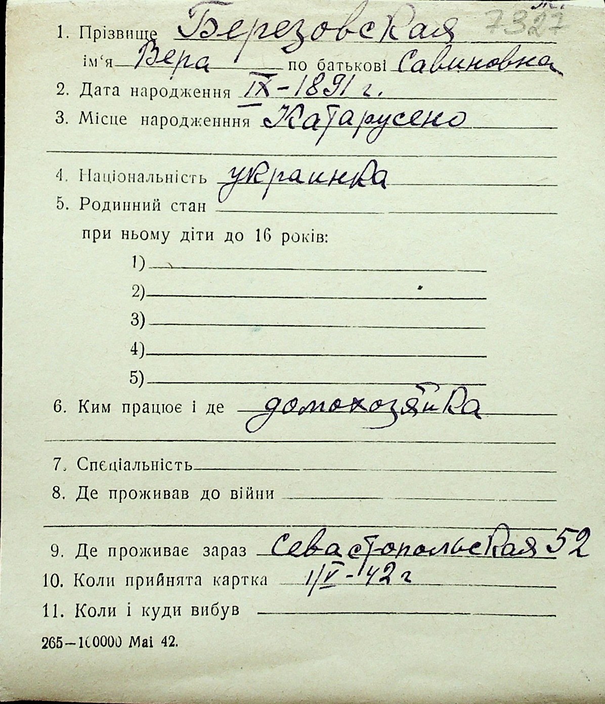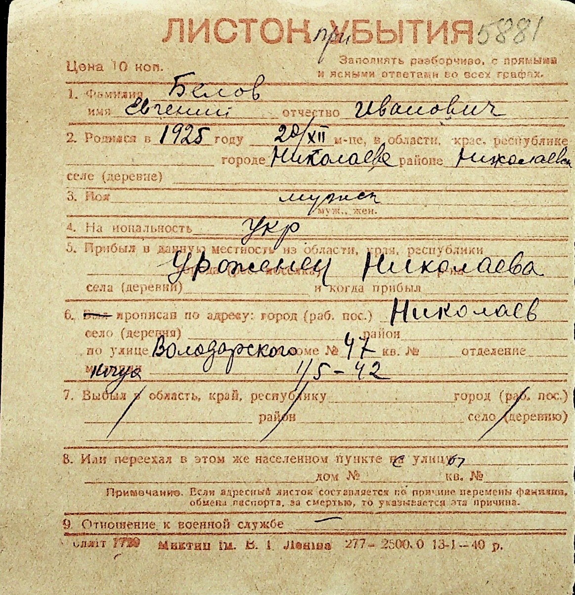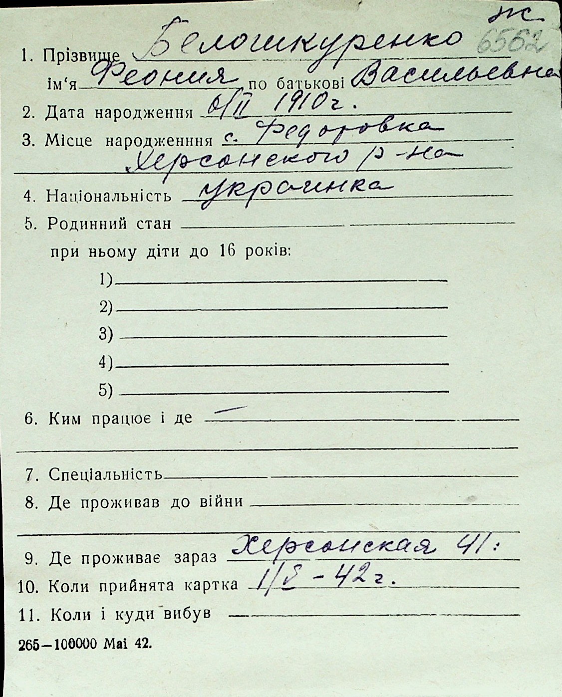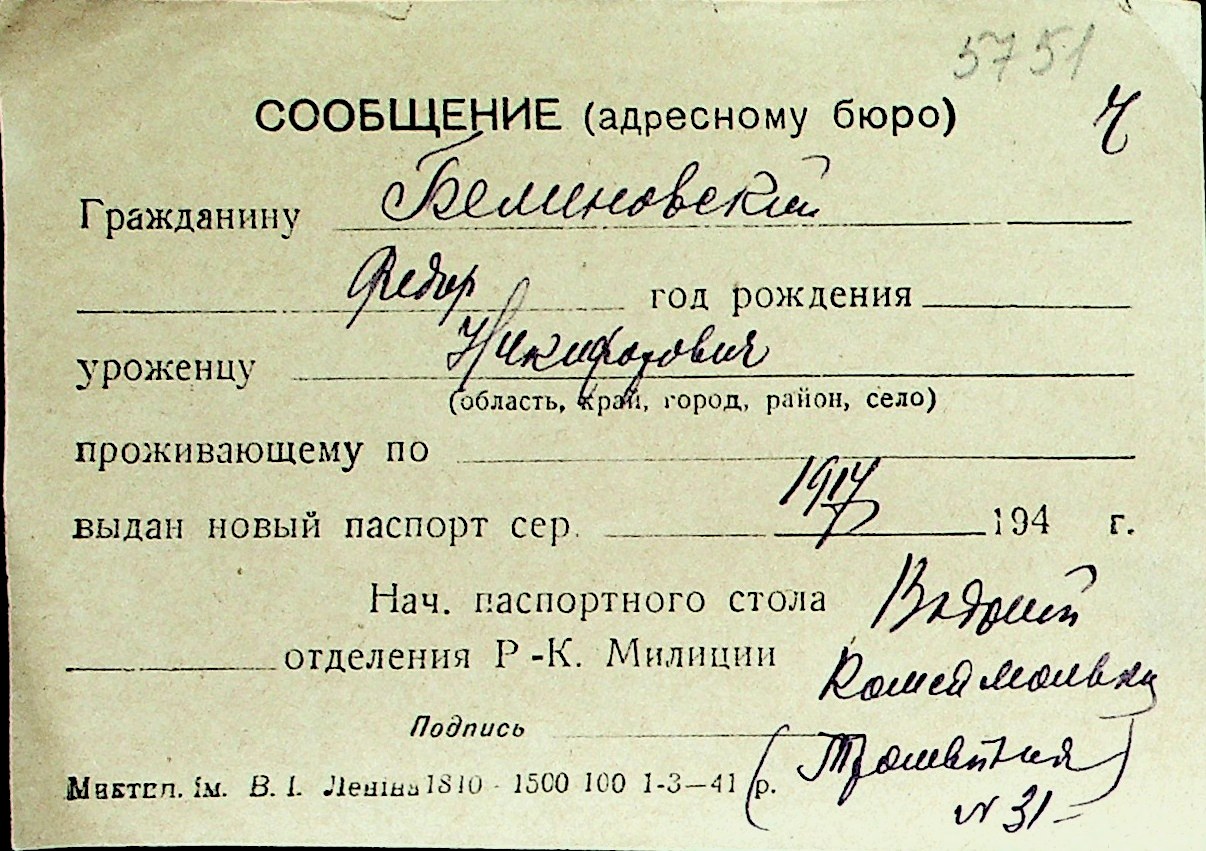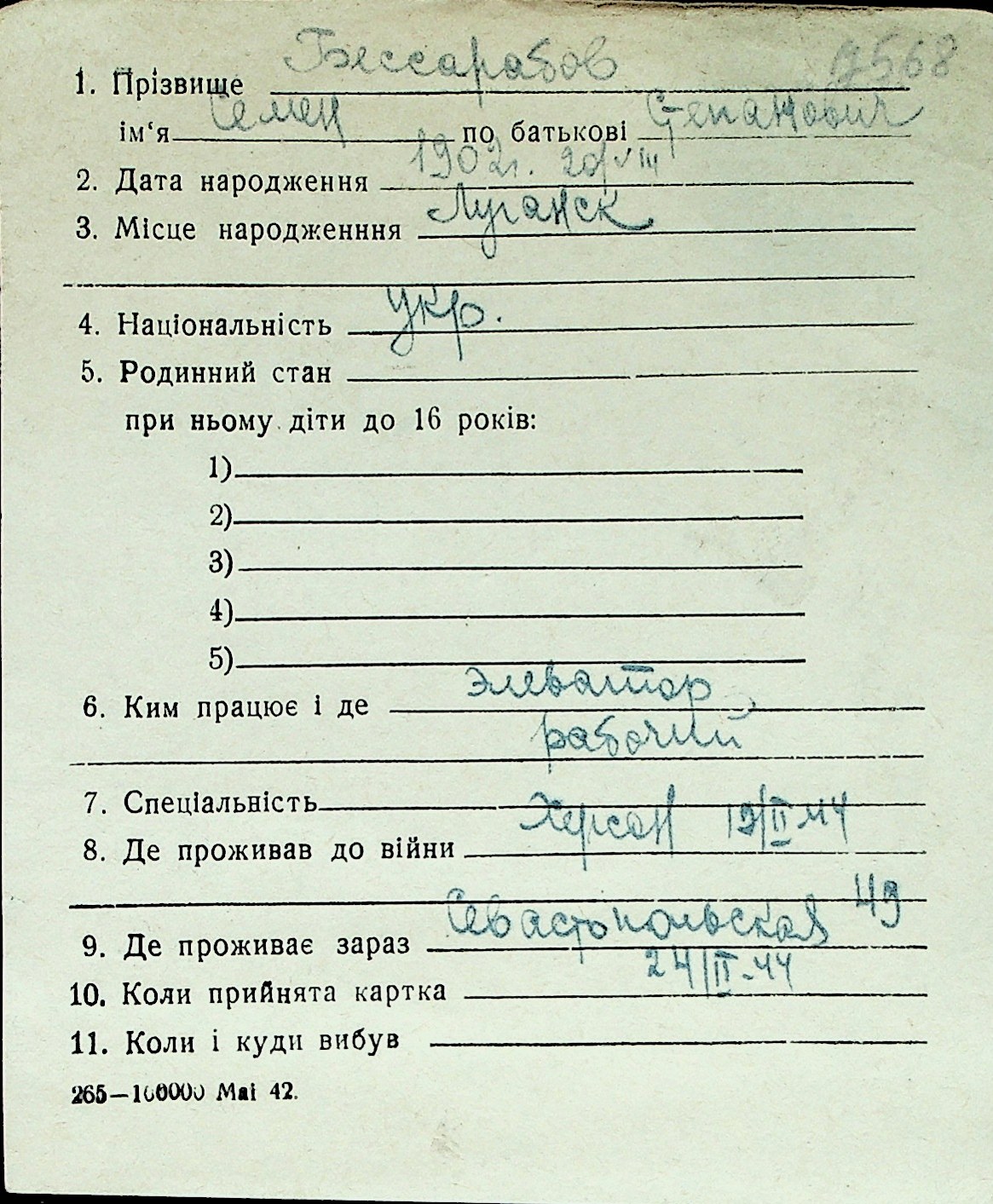 ◦ ◦ Перелік карток на осіб, які мешкали у м. Миколаїв у період окупації 1941–1944 років