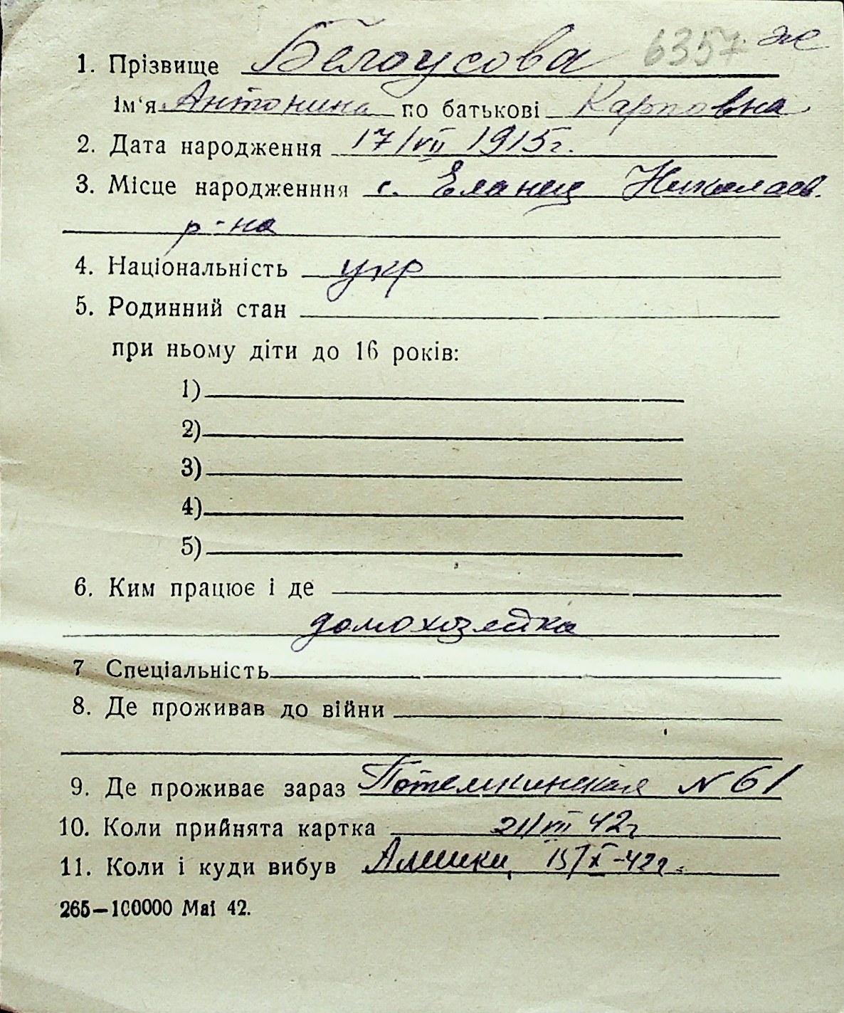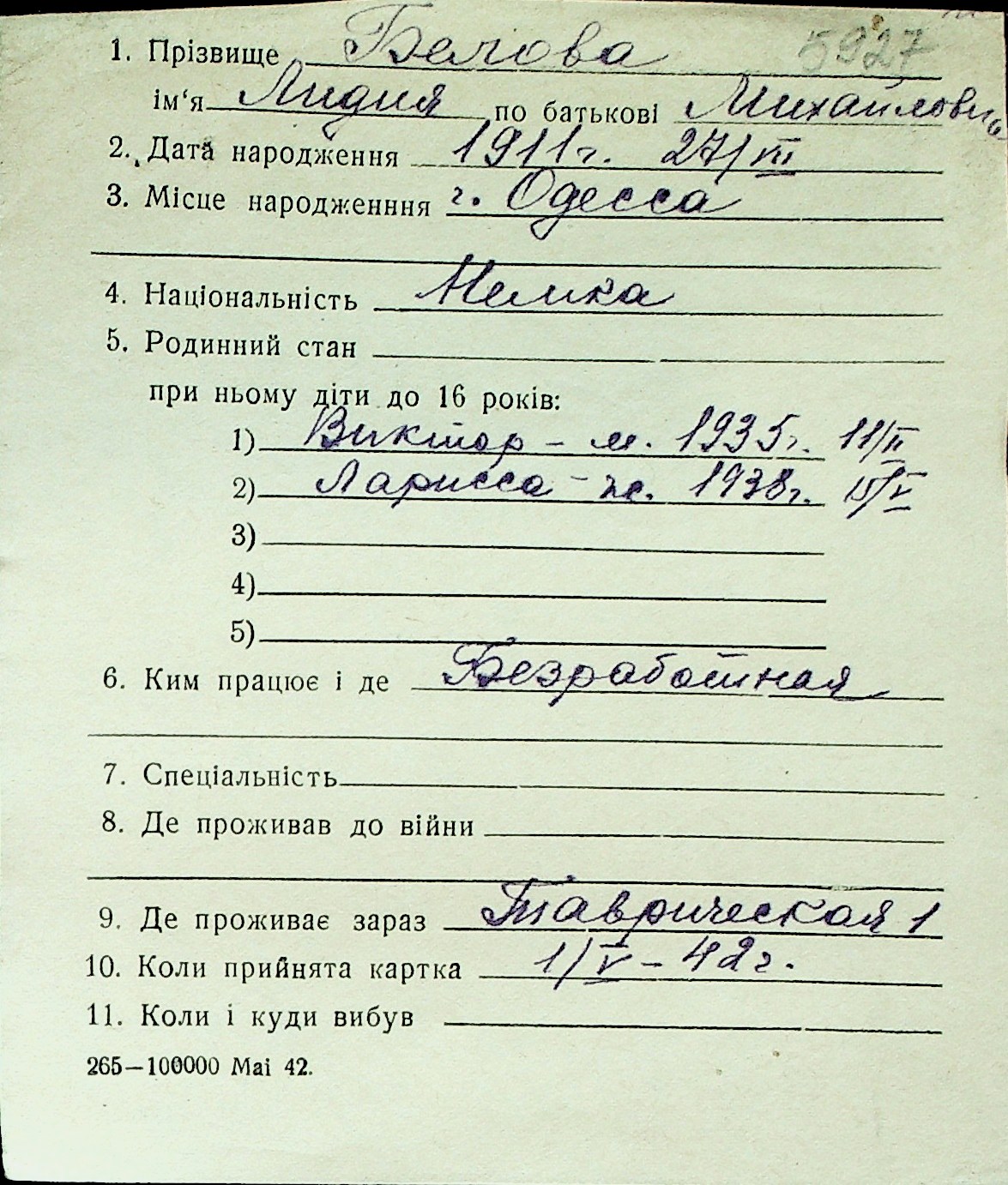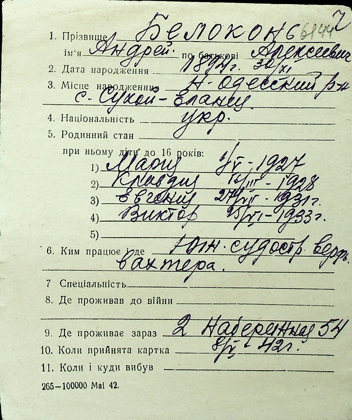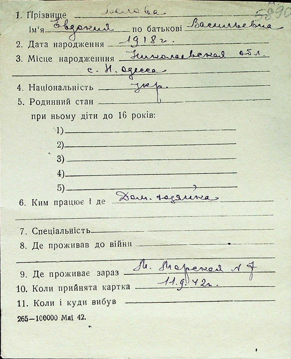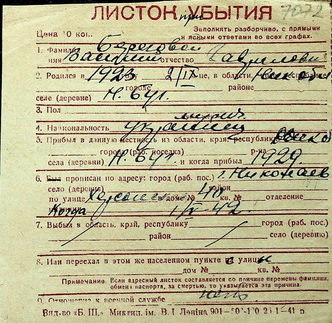 ◦ ◦ Перелік карток на осіб, які мешкали у м. Миколаїв у період окупації 1941–1944 років