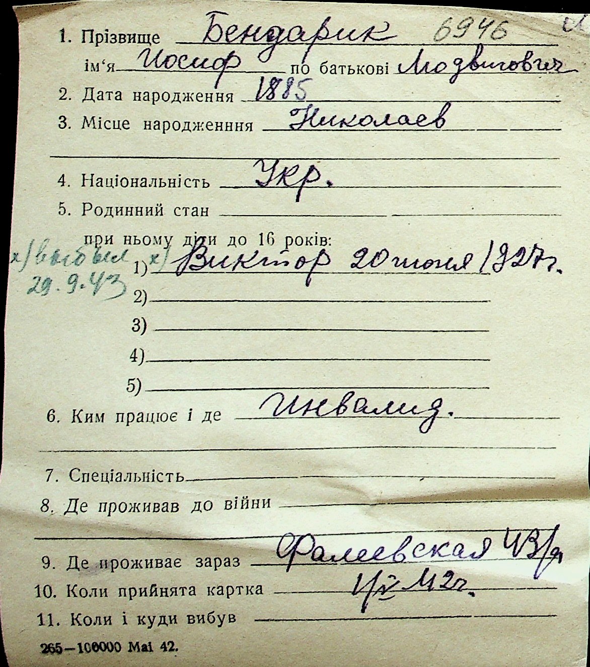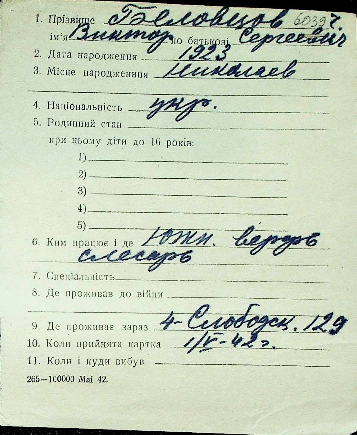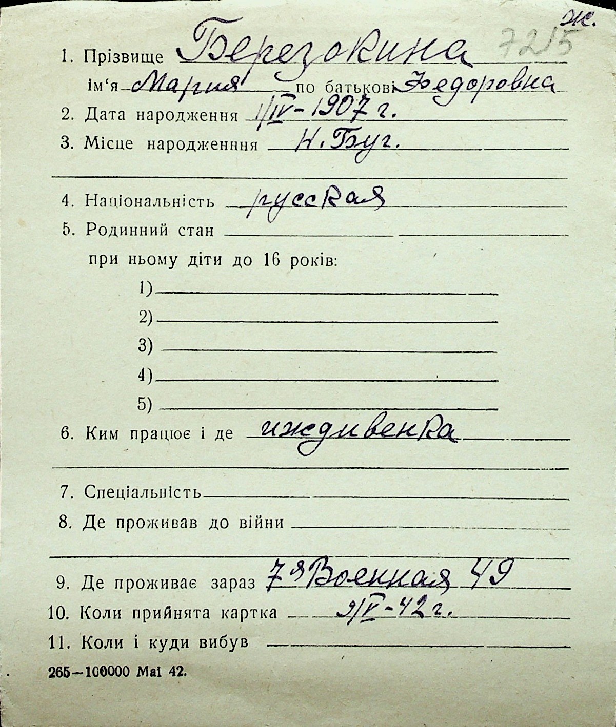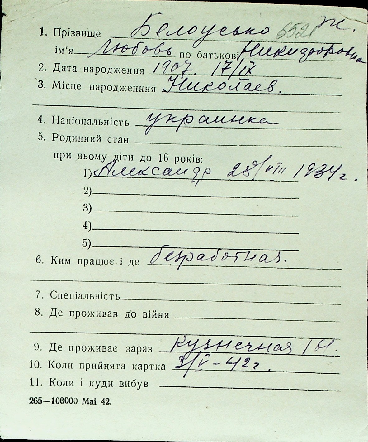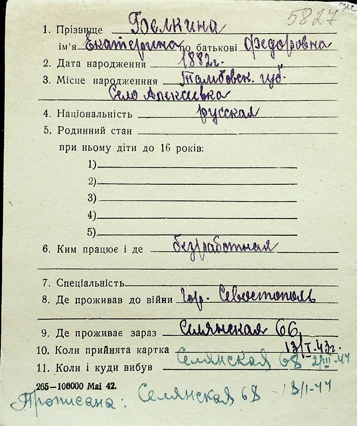 ◦ ◦ Перелік карток на осіб, які мешкали у м. Миколаїв у період окупації 1941–1944 років