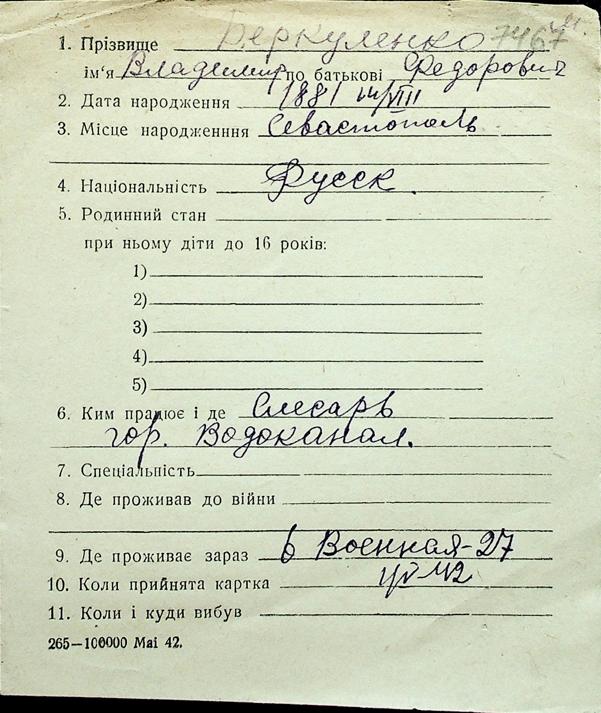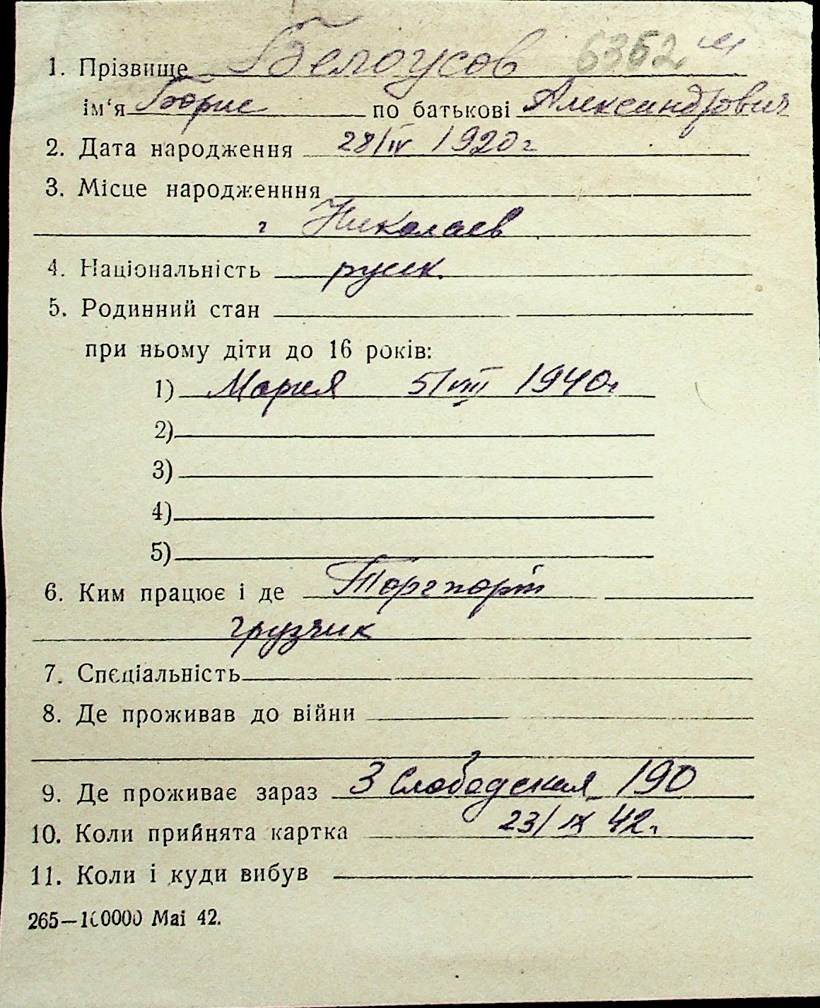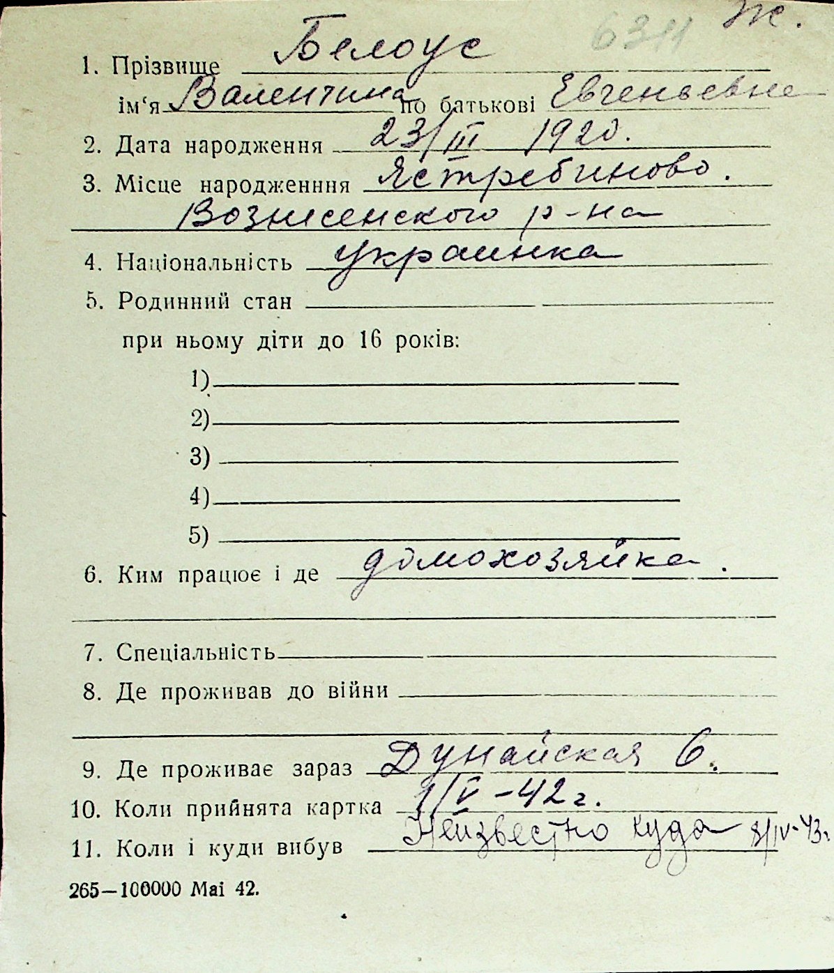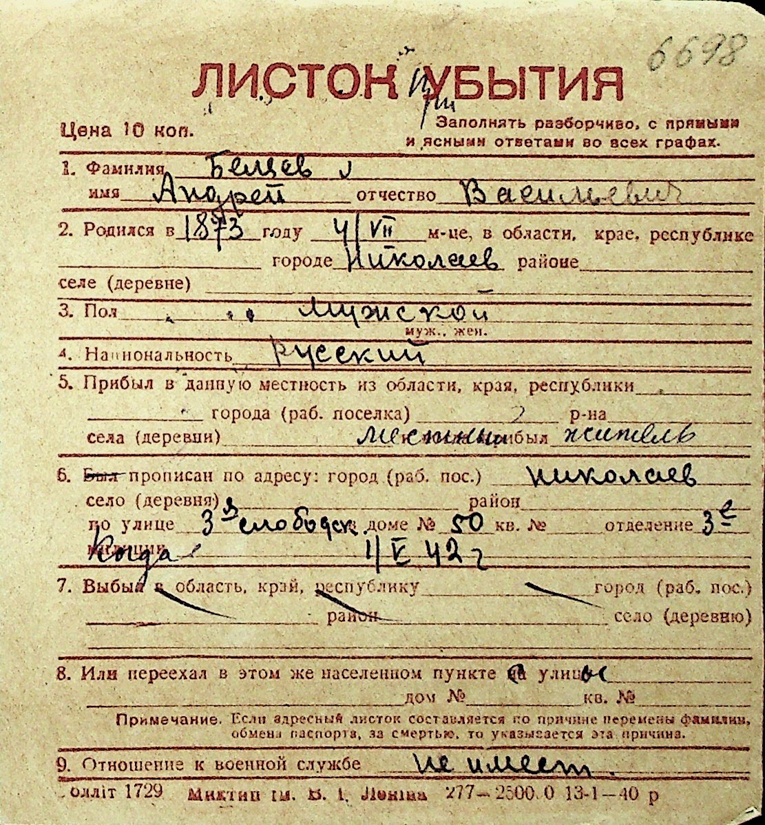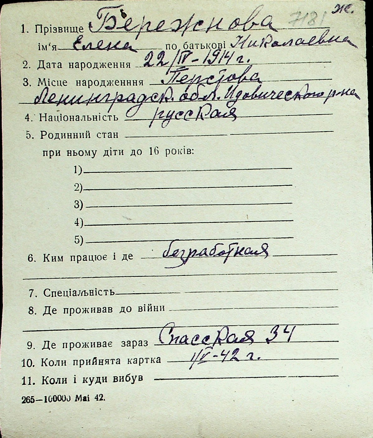 ◦ ◦ Перелік карток на осіб, які мешкали у м. Миколаїв у період окупації 1941–1944 років