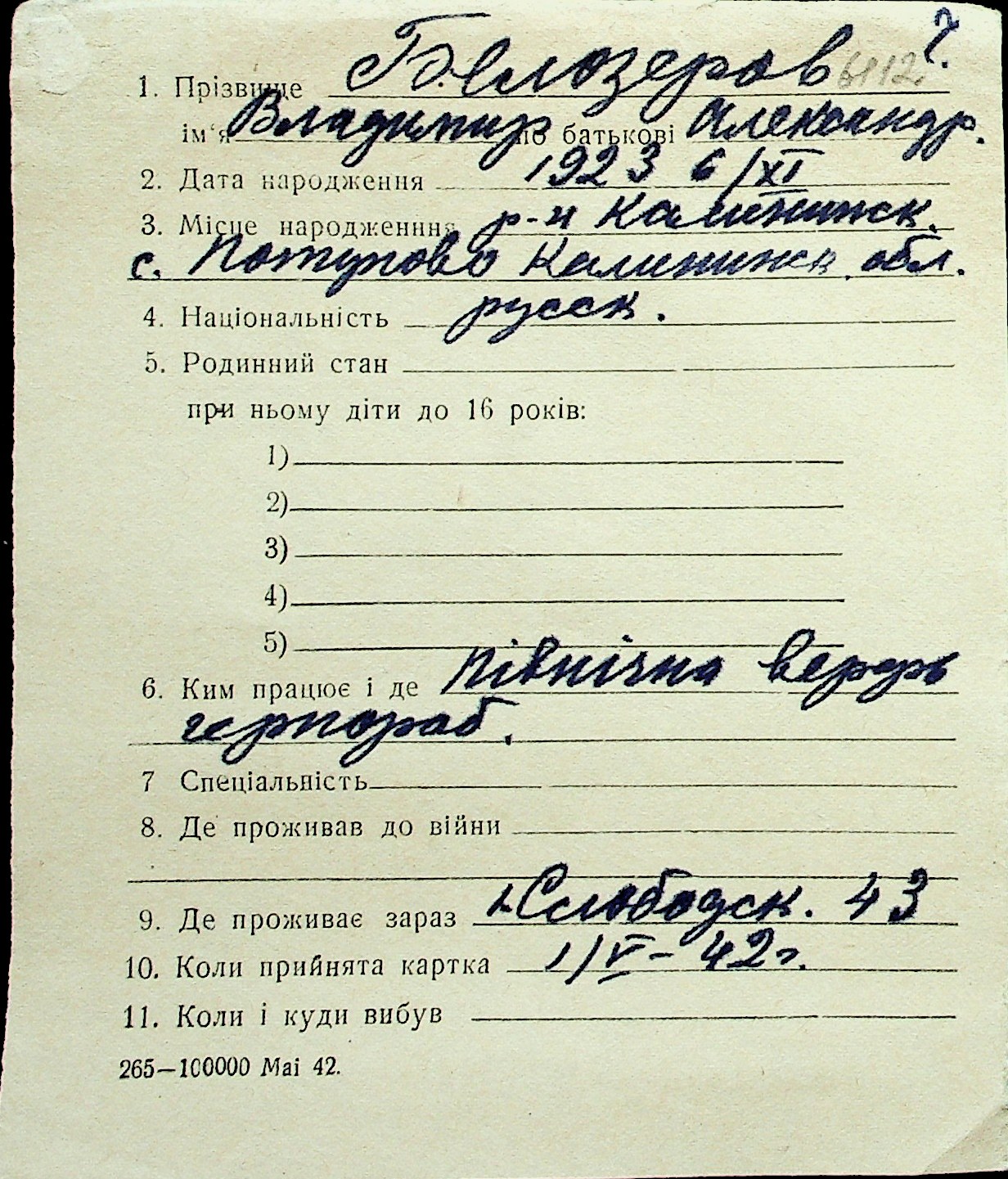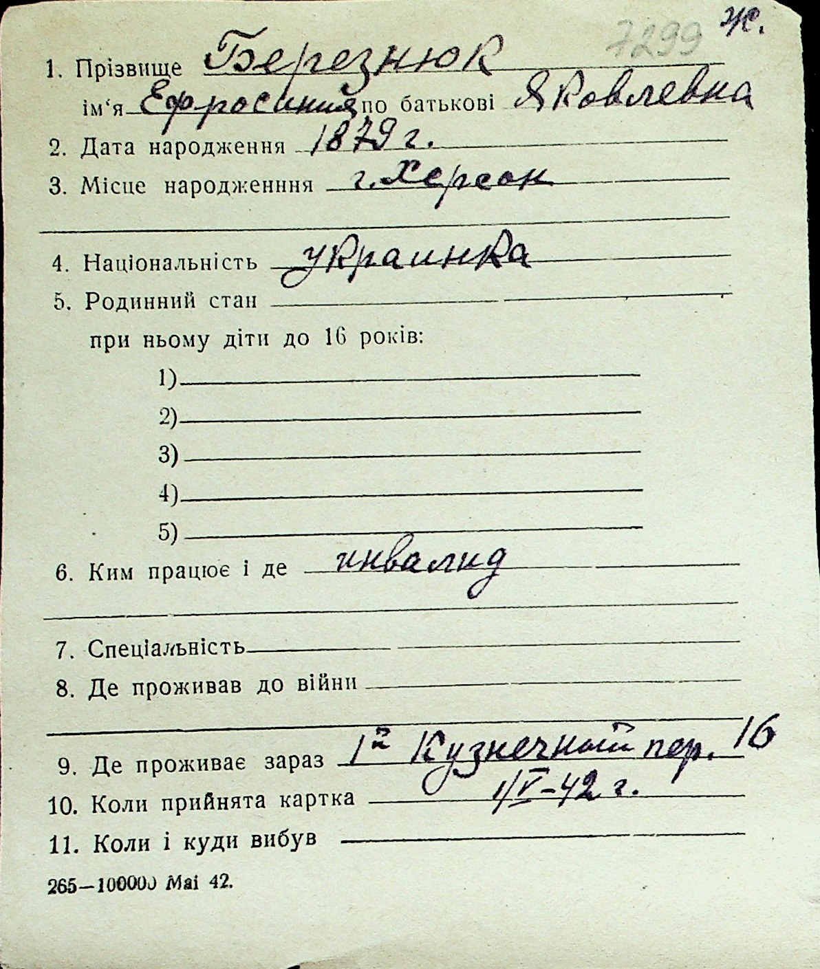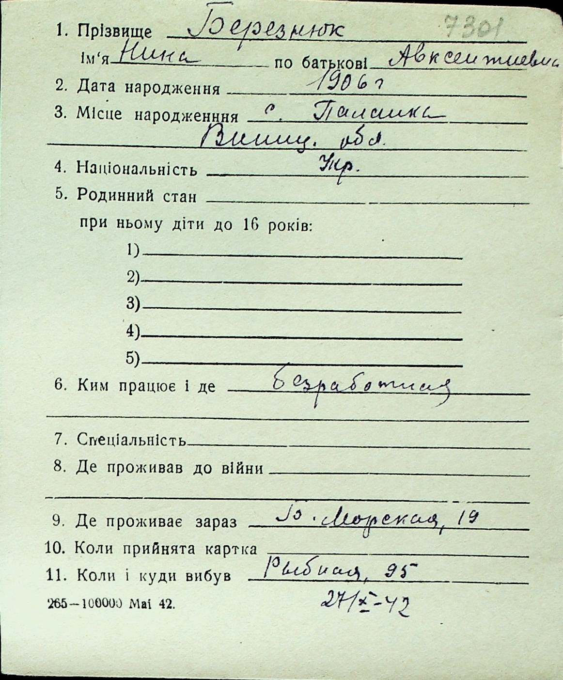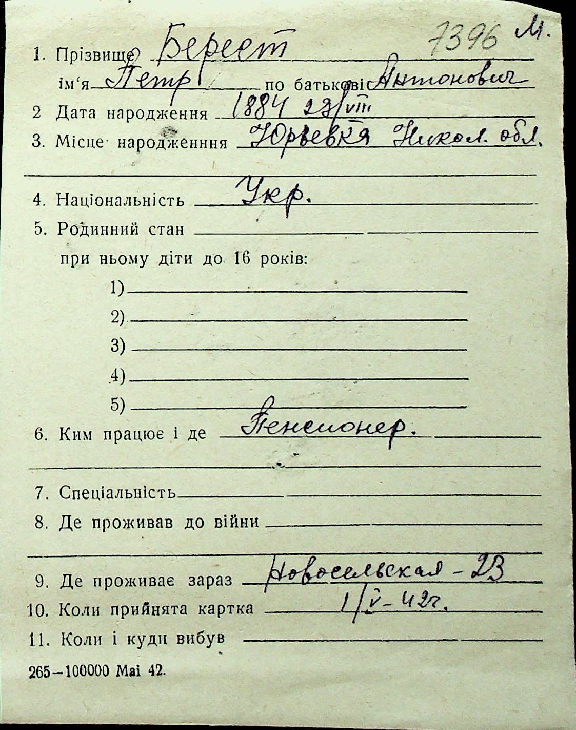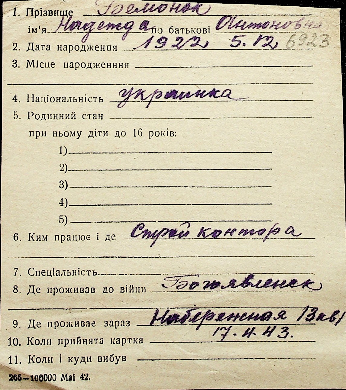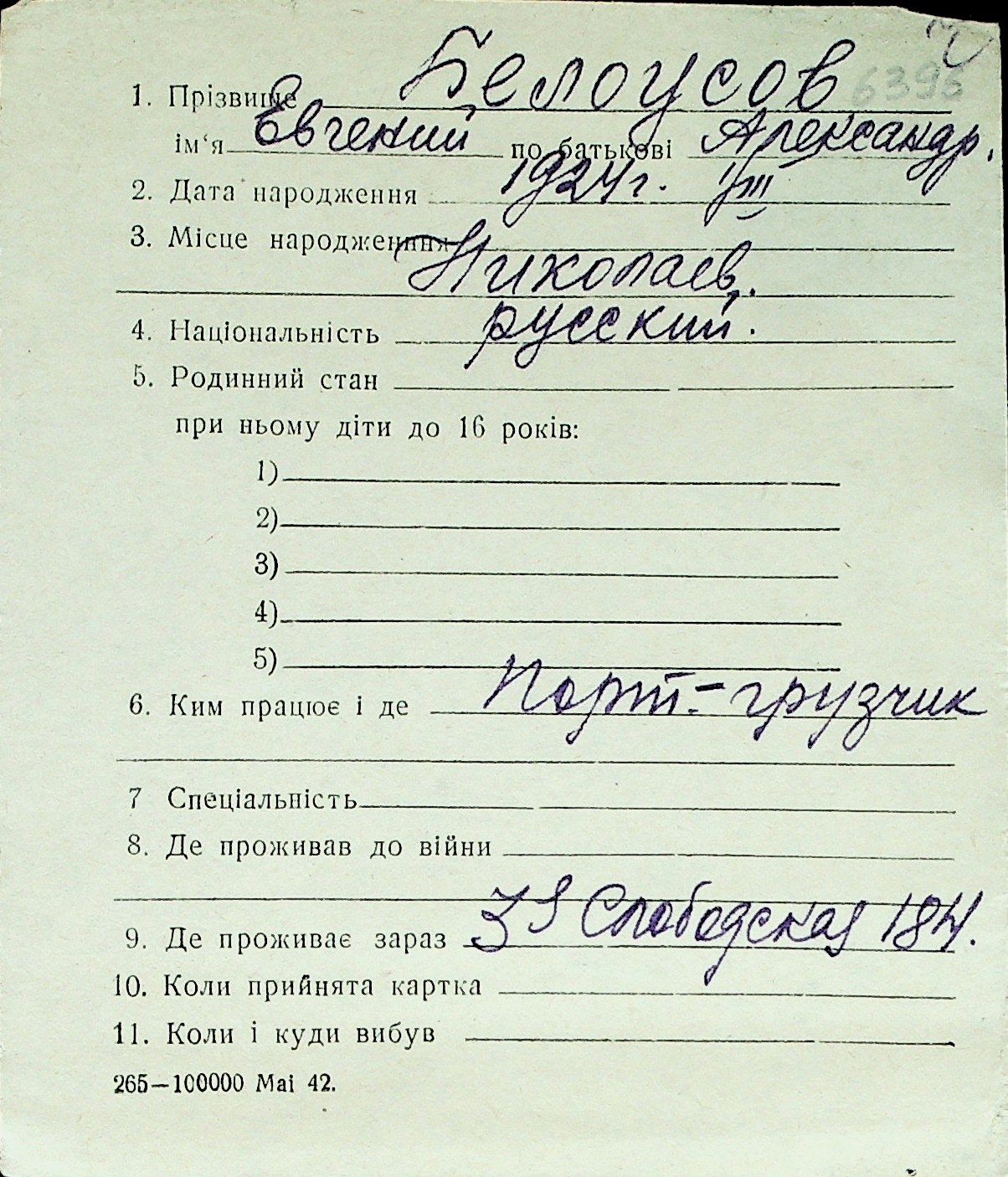 ◦ ◦ Перелік карток на осіб, які мешкали у м. Миколаїв у період окупації 1941–1944 років