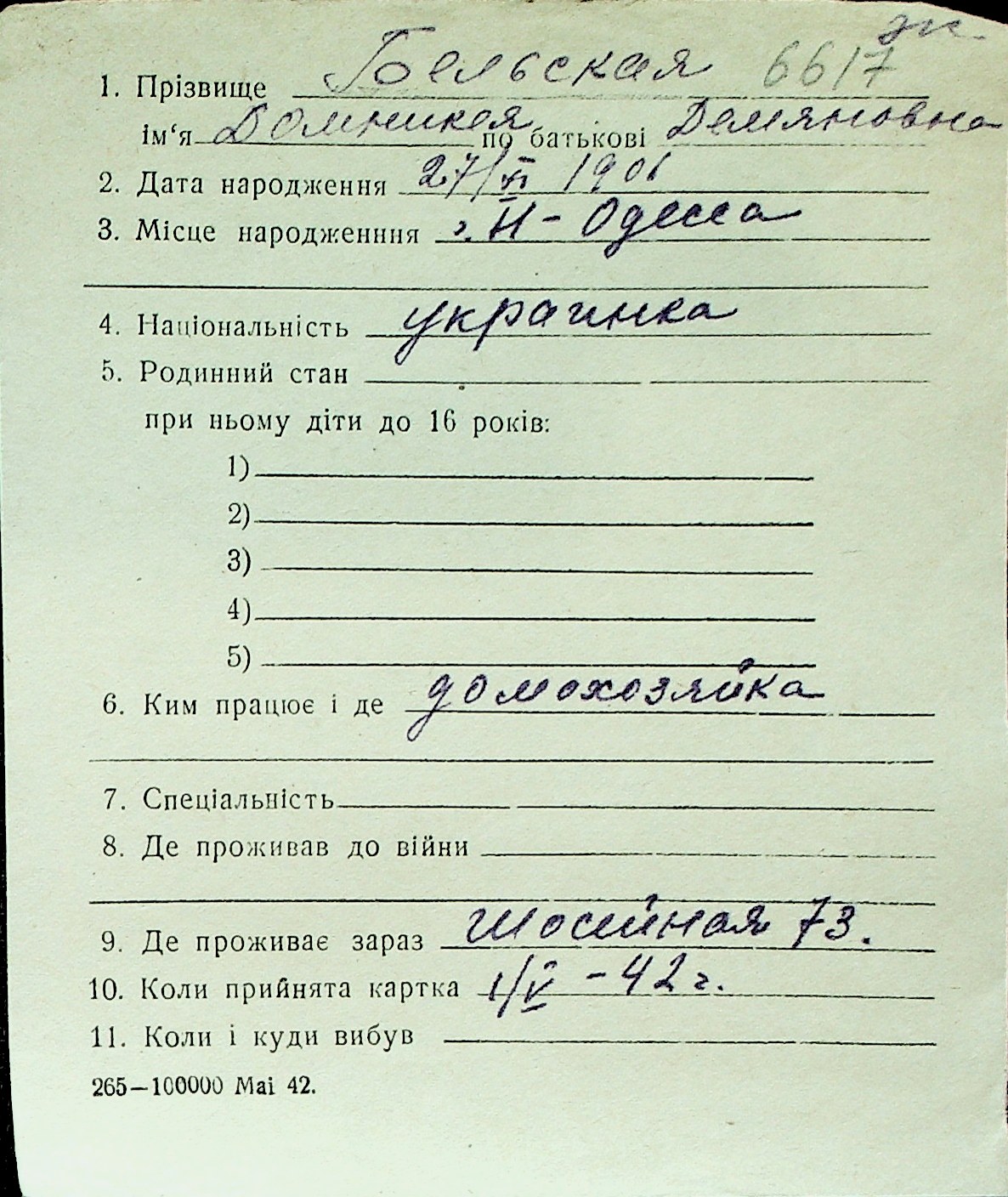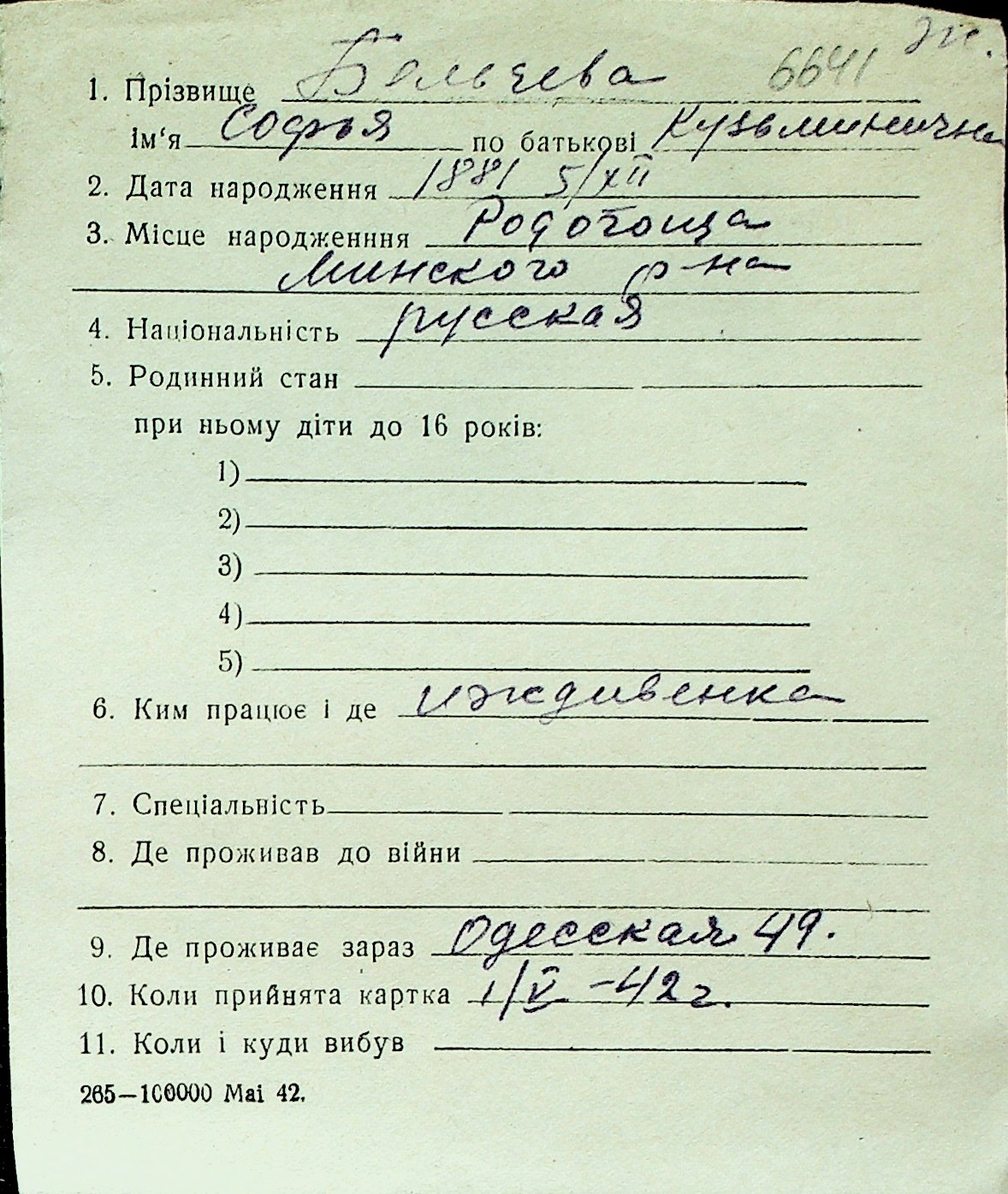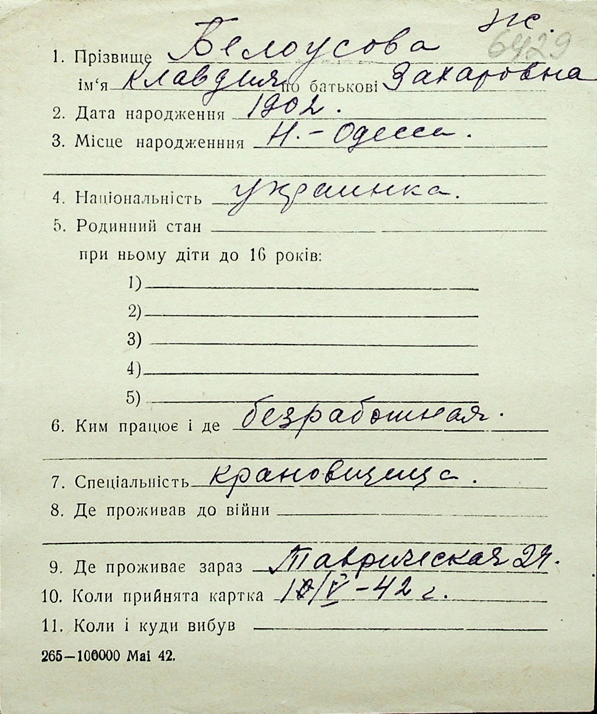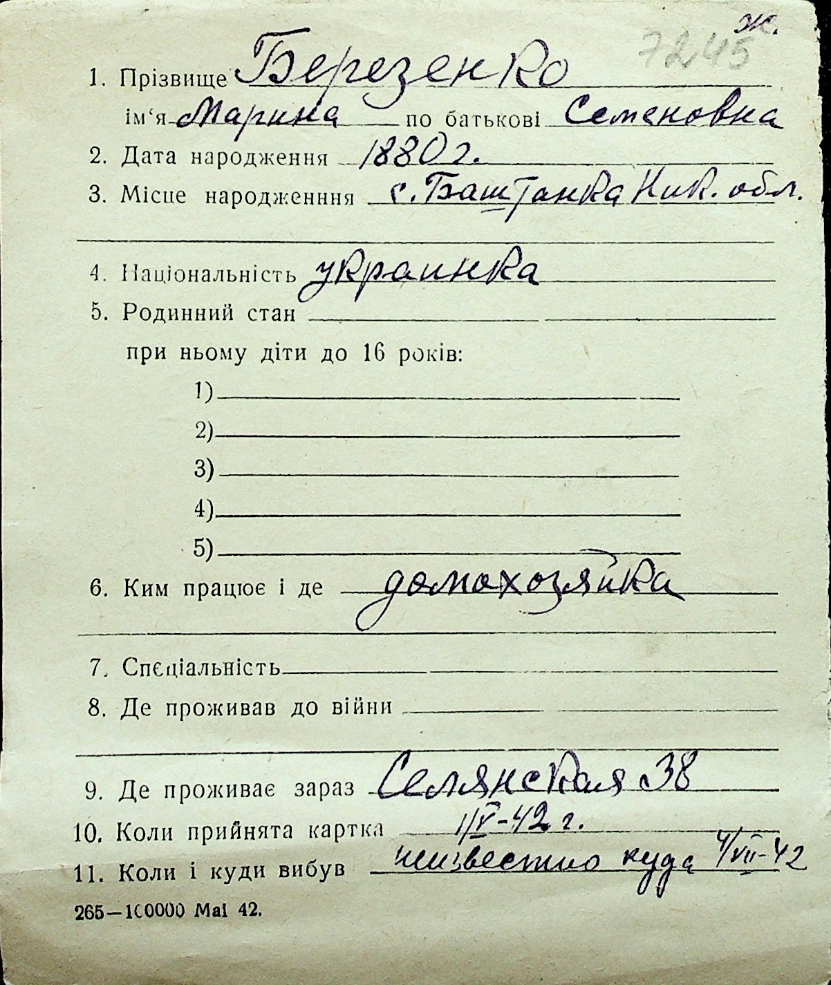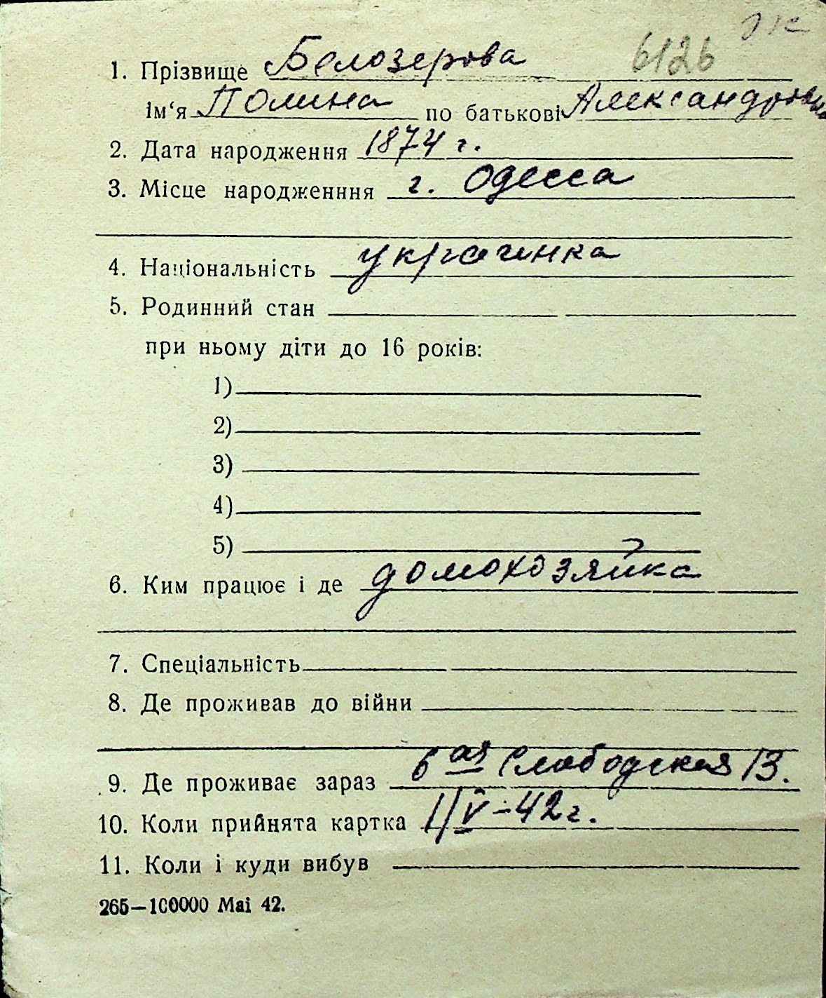 ◦ ◦ Перелік карток на осіб, які мешкали у м. Миколаїв у період окупації 1941–1944 років