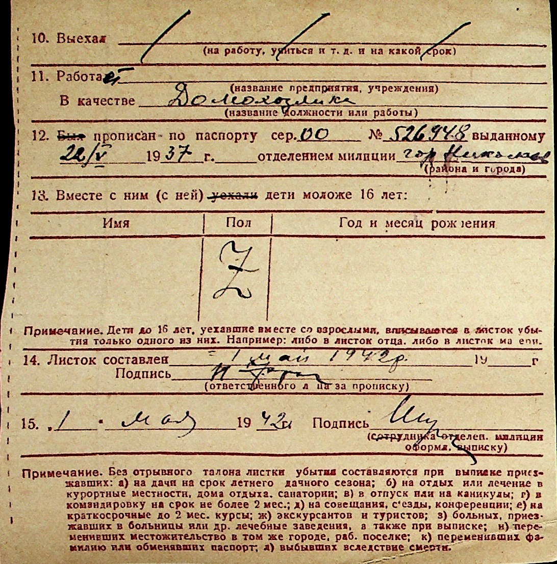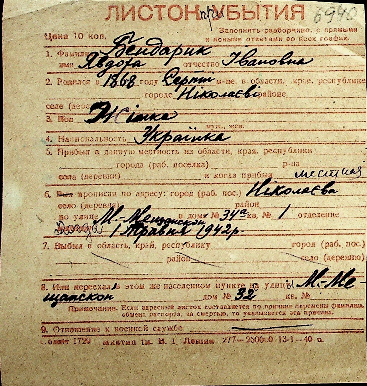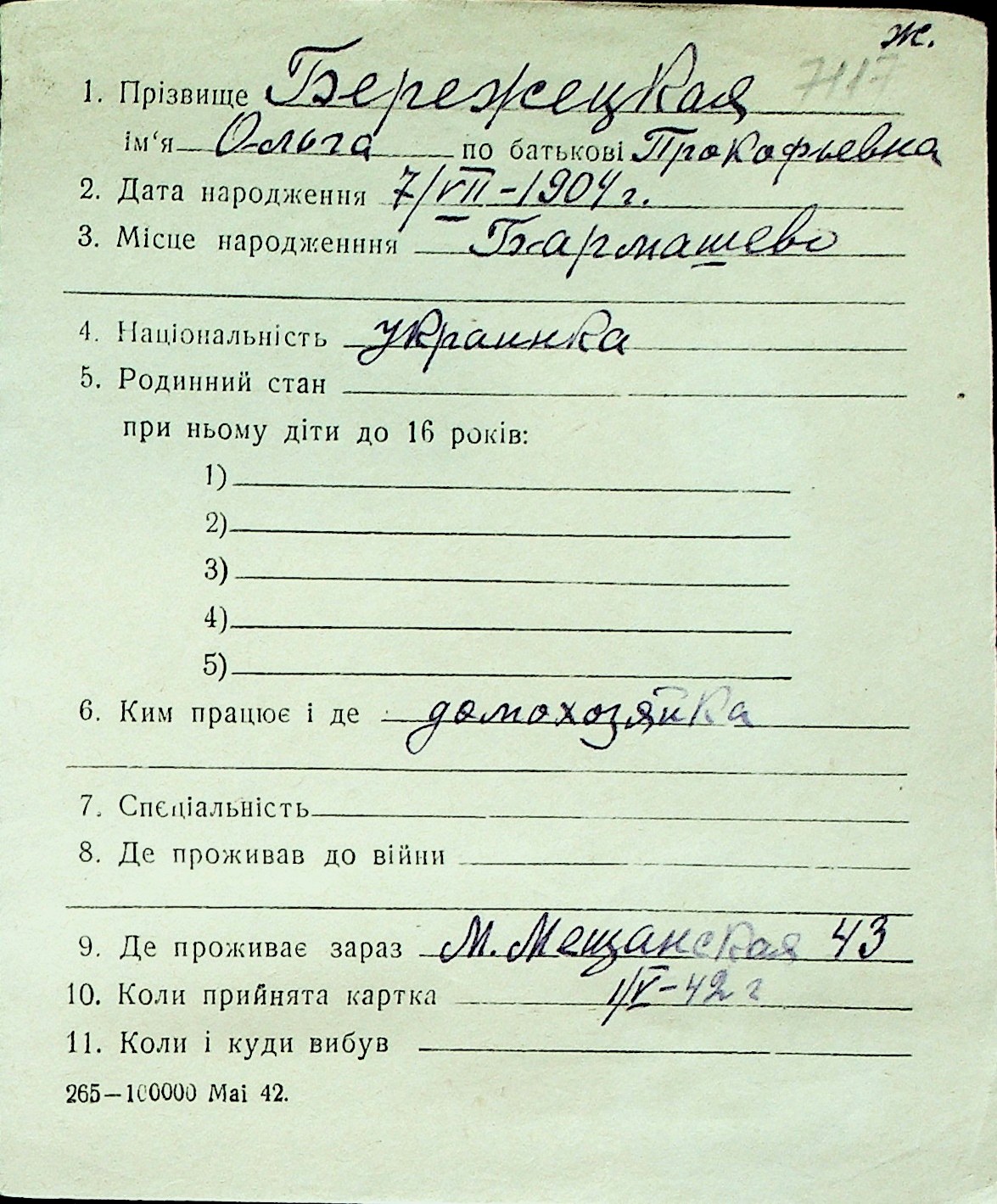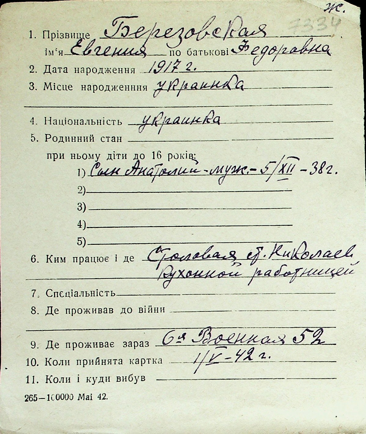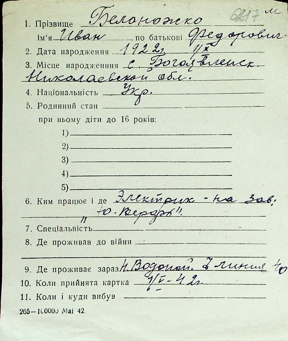 ◦ ◦ Перелік карток на осіб, які мешкали у м. Миколаїв у період окупації 1941–1944 років