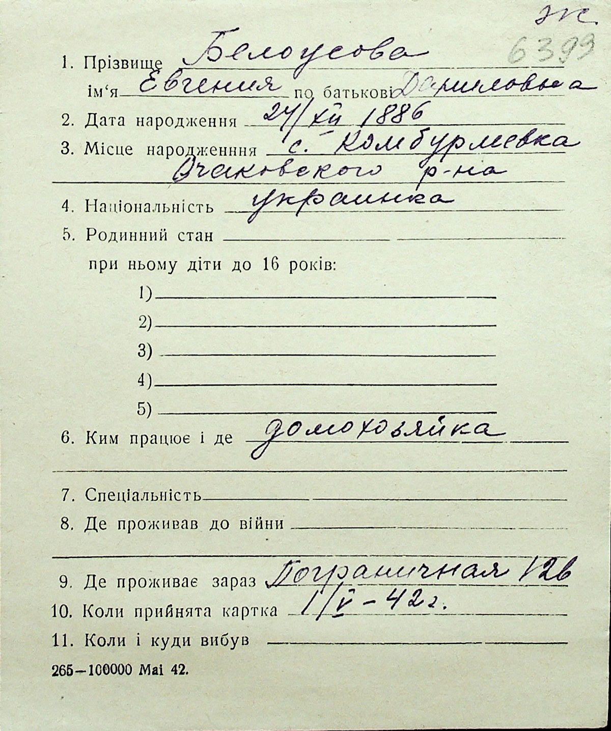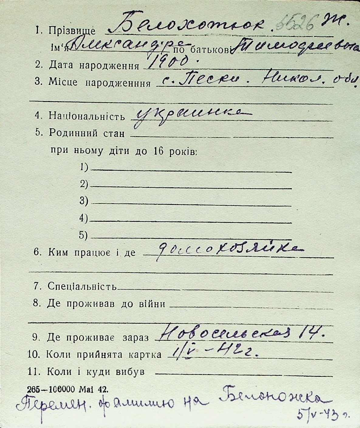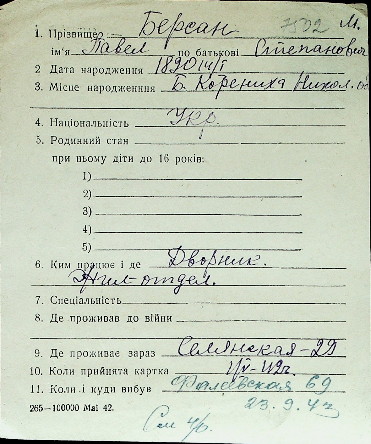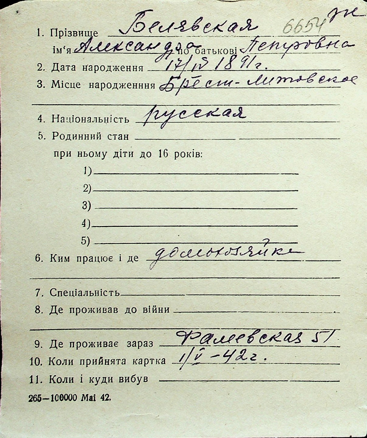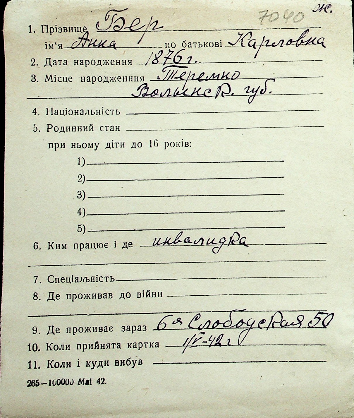 ◦ ◦ Перелік карток на осіб, які мешкали у м. Миколаїв у період окупації 1941–1944 років