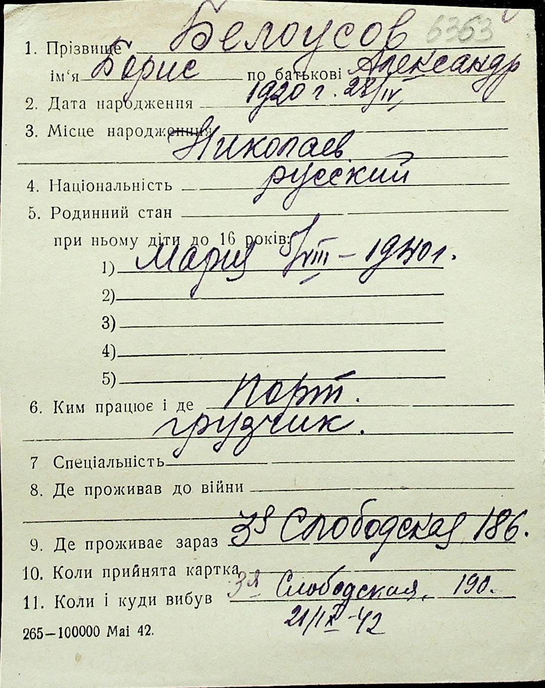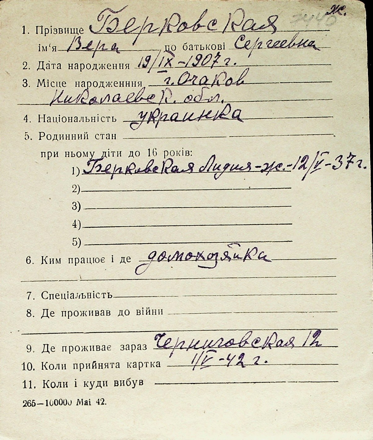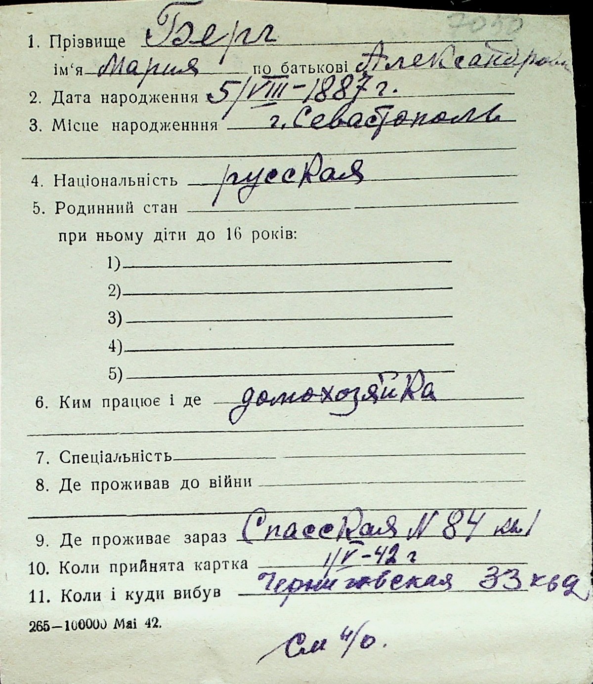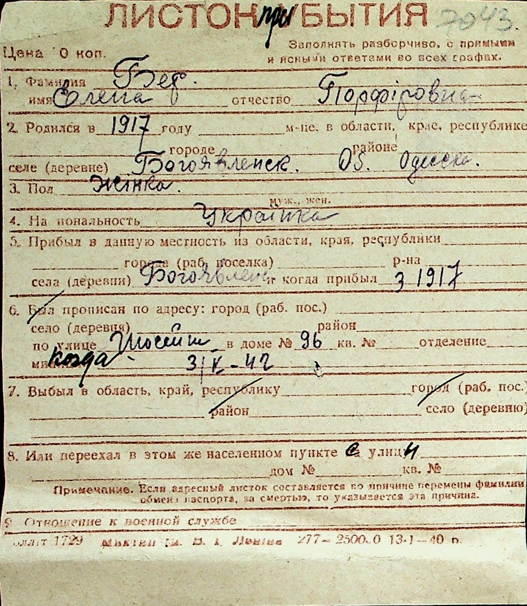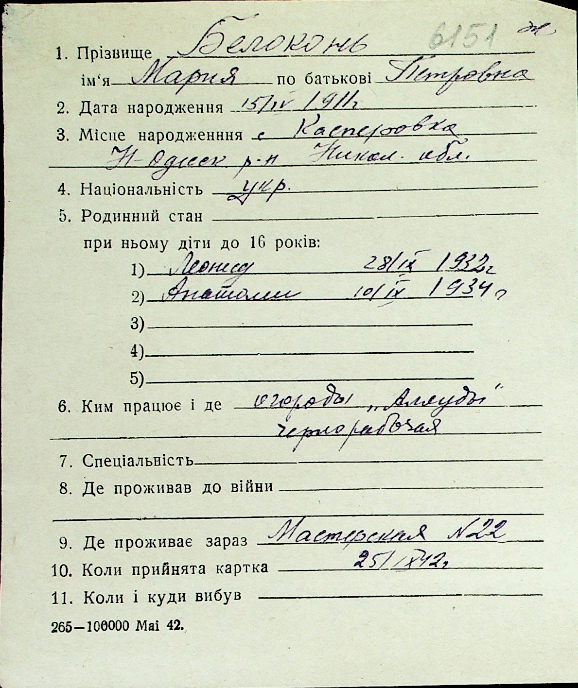 ◦ ◦ Перелік карток на осіб, які мешкали у м. Миколаїв у період окупації 1941–1944 років