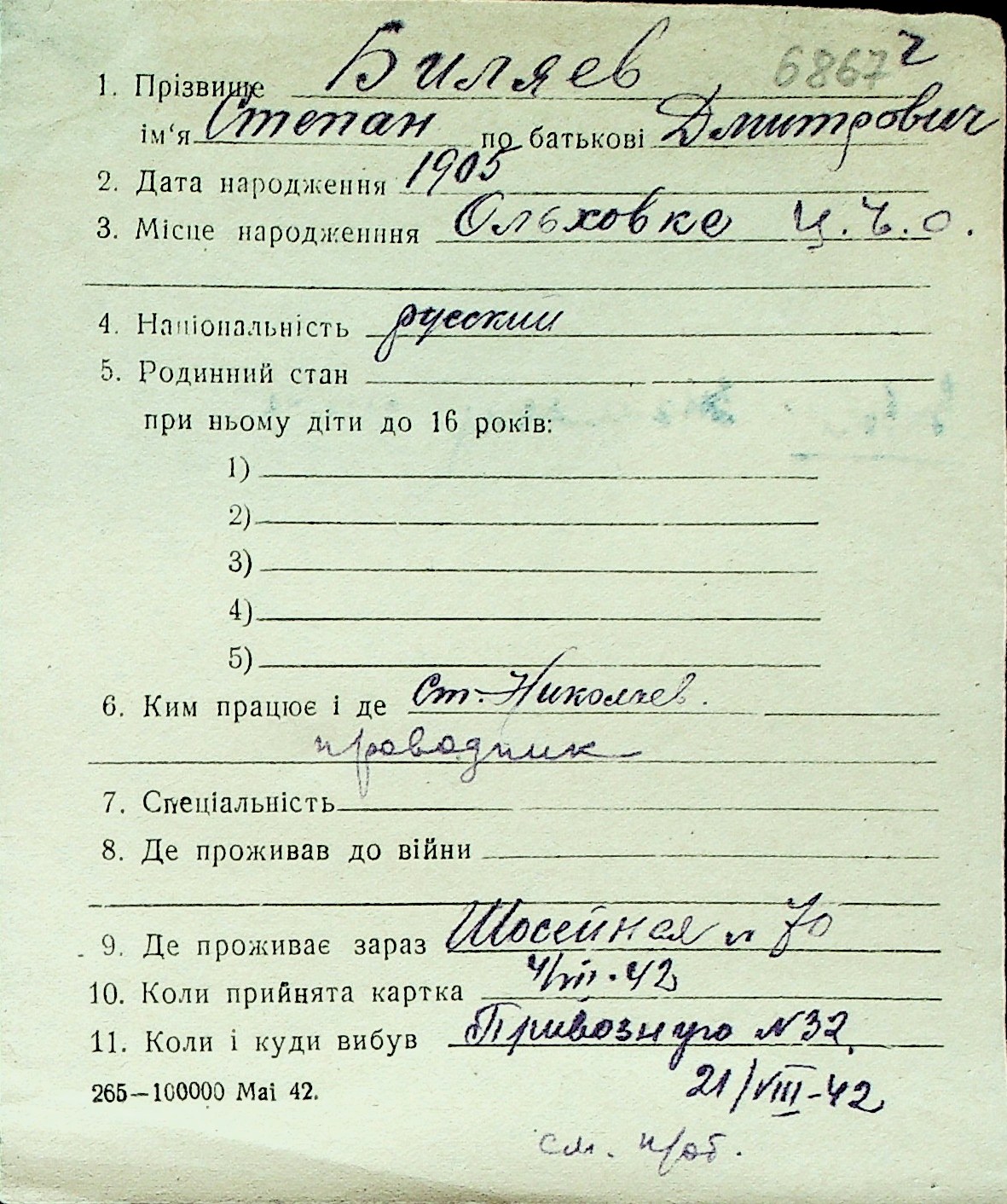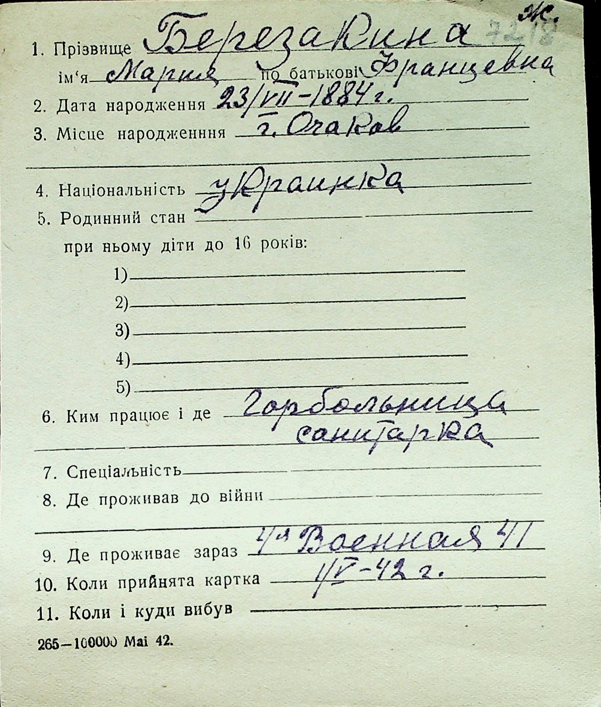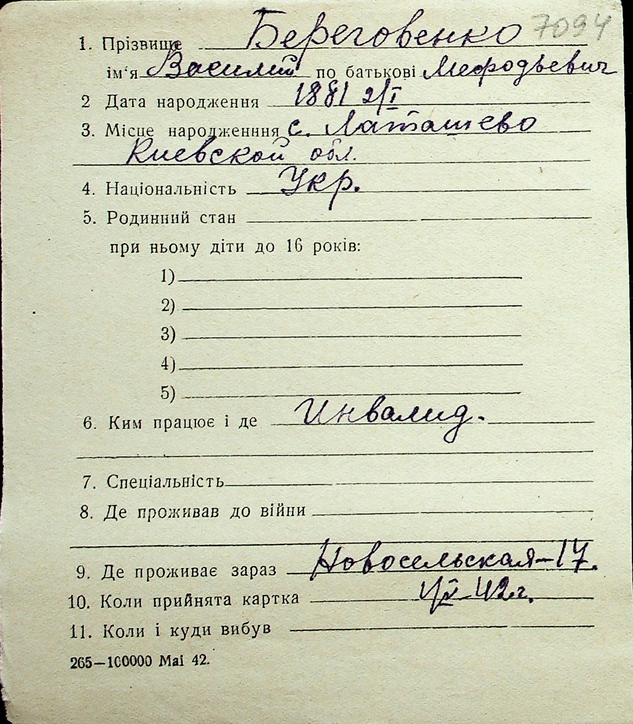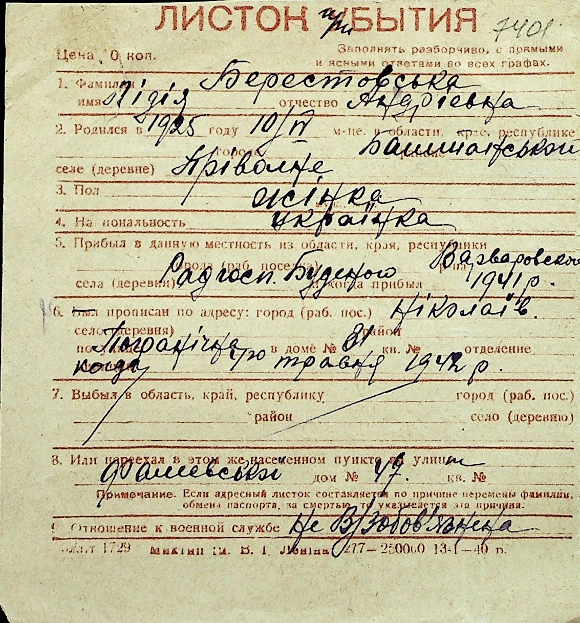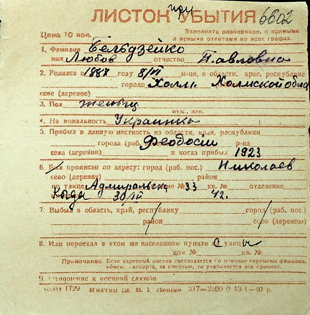 ◦ ◦ Перелік карток на осіб, які мешкали у м. Миколаїв у період окупації 1941–1944 років