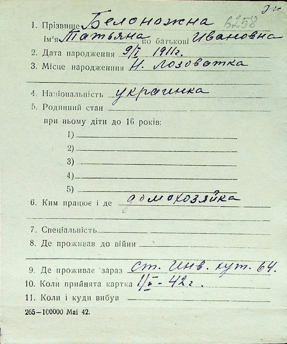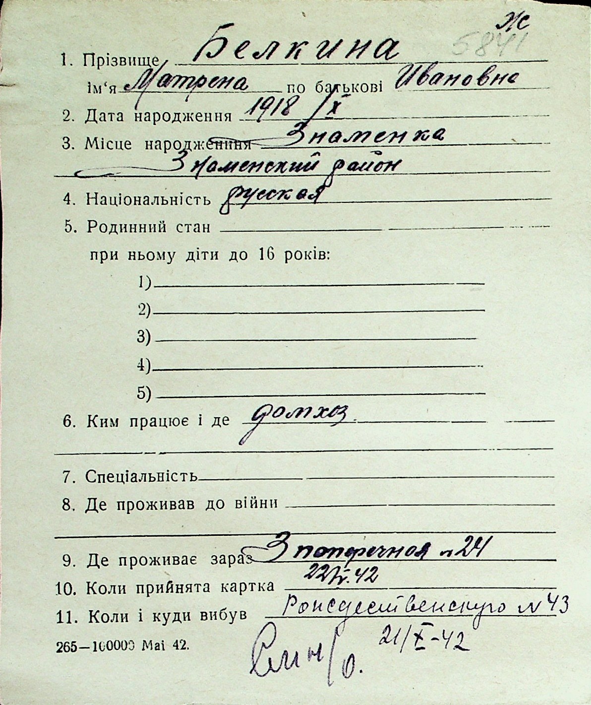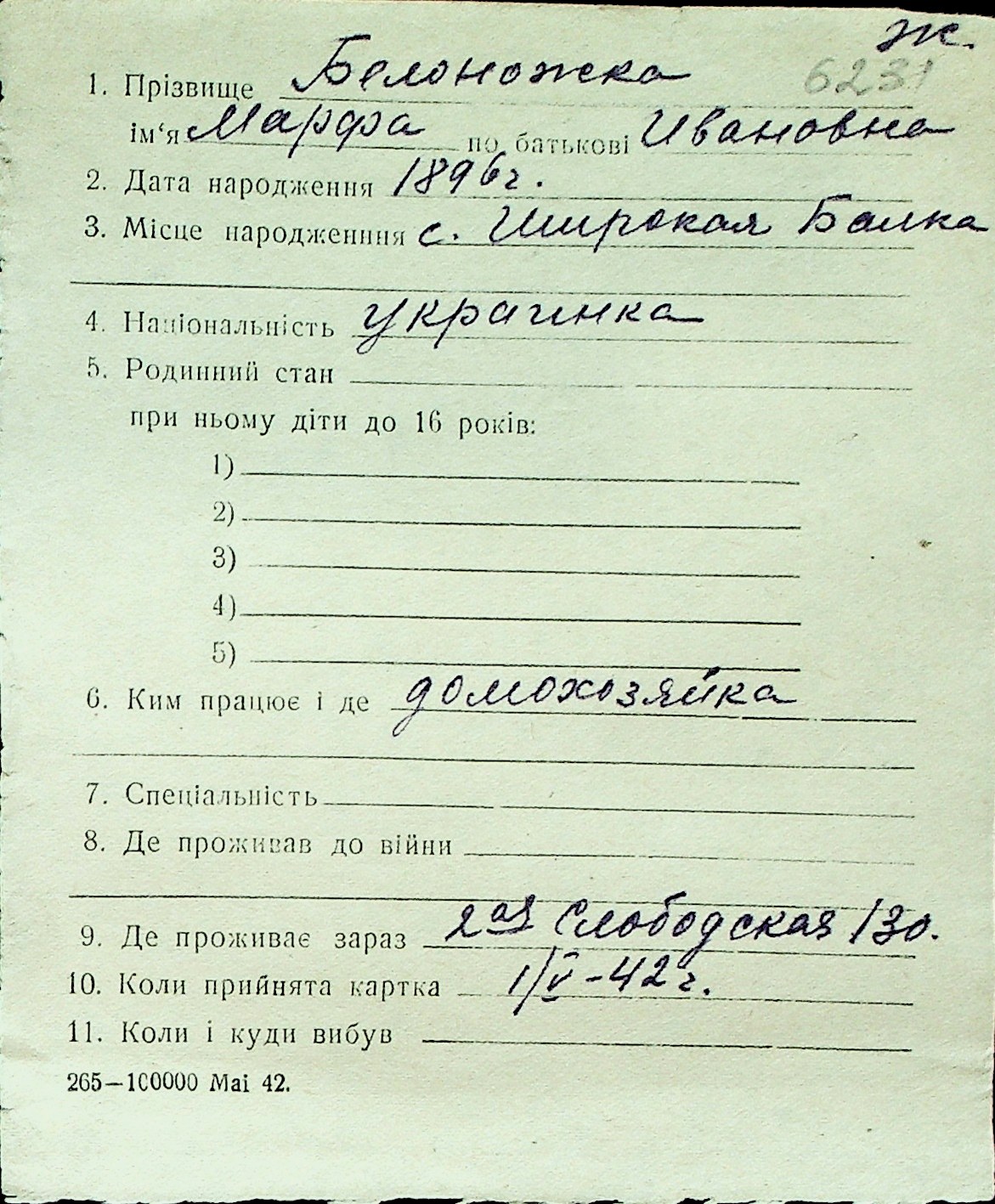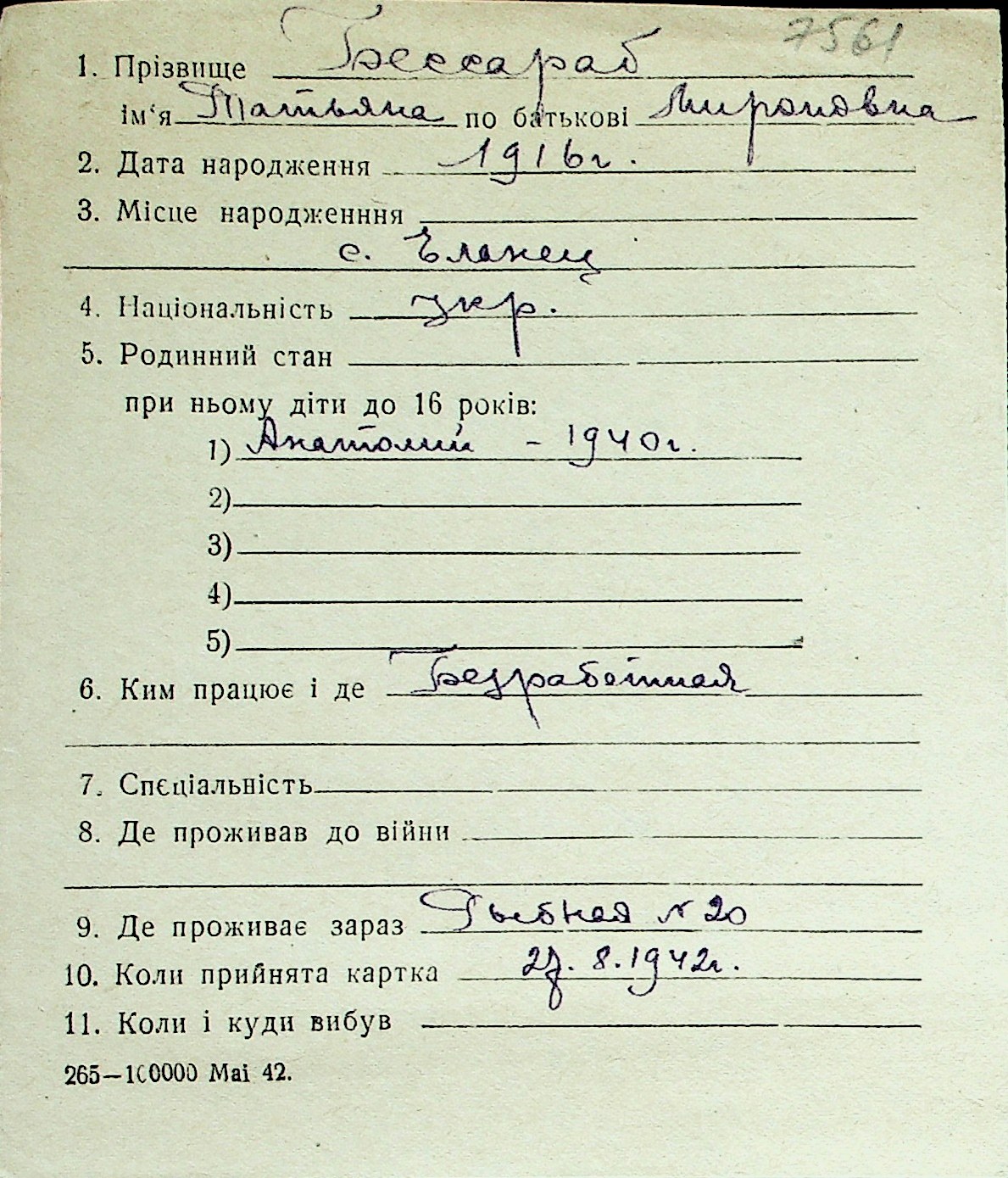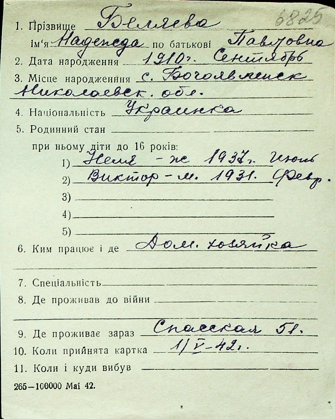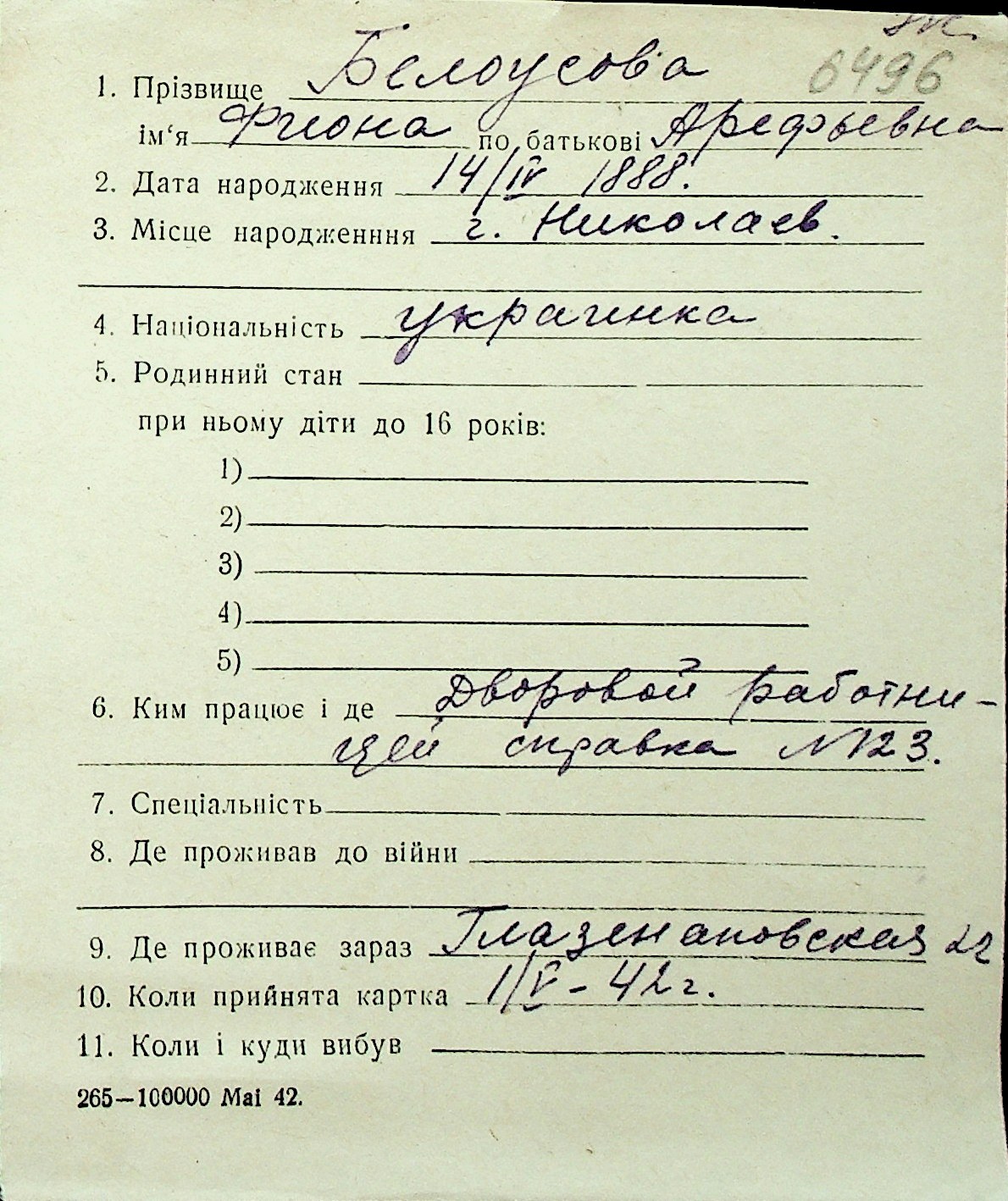 ◦ ◦ Перелік карток на осіб, які мешкали у м. Миколаїв у період окупації 1941–1944 років
