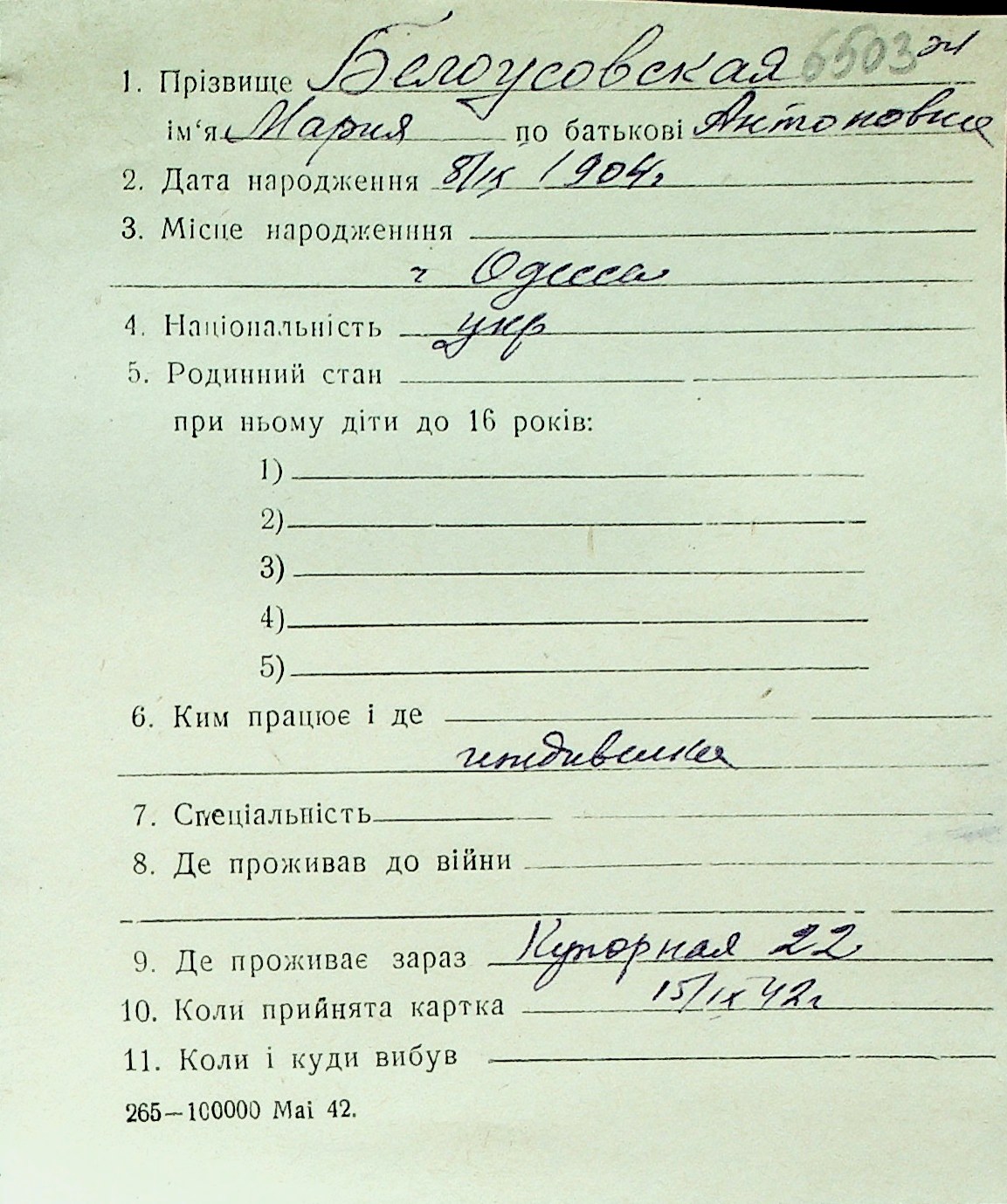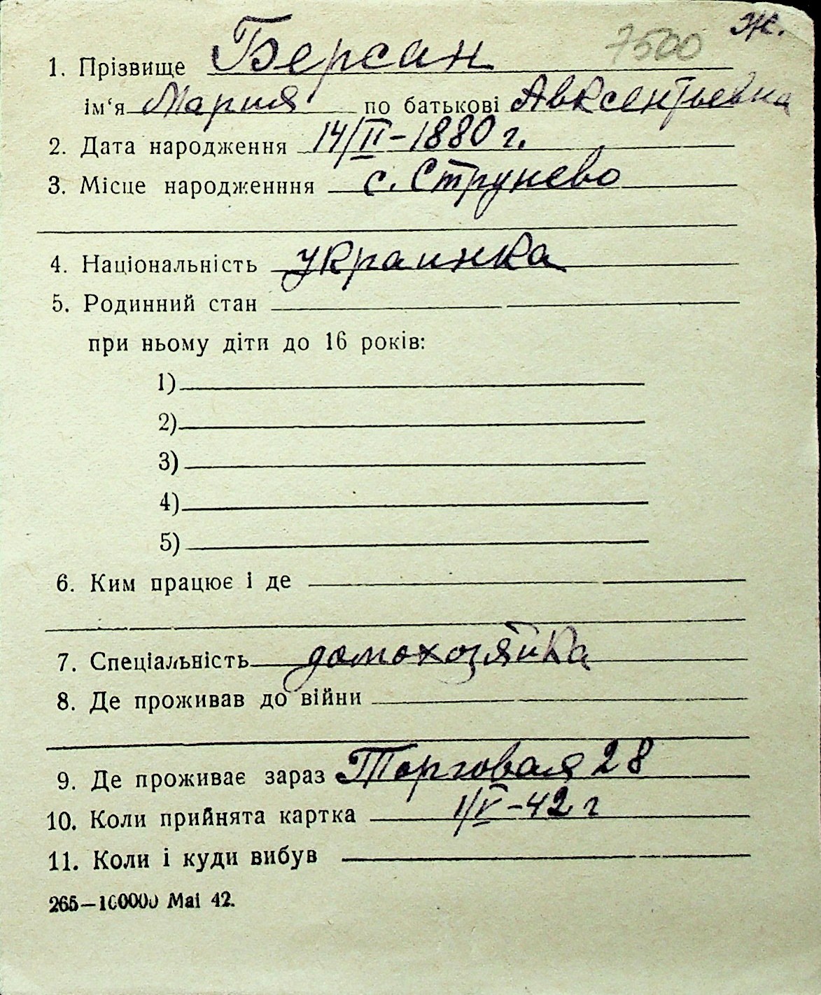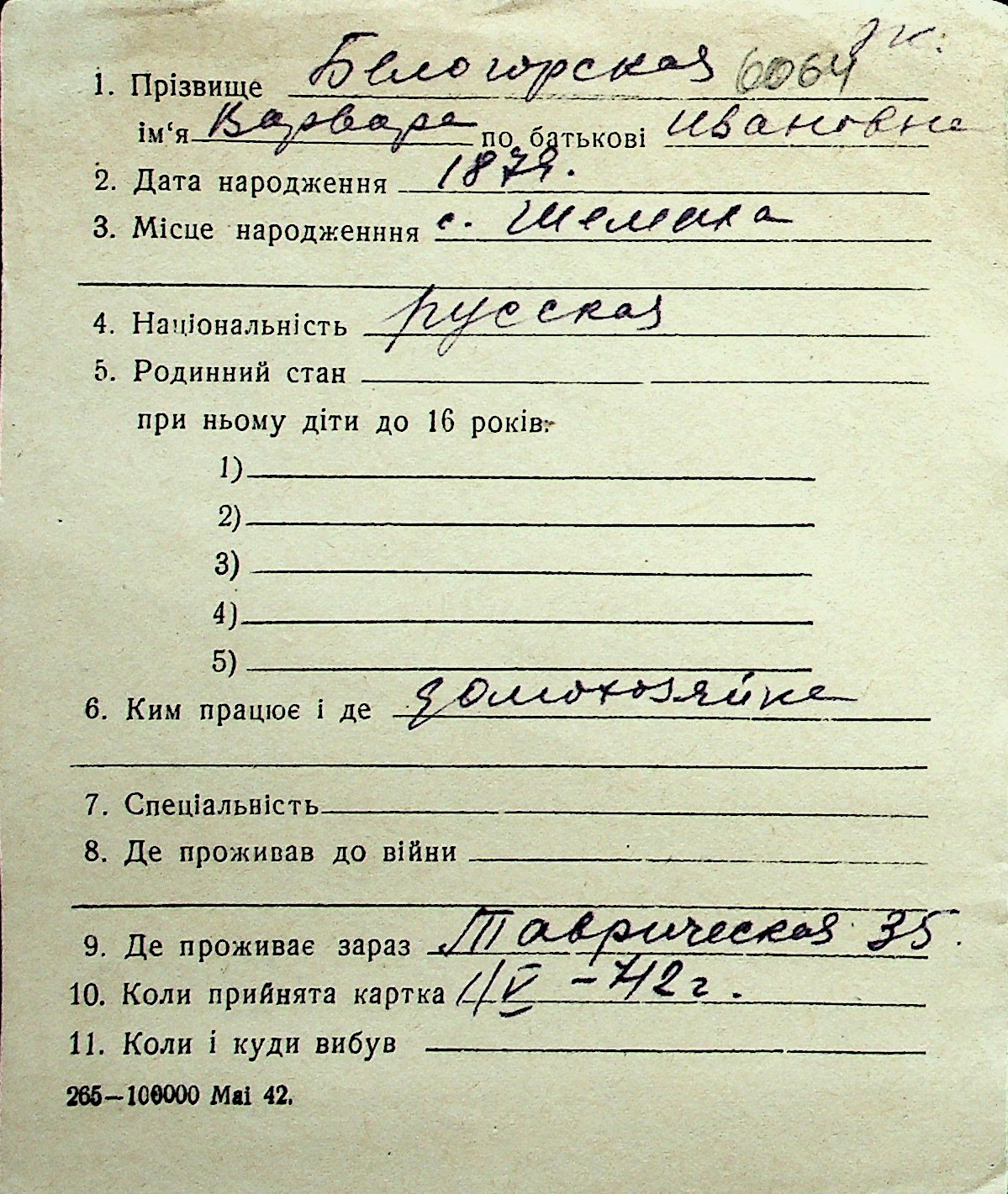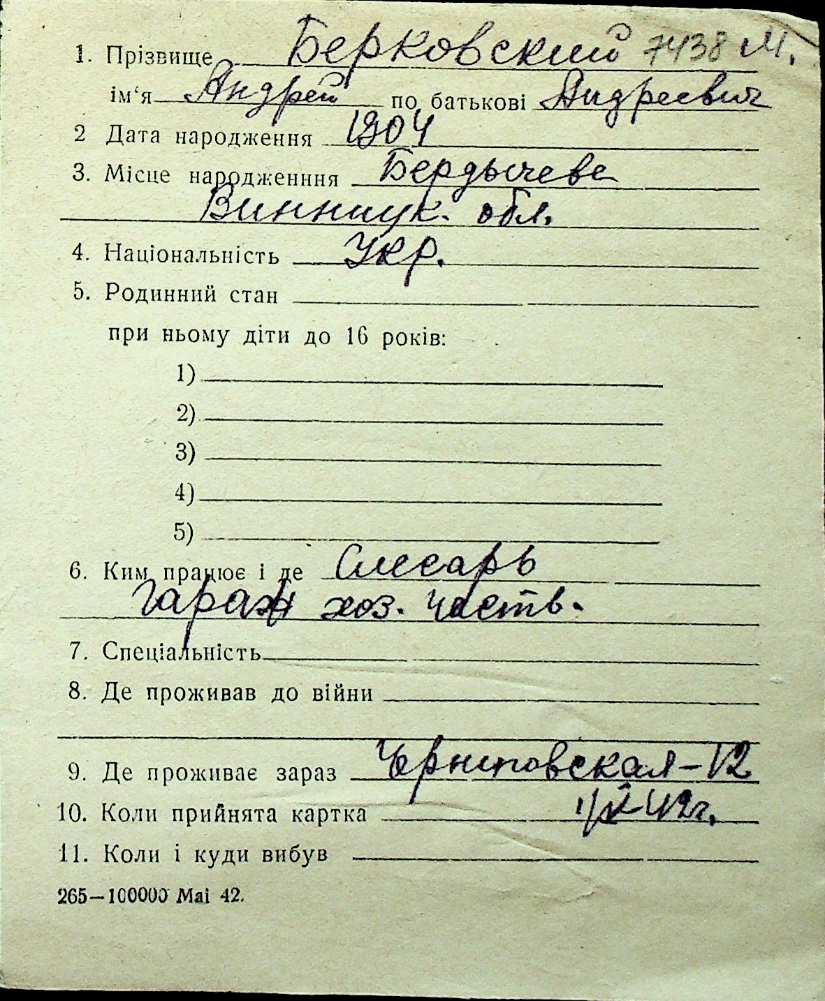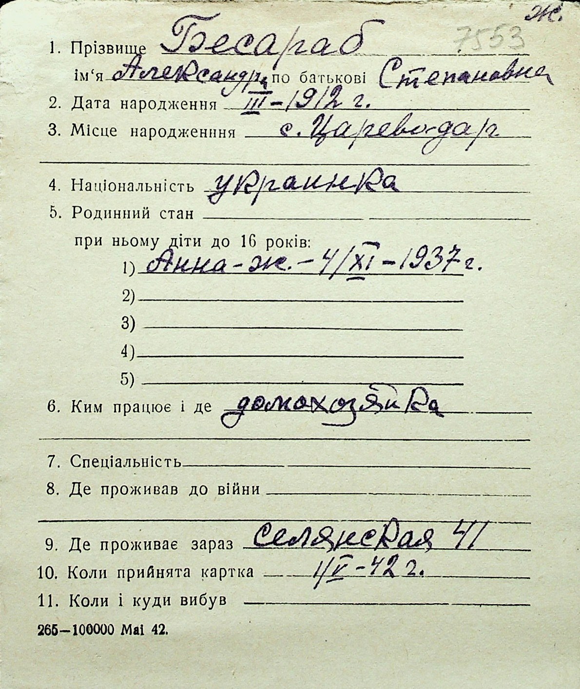 ◦ ◦ Перелік карток на осіб, які мешкали у м. Миколаїв у період окупації 1941–1944 років