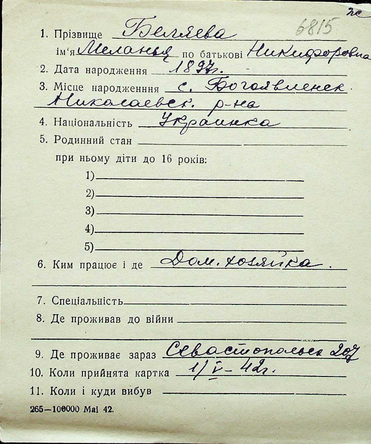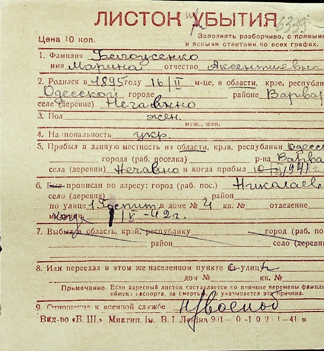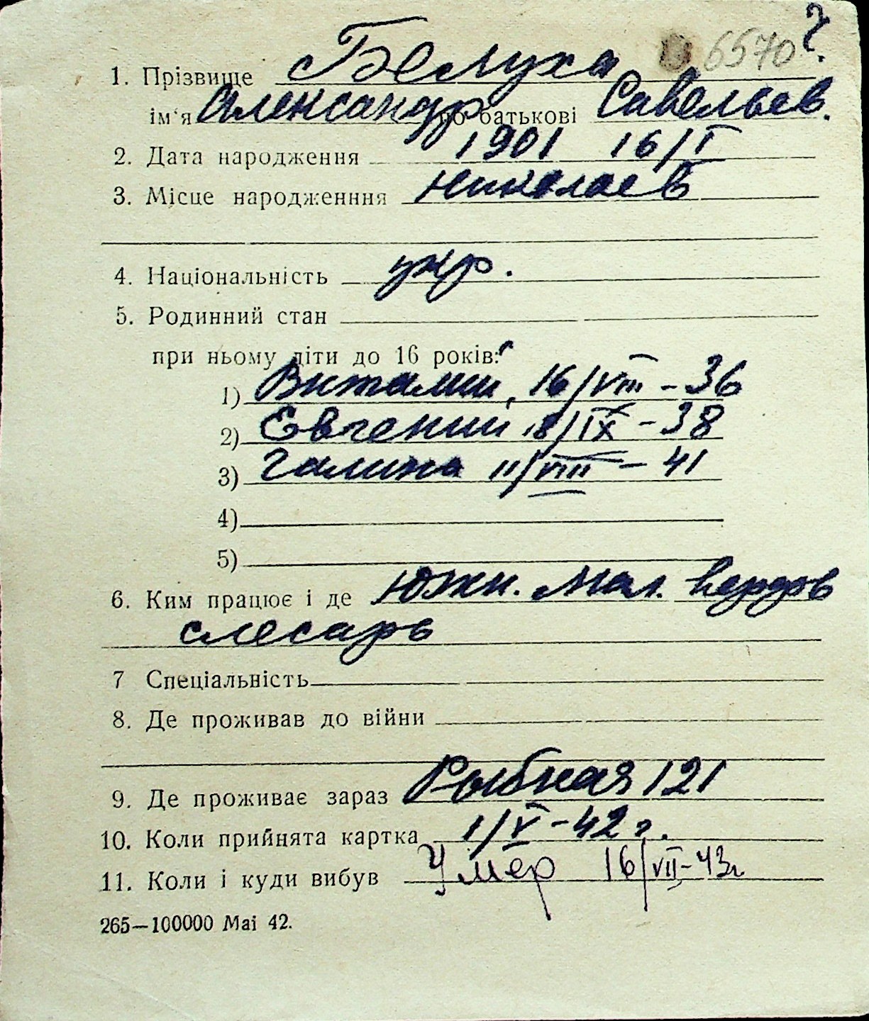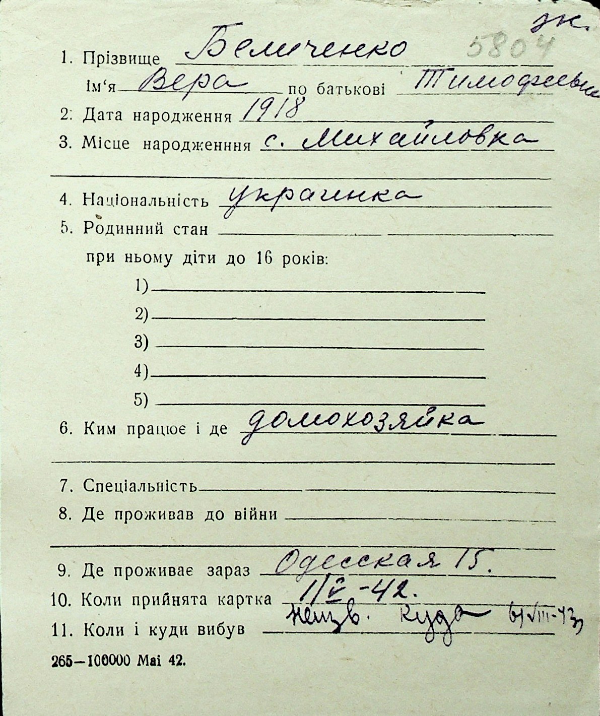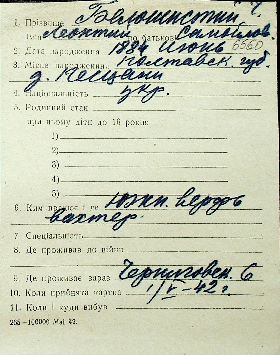 ◦ ◦ Перелік карток на осіб, які мешкали у м. Миколаїв у період окупації 1941–1944 років