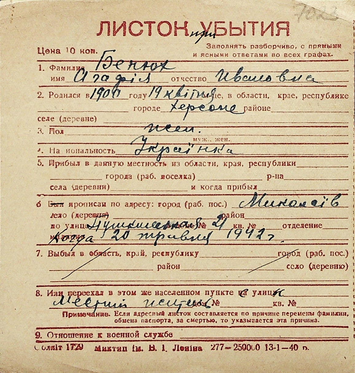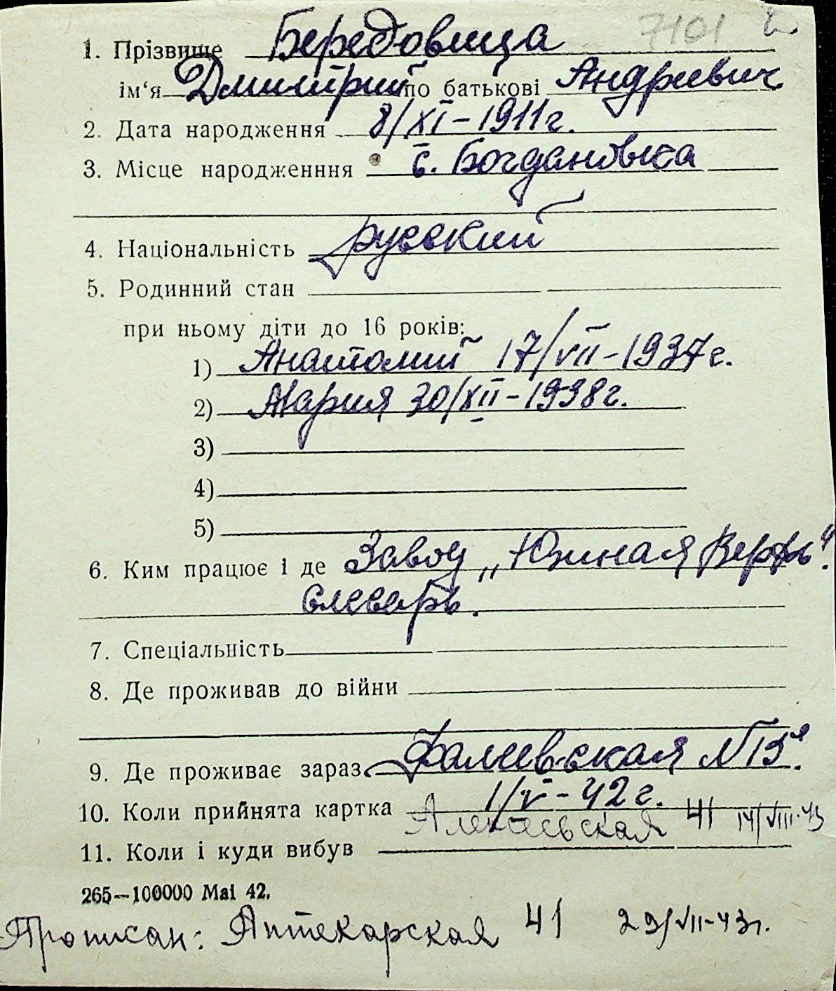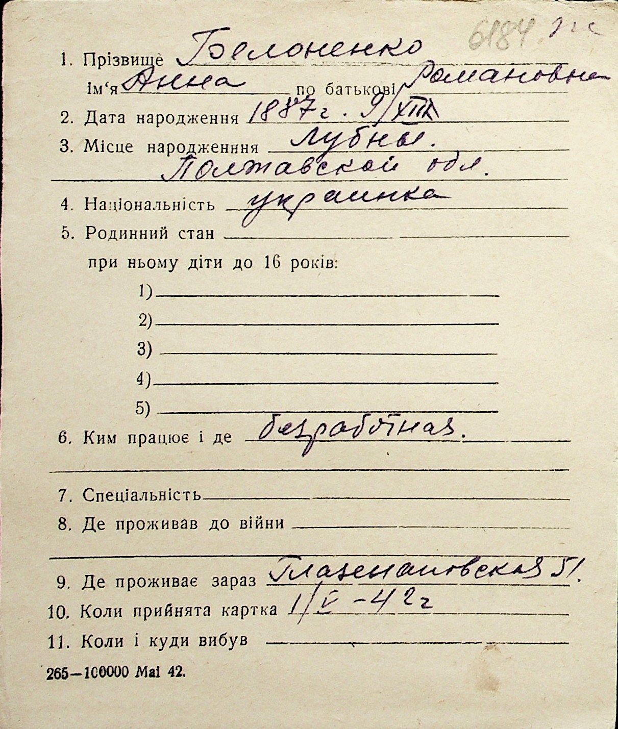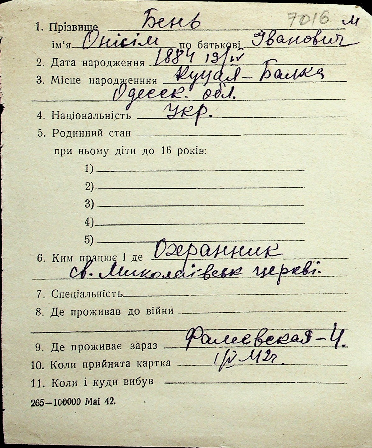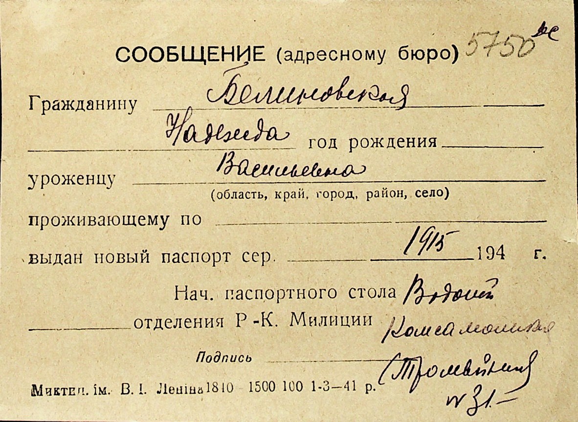 ◦ ◦ Перелік карток на осіб, які мешкали у м. Миколаїв у період окупації 1941–1944 років