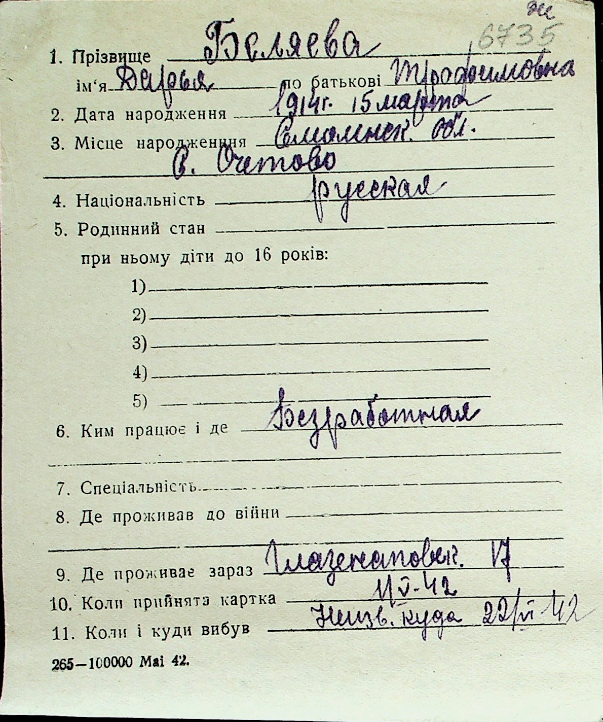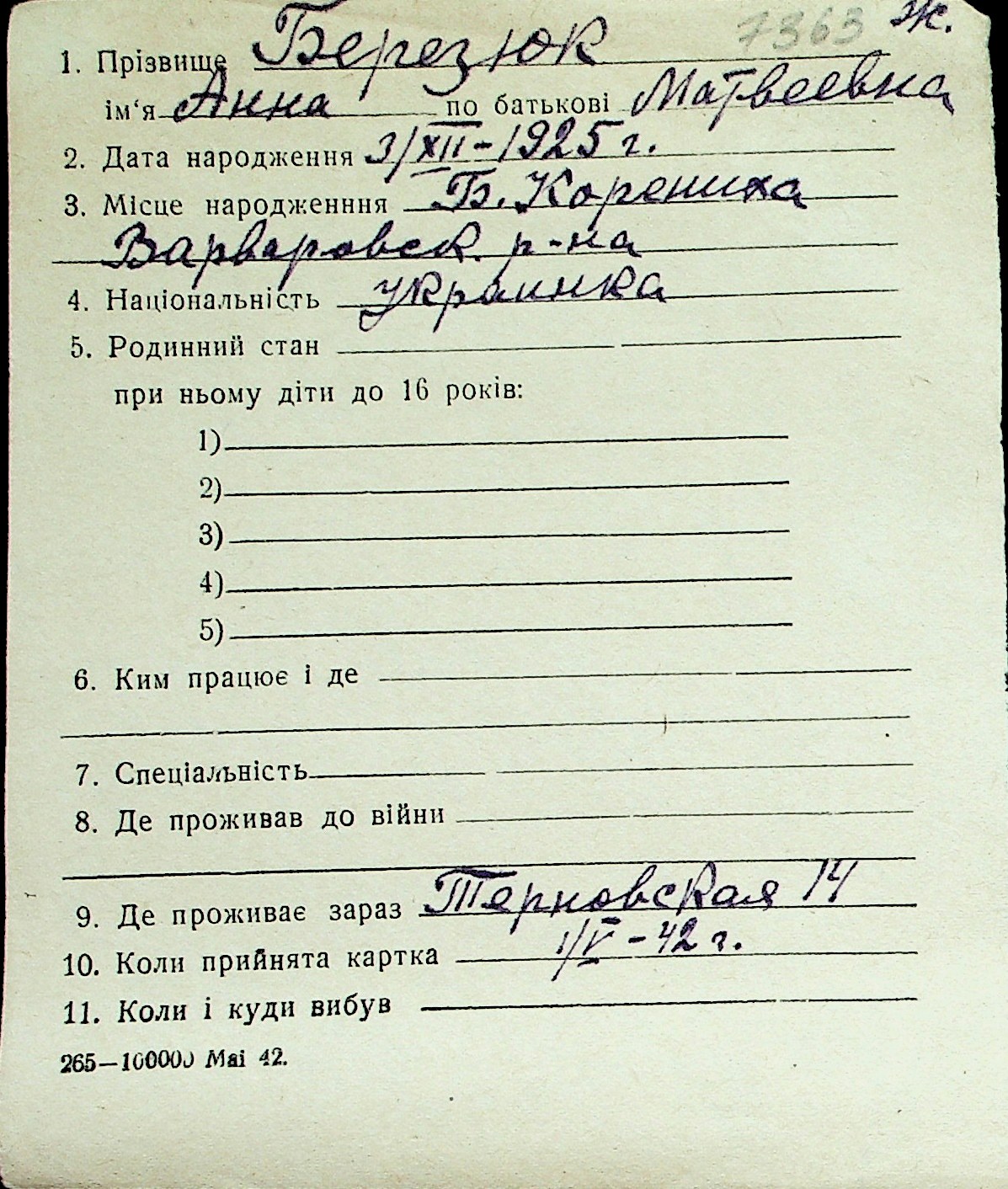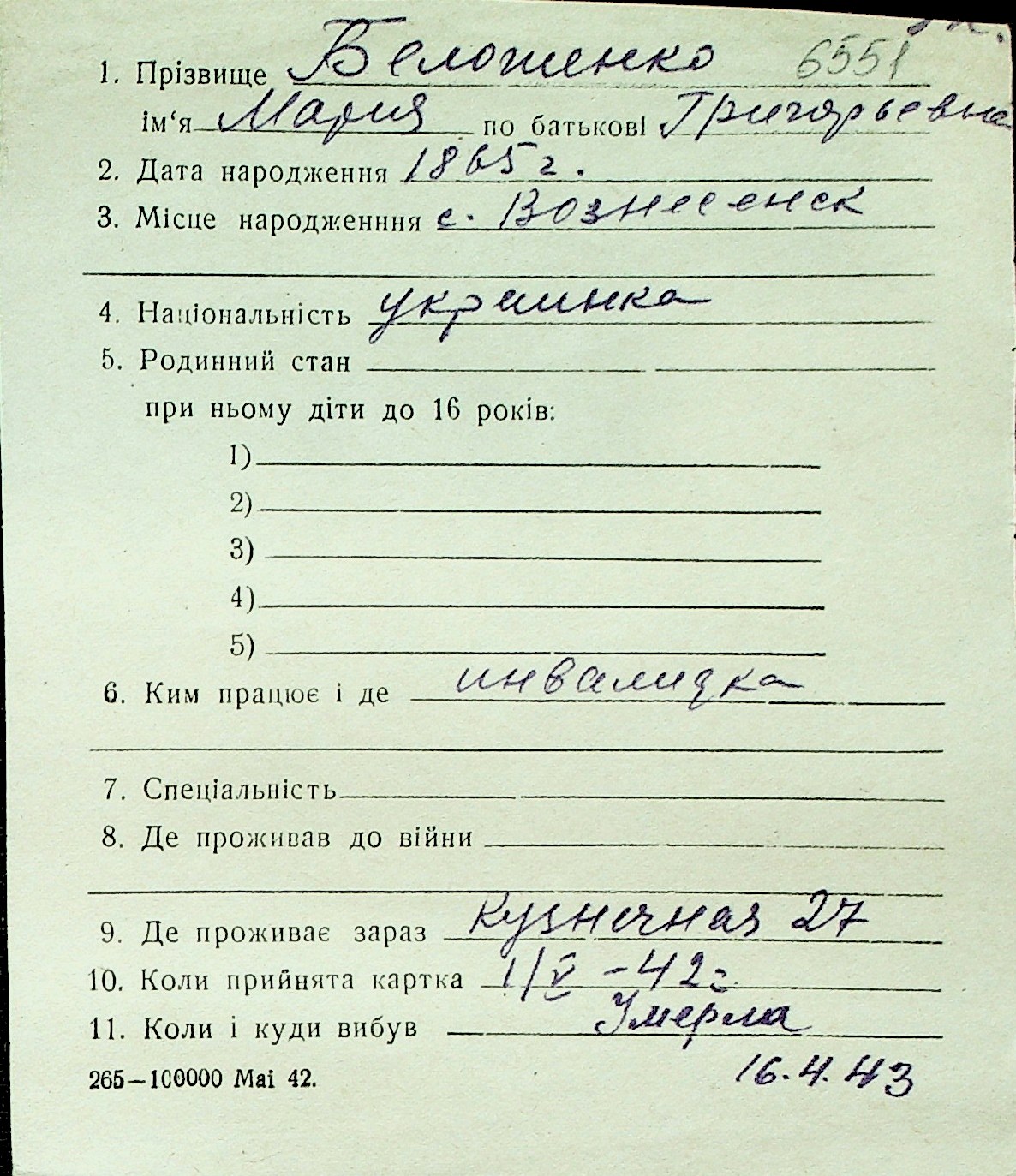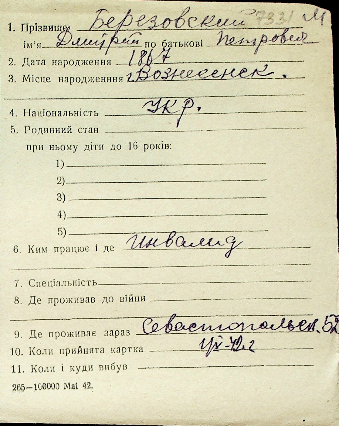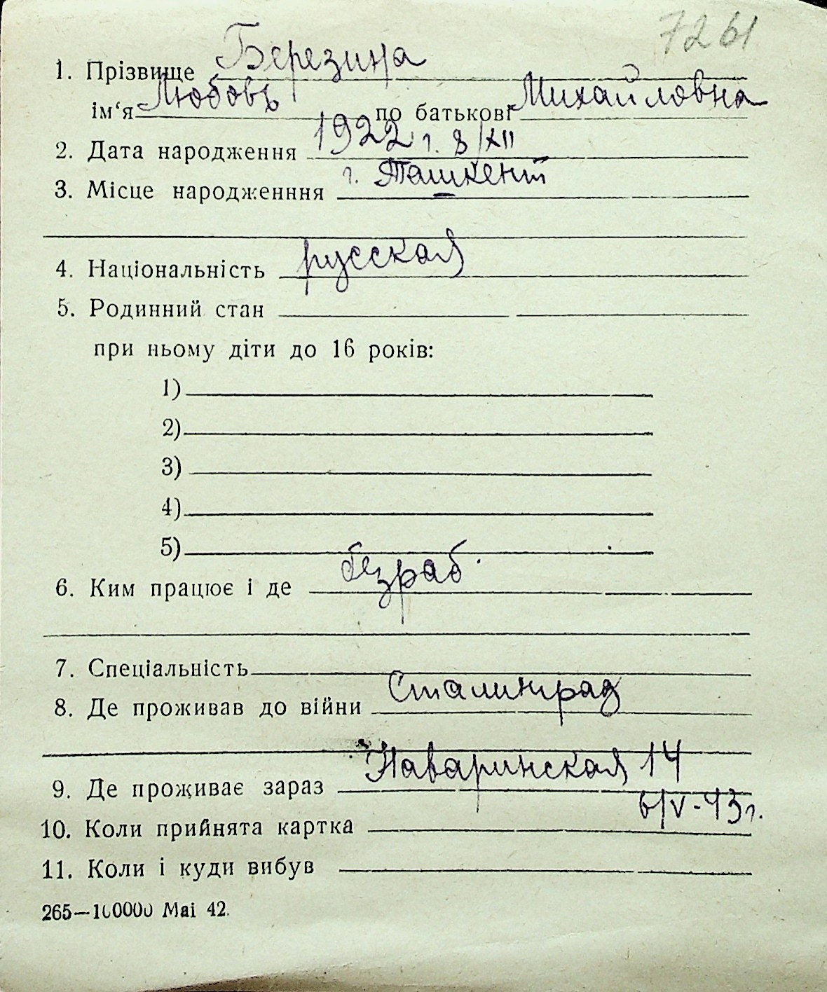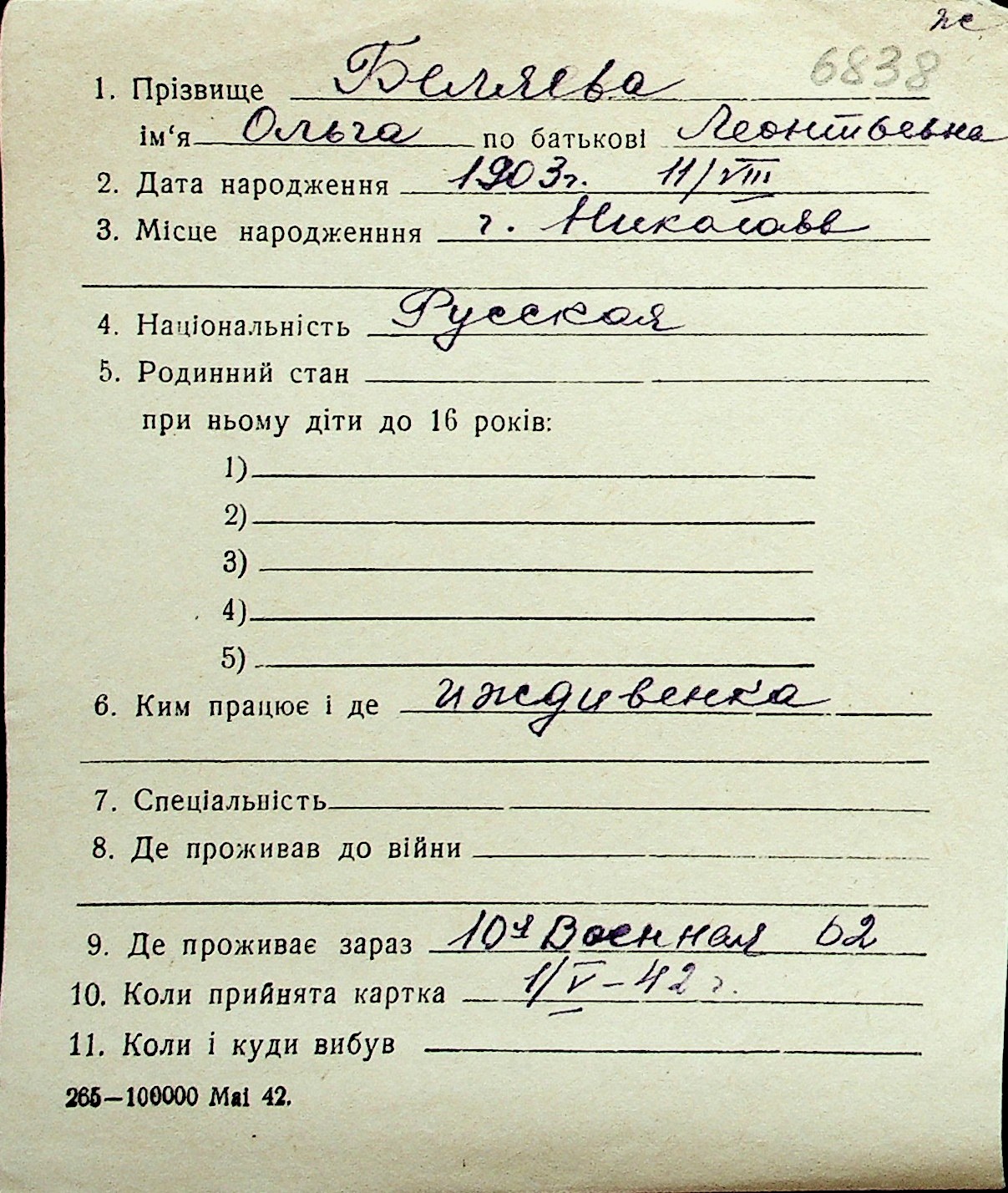 ◦ ◦ Перелік карток на осіб, які мешкали у м. Миколаїв у період окупації 1941–1944 років