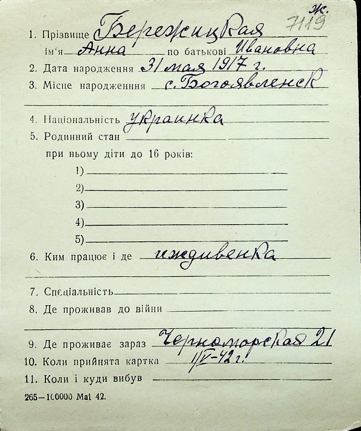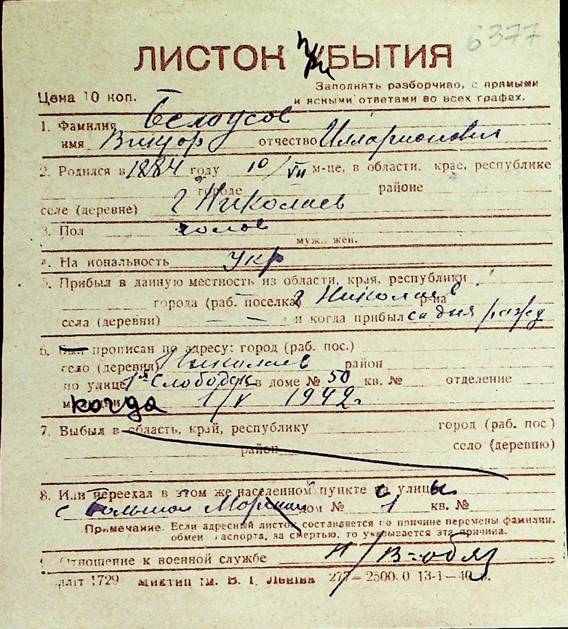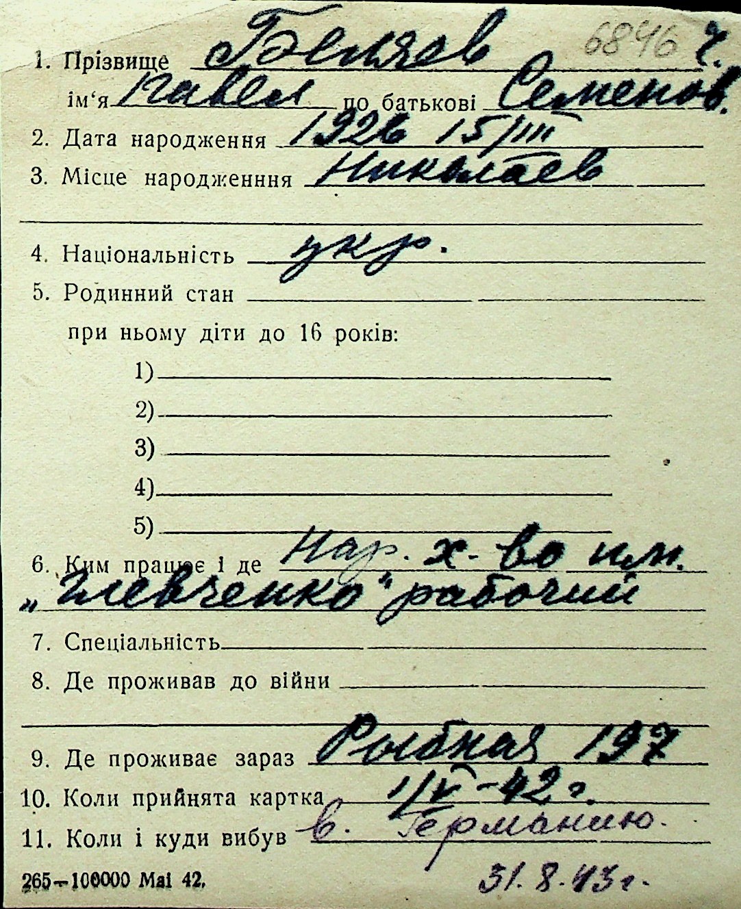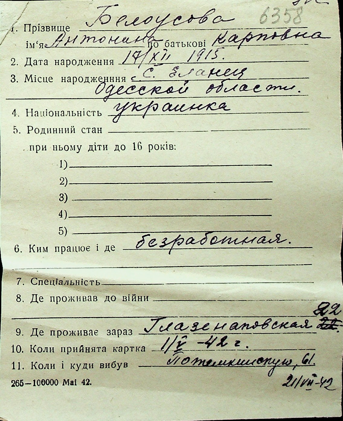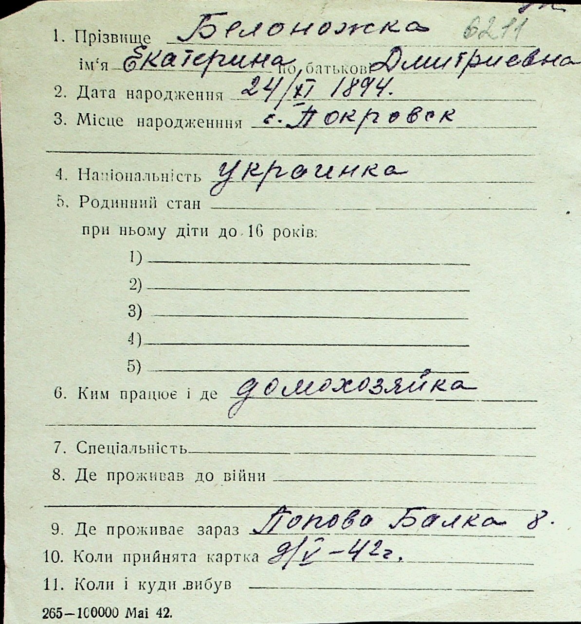 ◦ ◦ Перелік карток на осіб, які мешкали у м. Миколаїв у період окупації 1941–1944 років