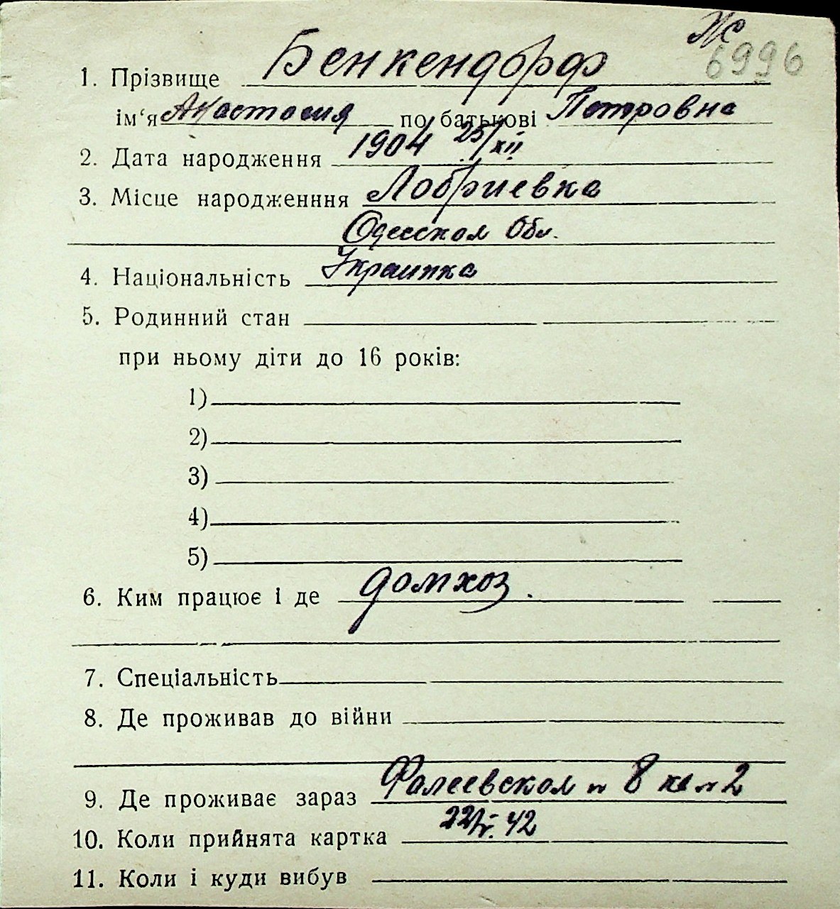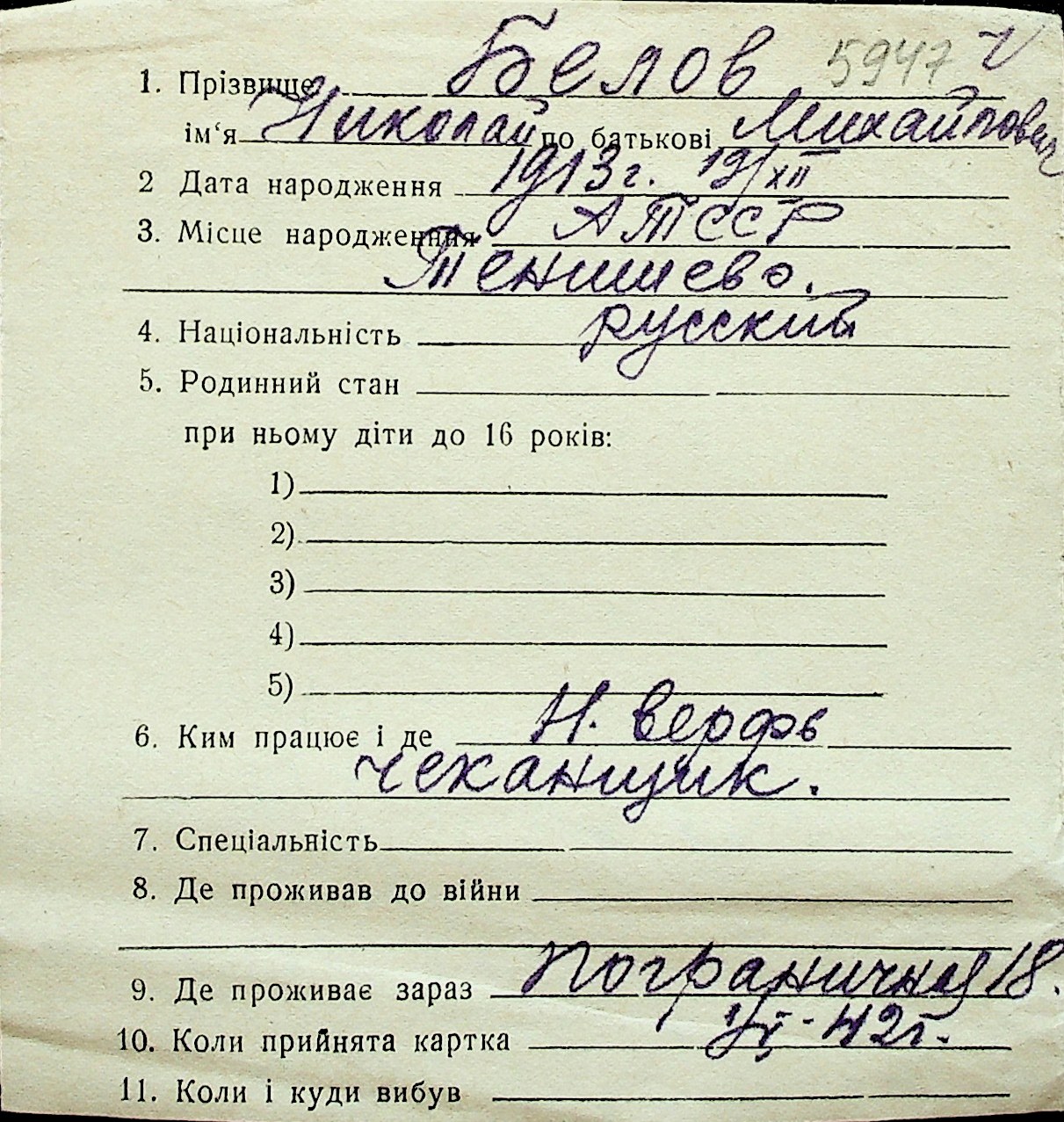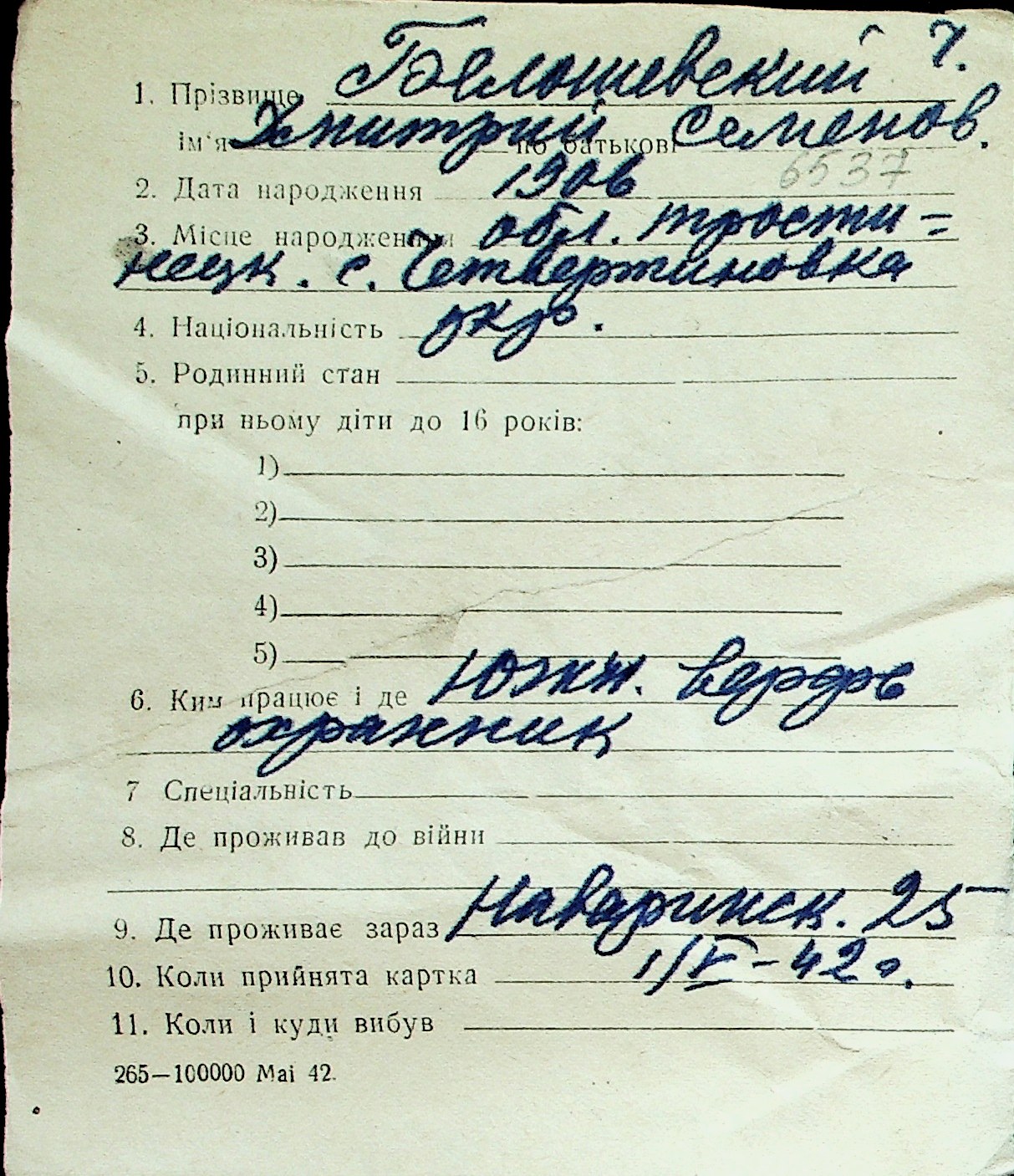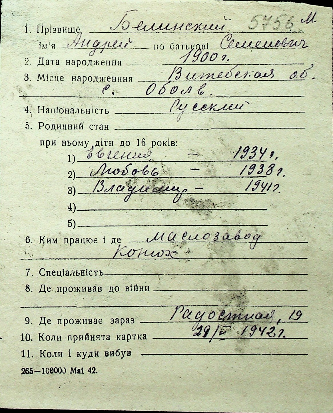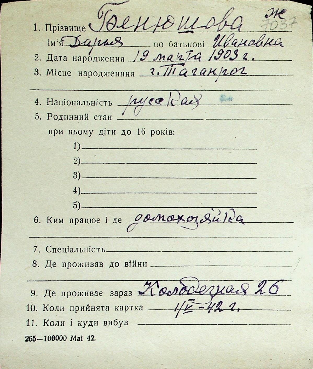 ◦ ◦ Перелік карток на осіб, які мешкали у м. Миколаїв у період окупації 1941–1944 років