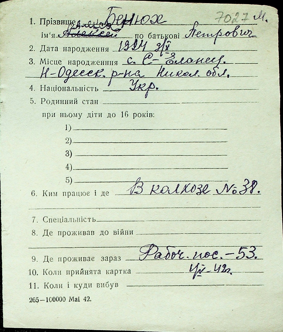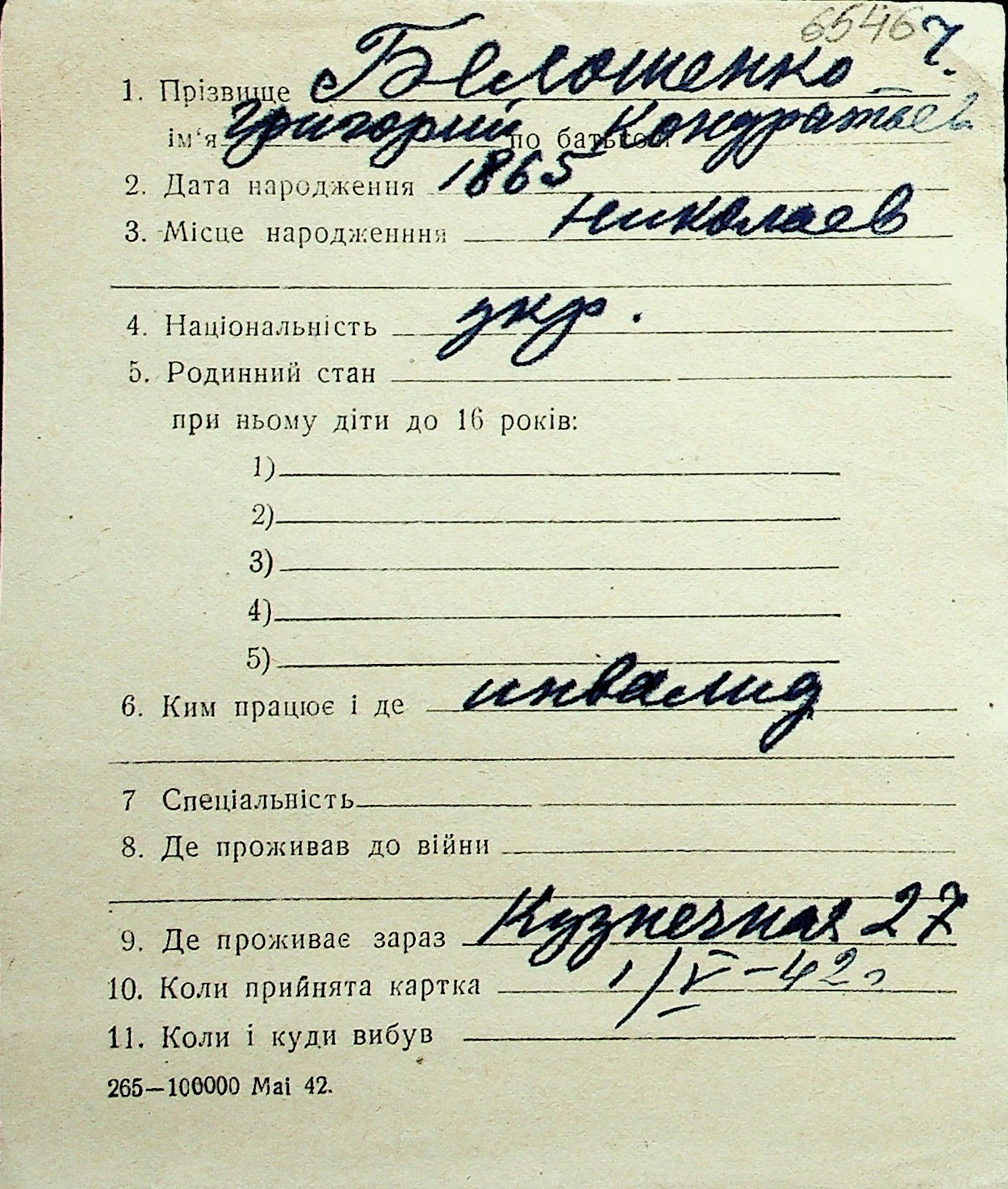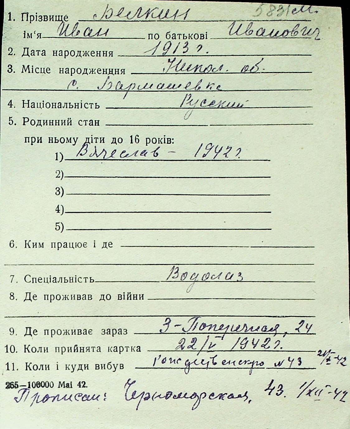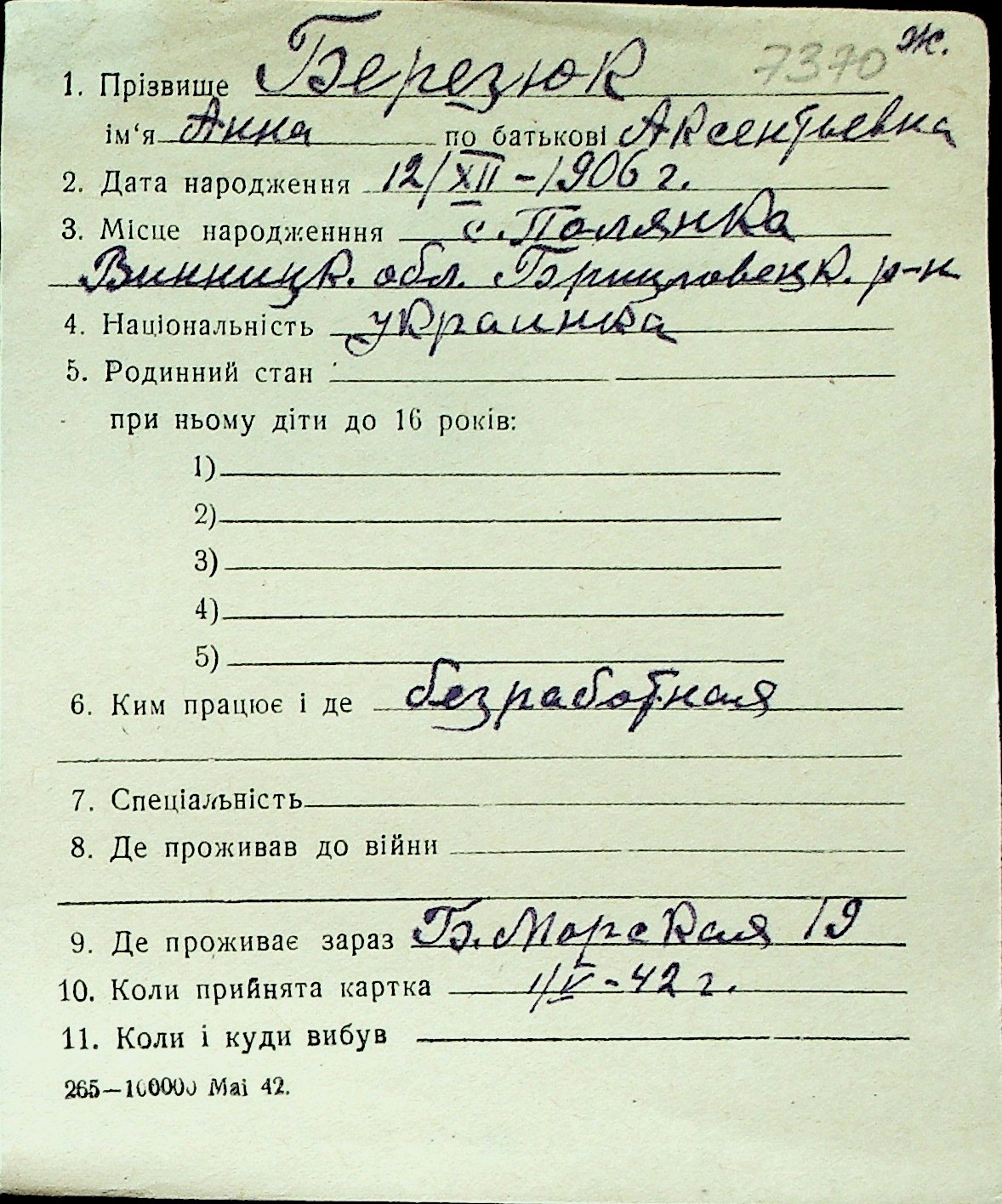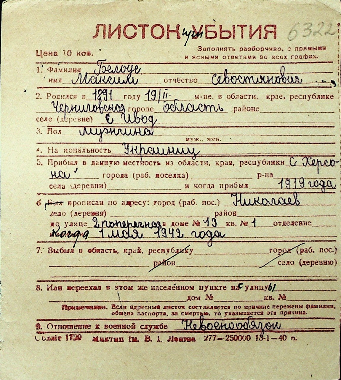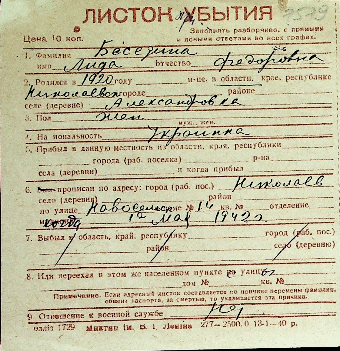 ◦ ◦ Перелік карток на осіб, які мешкали у м. Миколаїв у період окупації 1941–1944 років