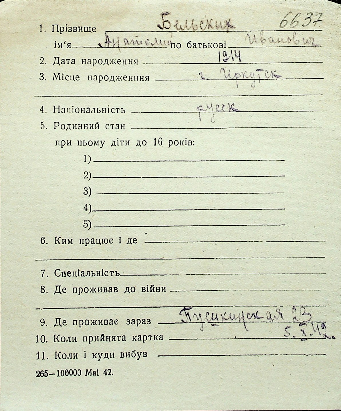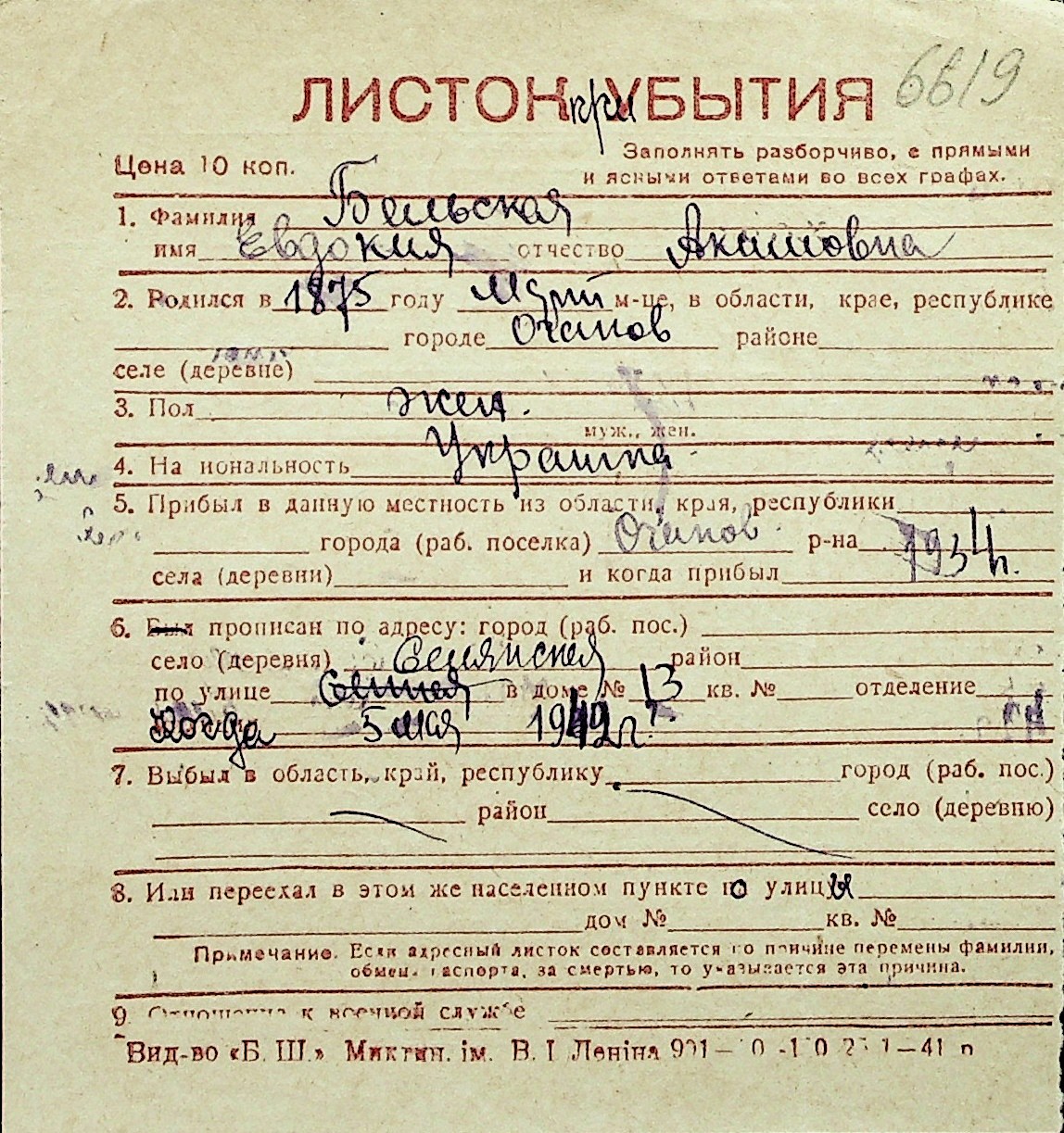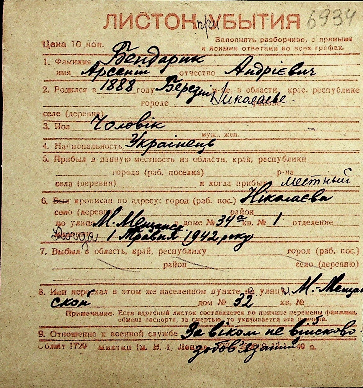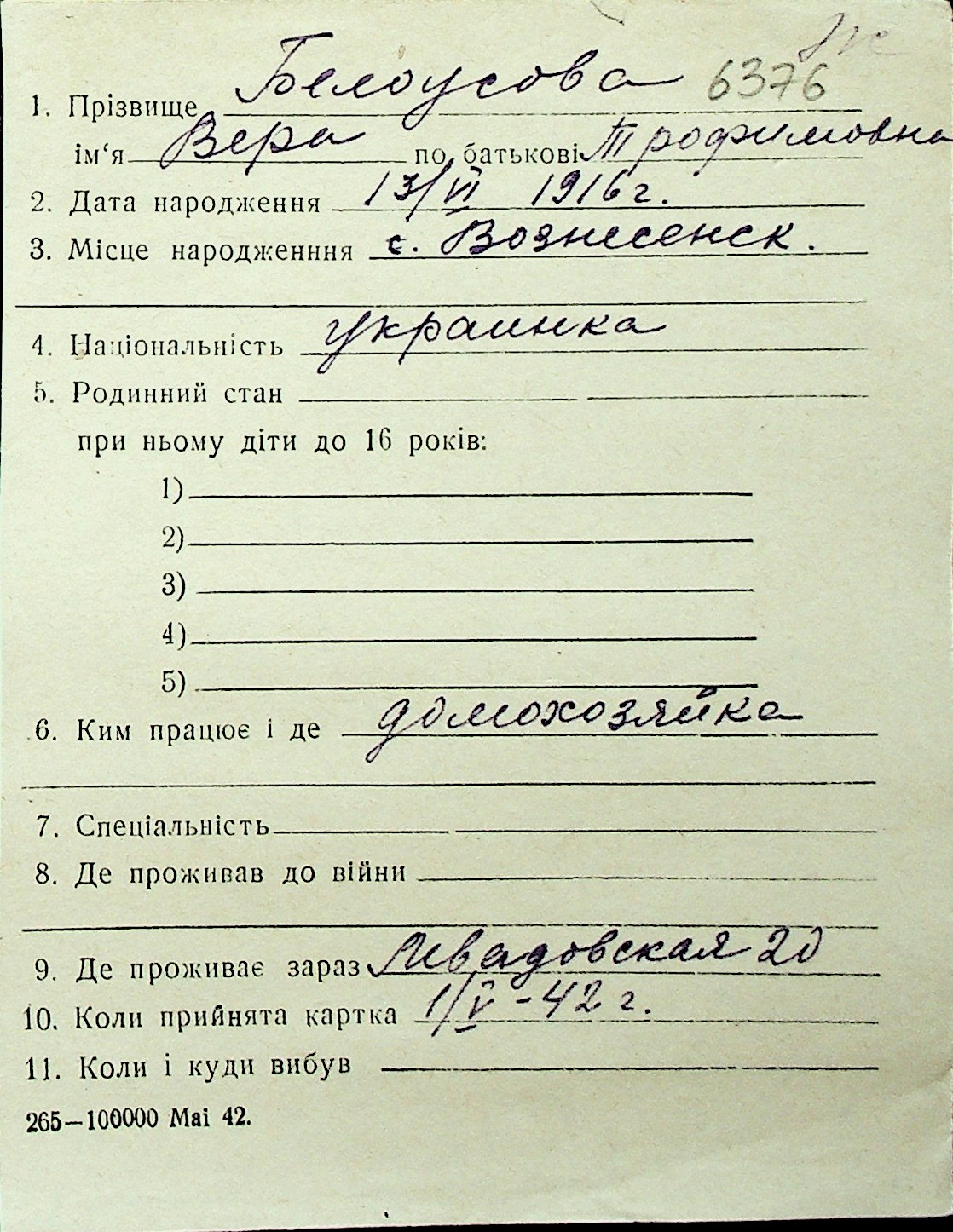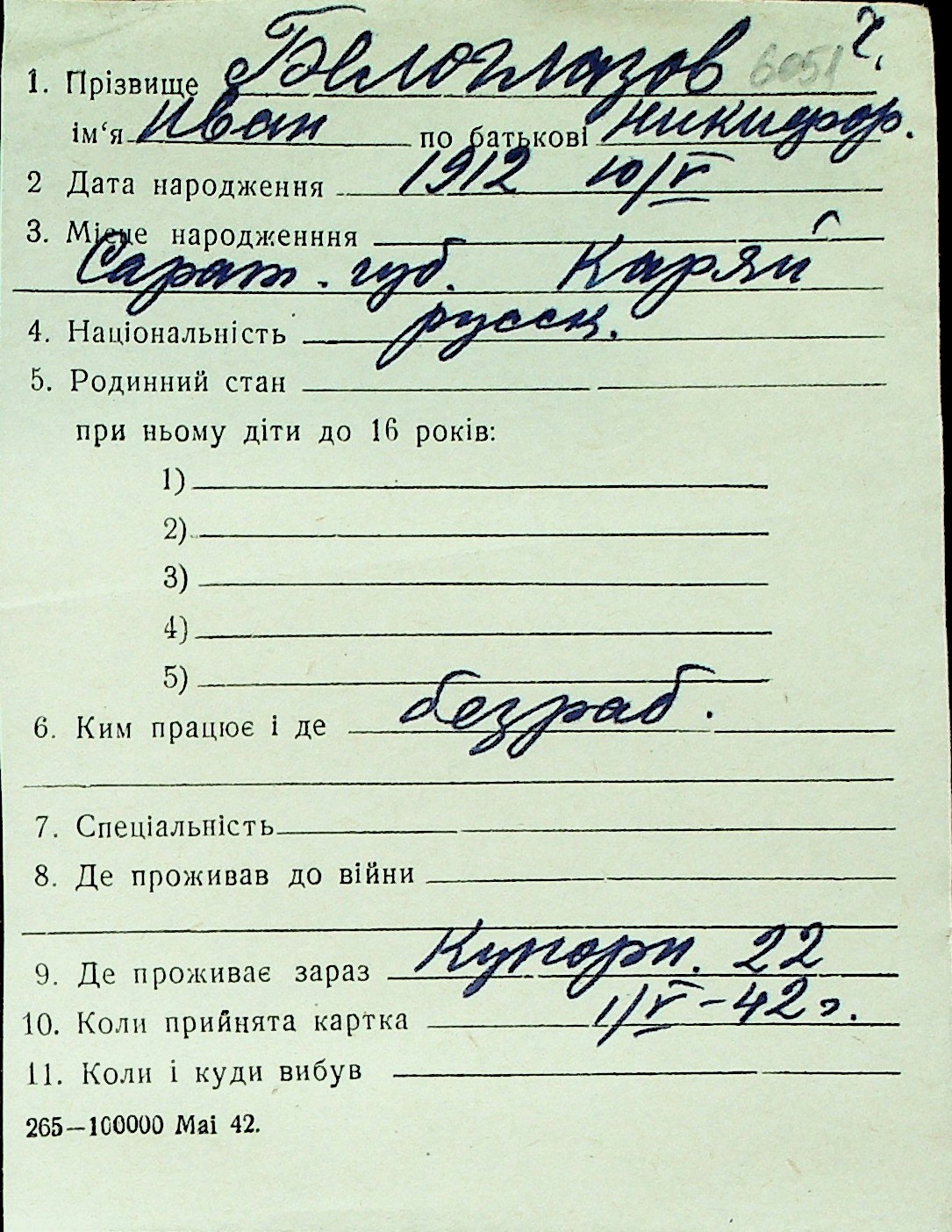 ◦ ◦ Перелік карток на осіб, які мешкали у м. Миколаїв у період окупації 1941–1944 років