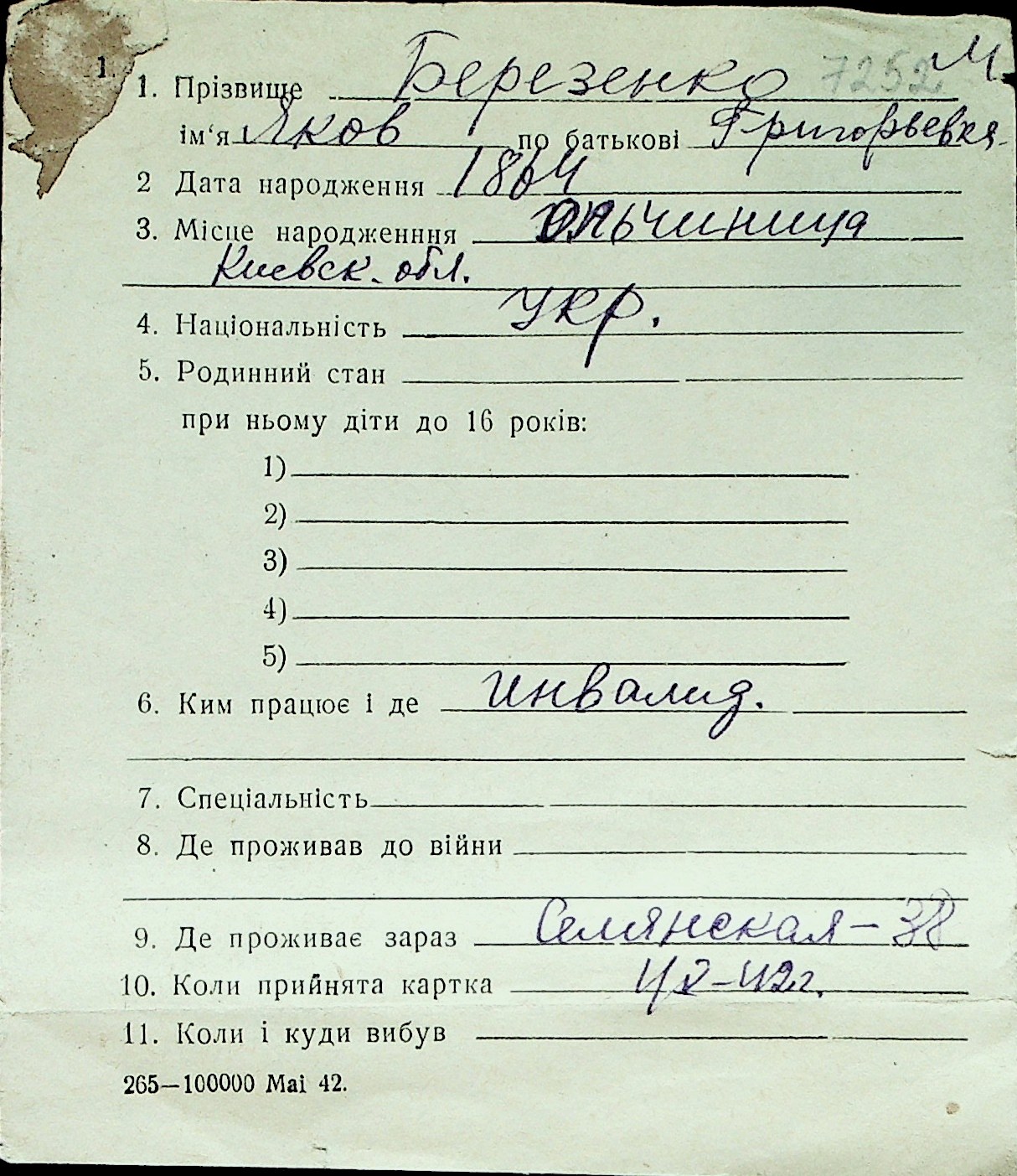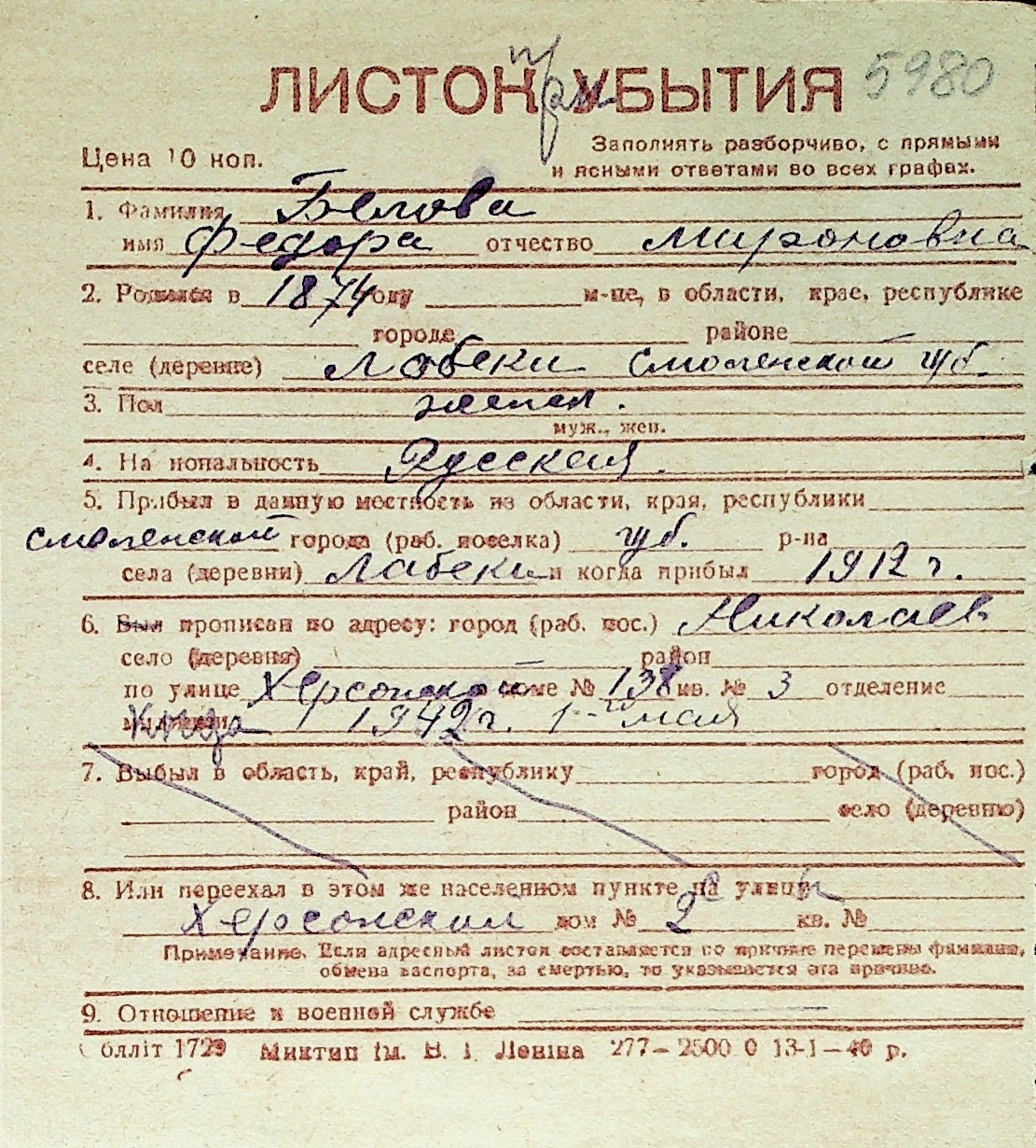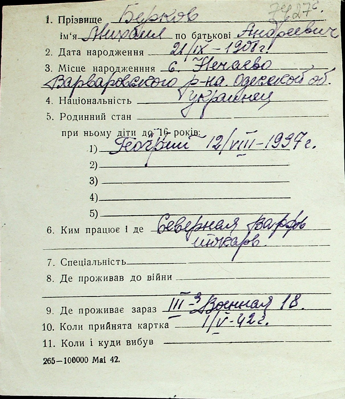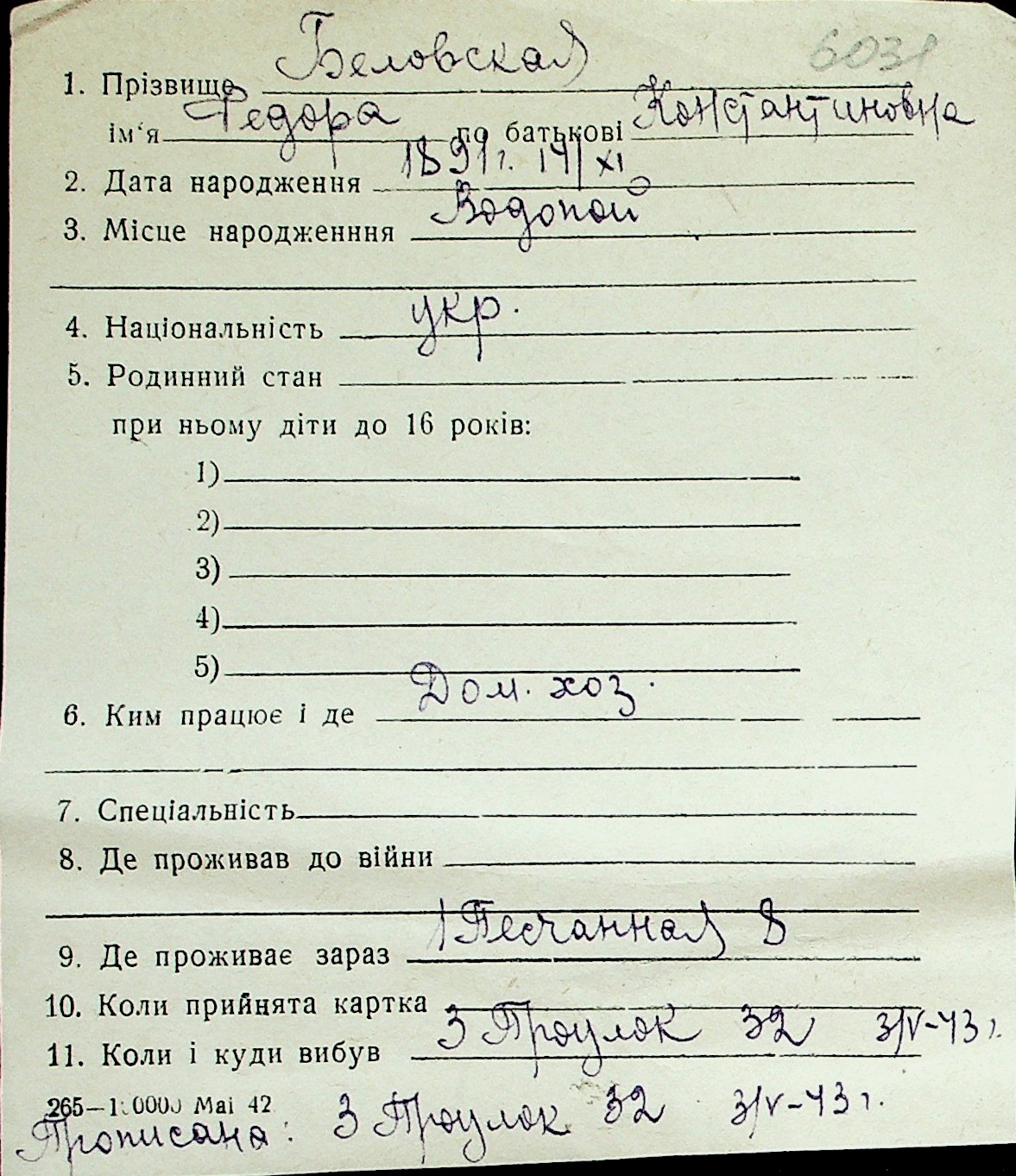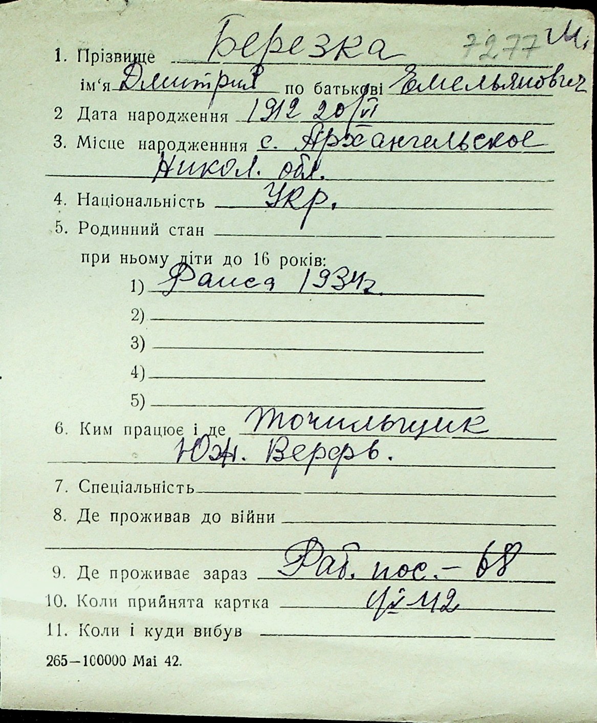 ◦ ◦ Перелік карток на осіб, які мешкали у м. Миколаїв у період окупації 1941–1944 років