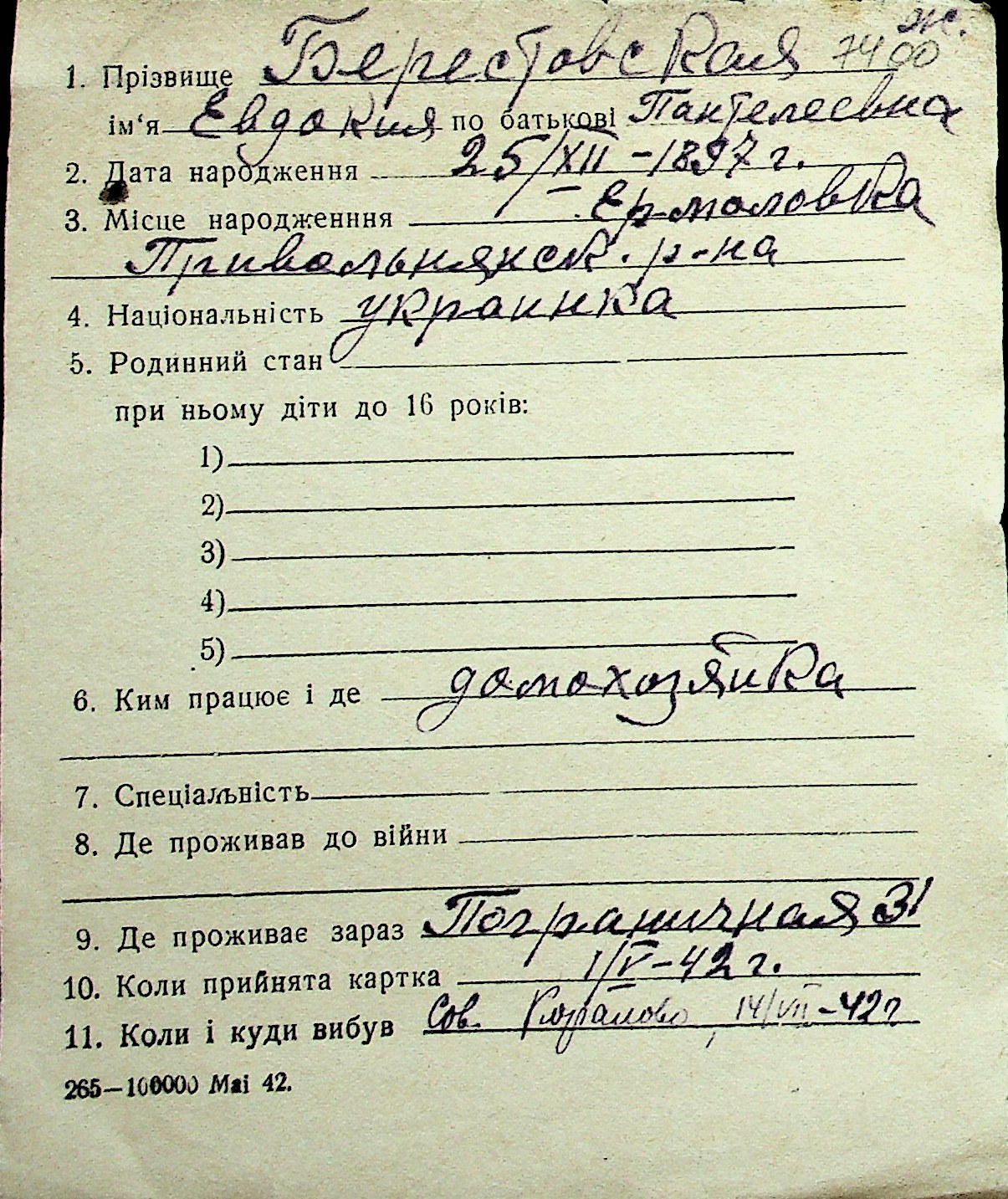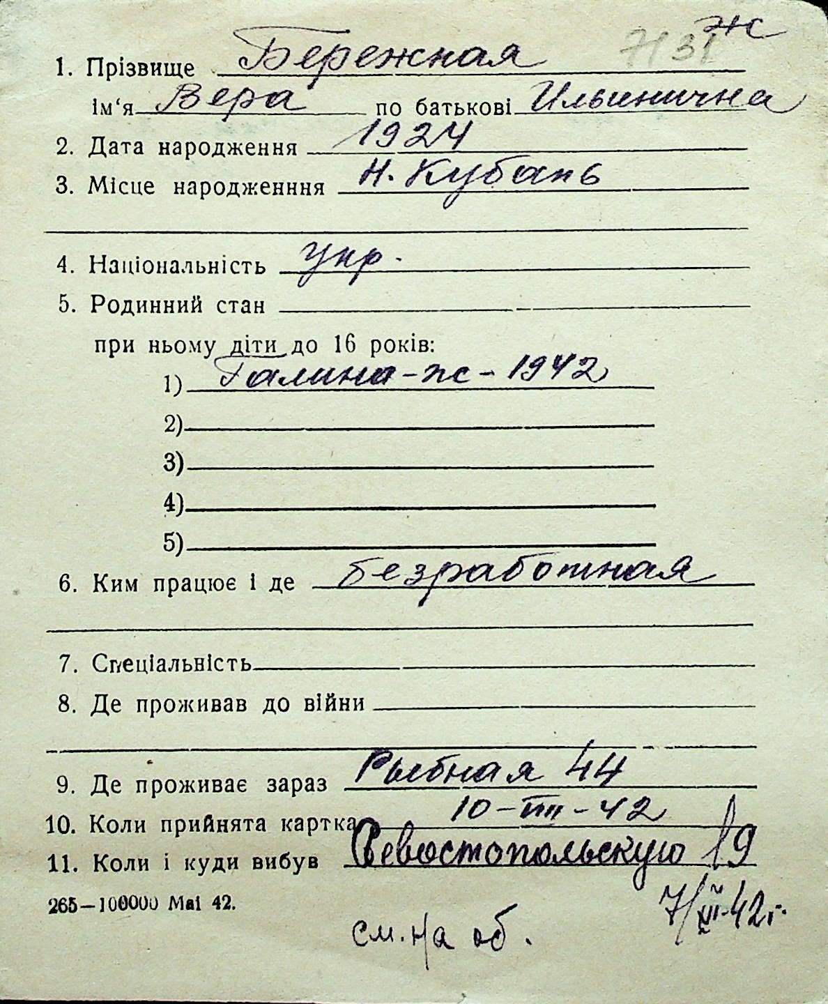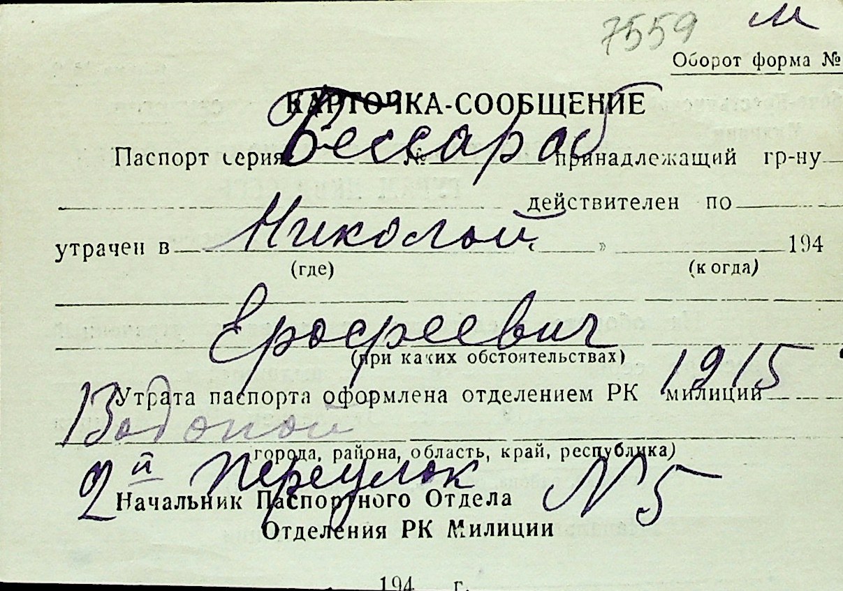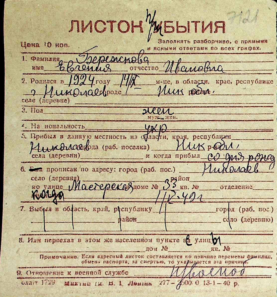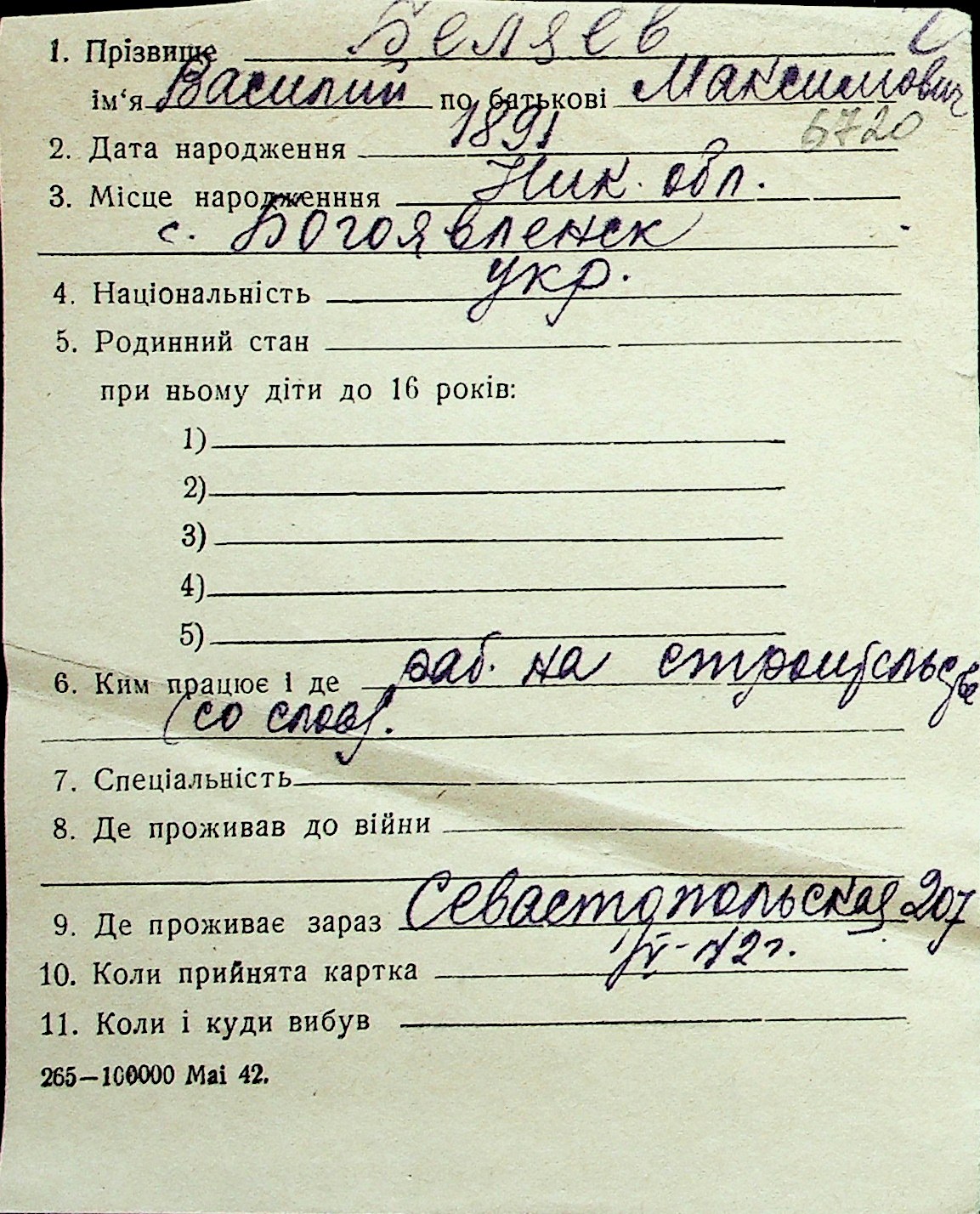 ◦ ◦ Перелік карток на осіб, які мешкали у м. Миколаїв у період окупації 1941–1944 років