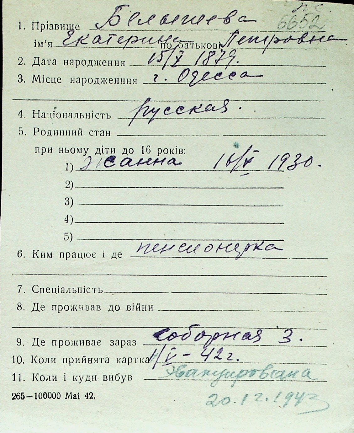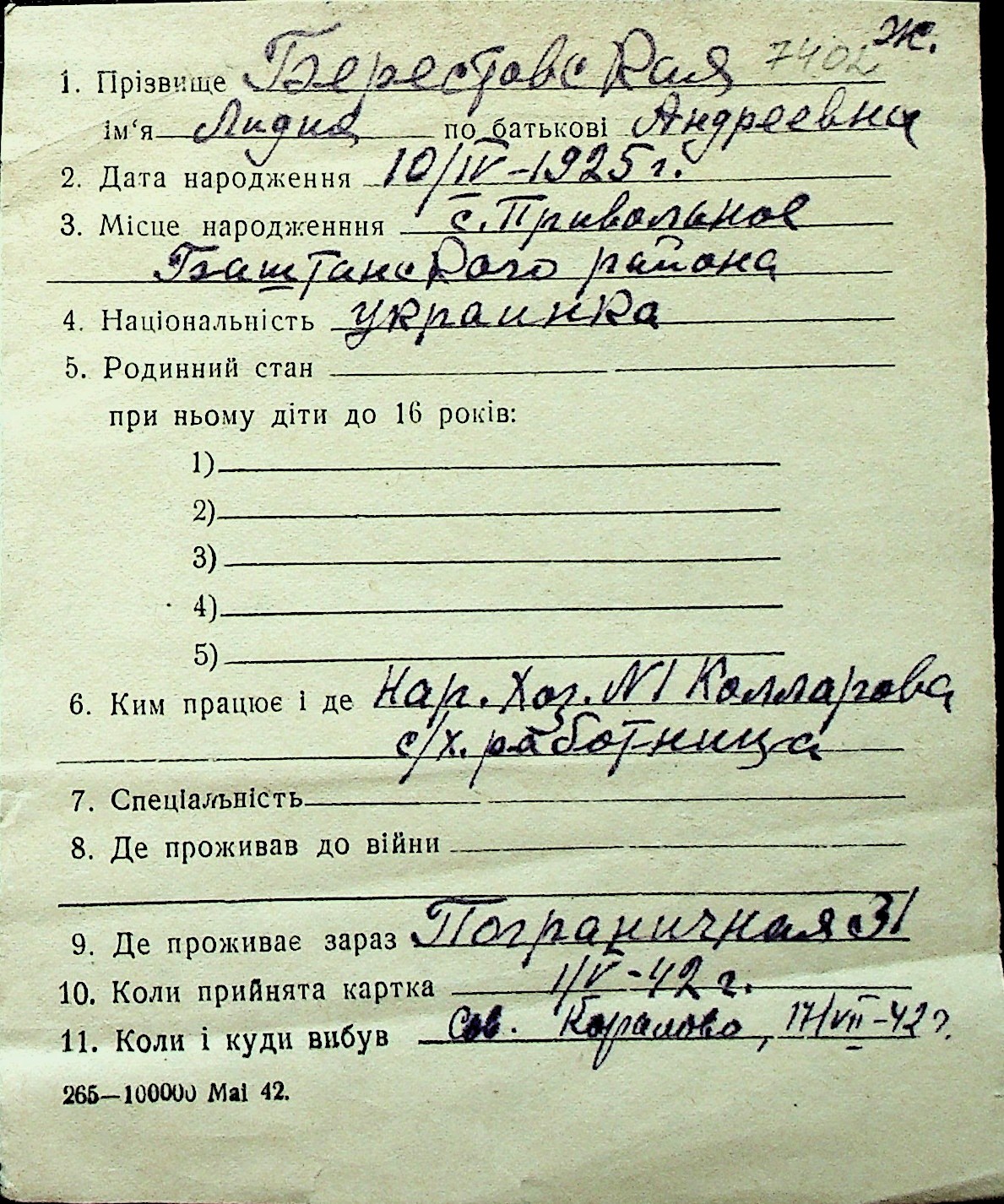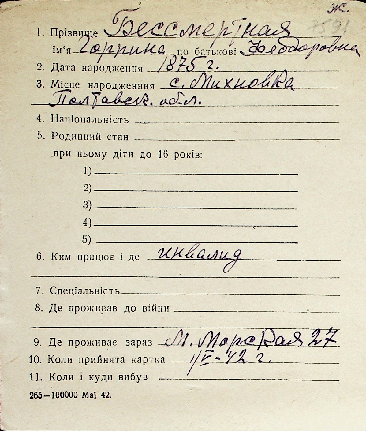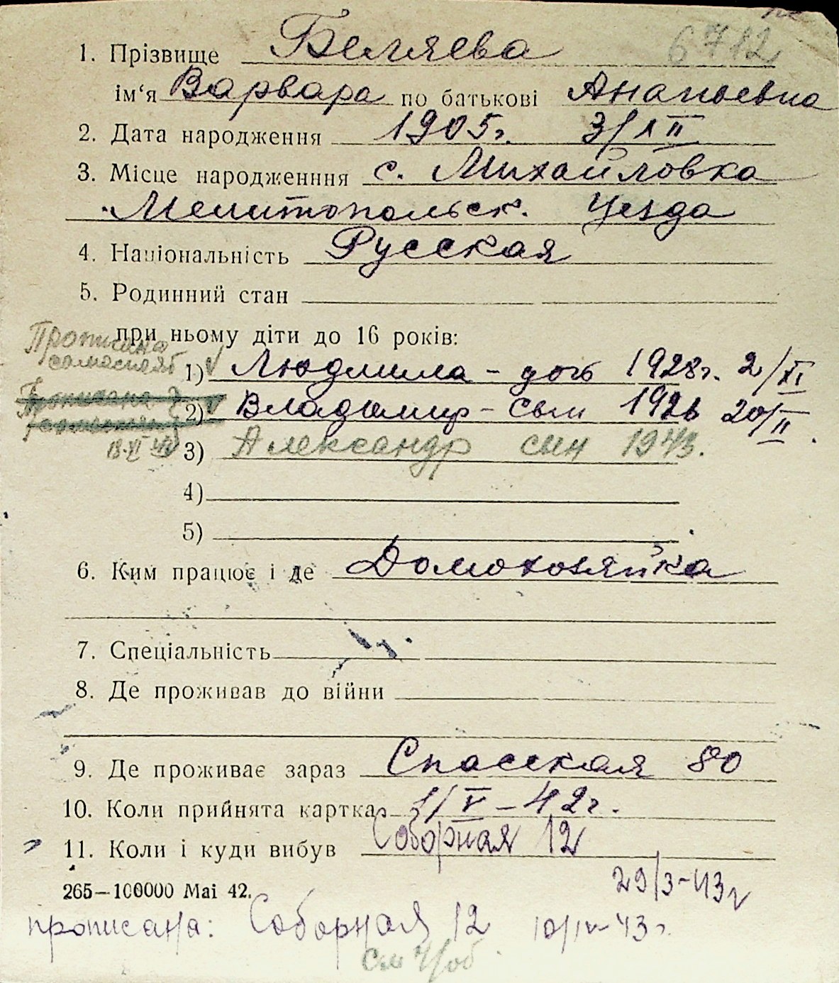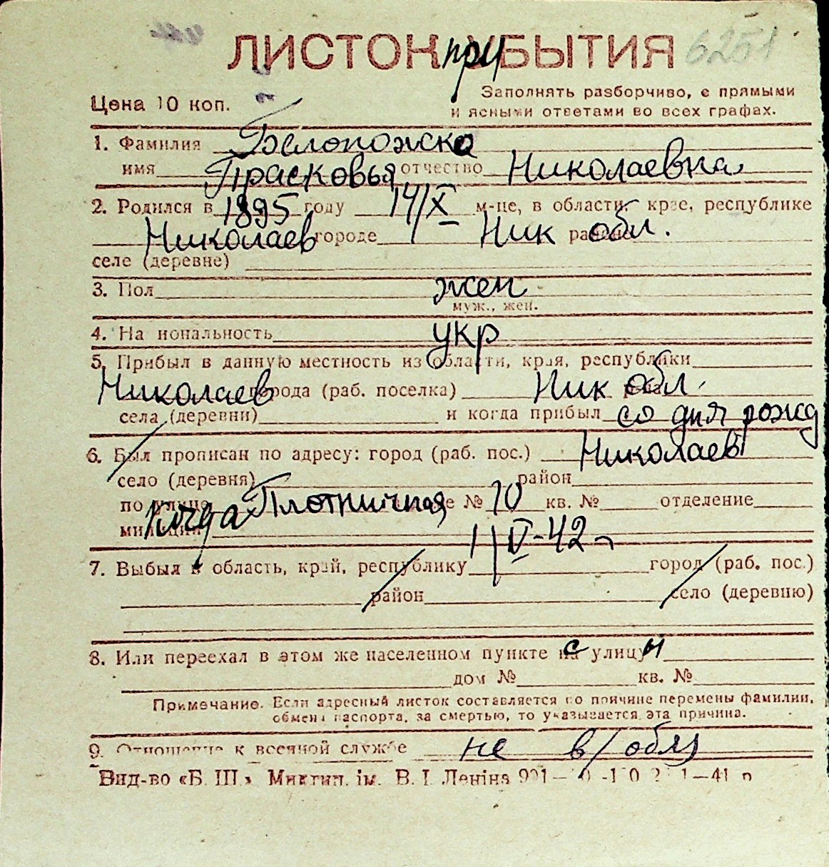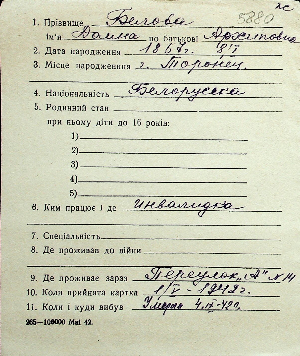 ◦ ◦ Перелік карток на осіб, які мешкали у м. Миколаїв у період окупації 1941–1944 років