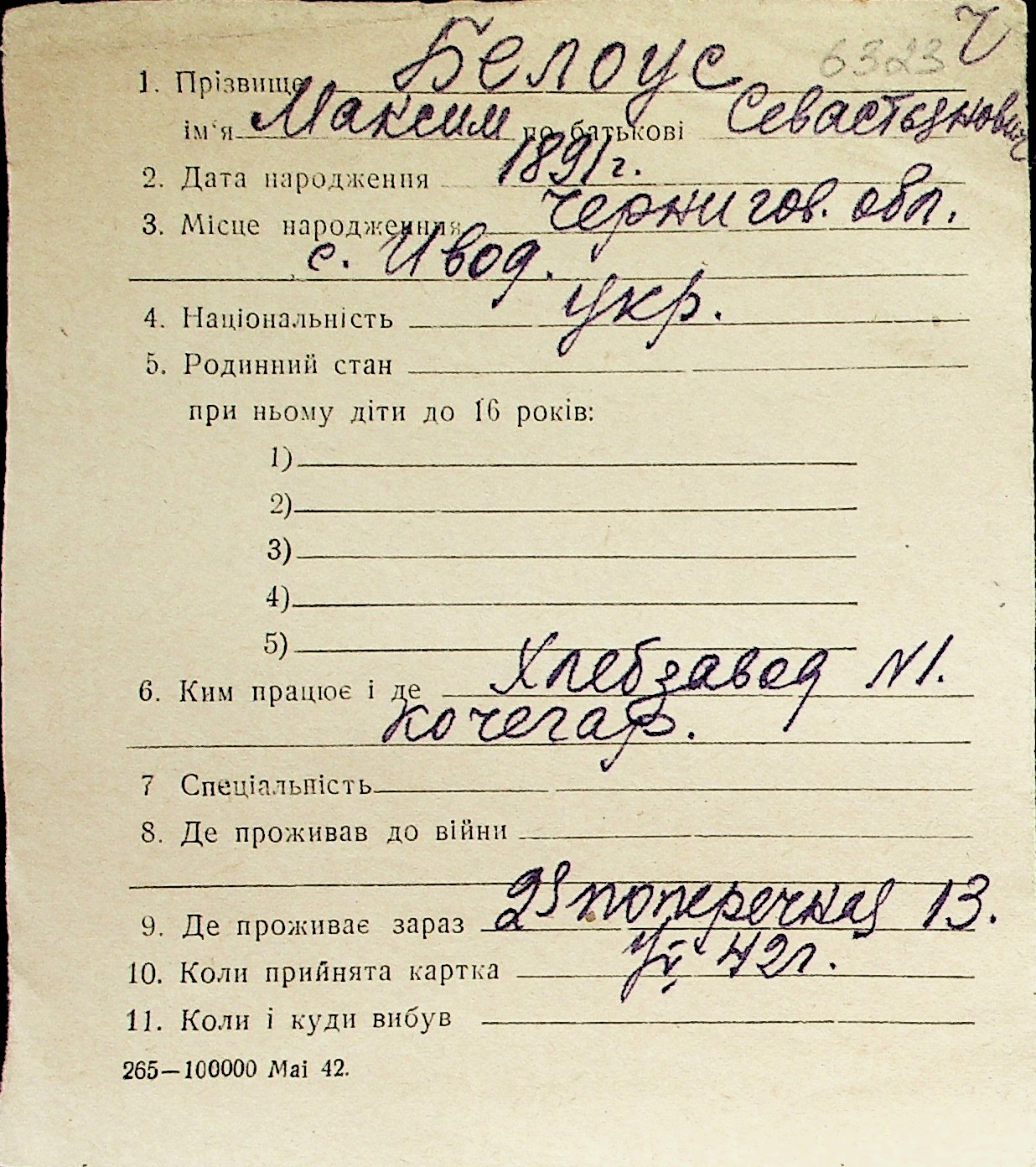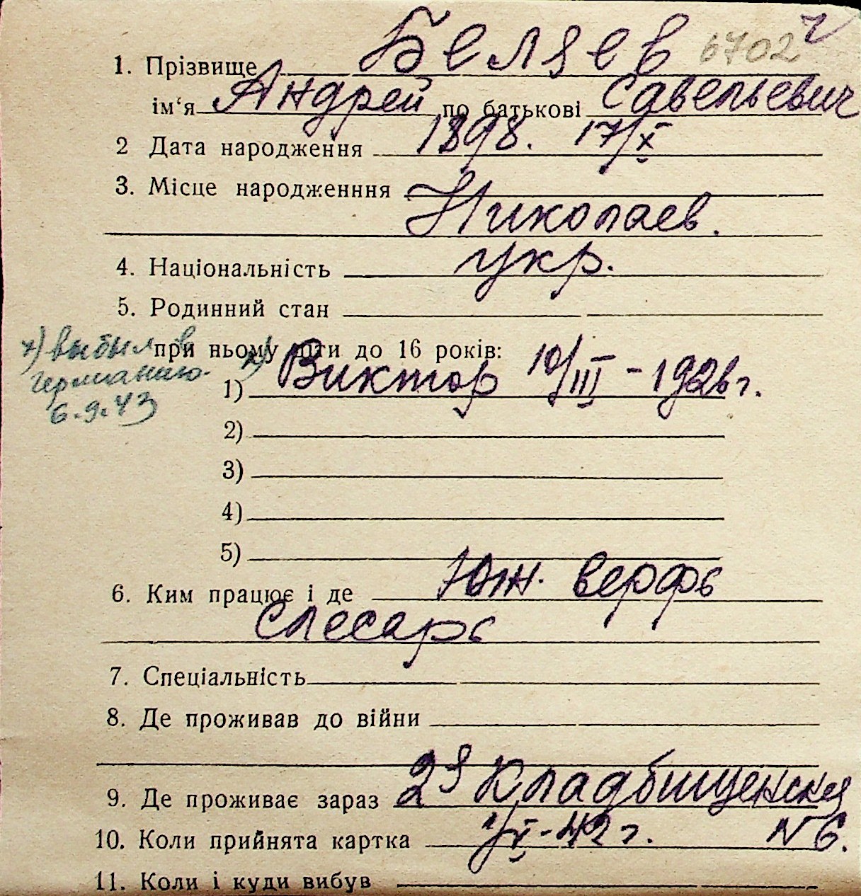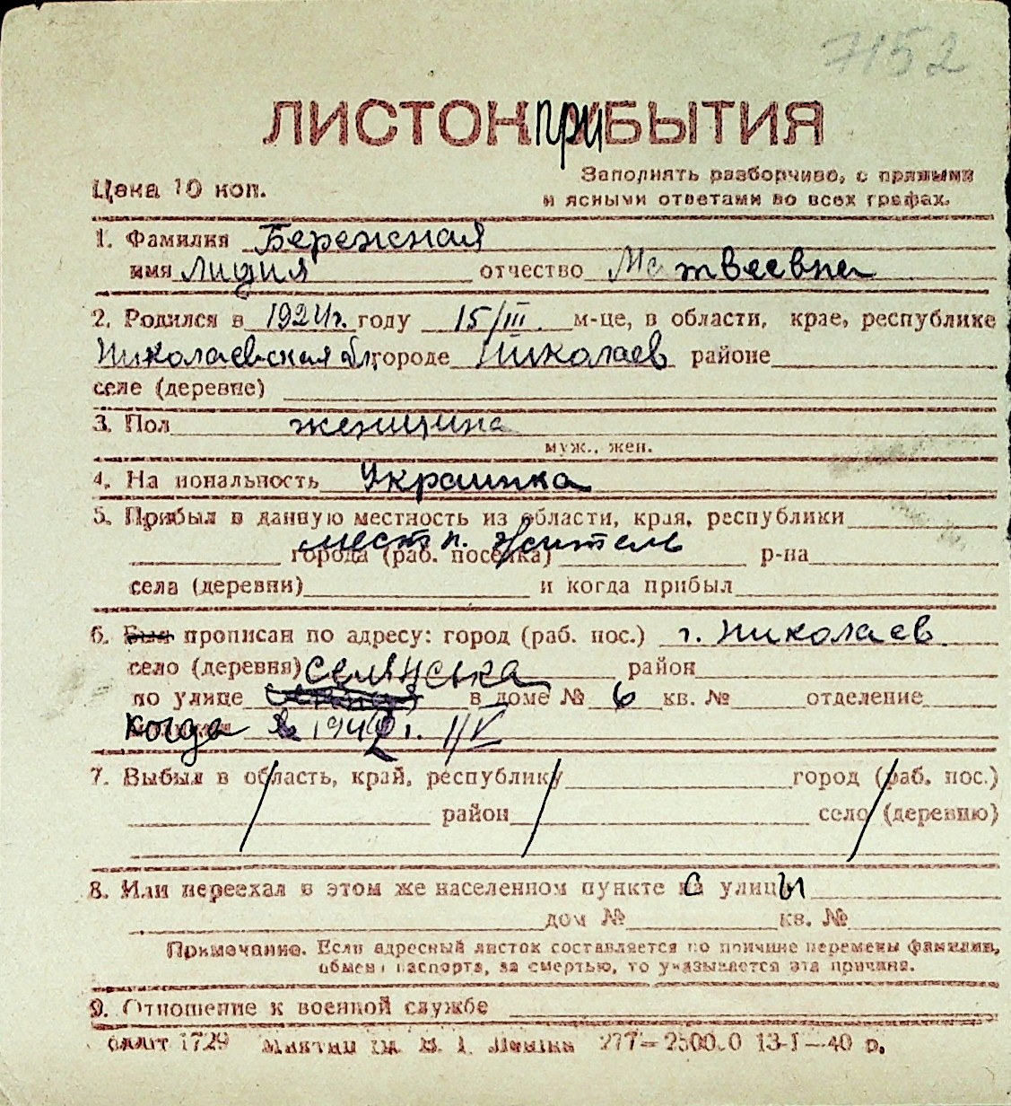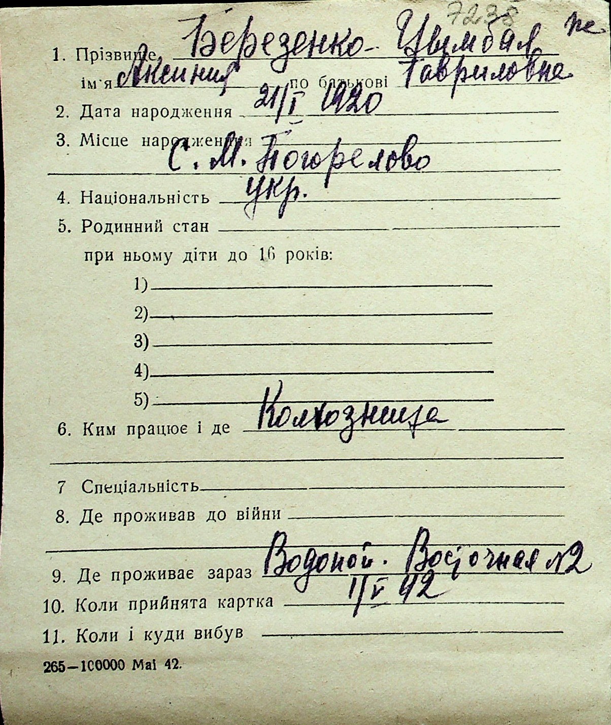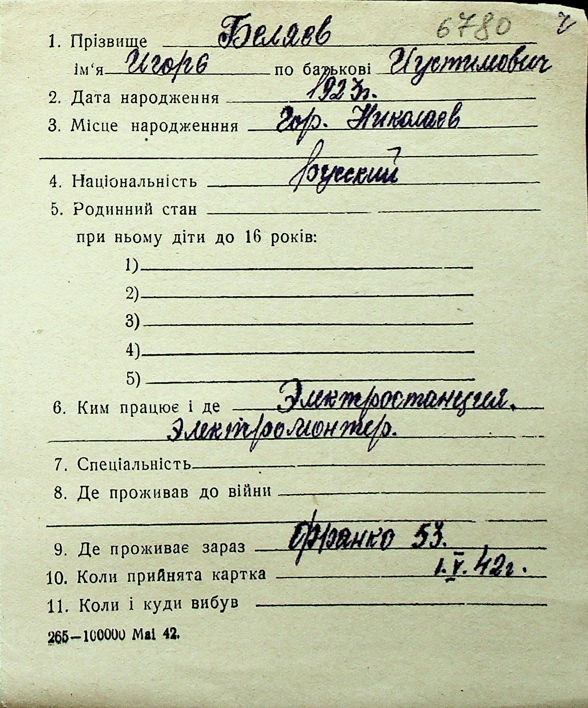◦ ◦ Перелік карток на осіб, які мешкали у м. Миколаїв у період окупації 1941–1944 років
