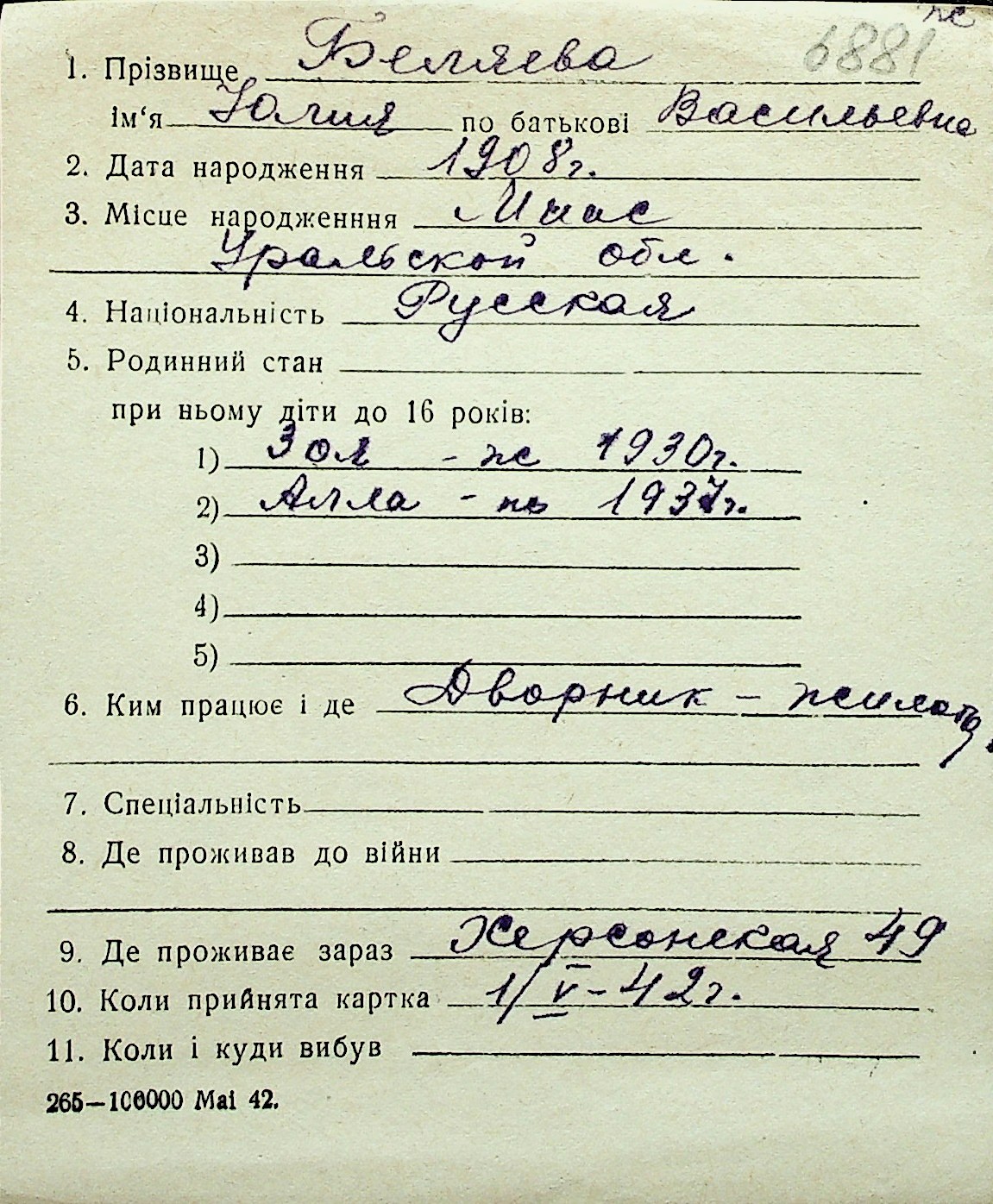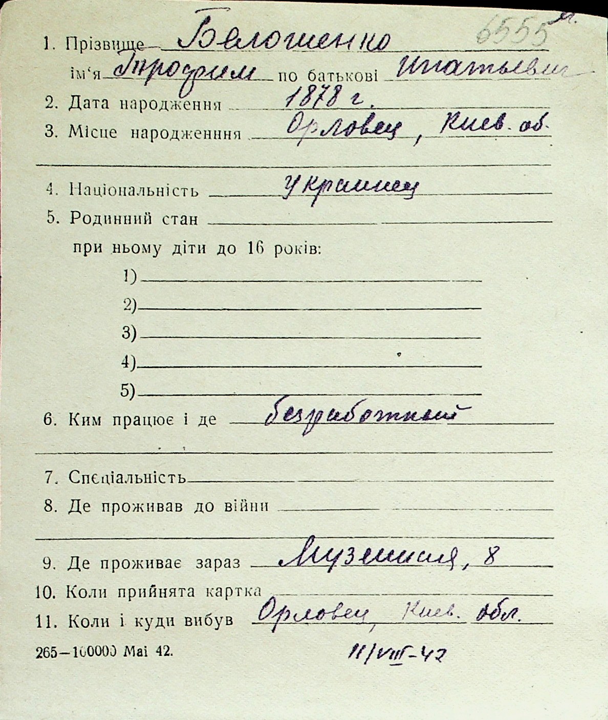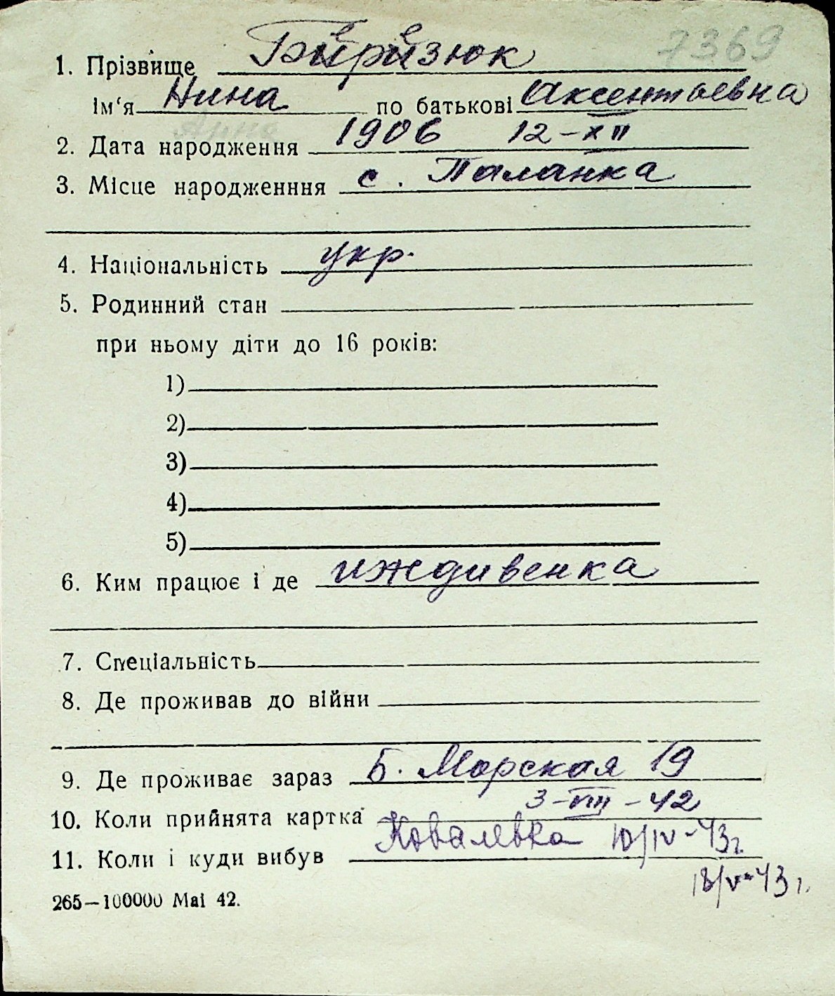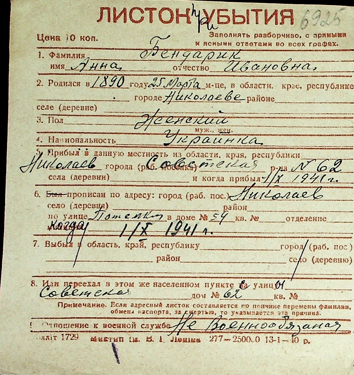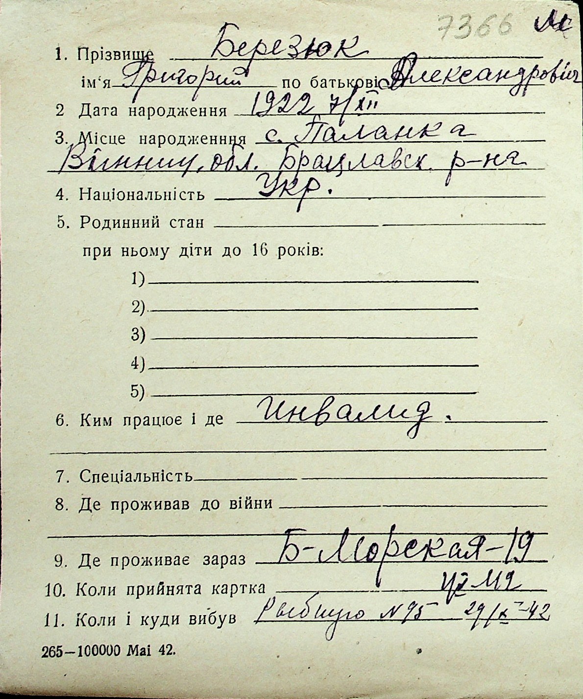 ◦ ◦ Перелік карток на осіб, які мешкали у м. Миколаїв у період окупації 1941–1944 років