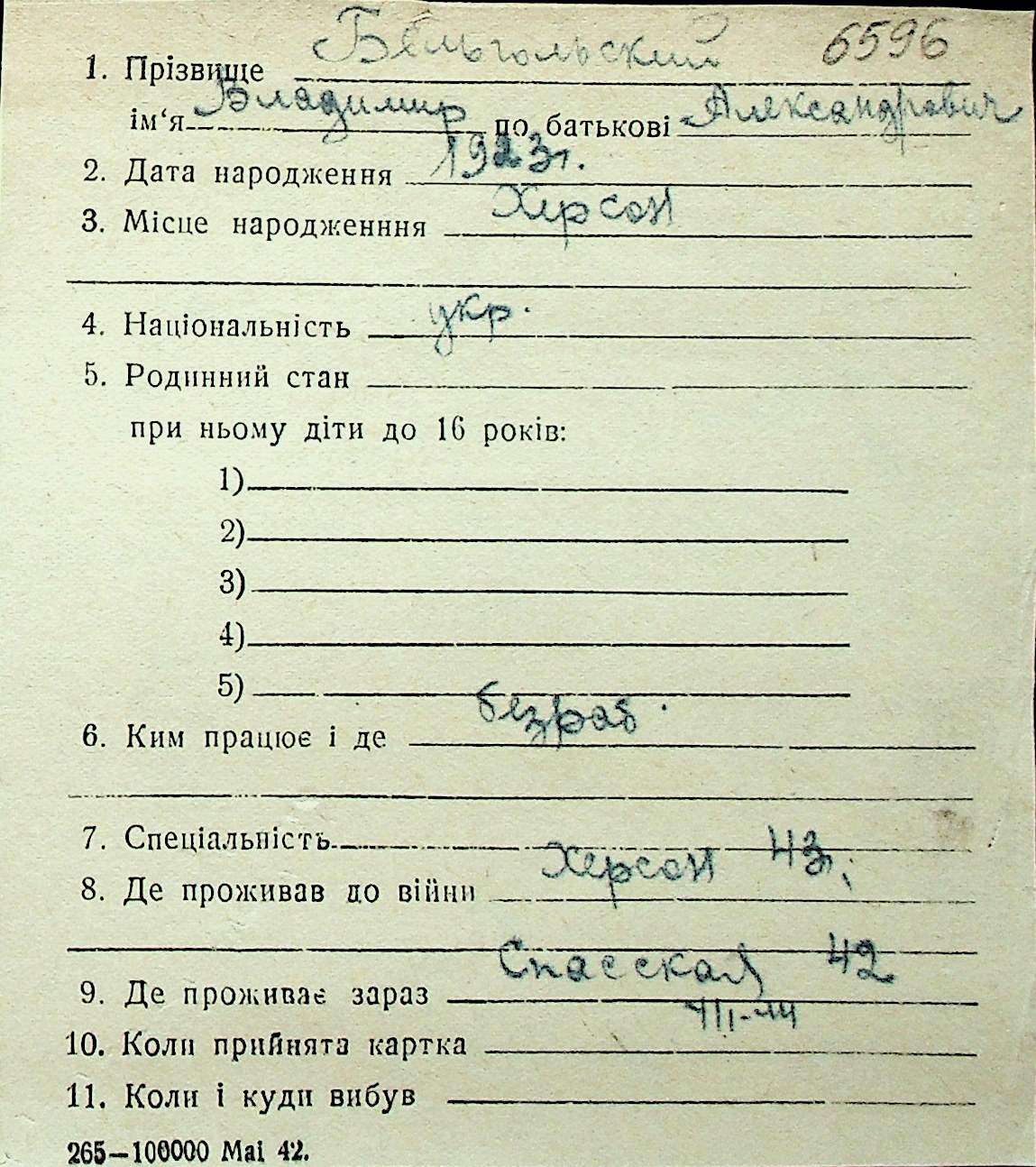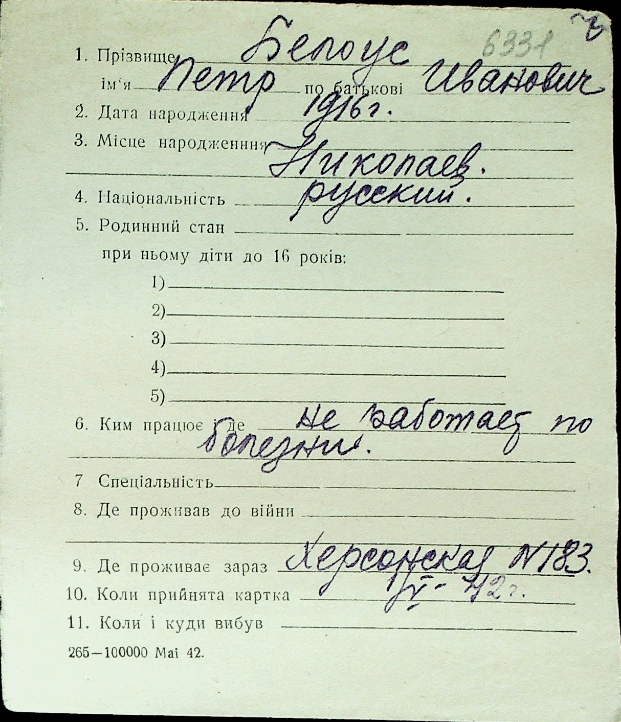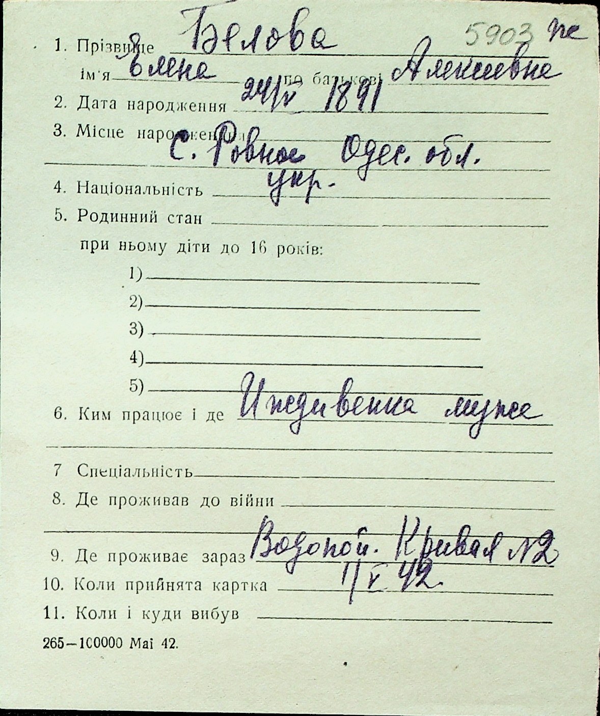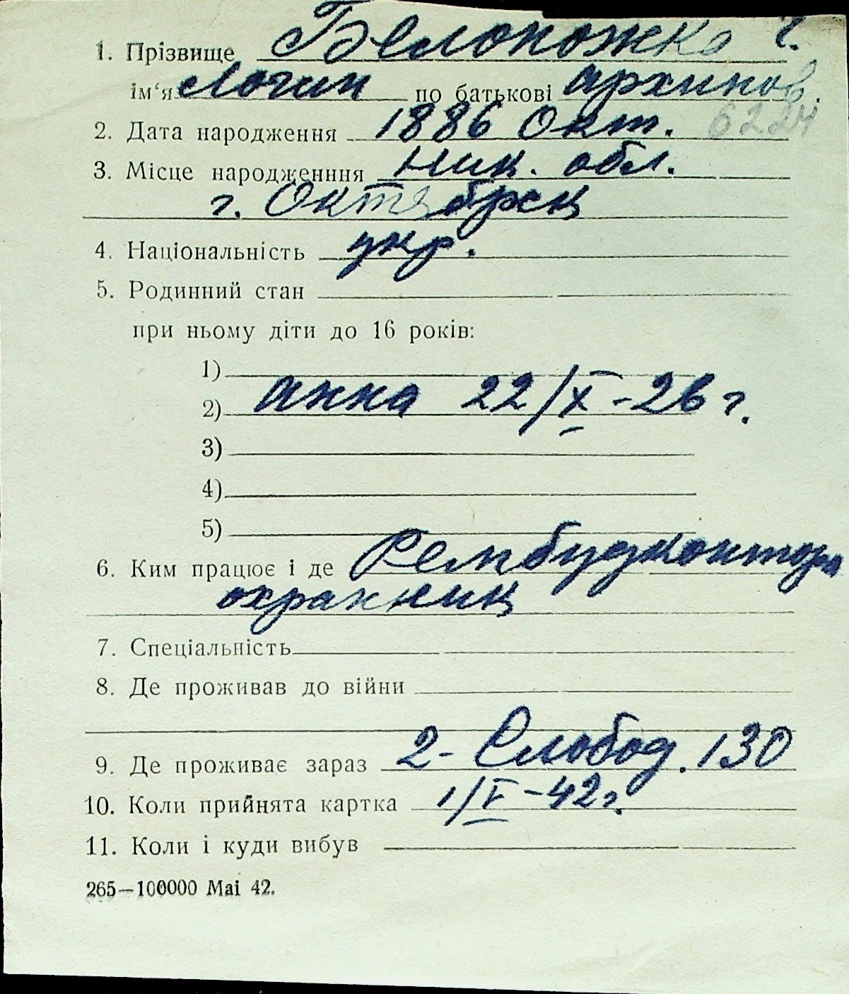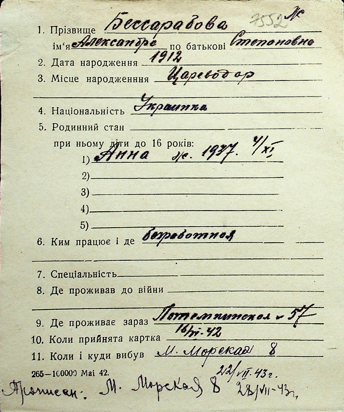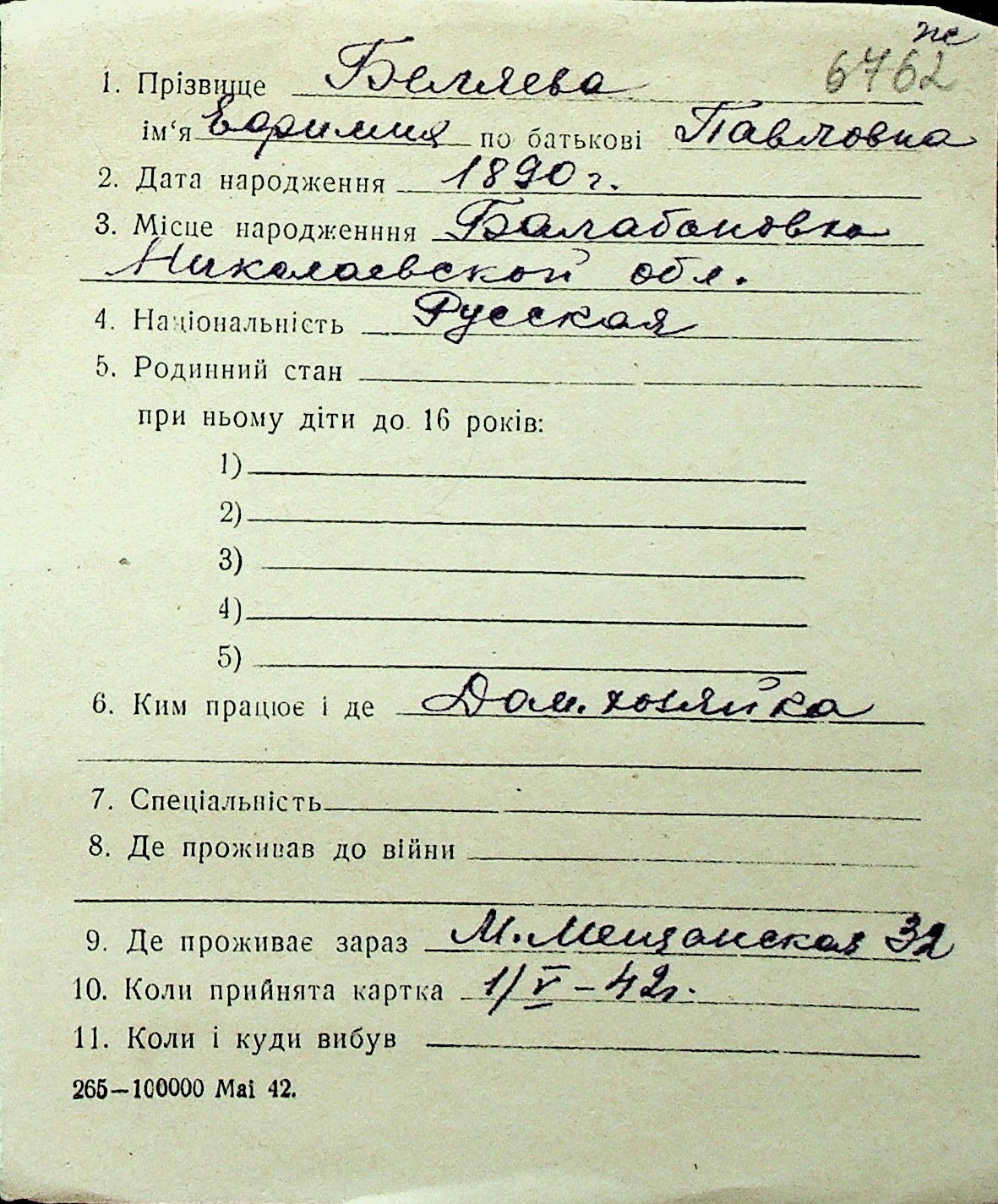◦ ◦ Перелік карток на осіб, які мешкали у м. Миколаїв у період окупації 1941–1944 років