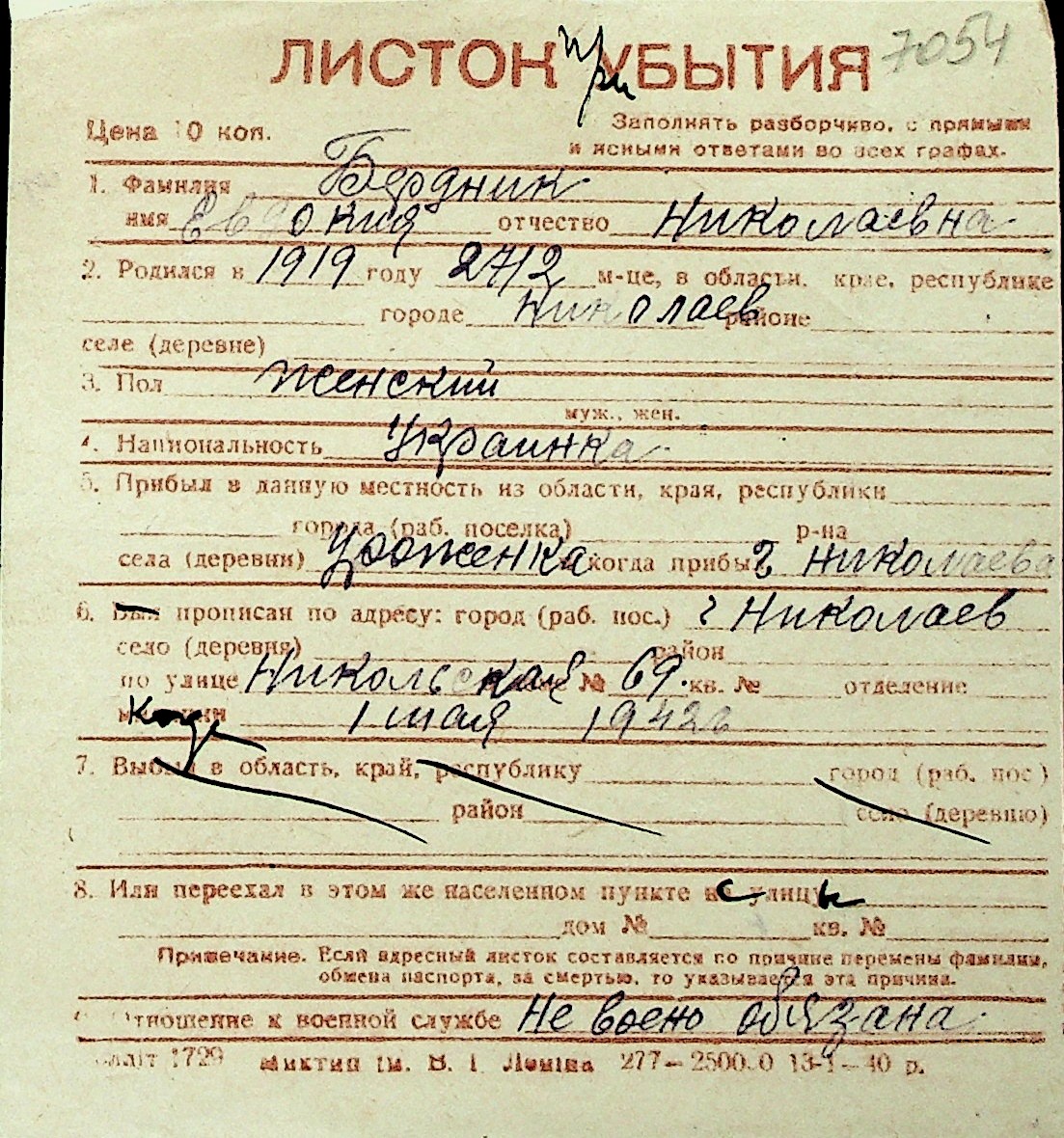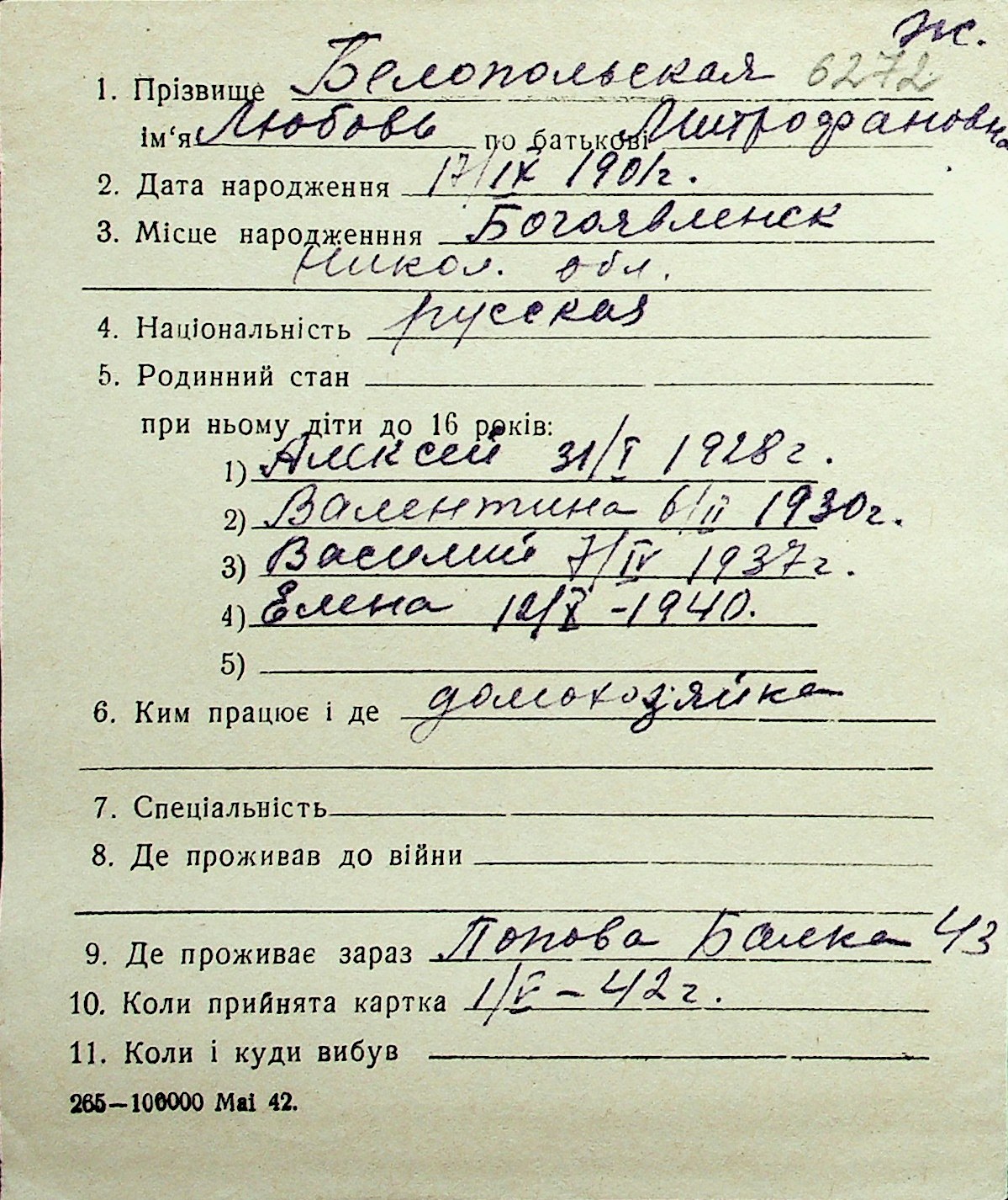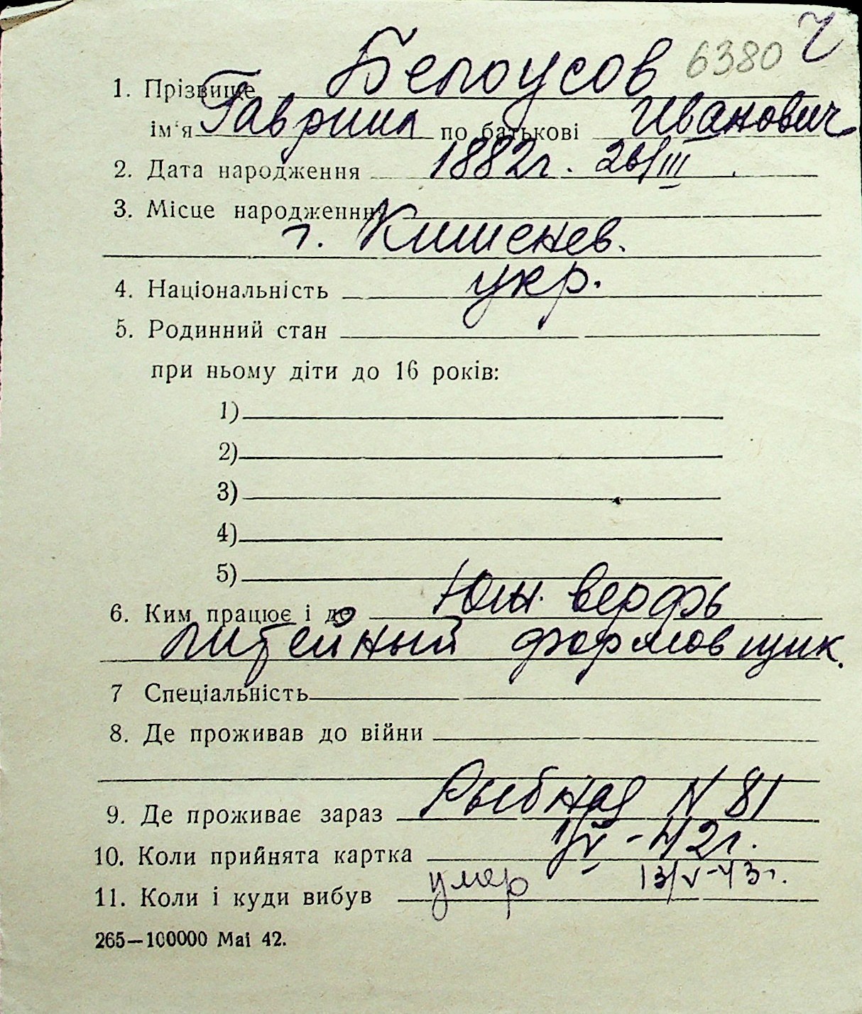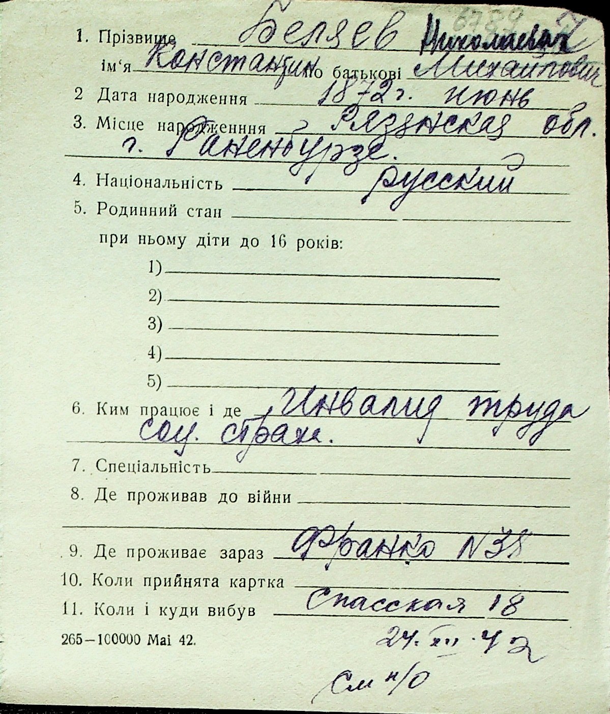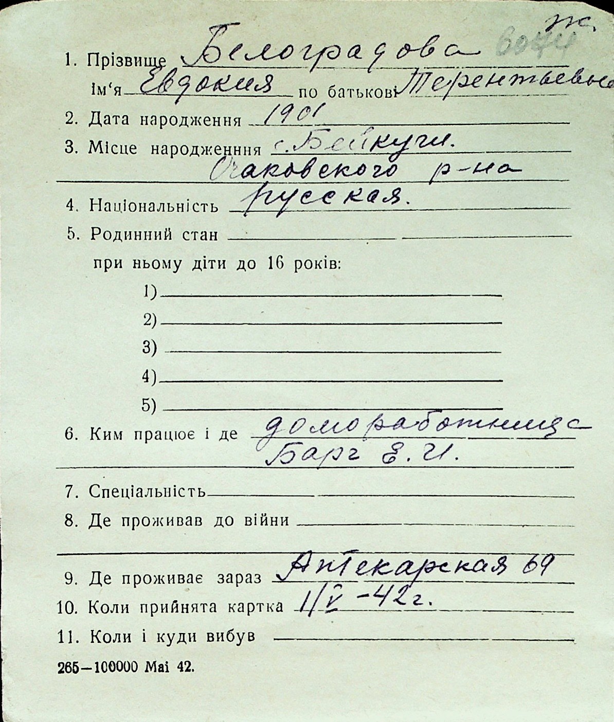 ◦ ◦ Перелік карток на осіб, які мешкали у м. Миколаїв у період окупації 1941–1944 років