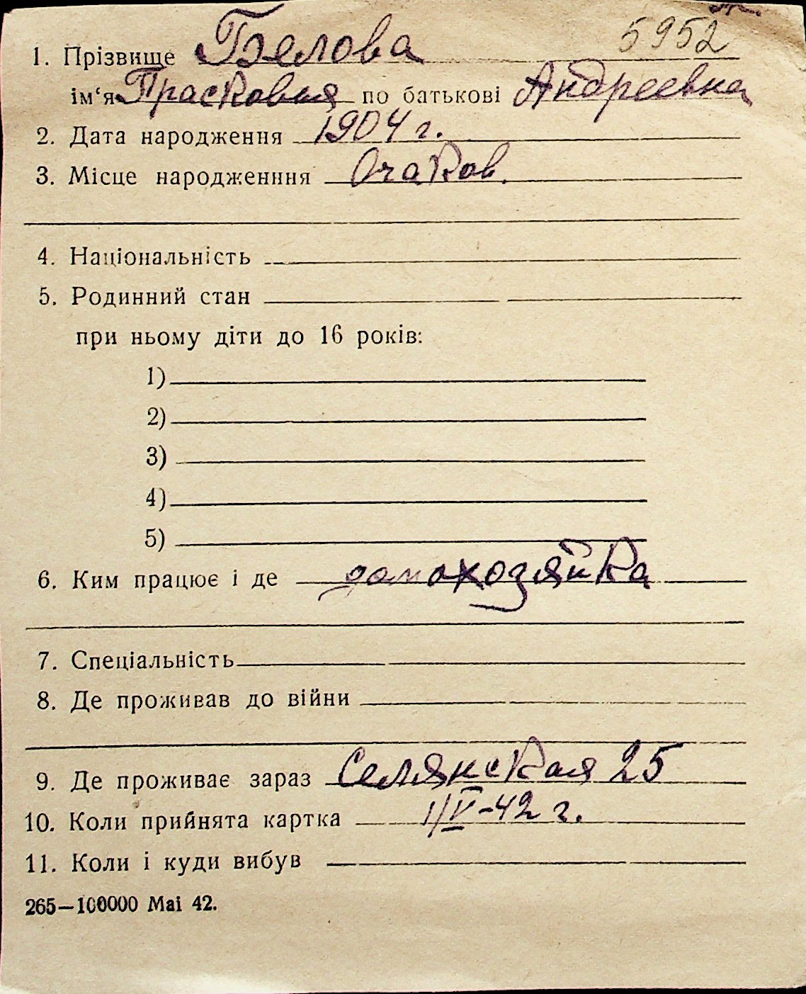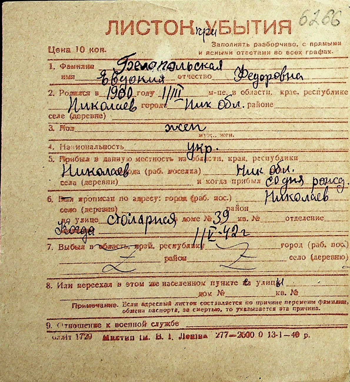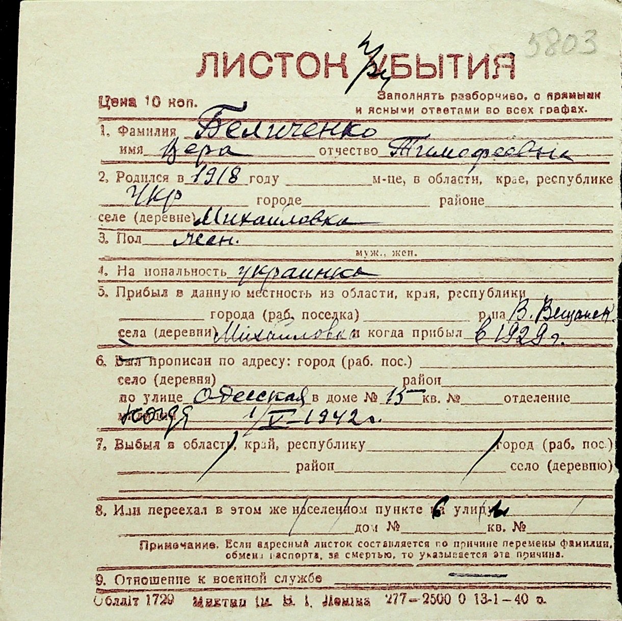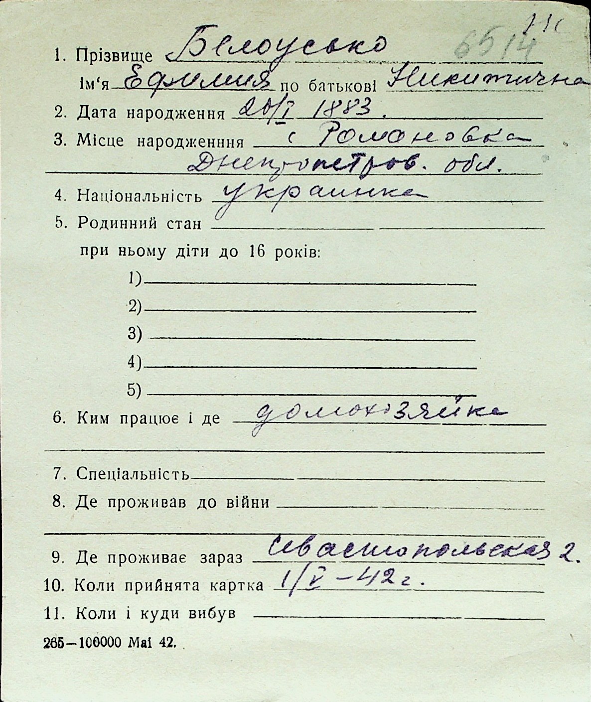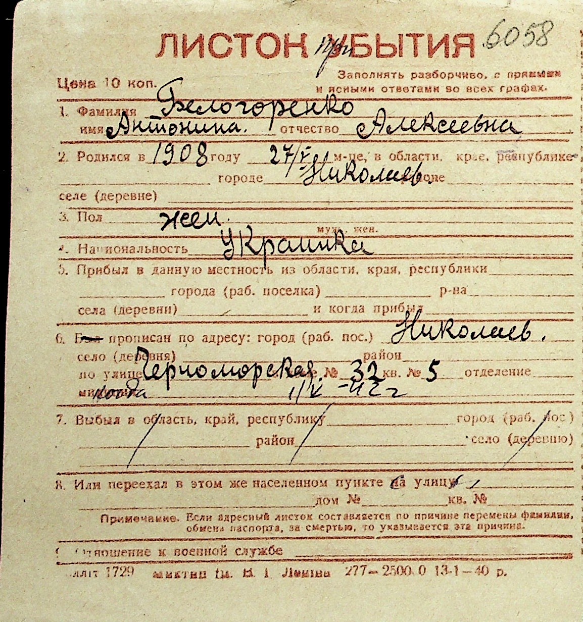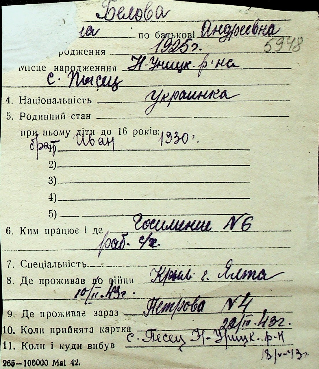 ◦ ◦ Перелік карток на осіб, які мешкали у м. Миколаїв у період окупації 1941–1944 років
