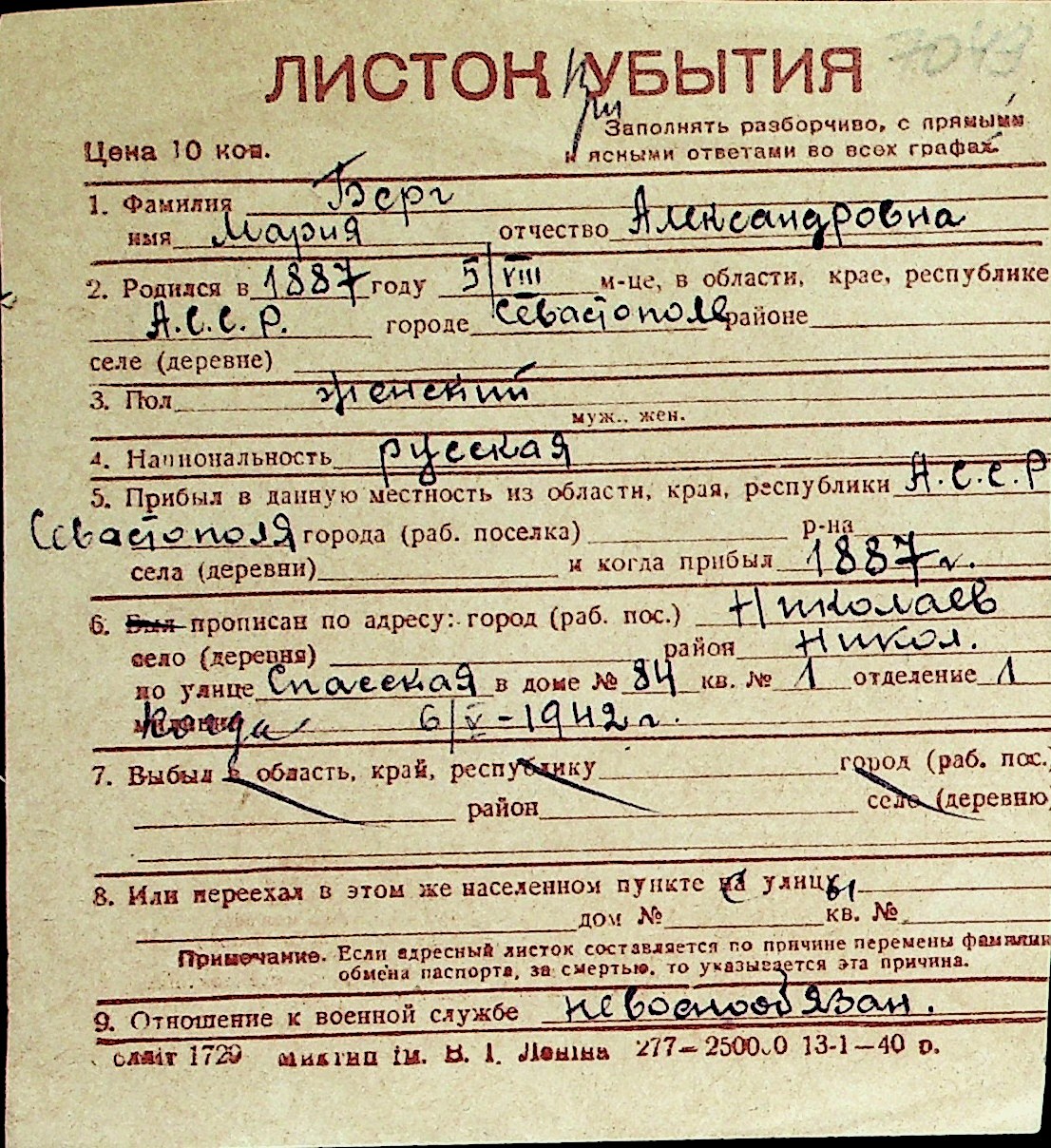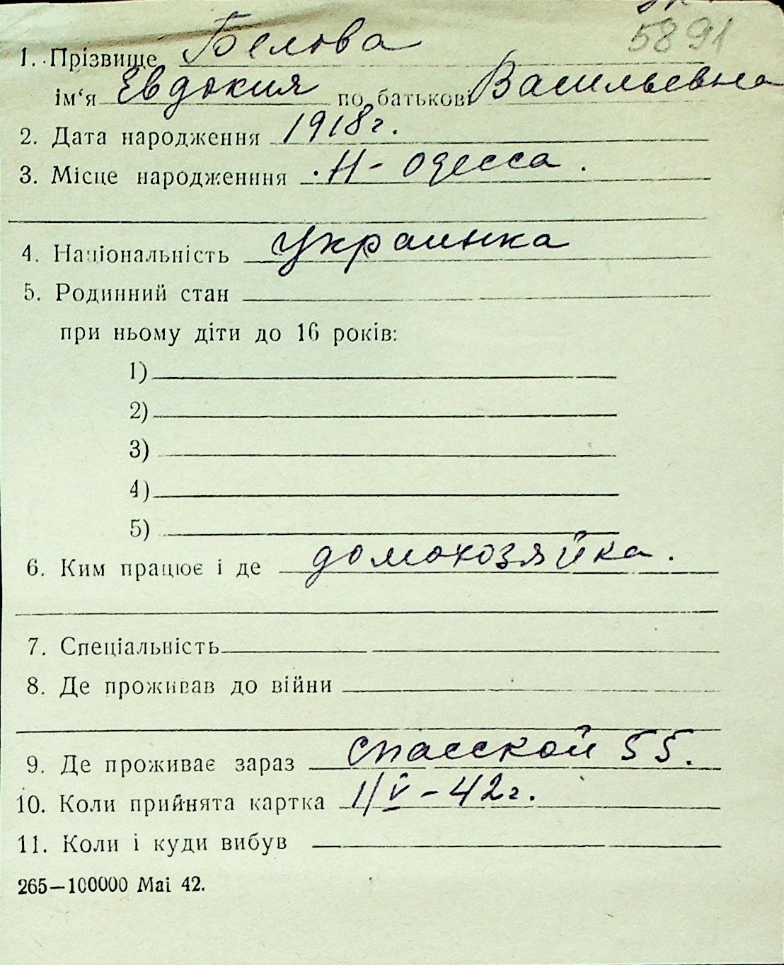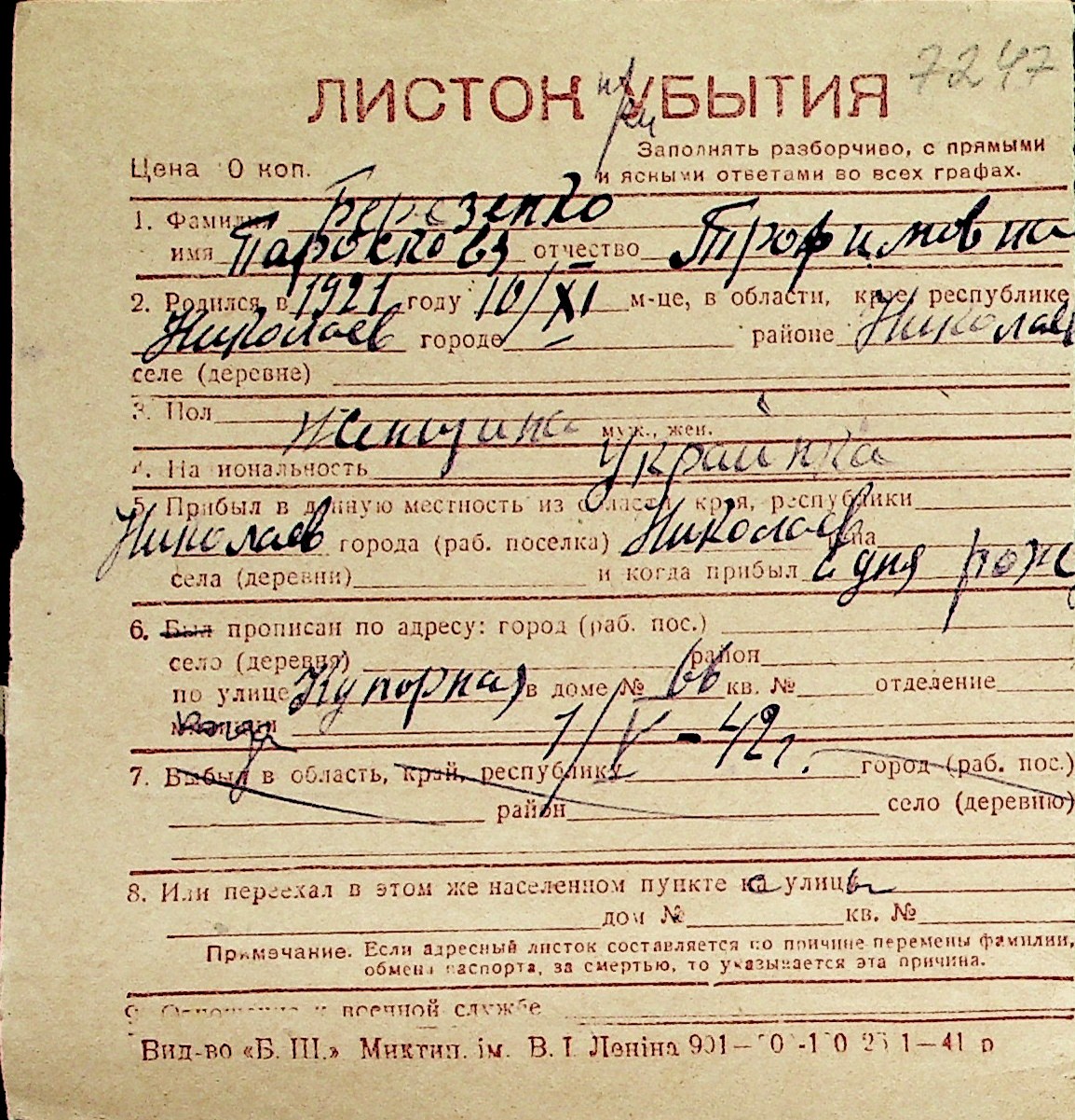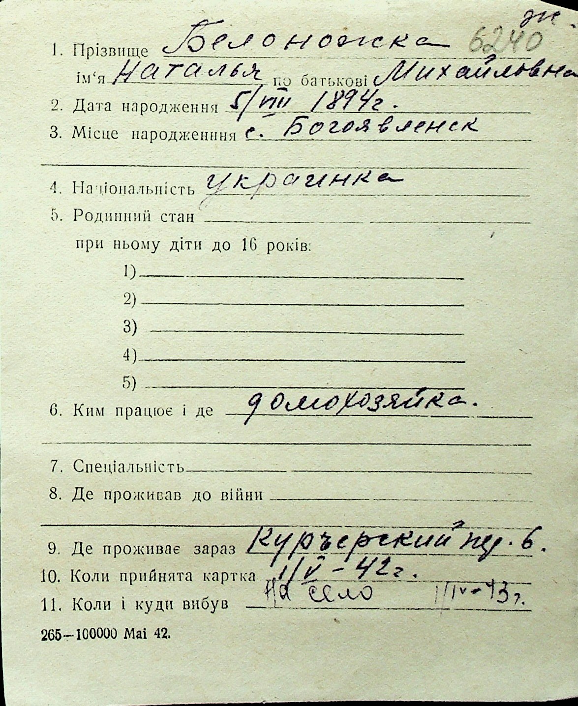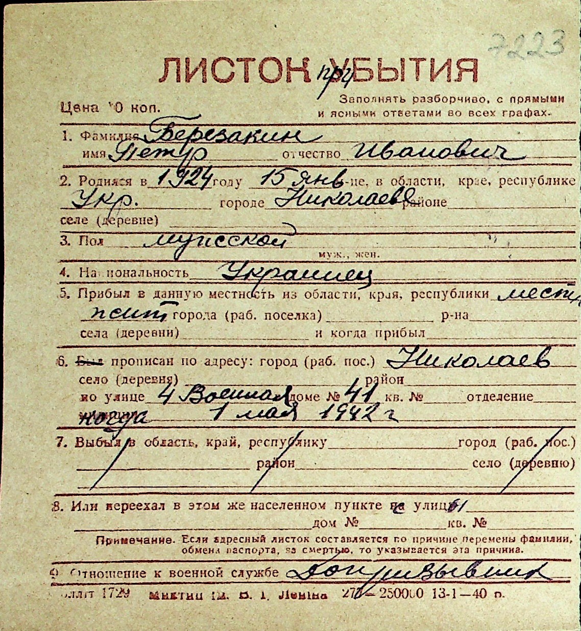 ◦ ◦ Перелік карток на осіб, які мешкали у м. Миколаїв у період окупації 1941–1944 років