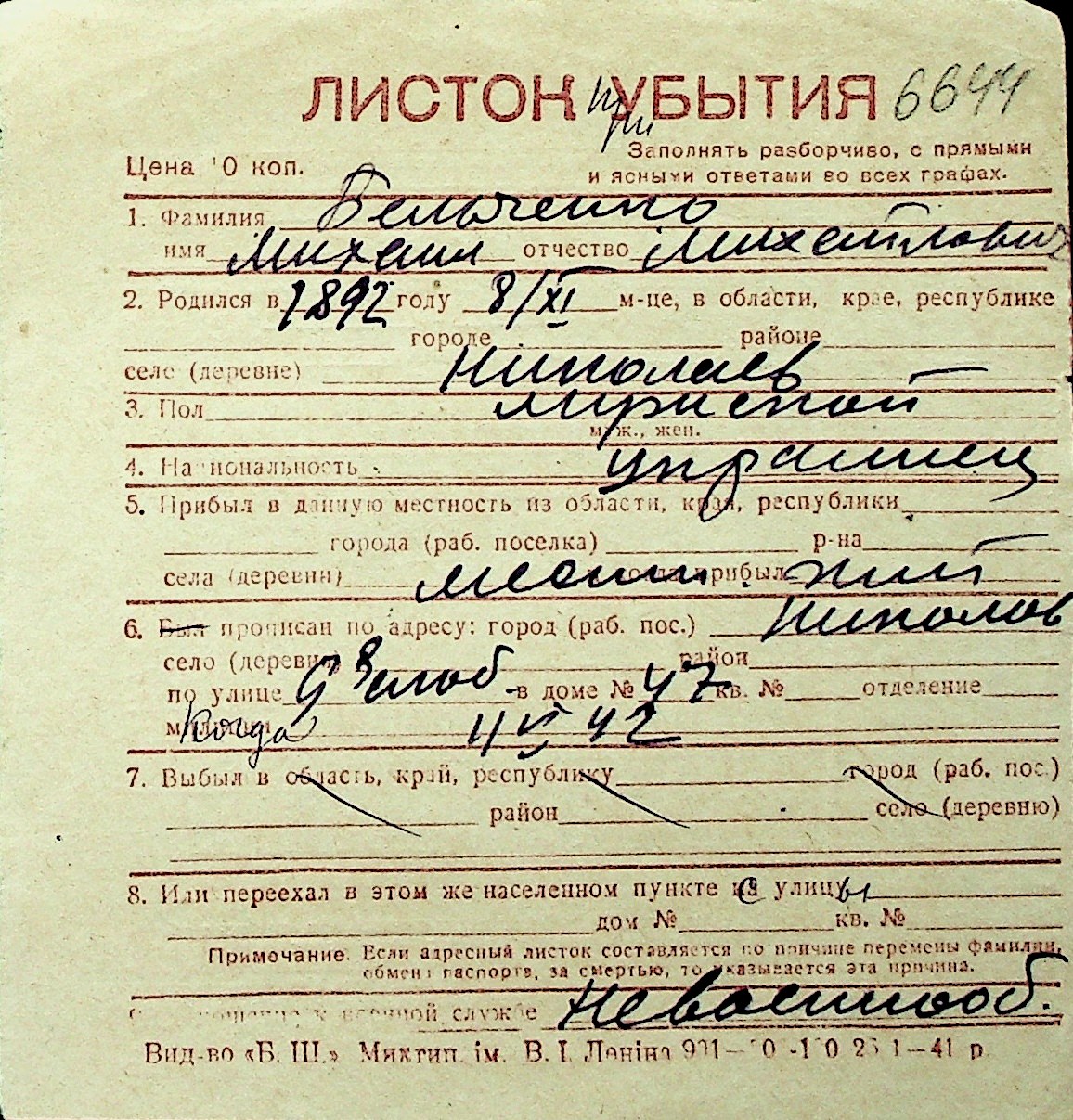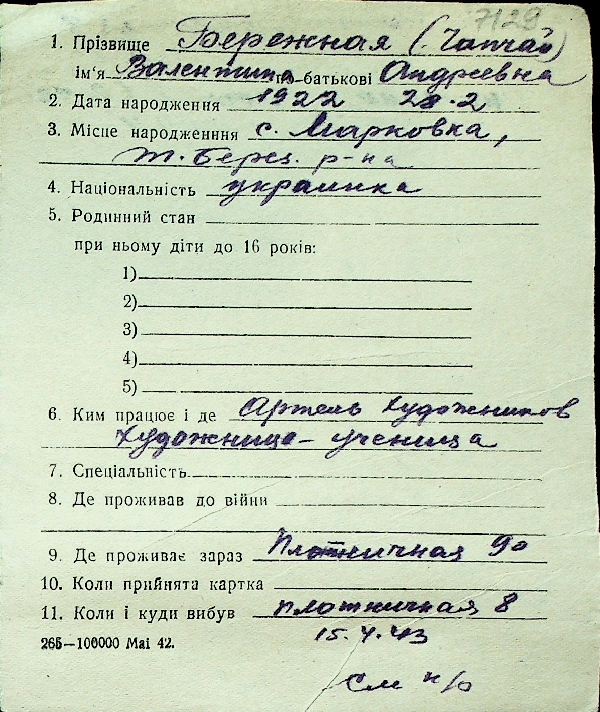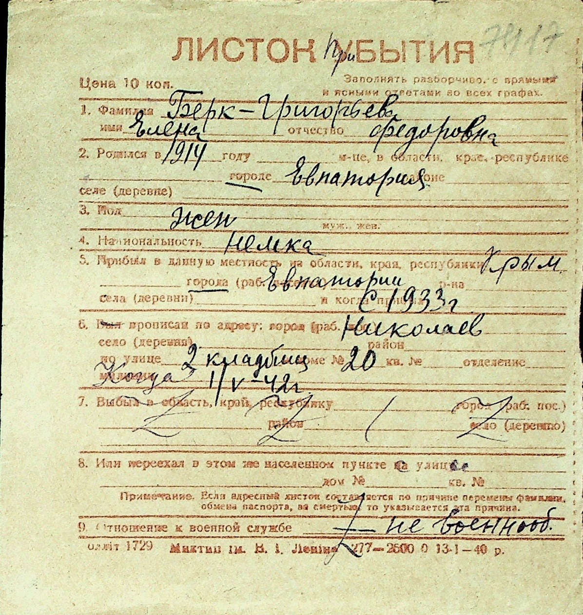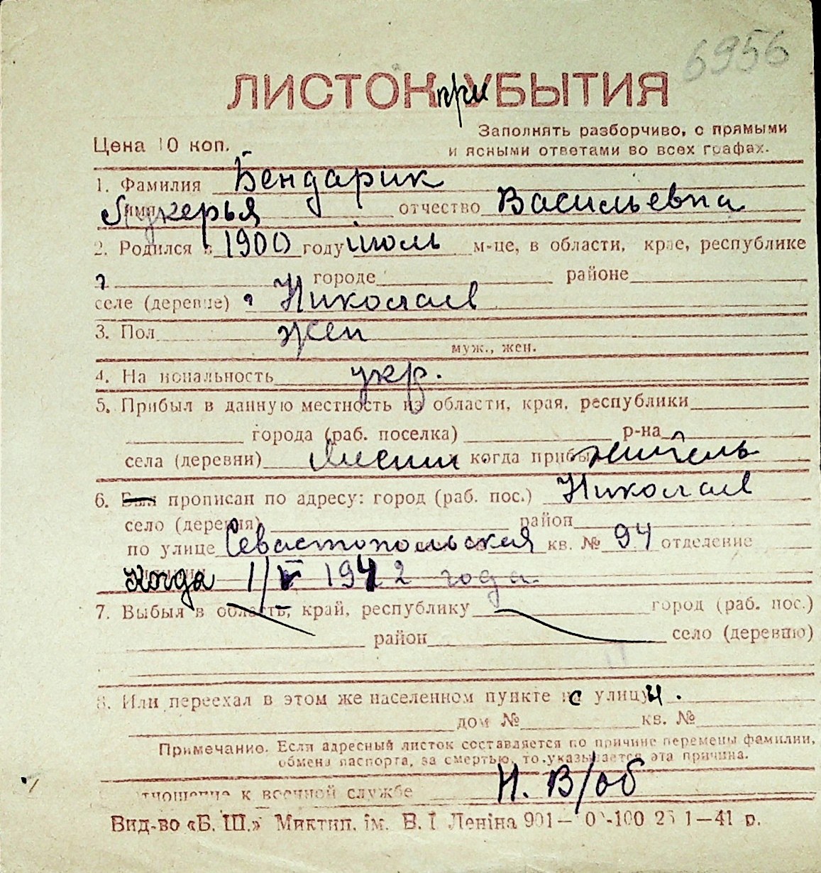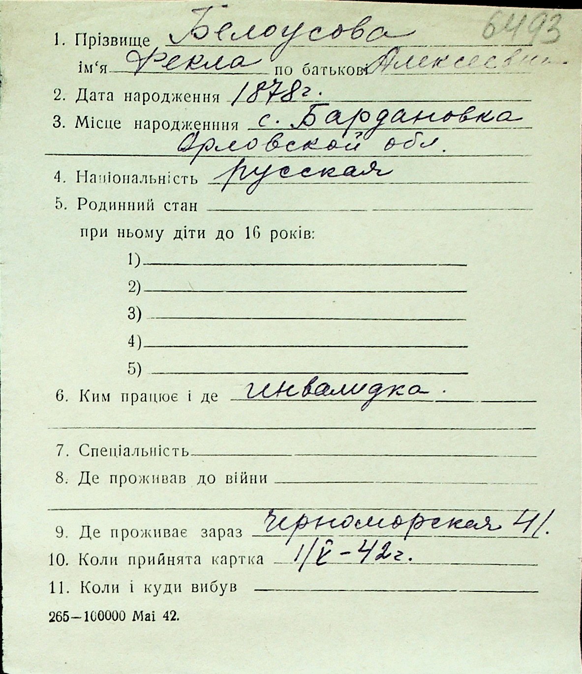 ◦ ◦ Перелік карток на осіб, які мешкали у м. Миколаїв у період окупації 1941–1944 років