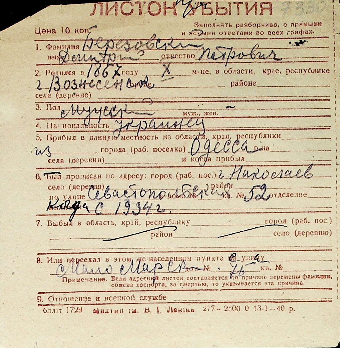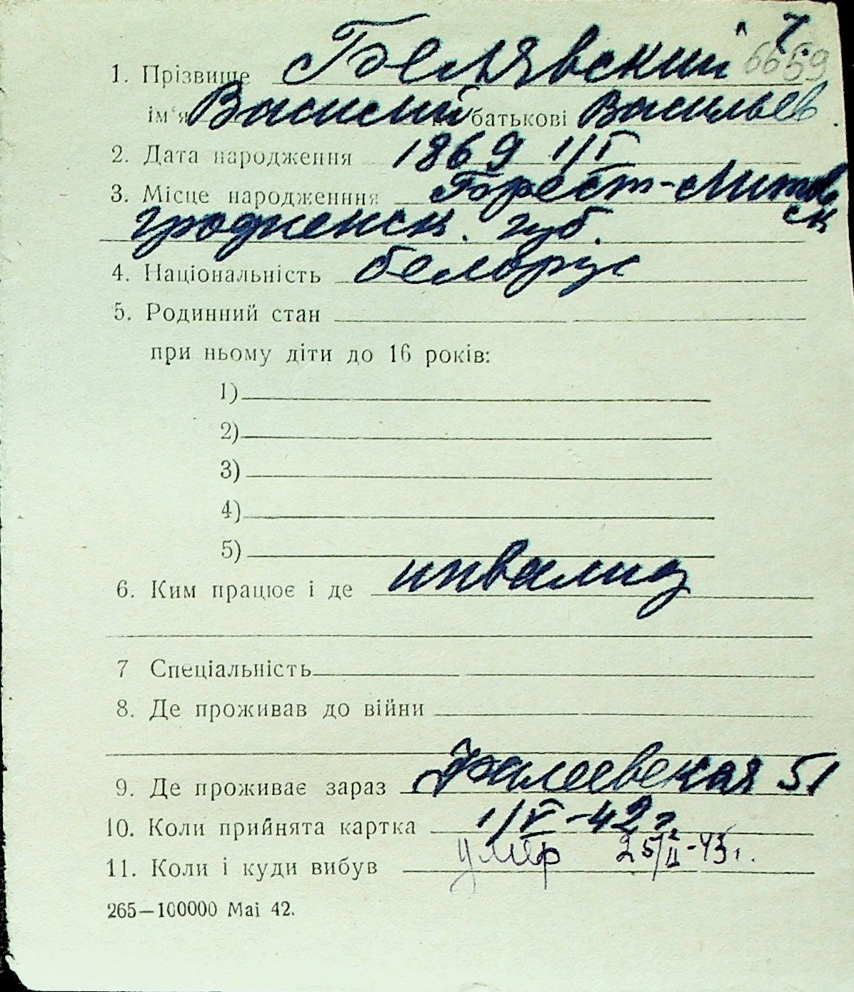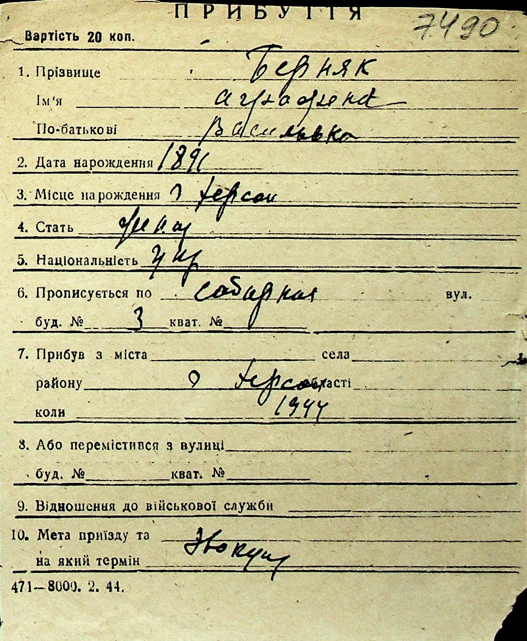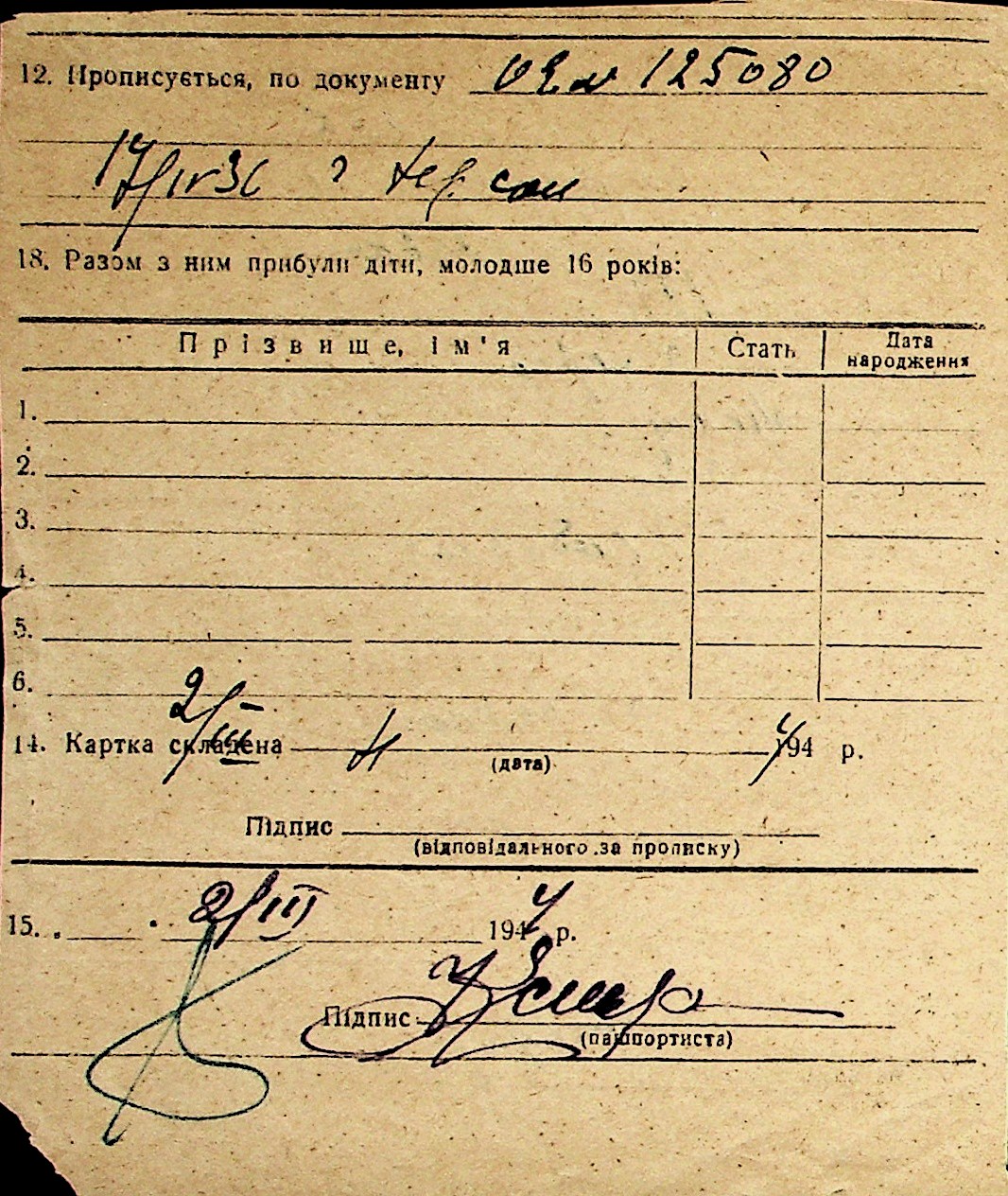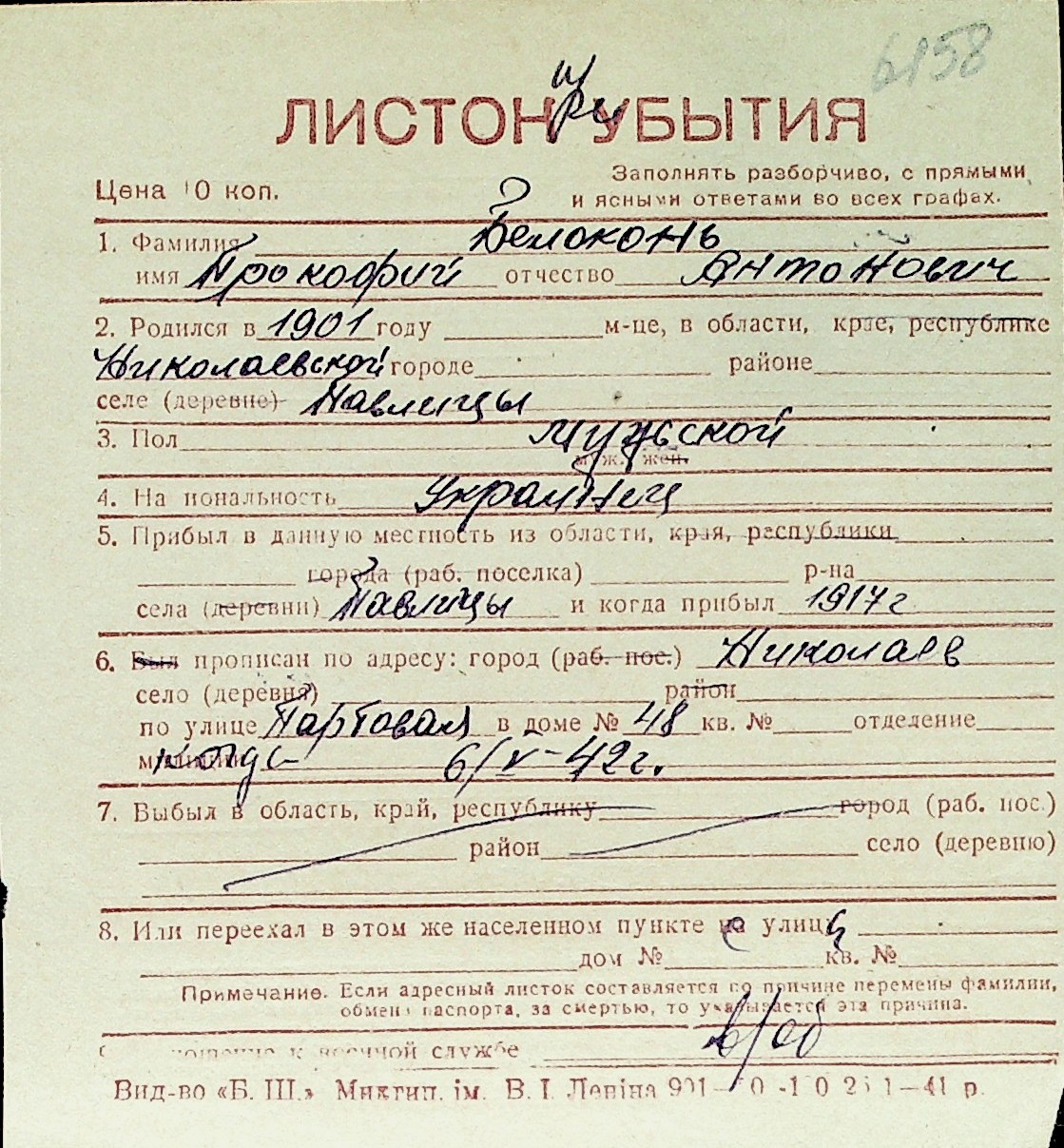 ◦ ◦ Перелік карток на осіб, які мешкали у м. Миколаїв у період окупації 1941–1944 років