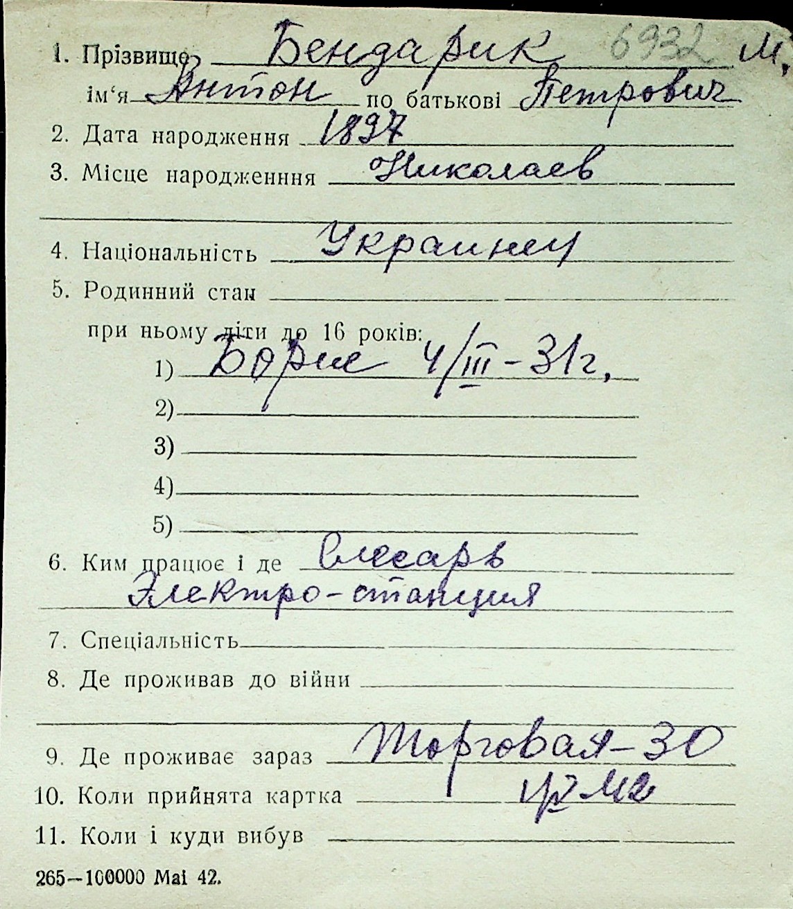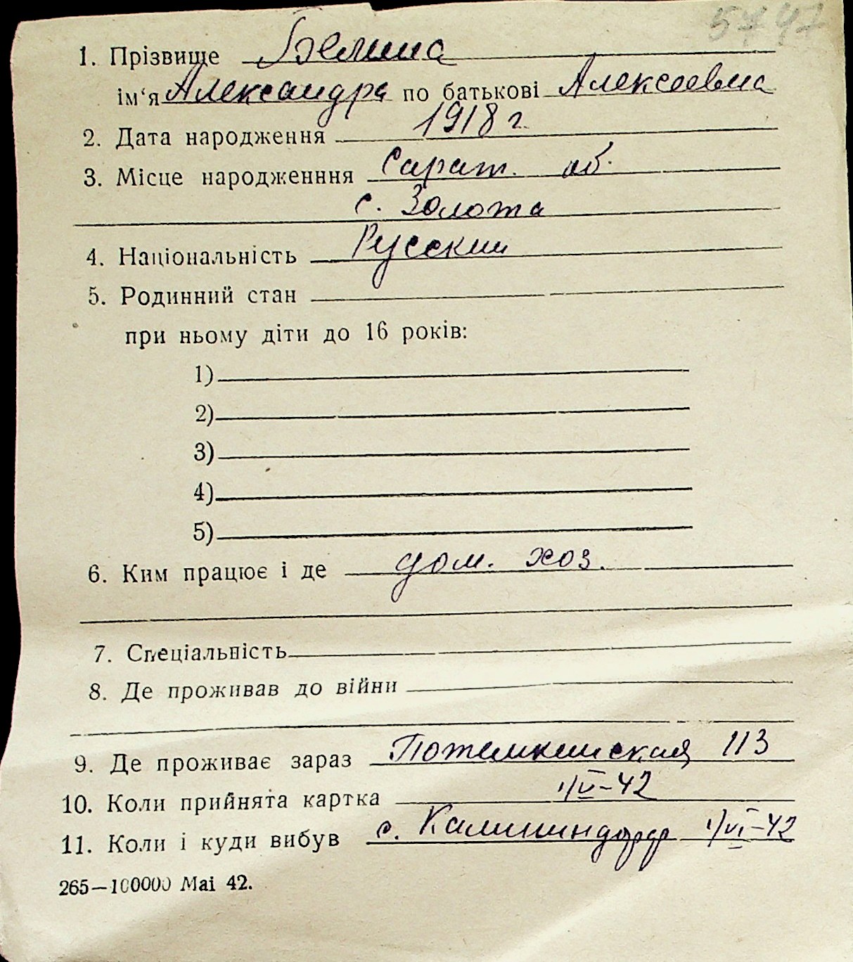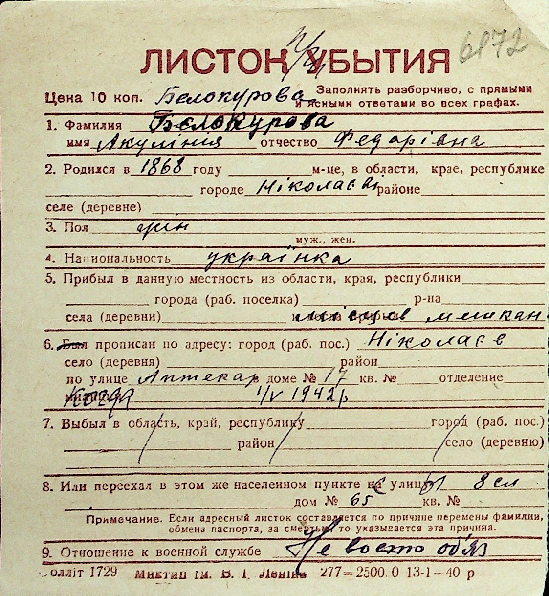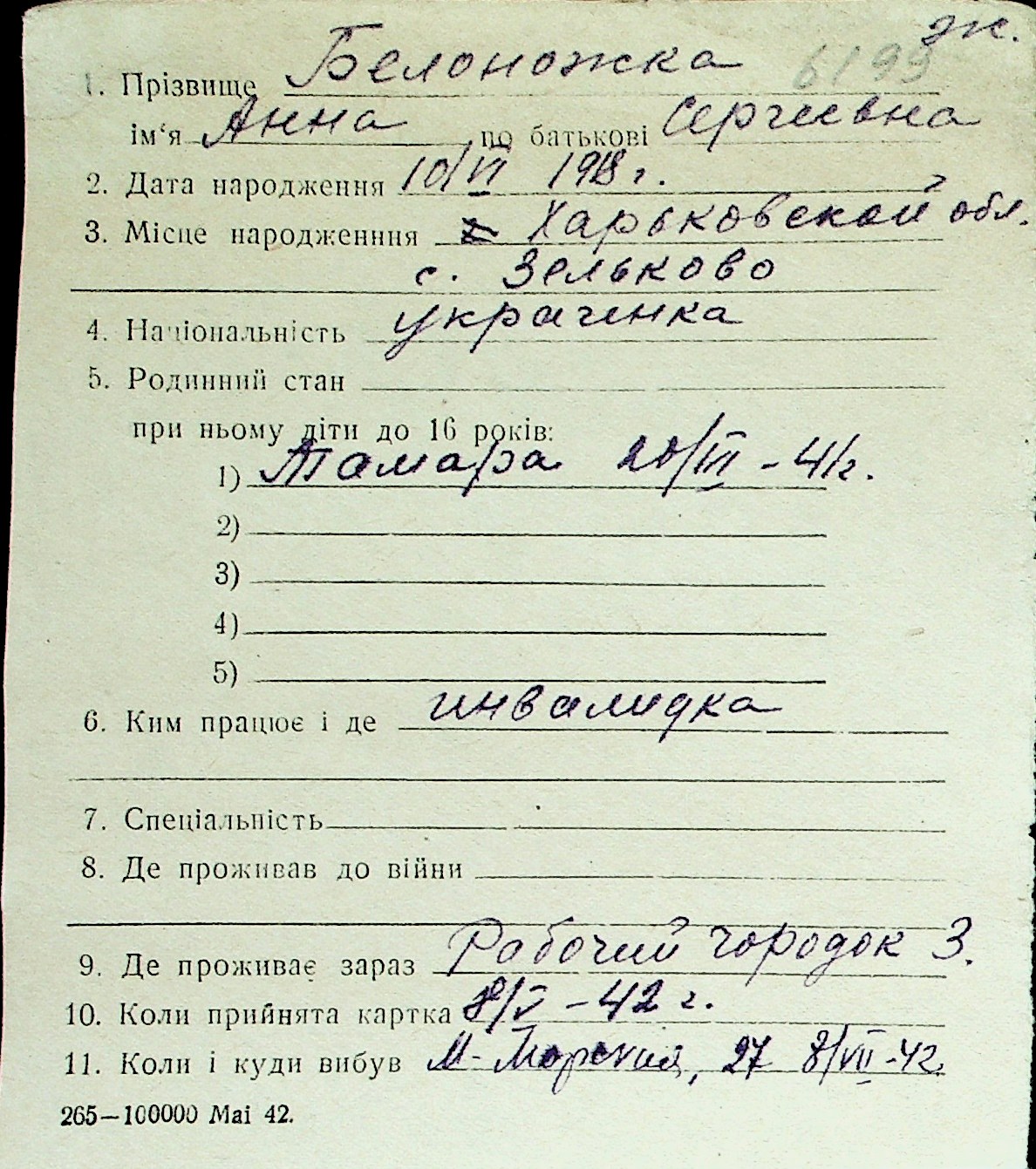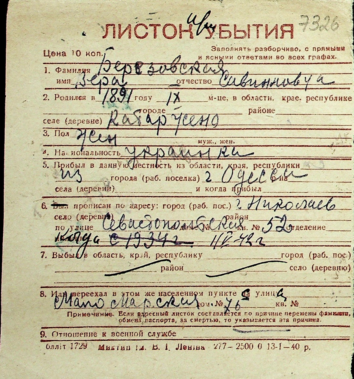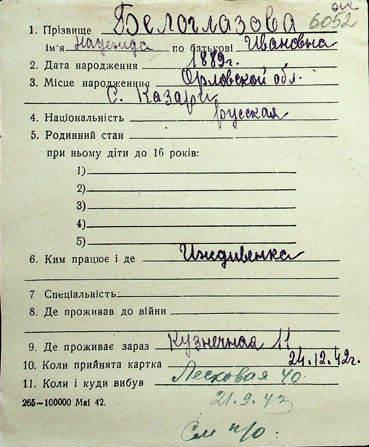 ◦ ◦ Перелік карток на осіб, які мешкали у м. Миколаїв у період окупації 1941–1944 років
