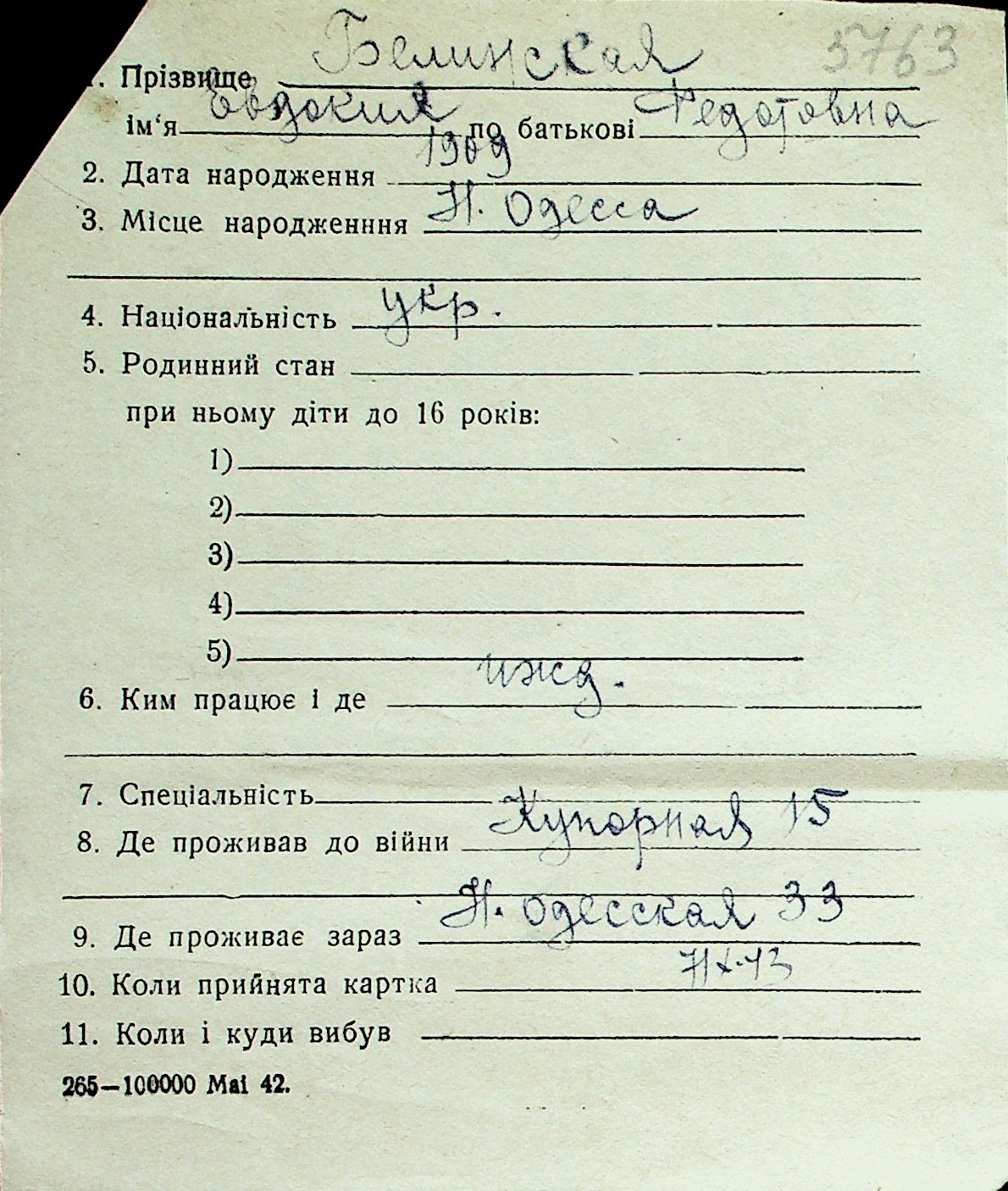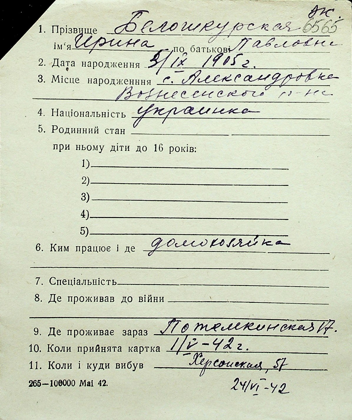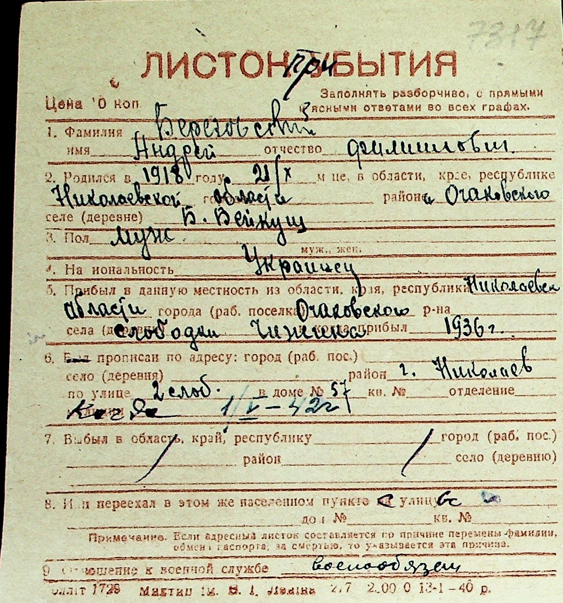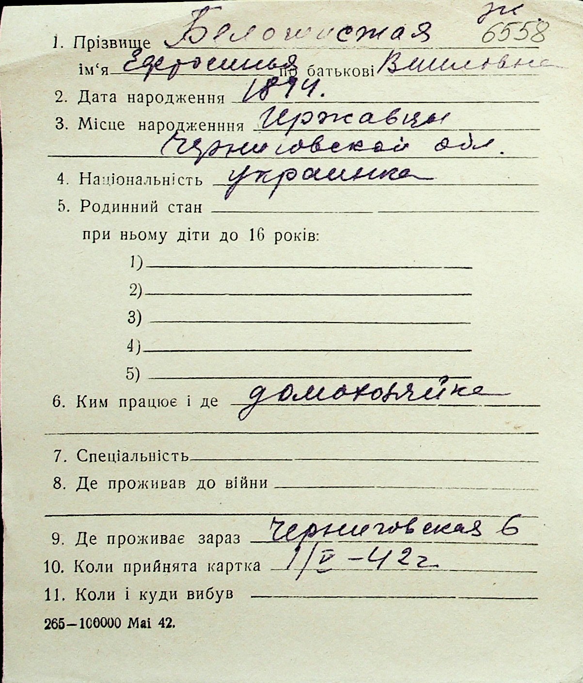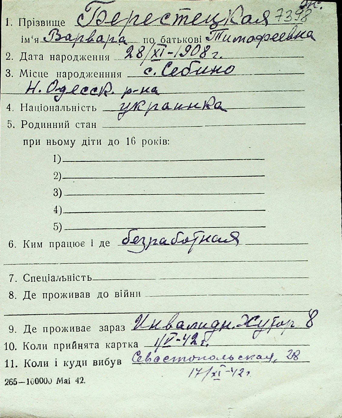 ◦ ◦ Перелік карток на осіб, які мешкали у м. Миколаїв у період окупації 1941–1944 років