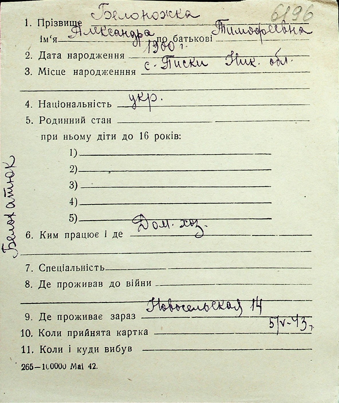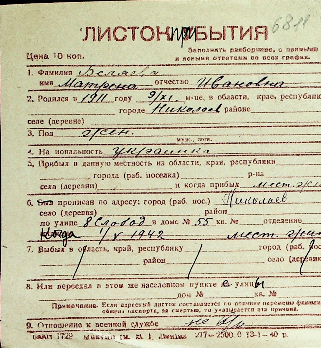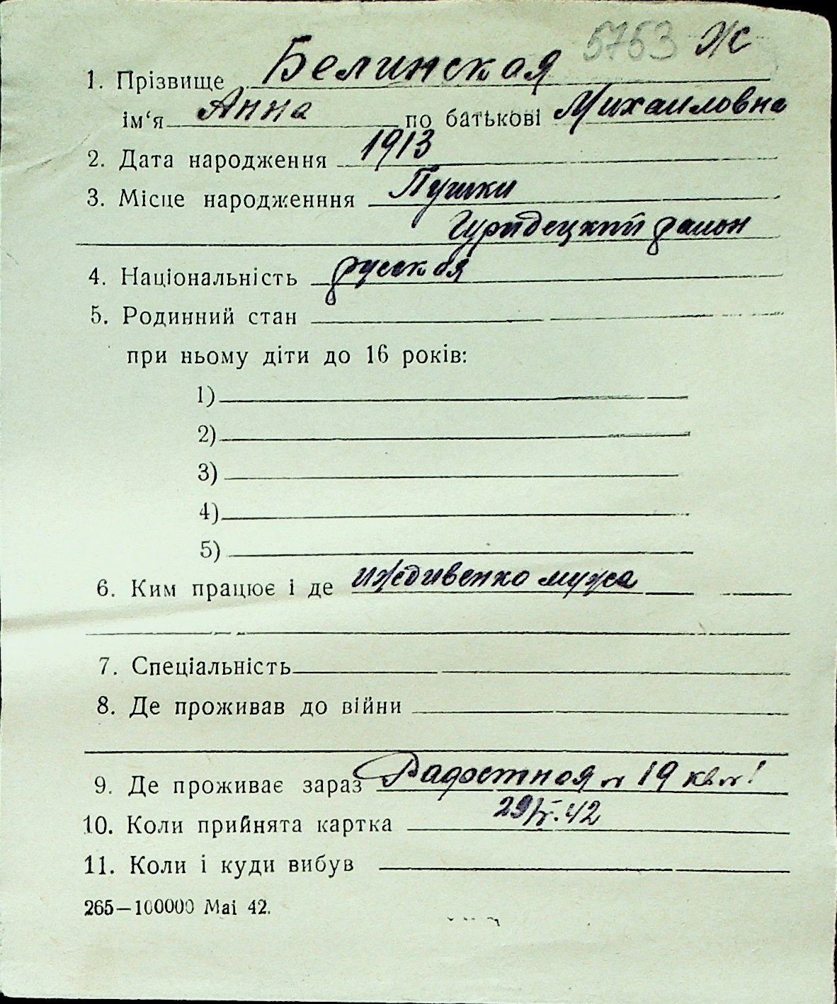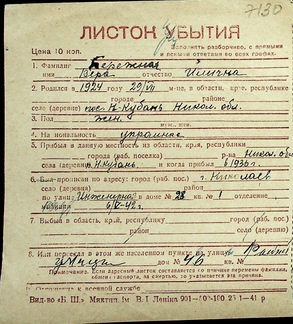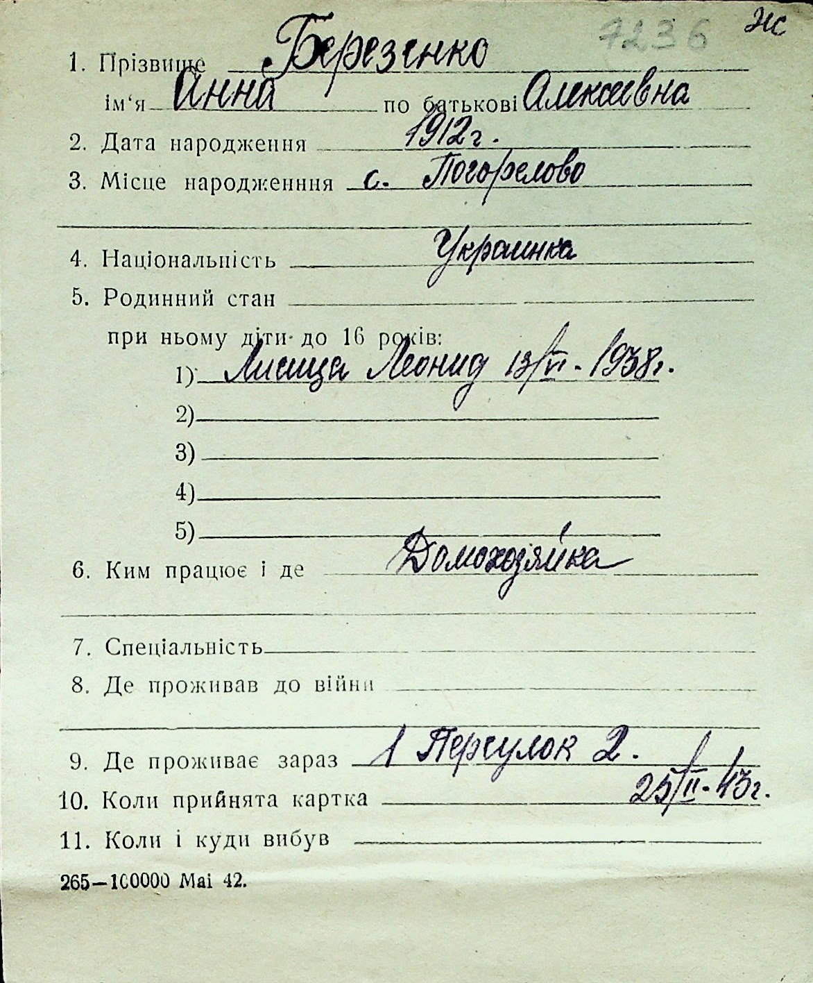 ◦ ◦ Перелік карток на осіб, які мешкали у м. Миколаїв у період окупації 1941–1944 років